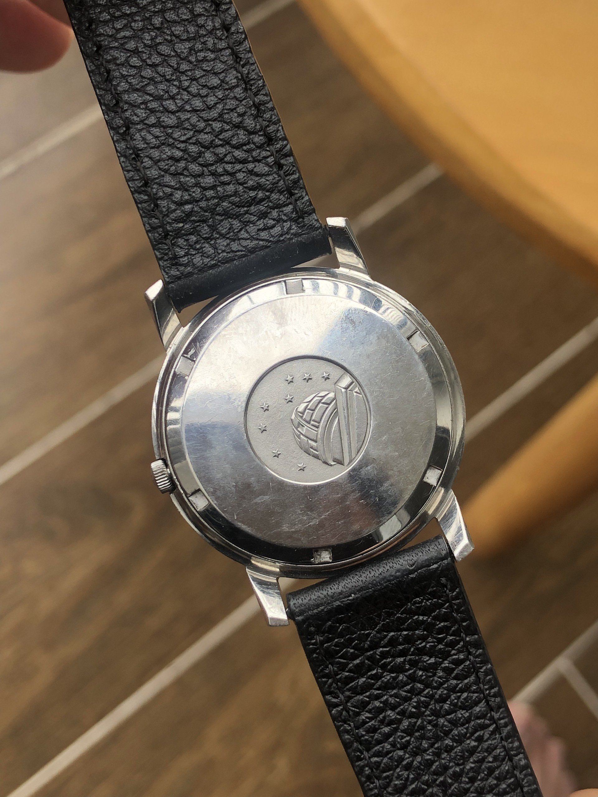 Caseback: Observatory symbol in the back is in good condition, visible stars and sandy in the background.
