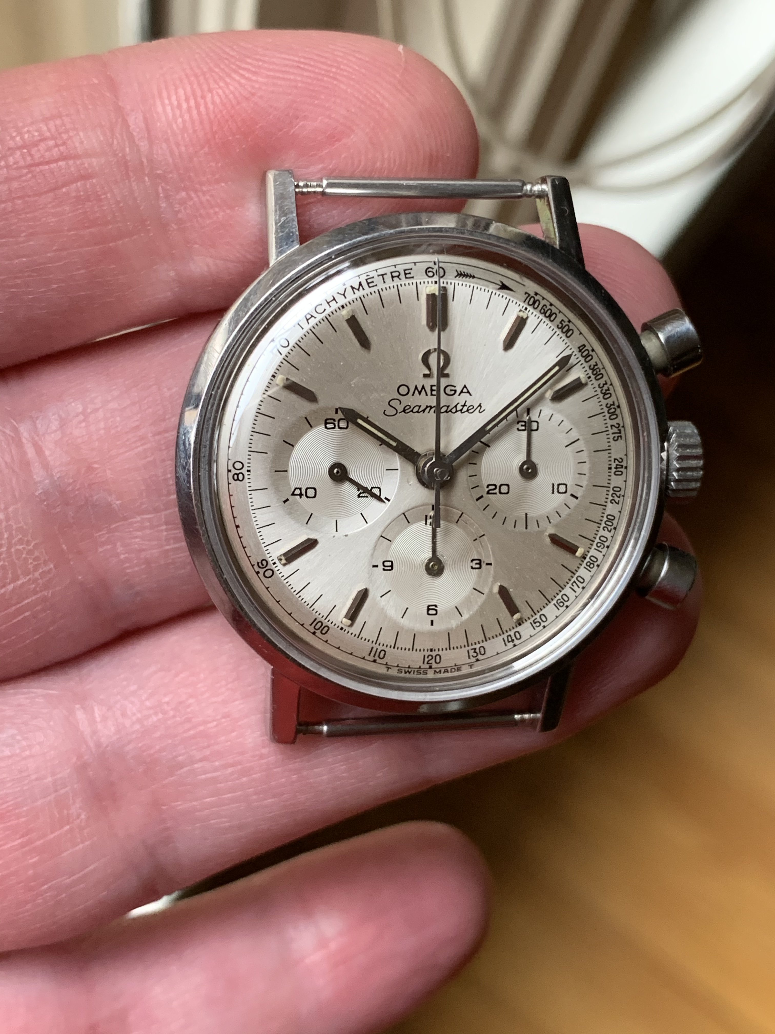 Case: solid stainless steel. “Seamaster” and “waterproof” visible on caseback. sharp lugs.