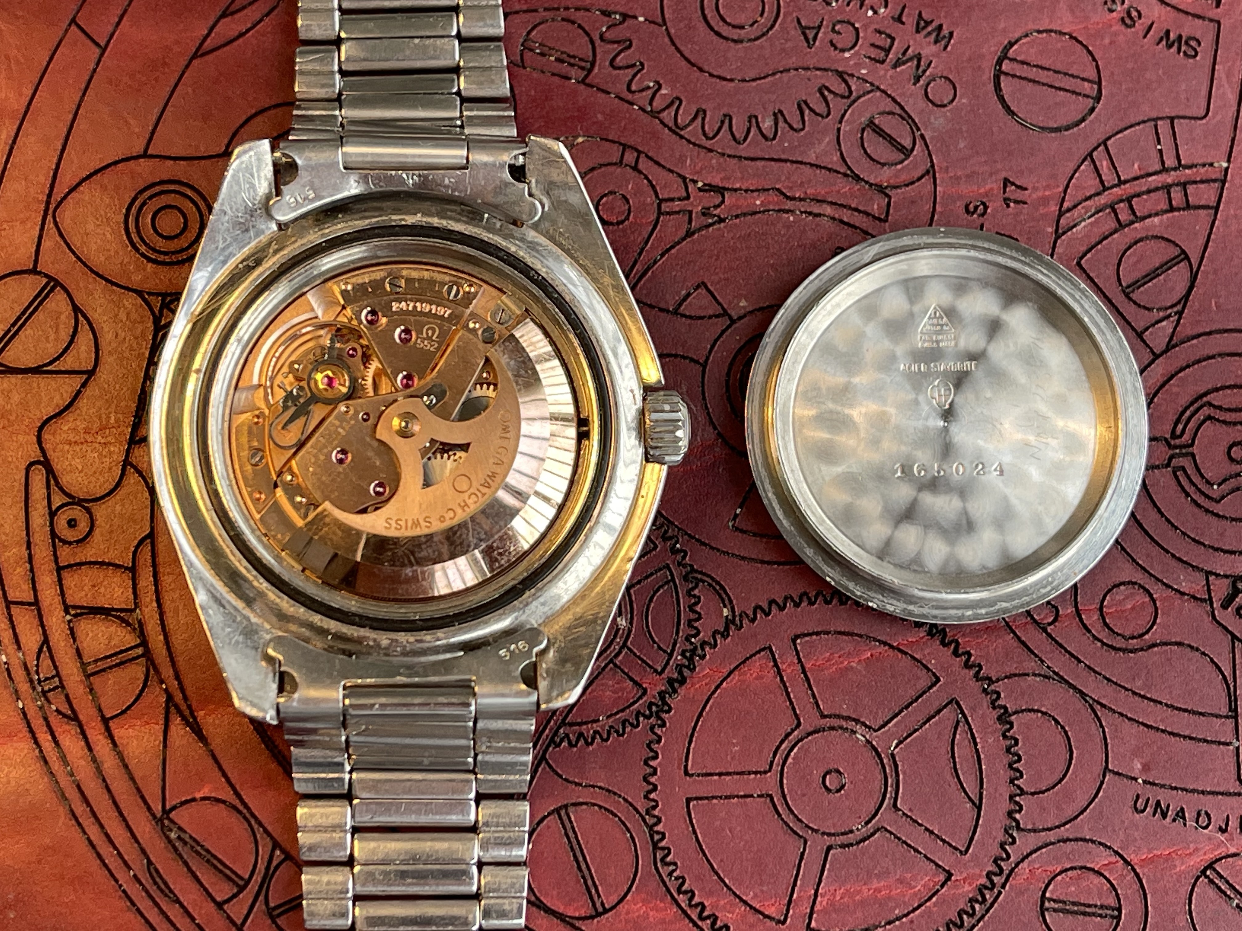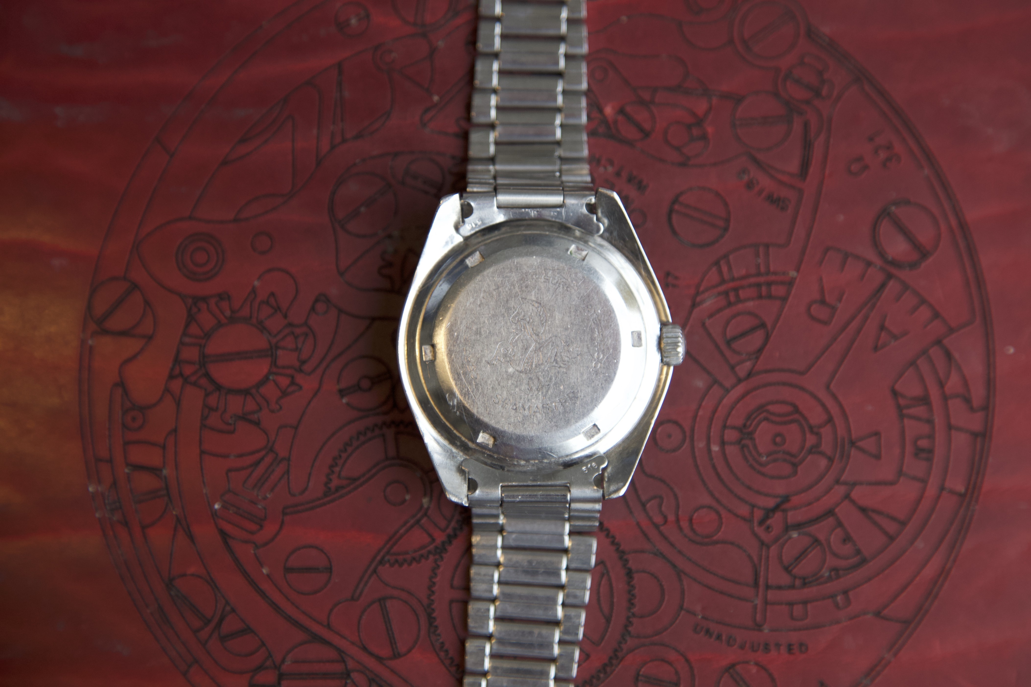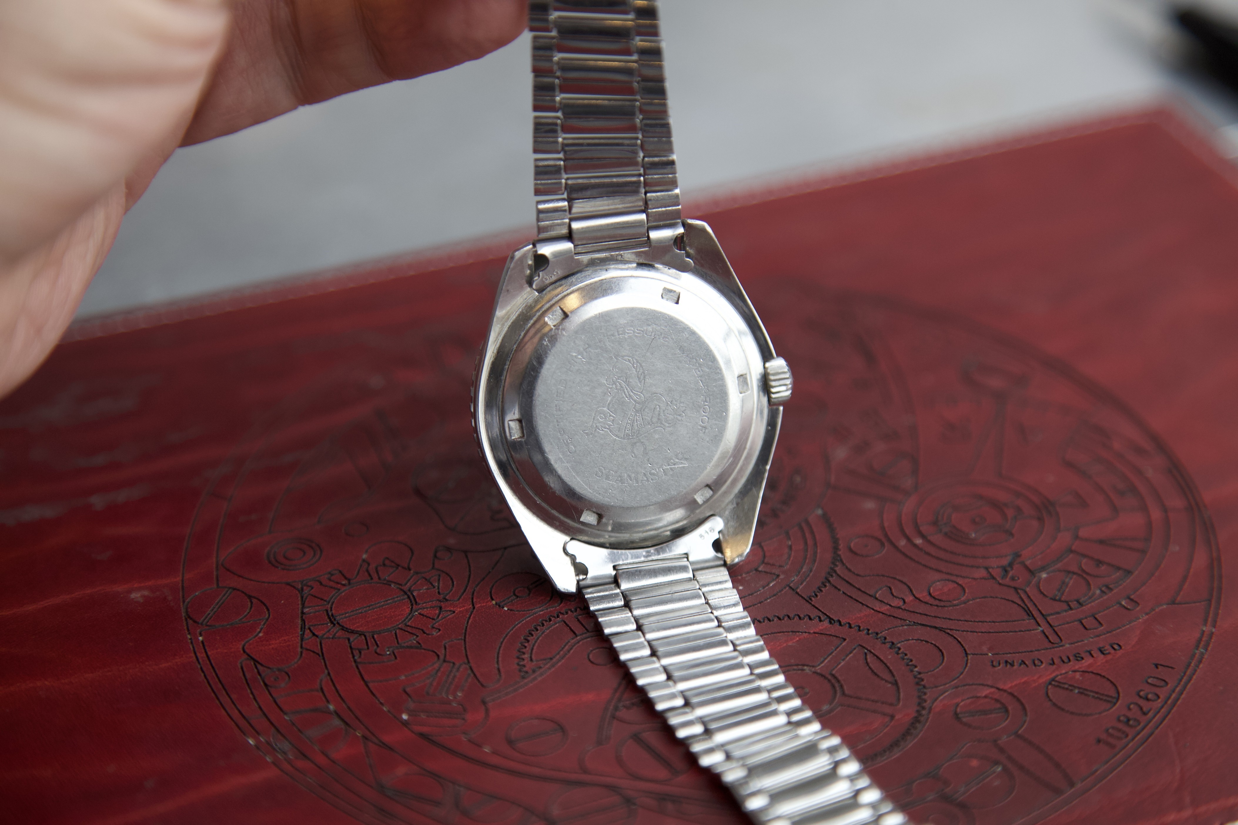 Movement is clean and functions well. Service marks to the inner caseback and some wear to the outer caseback.