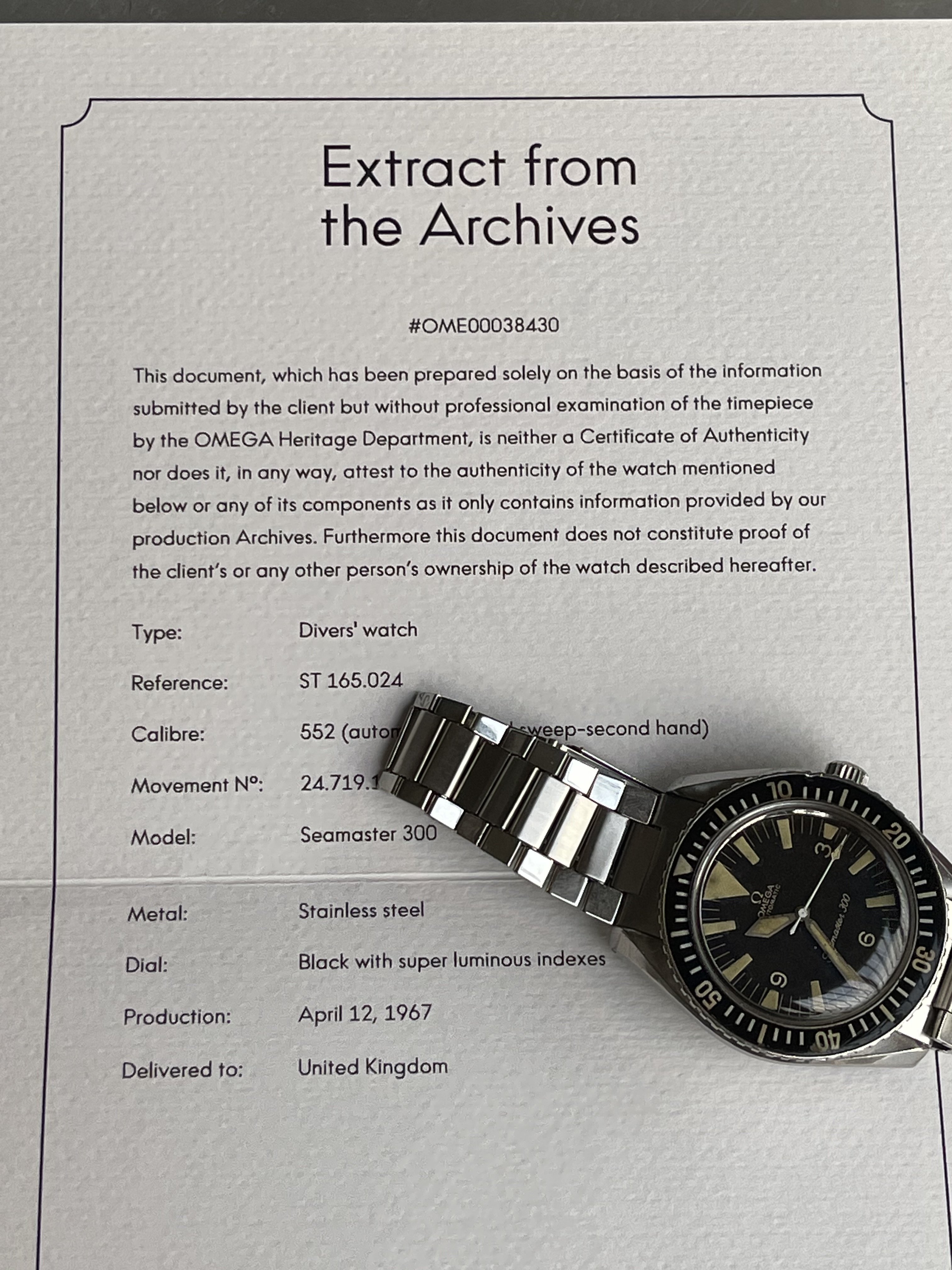 Up for sale is my Seamaster 300 with an Omega extract dating it to April 1967 with delivery to the United Kingdom.
