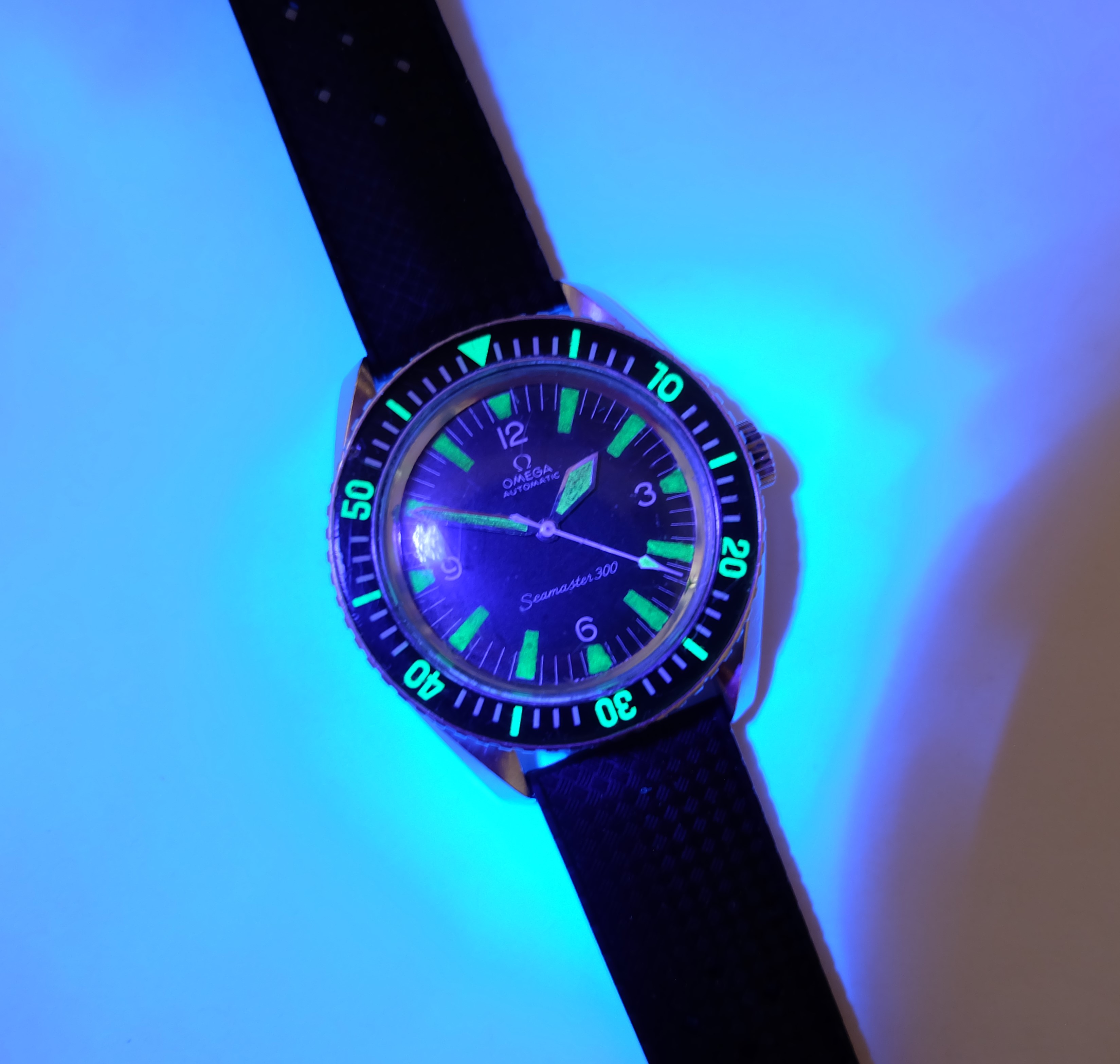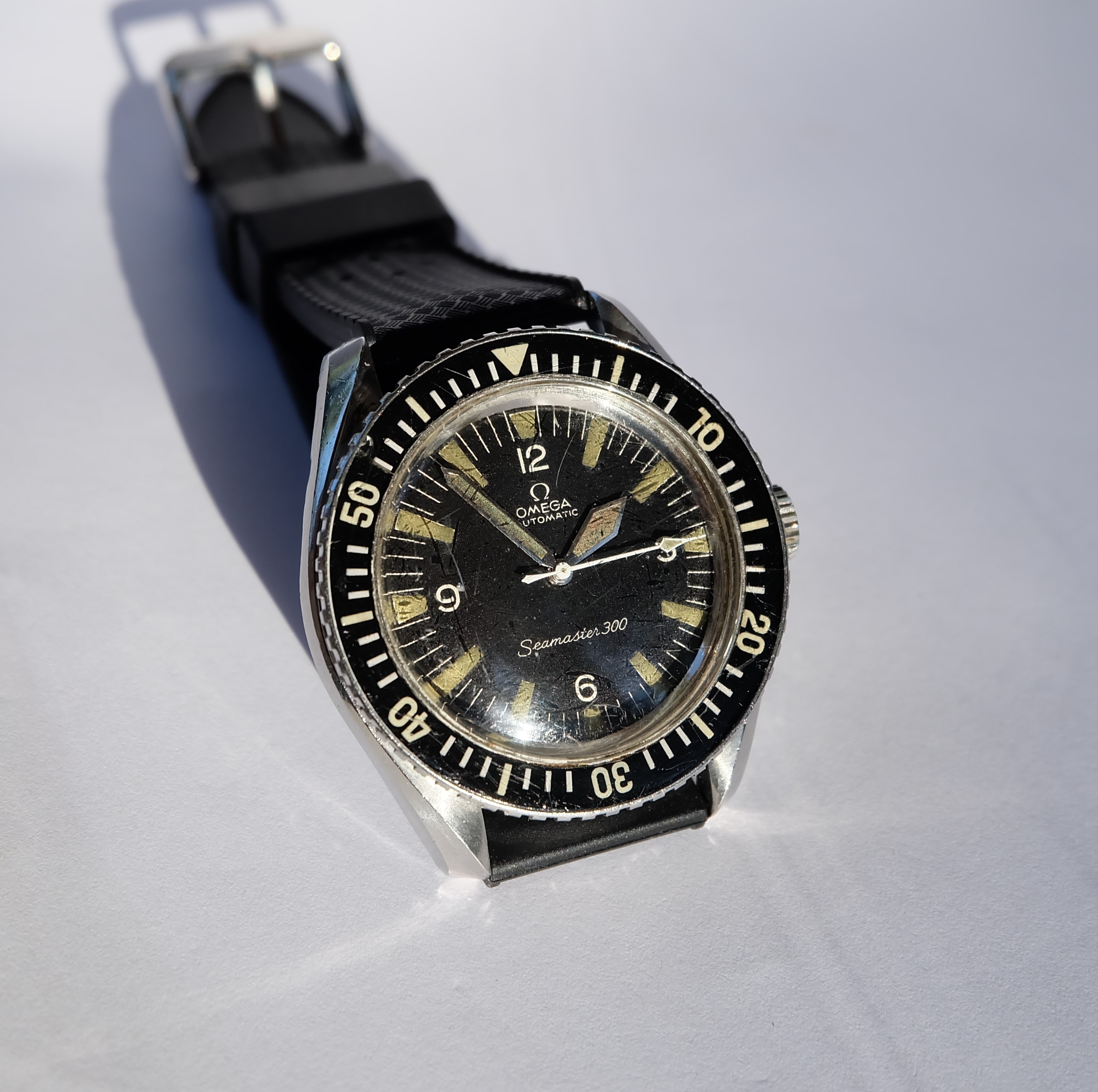 All parts are genuine Omega and correct for a 300 of this serial range, except for the crown which is a later service one and the new 'Tropic' strap.