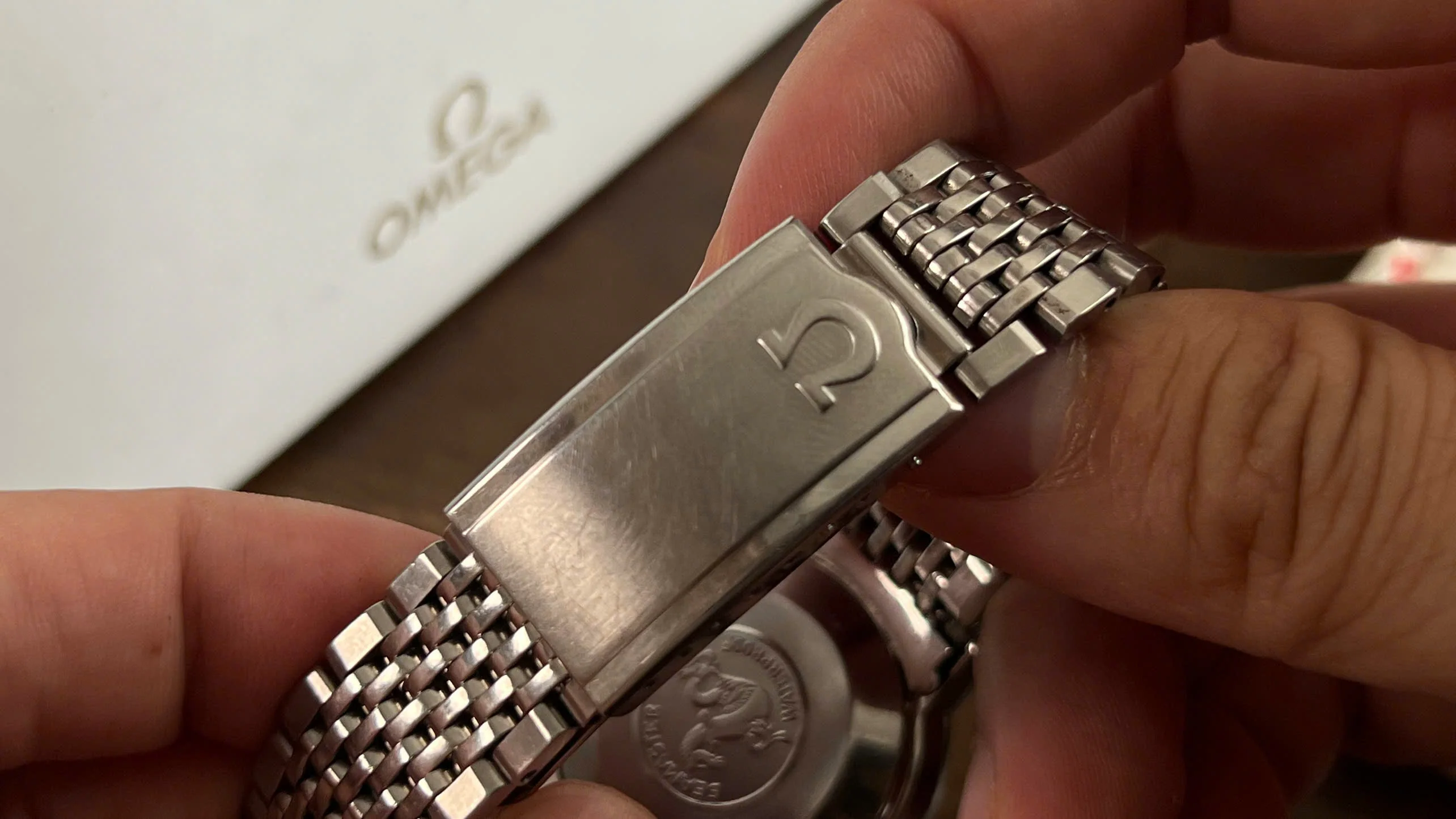 It’s fitted with the correct Omega beads-of-rice bracelet ref. 1037 with No. 70 endlinks, in good condition, sized for wrists up to ~7¾" (19.5 cm).