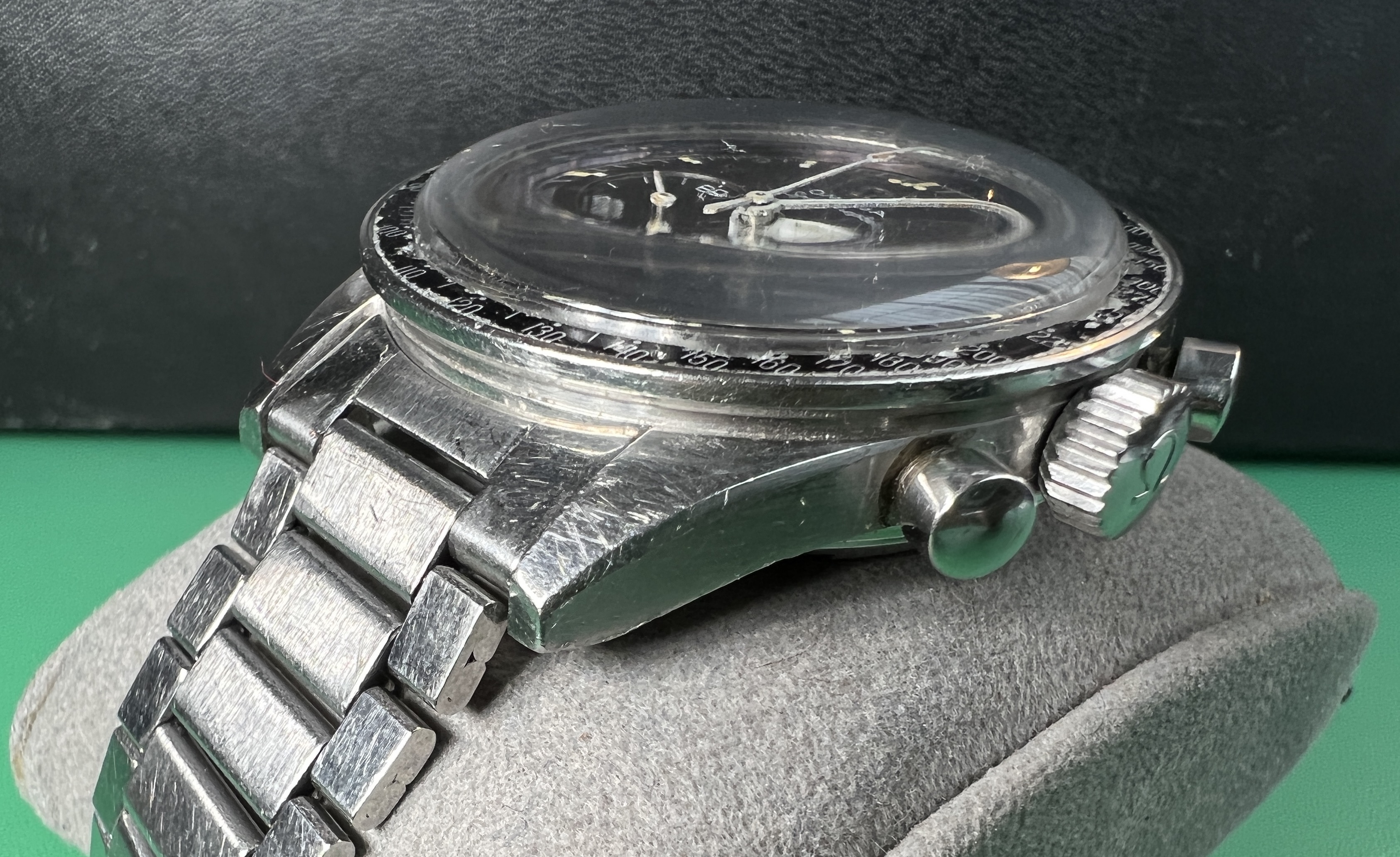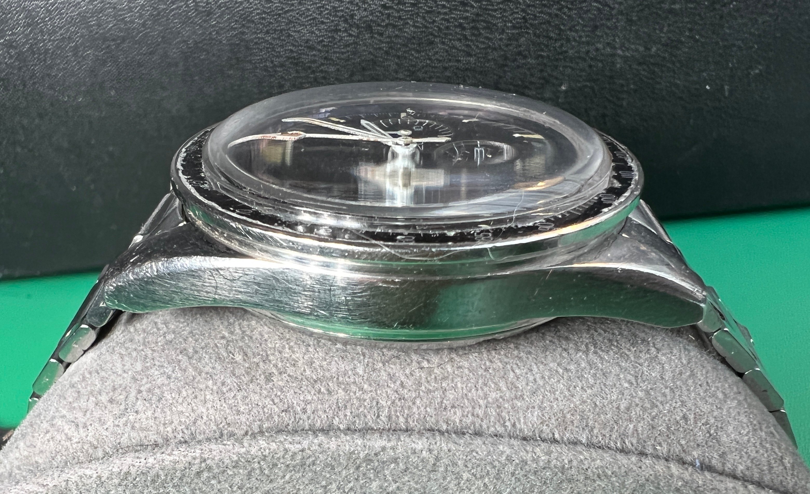 The DON bezel insert is original and wears well on the wrist. It has lightly faded to a blueish grey. It is quite worn however with some areas of damage around the edges. There is a small chip at the 105 mark.