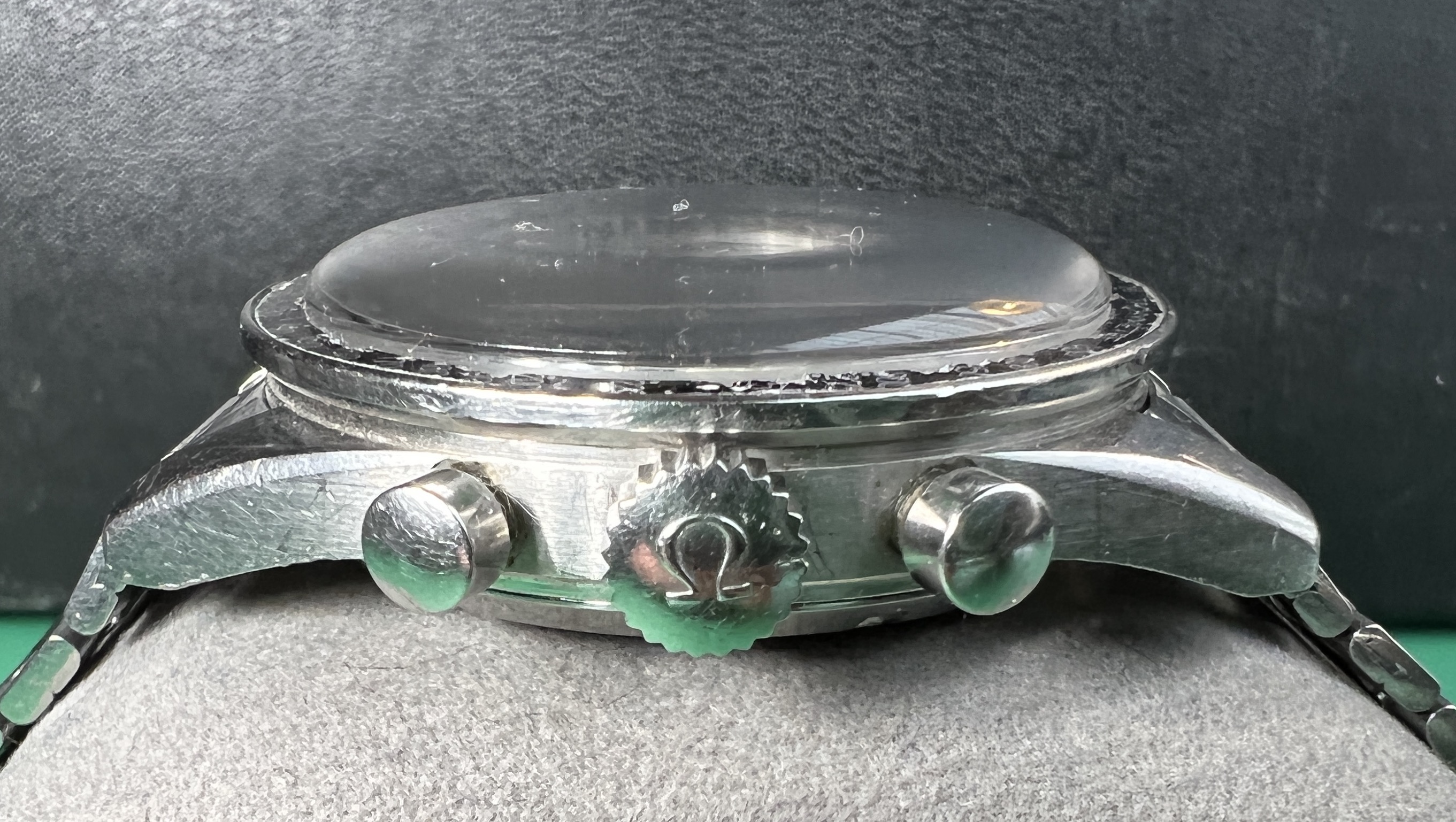 The dial retains the majority of its original lume which has aged to a pleasing custard yellow. There is some loss to the lume at stepped dial which is rather typical of this model. There is a small area of damage to the 9 o'clock seconds subdial near the 40 mark. The dial does appear a bit lighter black that verges towards brown in some light.