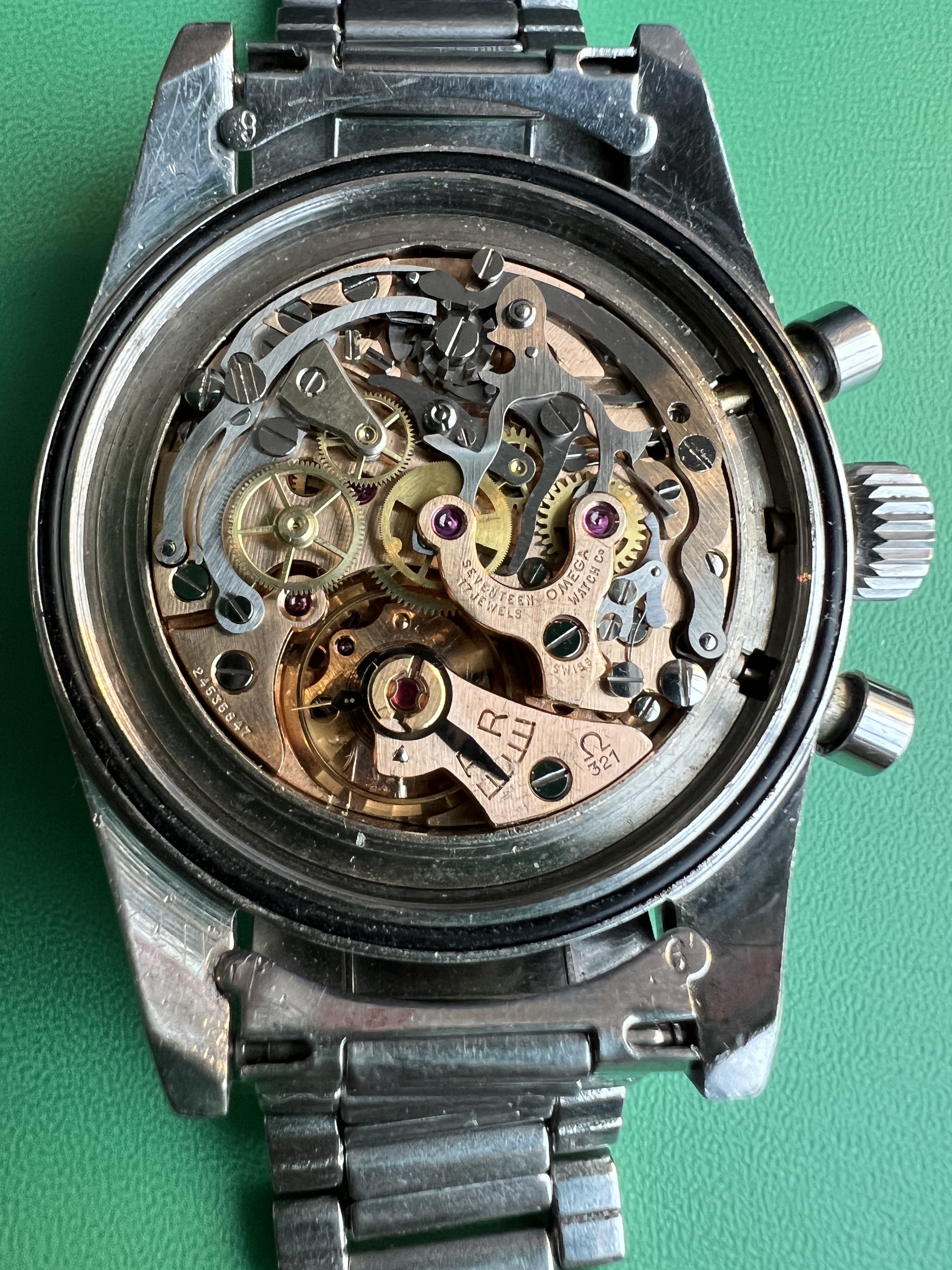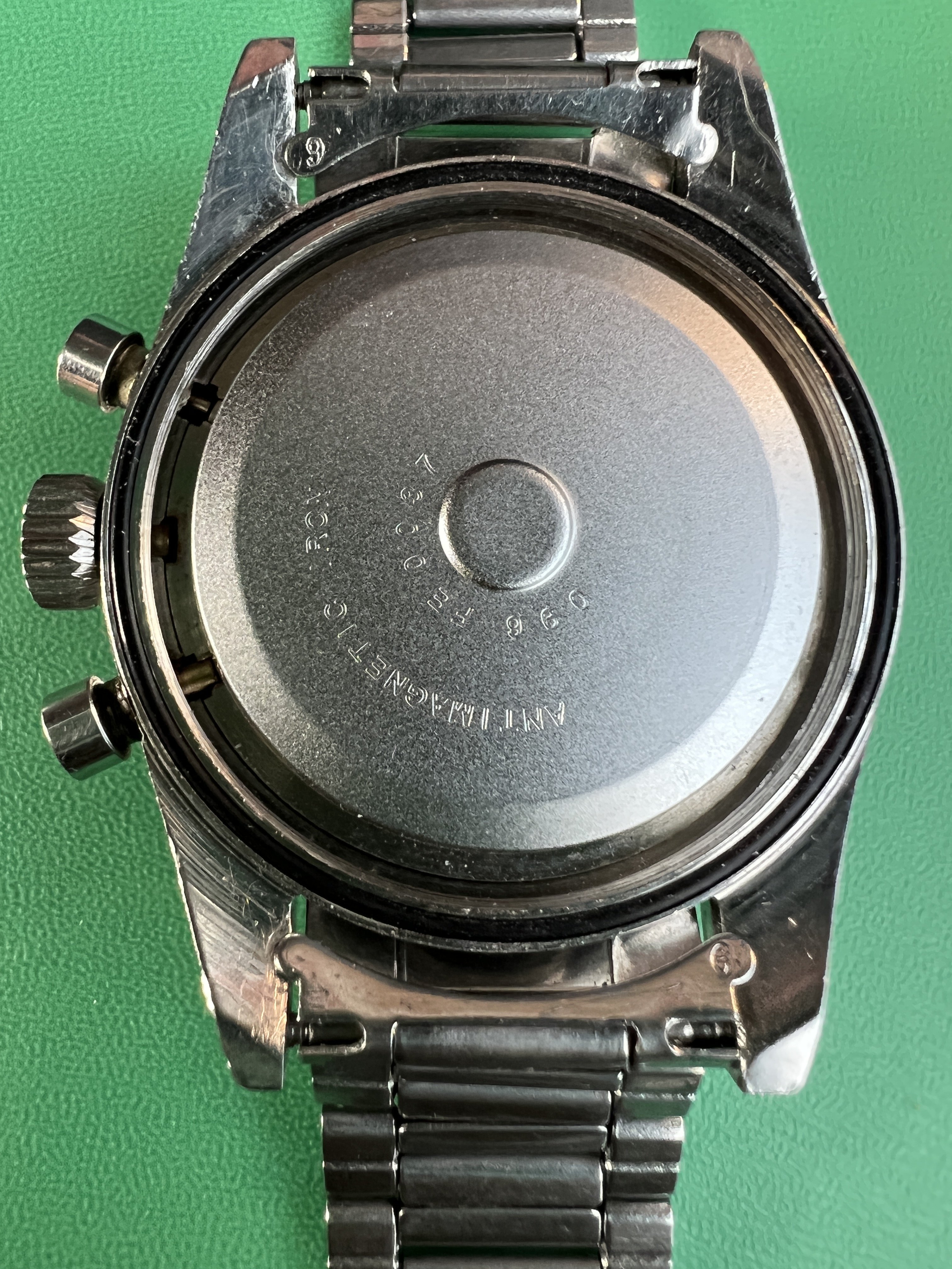 The case is in good vintage condition and does not appear to have been polished in its lifetime. It's edges show the original facets or chamfers and signs of the original finish. There are multiple small dings and scratches that show its history and age. Nothing detracts from its appeal in my opinion. The caseback is unfortunately rather badly marked by tool marks from multiple poor attempts to open. The Hippocampus is deep and visible. There are multiple interior service marks.