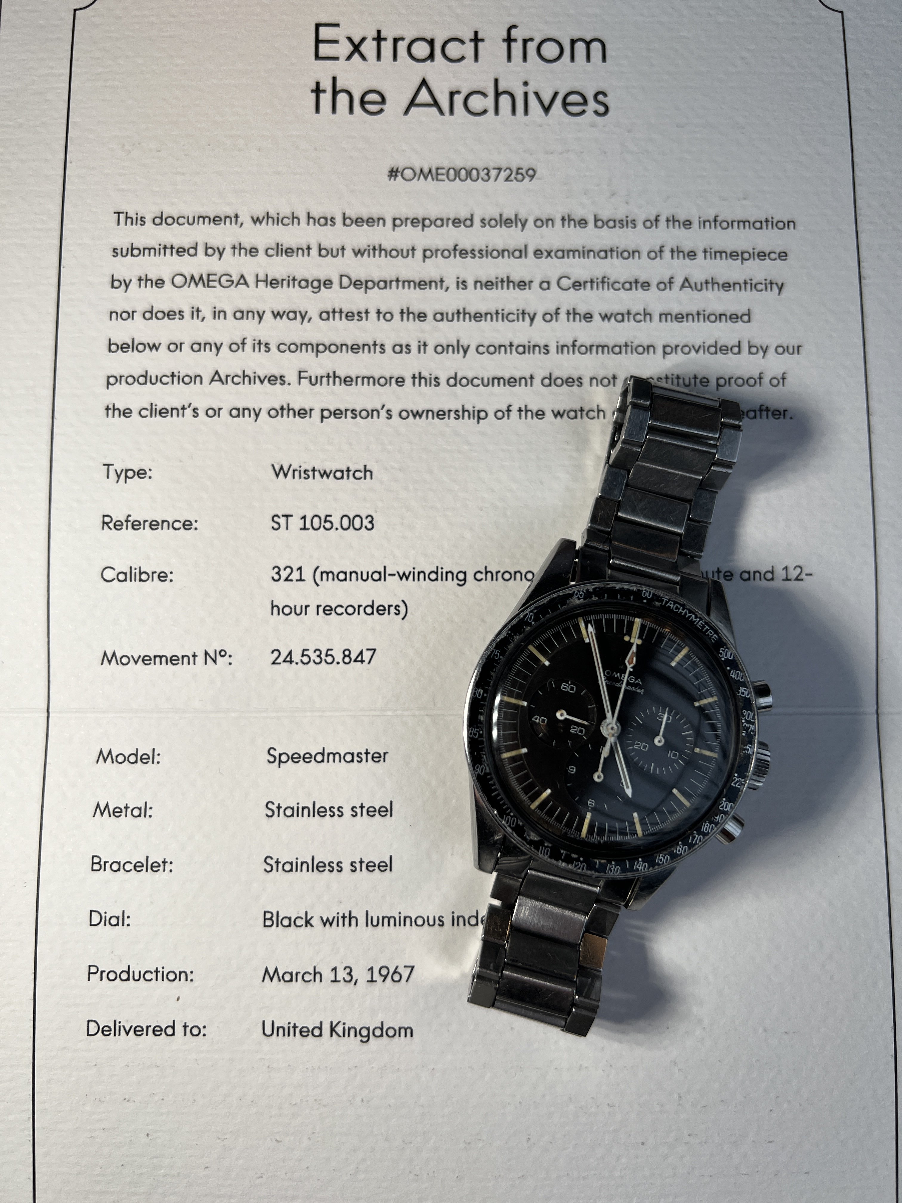 The Extract of the Archives shows the watch was delivered to the UK in March of 1967. The calibre 321 movement is marked with serial number 24535847. It was serviced by Simon Freese in January 2020 and was recently checked by him again and is running well and keeping time as it should.
