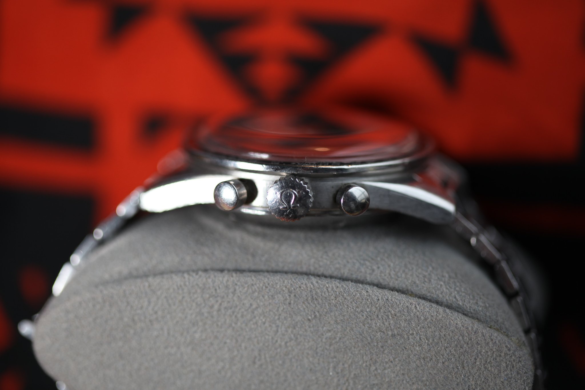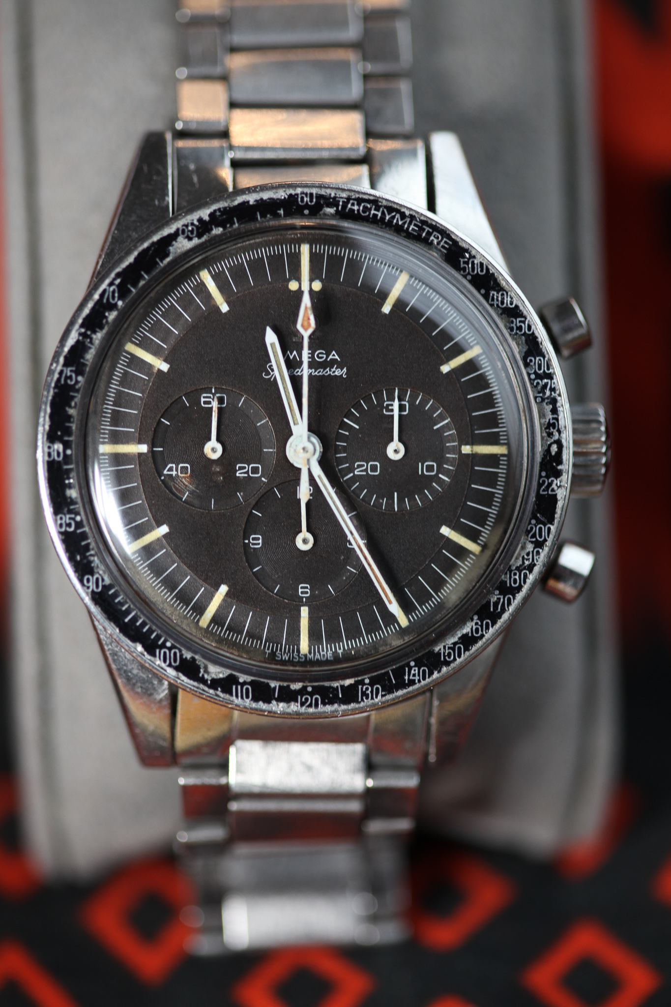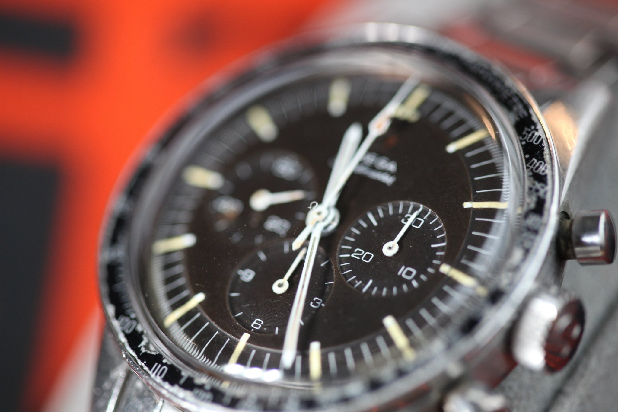 The hands are original and unrestored. The chrono hand has a small area of paint loss at the tip and some light surface rust. The minute hand shows some slight deterioration to the lume and cracking. There does also seem to be a bit of loss. The hour hand lume has aged but seems complete. The subdial hands appear original with signs of age.