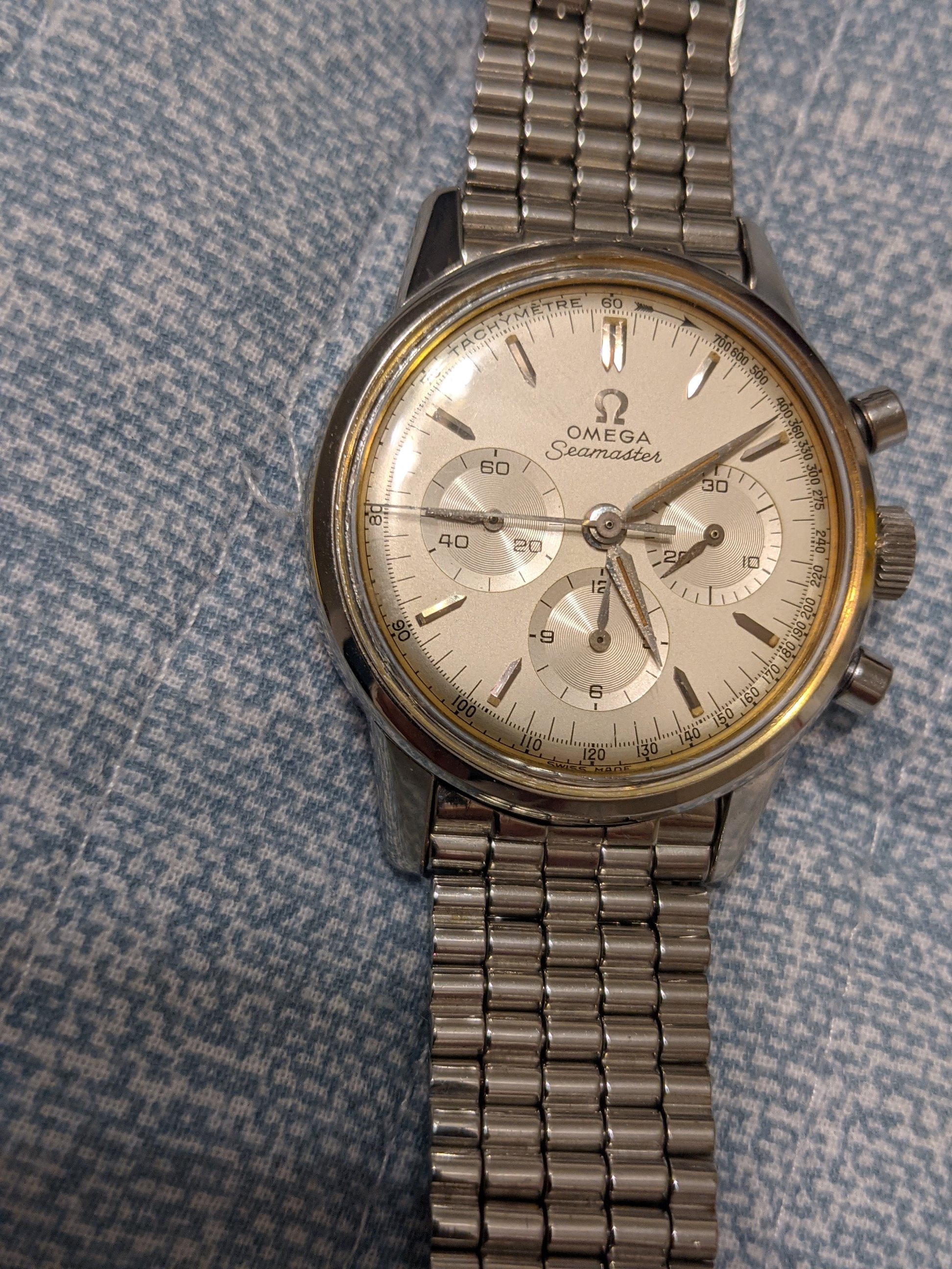 I think you meant to write "chronograph" instead of "tachometer". More and better photos will help, but at first glance the bracelet looks like it could be a NSA/Novavit.