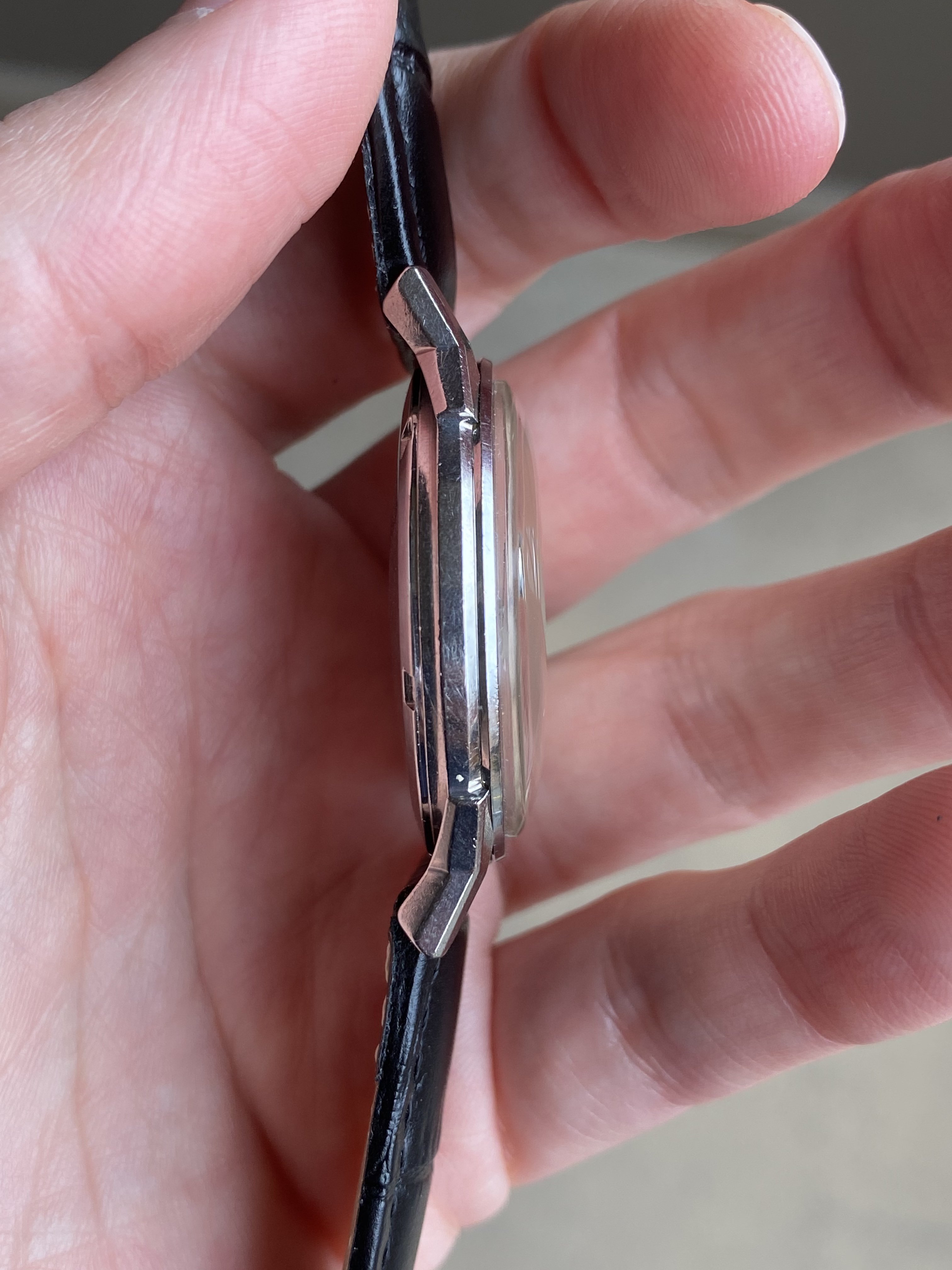 Dial: Original, non-refinished silver dial is in nice condition and features onyx accents at 12/3/6/9. The dial is nice but not perfect - it has very light patina and I believe at some point someone removed the paint from the top of the non-onyx markers as I’ve never seen one of these without that paint there. Perhaps someone scratched the paint and subsequently chose to remove it entirely (pure speculation). The dial presents nicely in my opinion.
