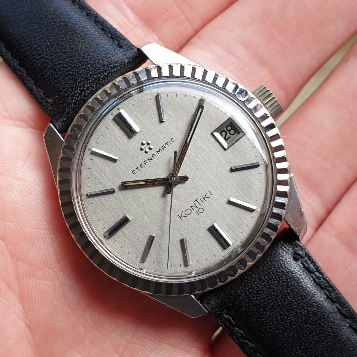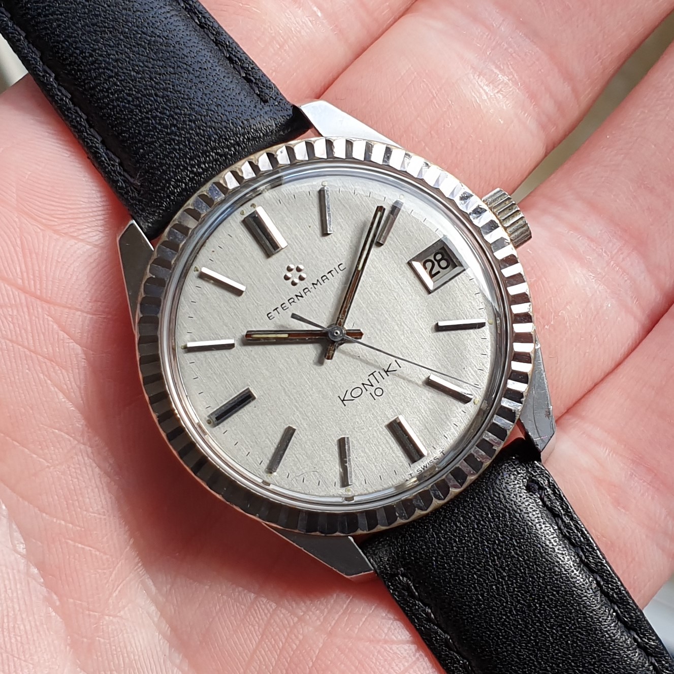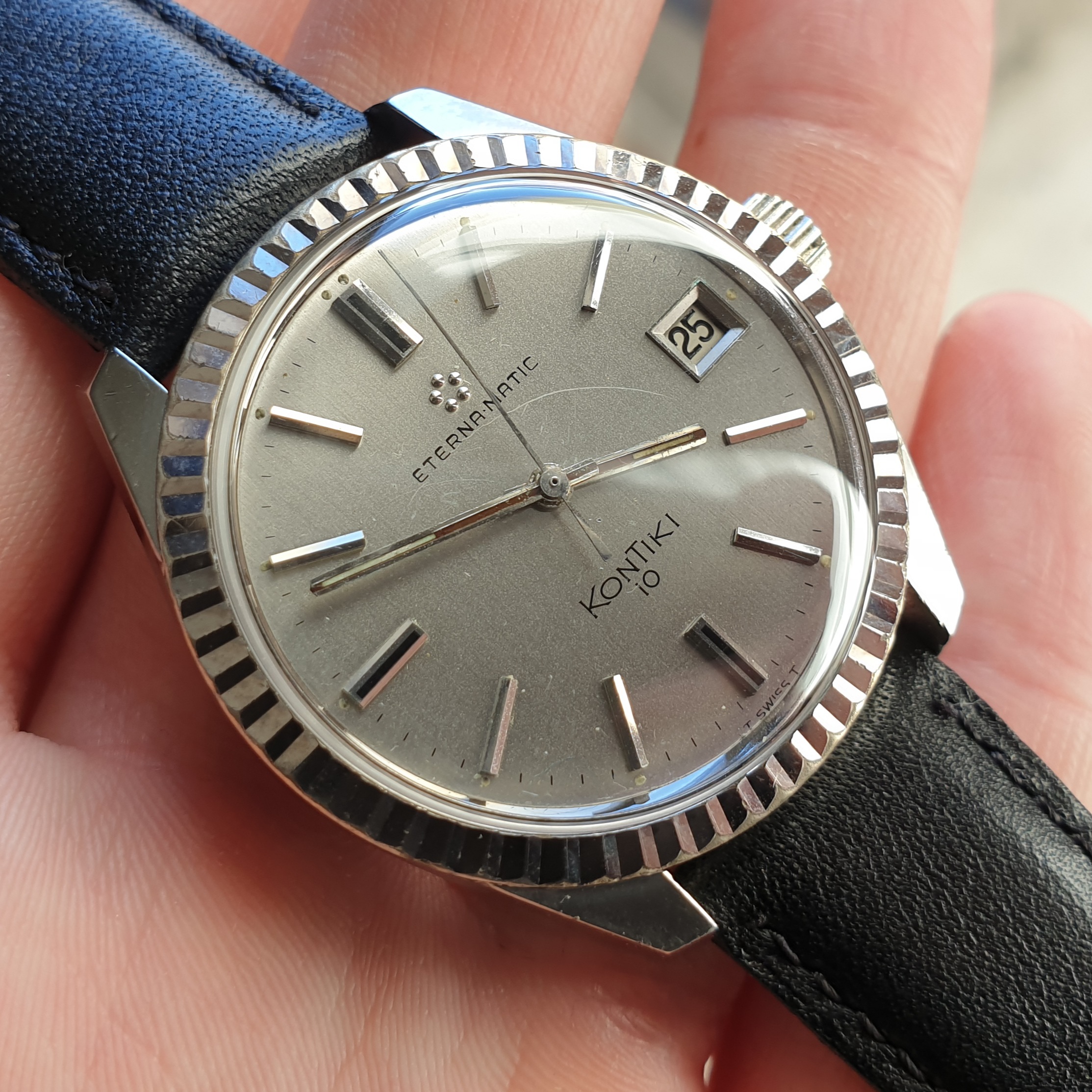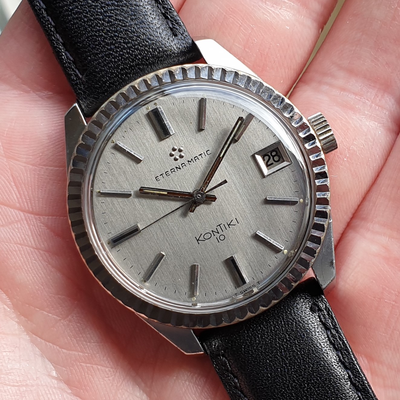 The Kontiki, Eternas sportive line, has had many faces from the 1950s onward. This 1968 iteration in my opinion is very elegant, thanks to its sharp case design (almost Grand Seiko-esque, in my opinion) and playful bezel. It was delivered on steel or leather; this one sadly had no bracelet when I acquired it. Of course I can't guarantee the water resistance!
