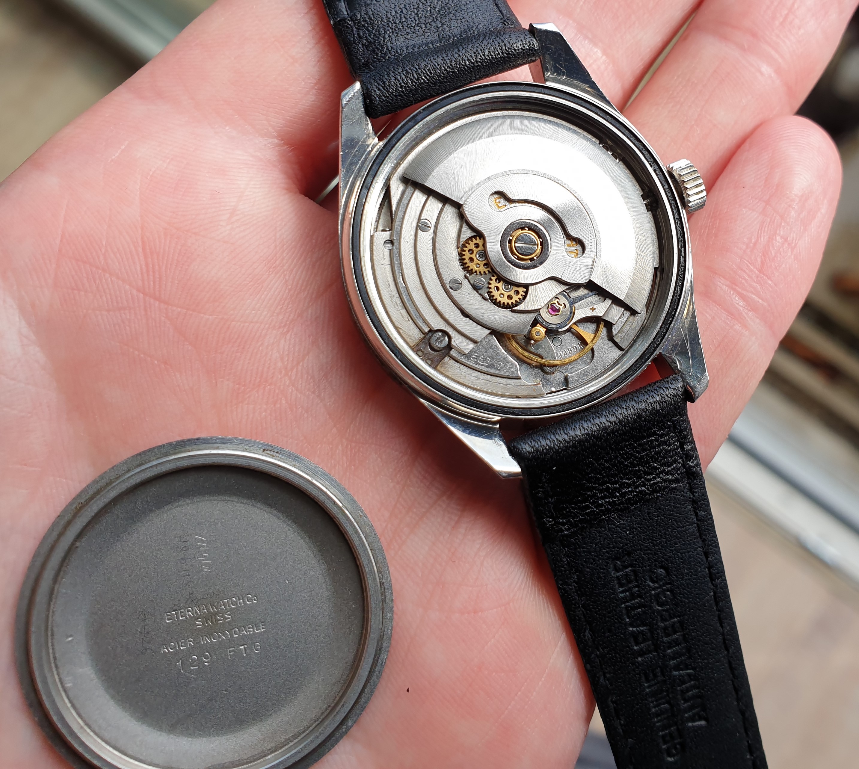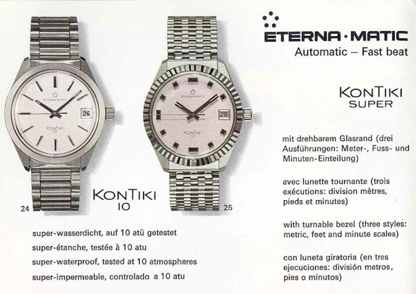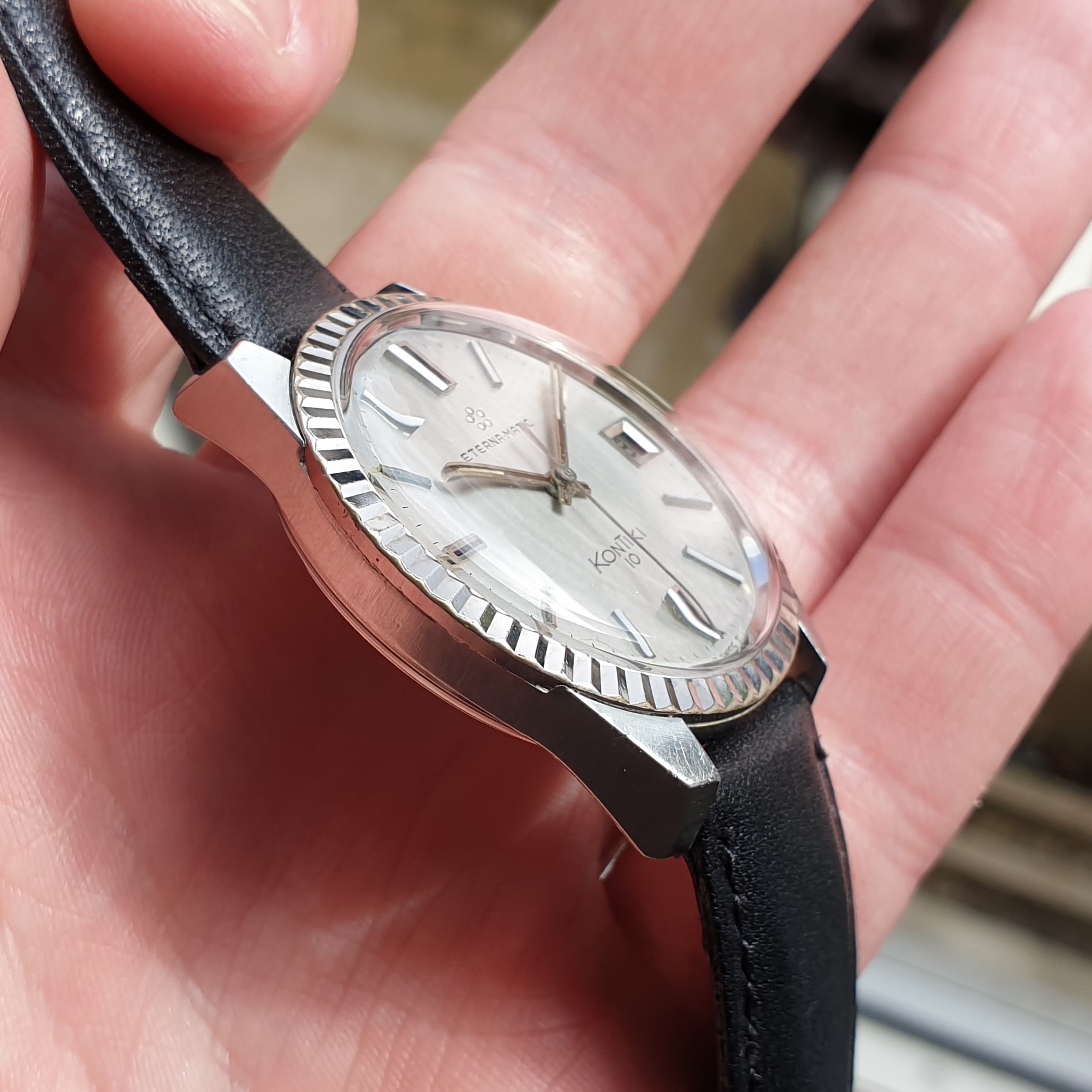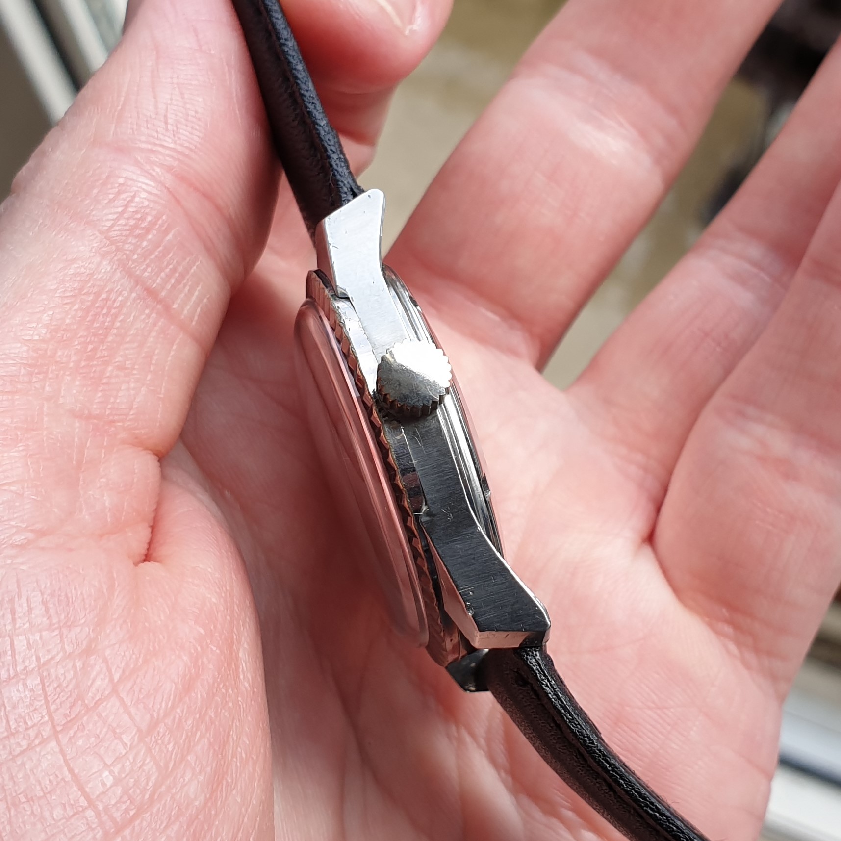 The Kontiki, Eternas sportive line, has had many faces from the 1950s onward. This 1968 iteration in my opinion is very elegant, thanks to its sharp case design (almost Grand Seiko-esque, in my opinion) and playful bezel. It was delivered on steel or leather; this one sadly had no bracelet when I acquired it. Of course I can't guarantee the water resistance!