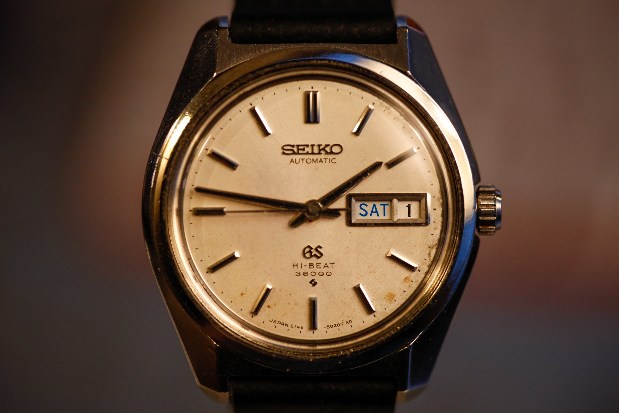 "First released in December 1967, Grand Seiko released just 36.000 watches of its 61GS caliber in 12 years, ending it all in 1972. Grand Seiko wanted to have its own unique style that would resonate with the high-end market in Japan, large production numbers apparently did not meet their standards or marketing. It definitely was a Japan only watch, which explains a quirky feature, namely the blank spot between the day change from one to the next - for this is a single language caliber...