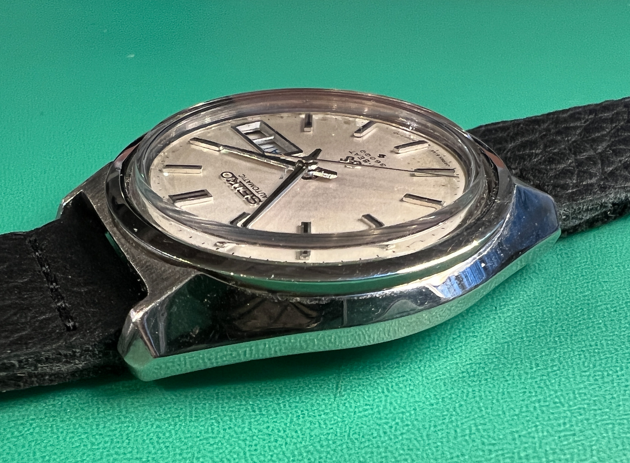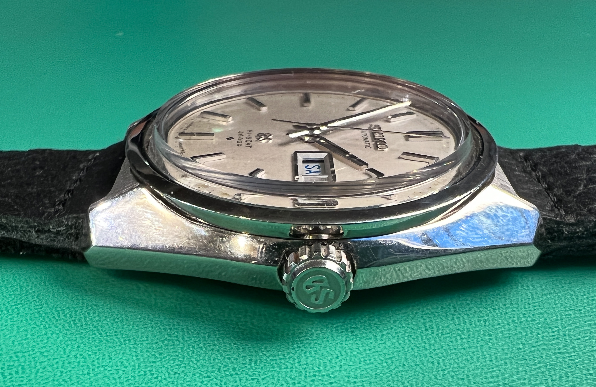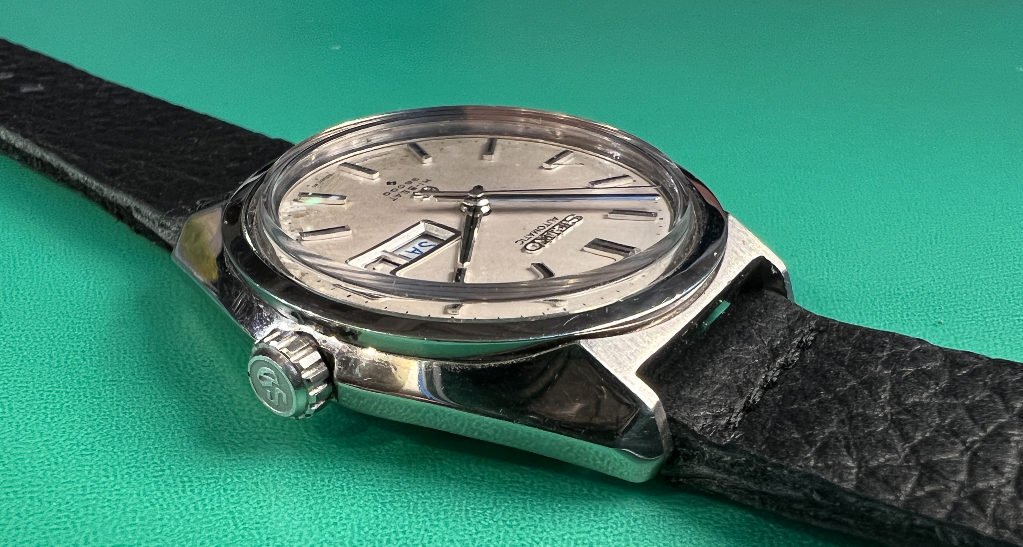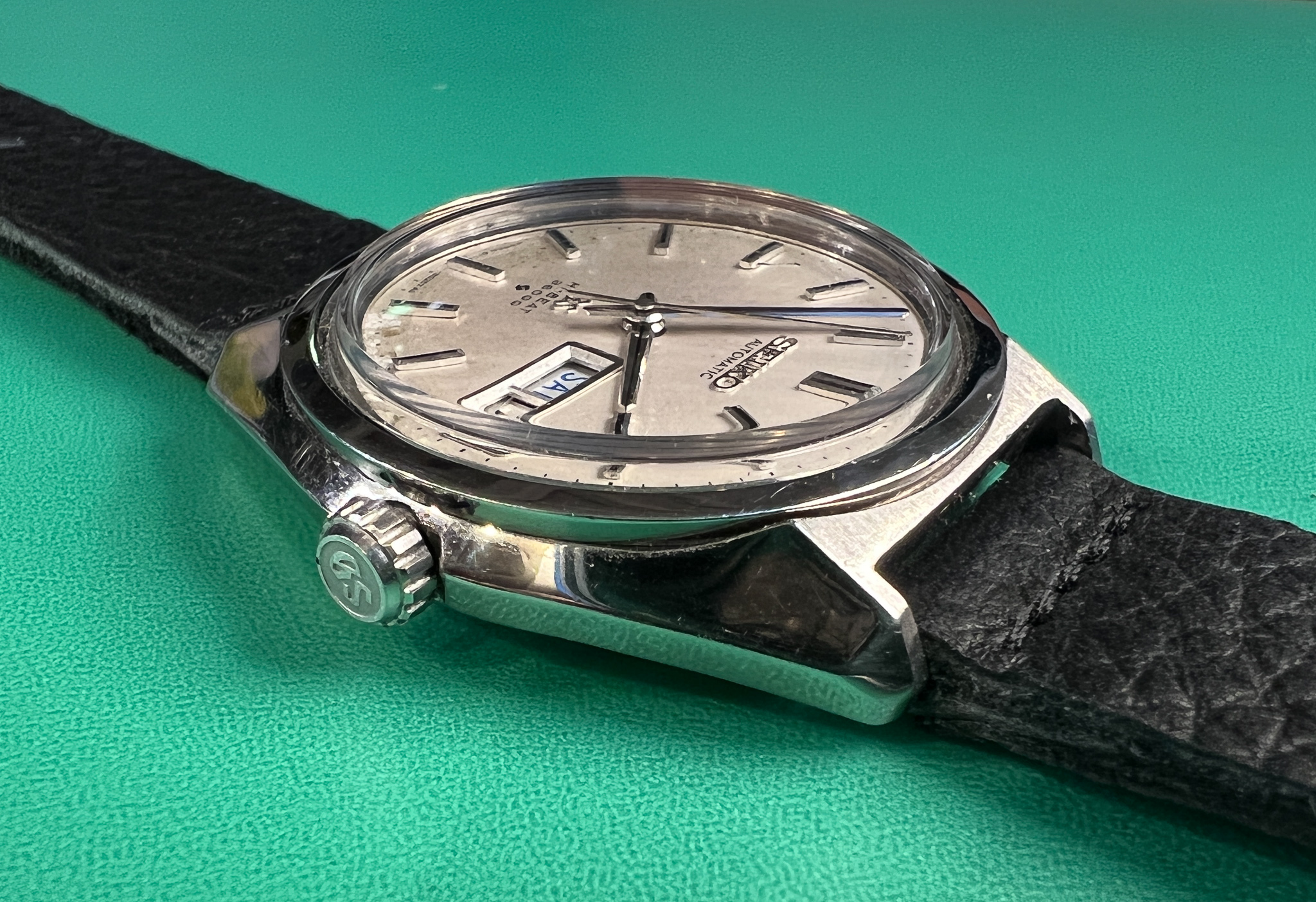 The watch runs great and it is a very clean example of the classic Seiko Grammar of Design. The case is exceptional and retains its sharp lines and factory polish. The caseback is clean and shows its original gold medallion.