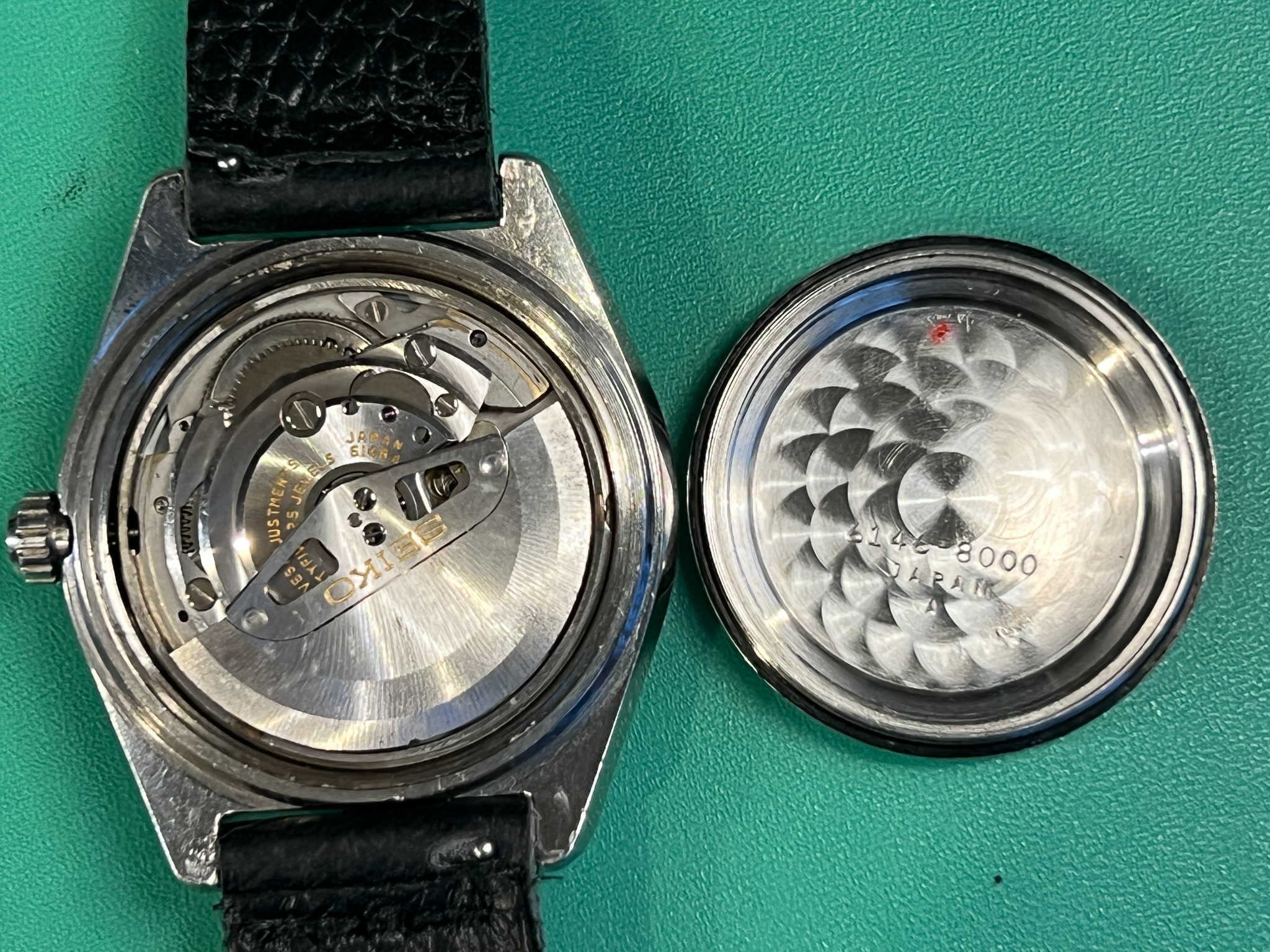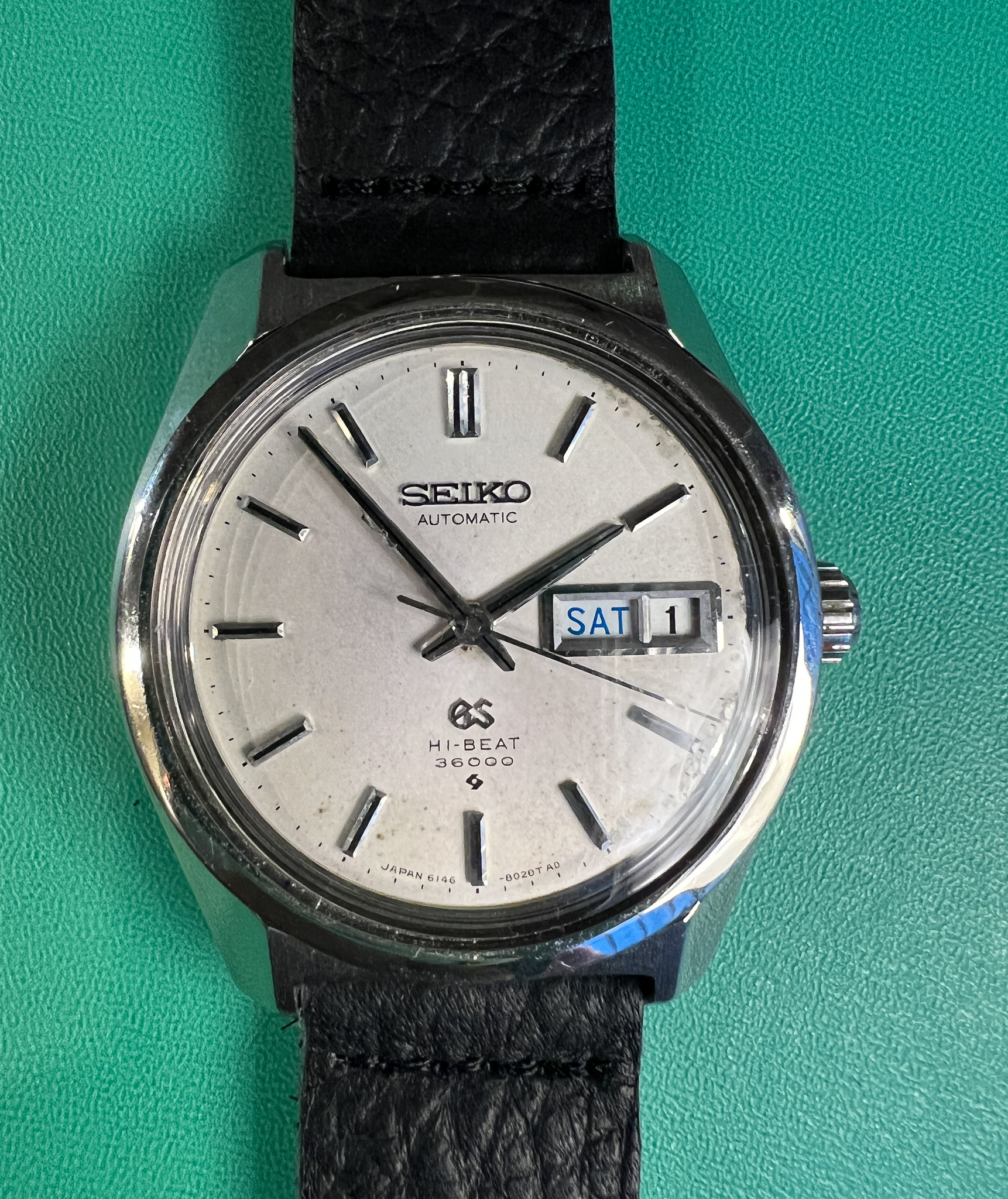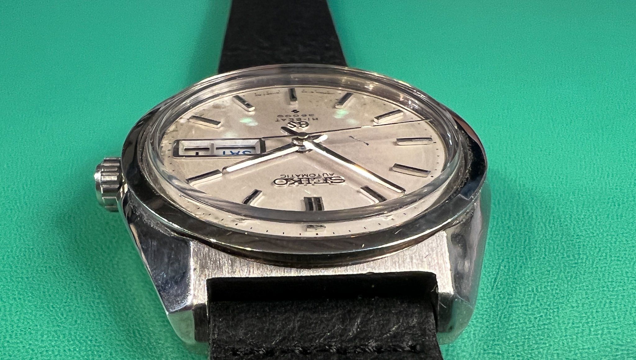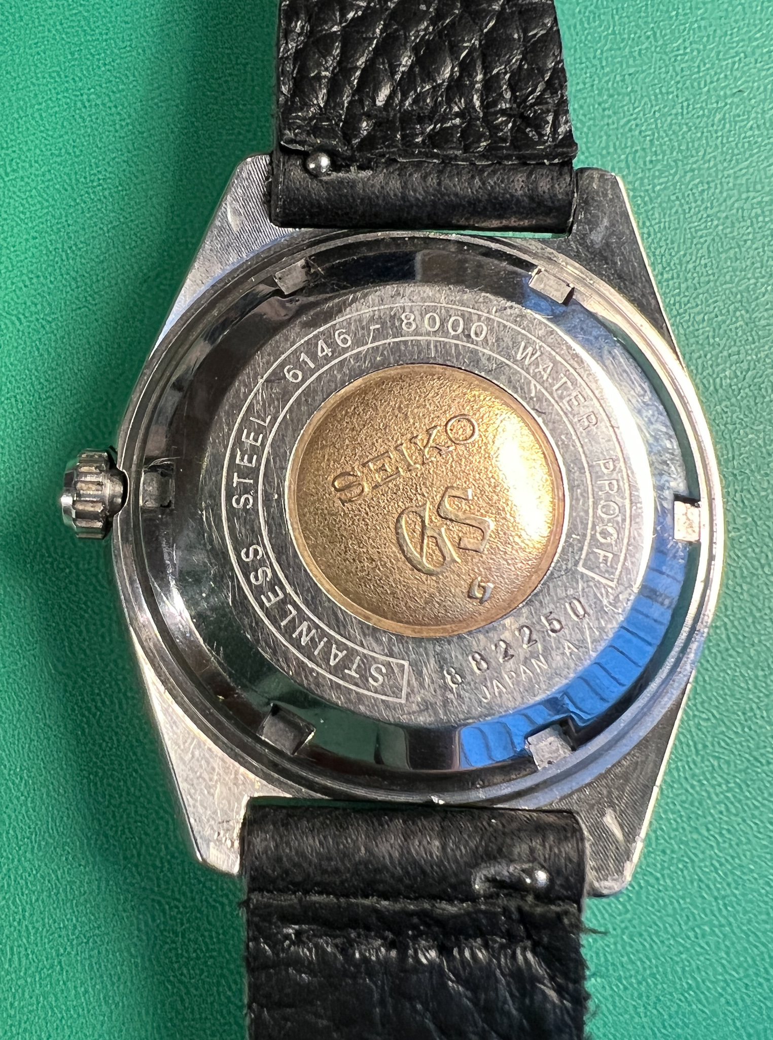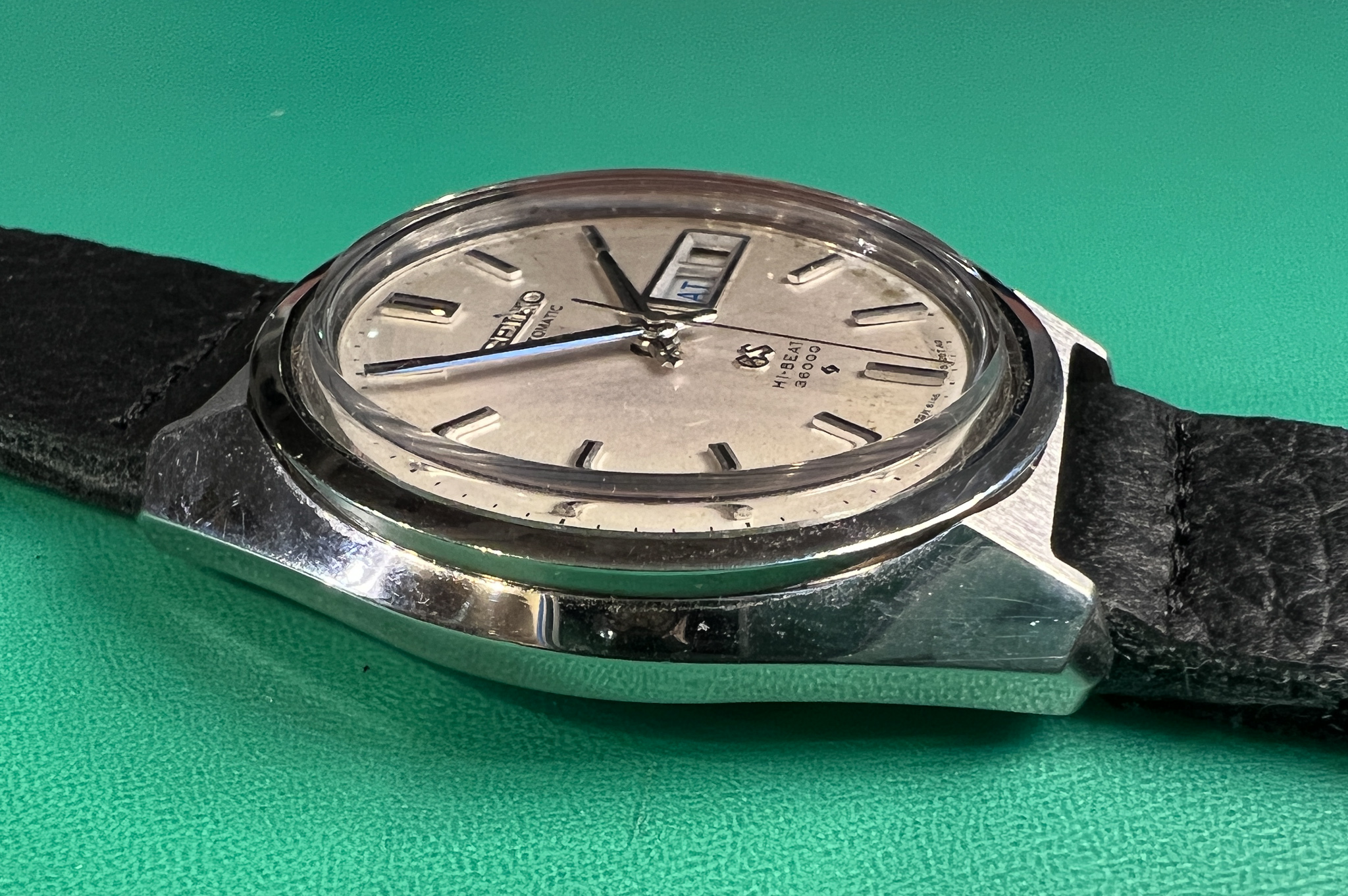 The watch runs great and it is a very clean example of the classic Seiko Grammar of Design. The case is exceptional and retains its sharp lines and factory polish. The caseback is clean and shows its original gold medallion.