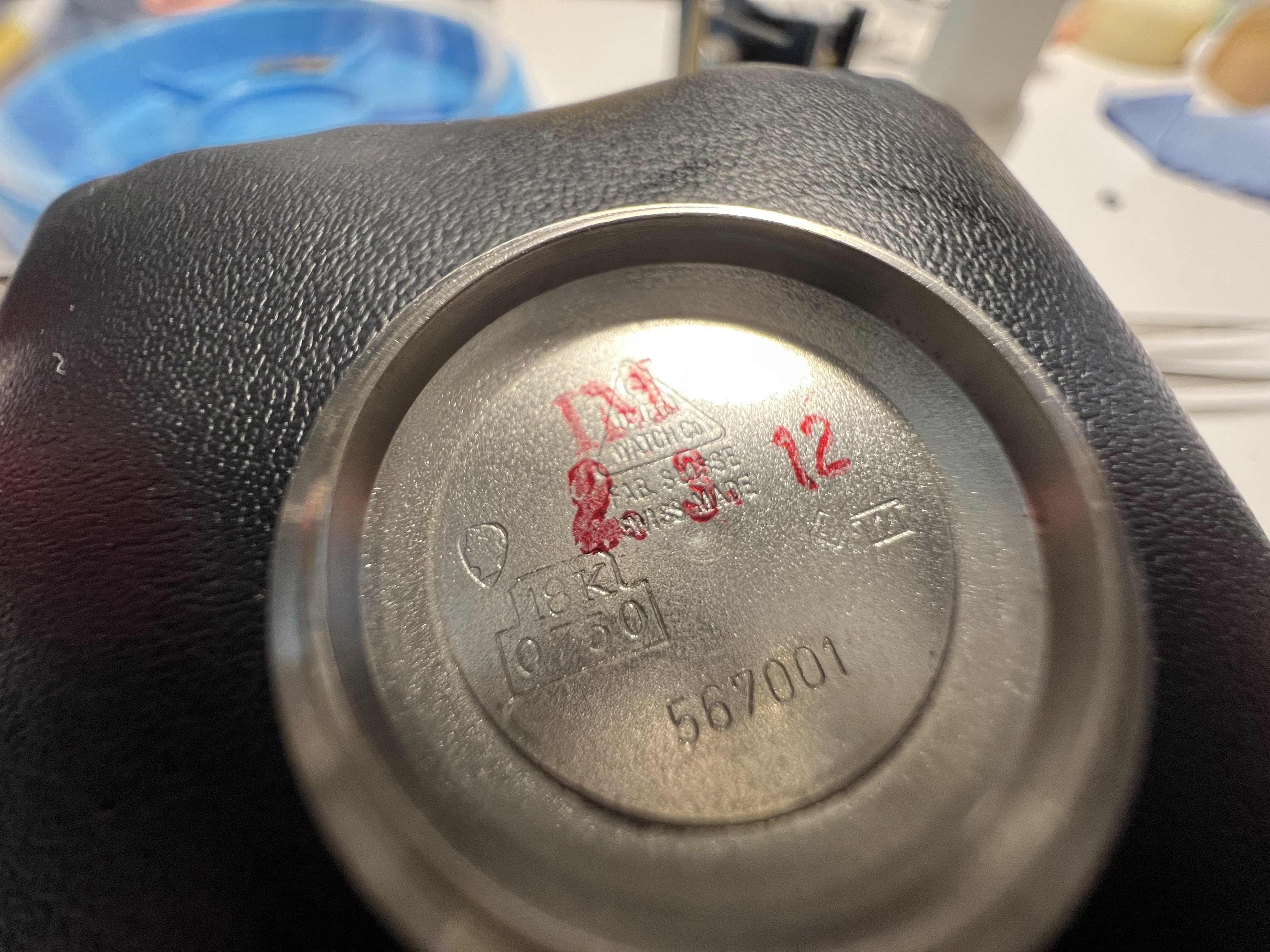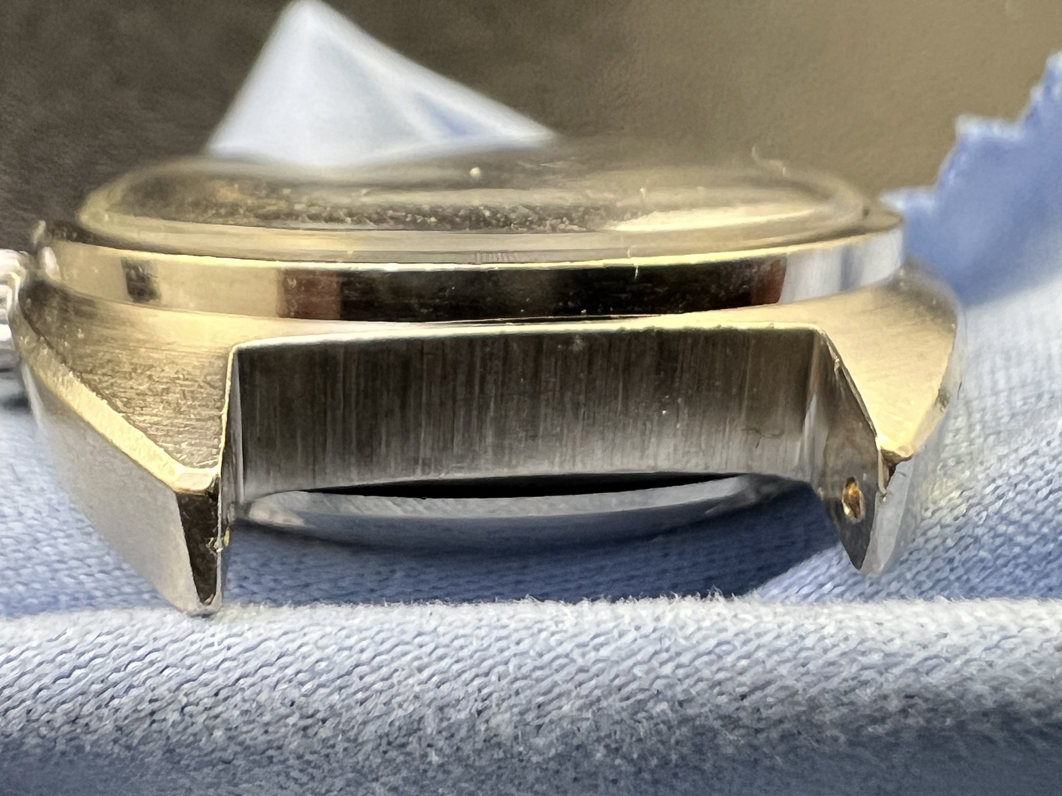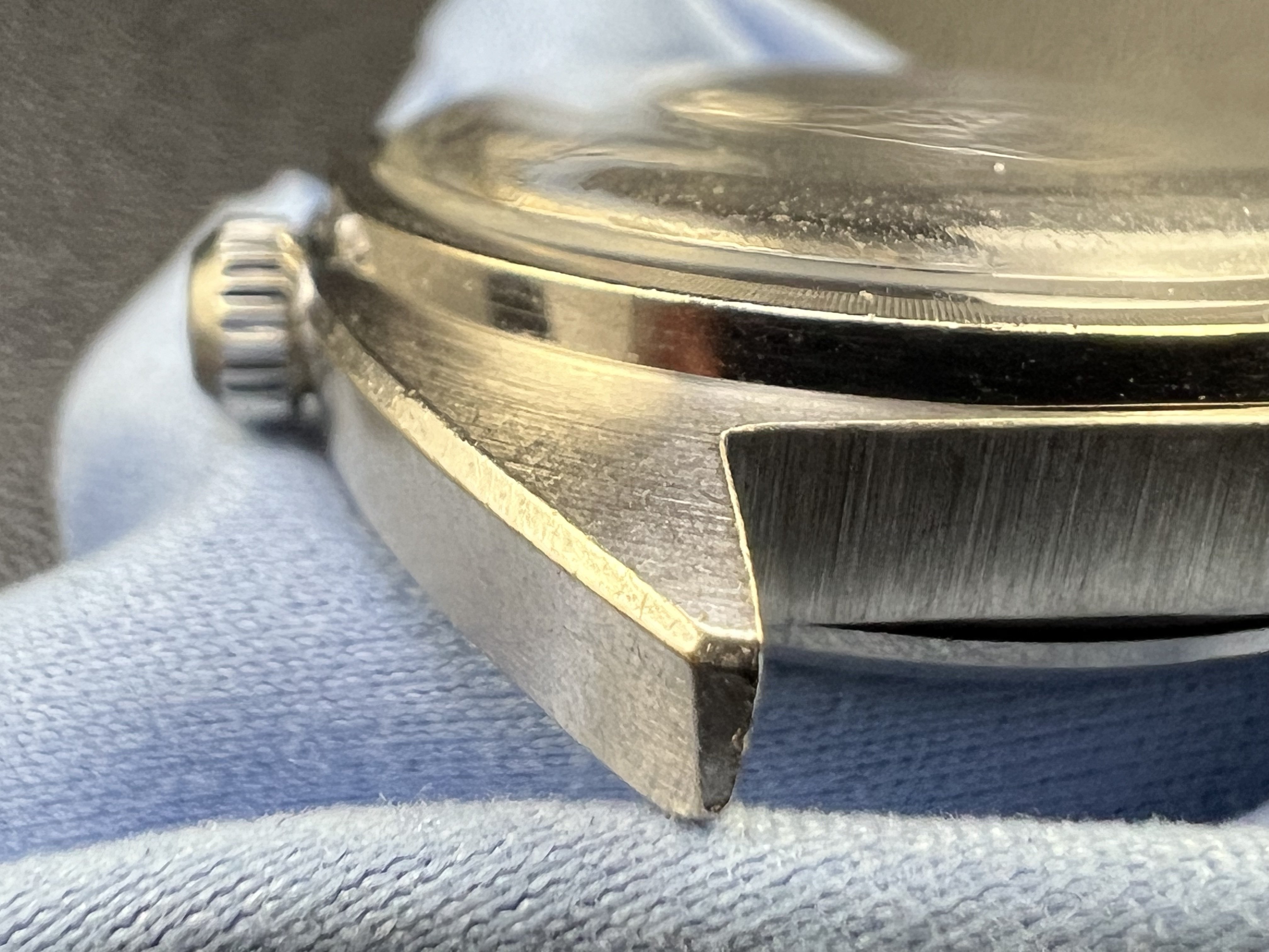 Beautiful crisp case, hard to photograph but this knurled bezel on solid white gold C-Case's have a rainbow reflection, which I find to be quite unique.