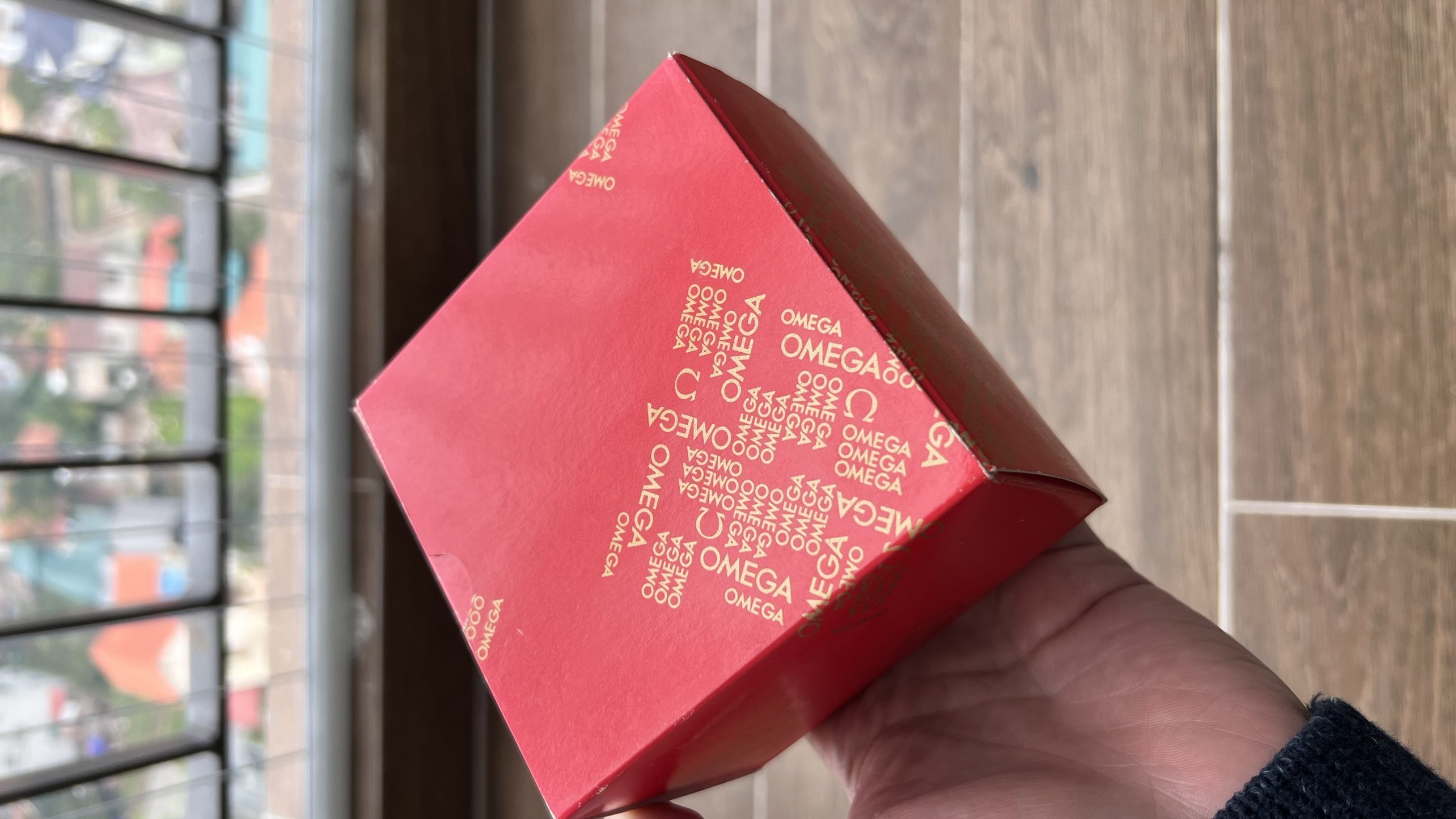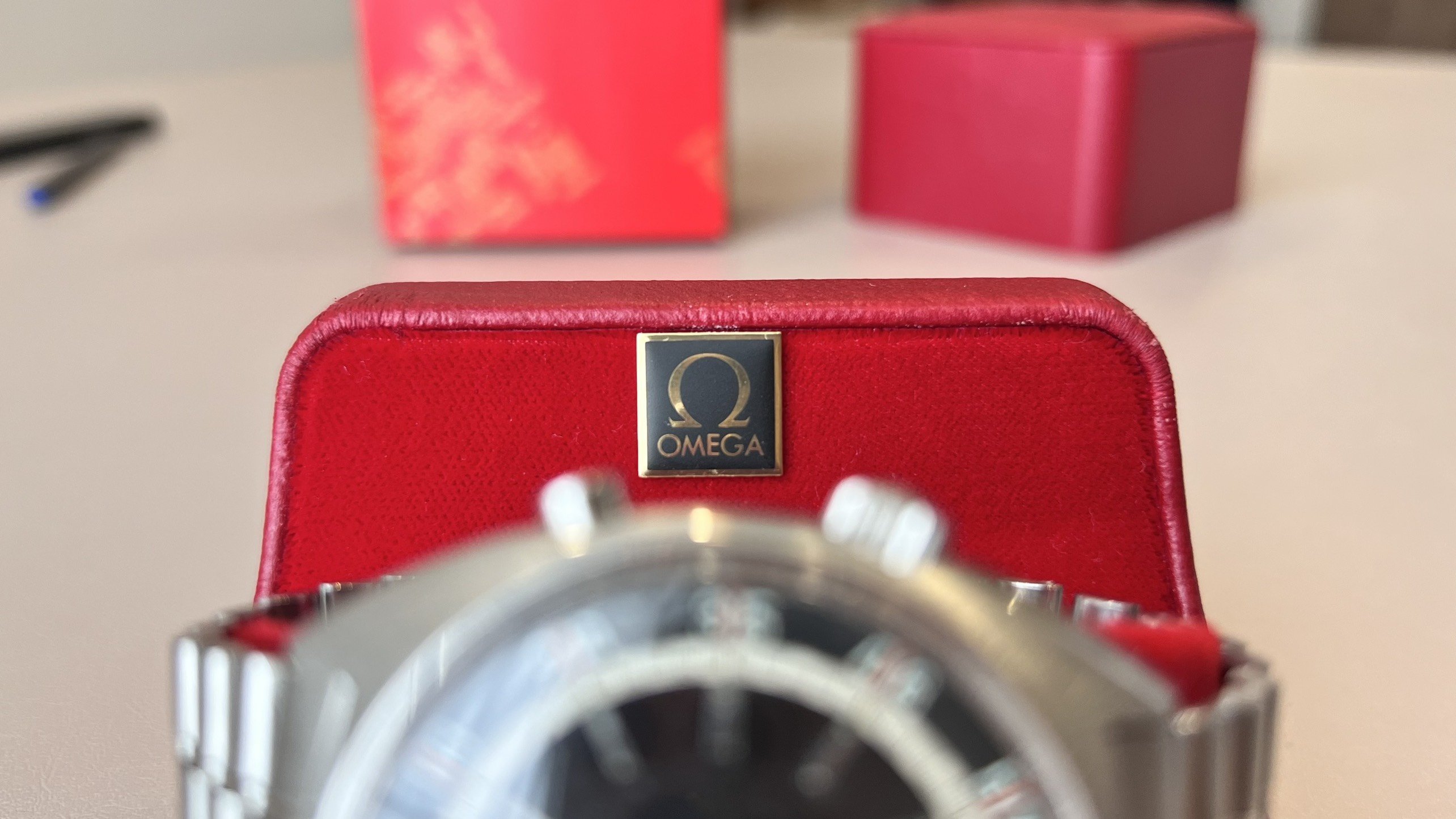 - The watch will come with the Omega double boxed, a red carton outer box, and a red plastic inner box.