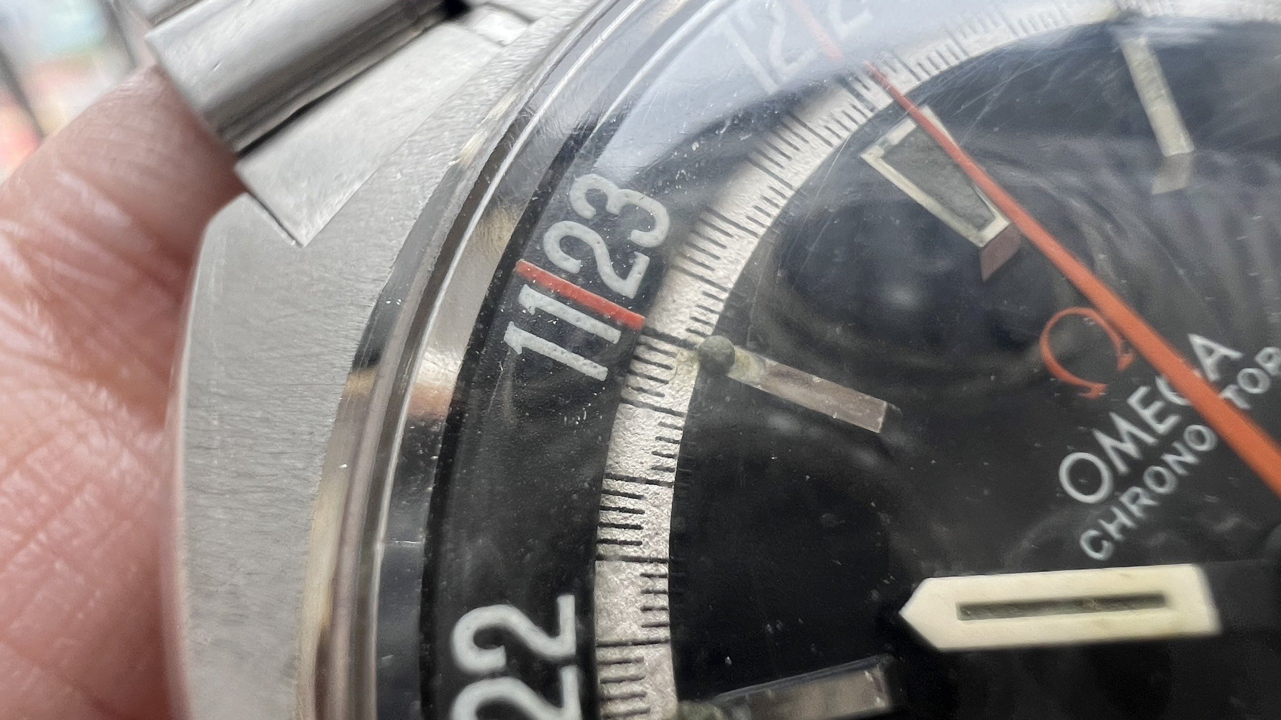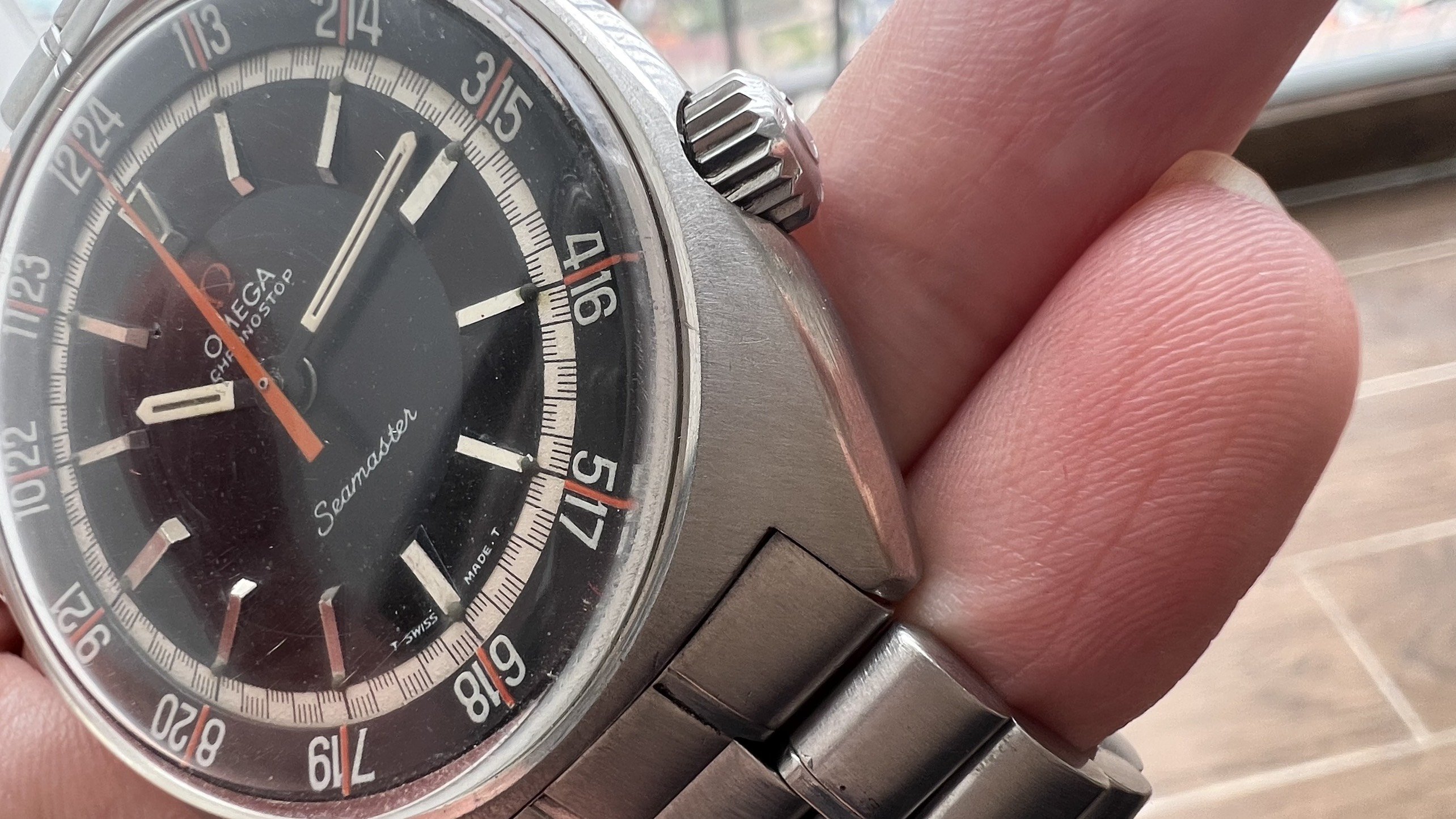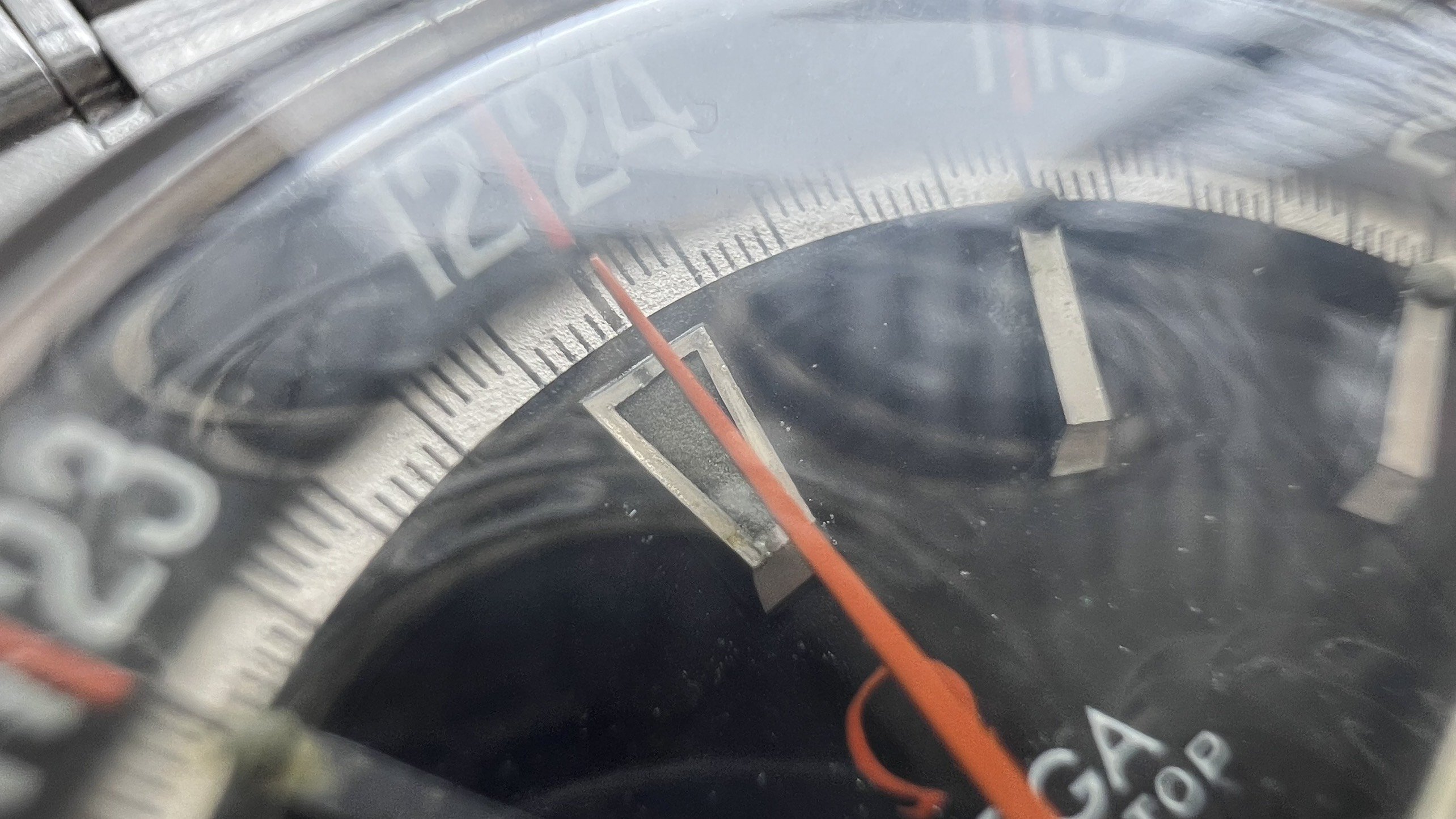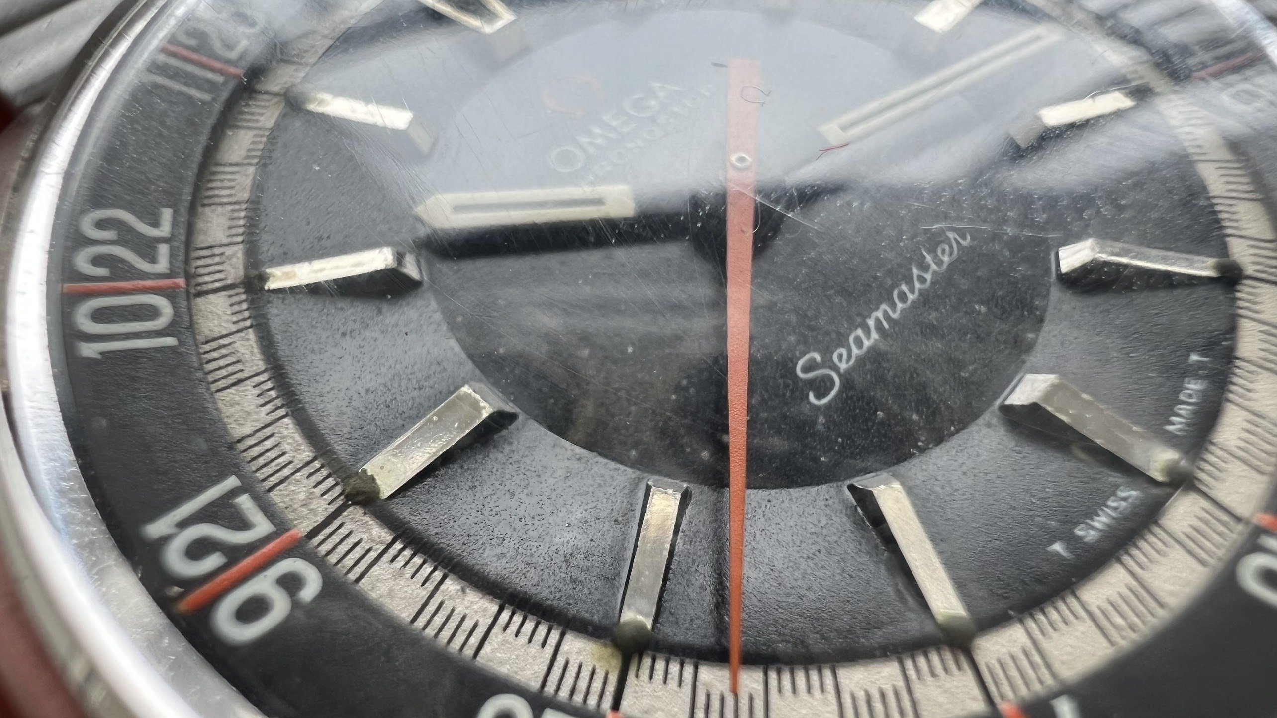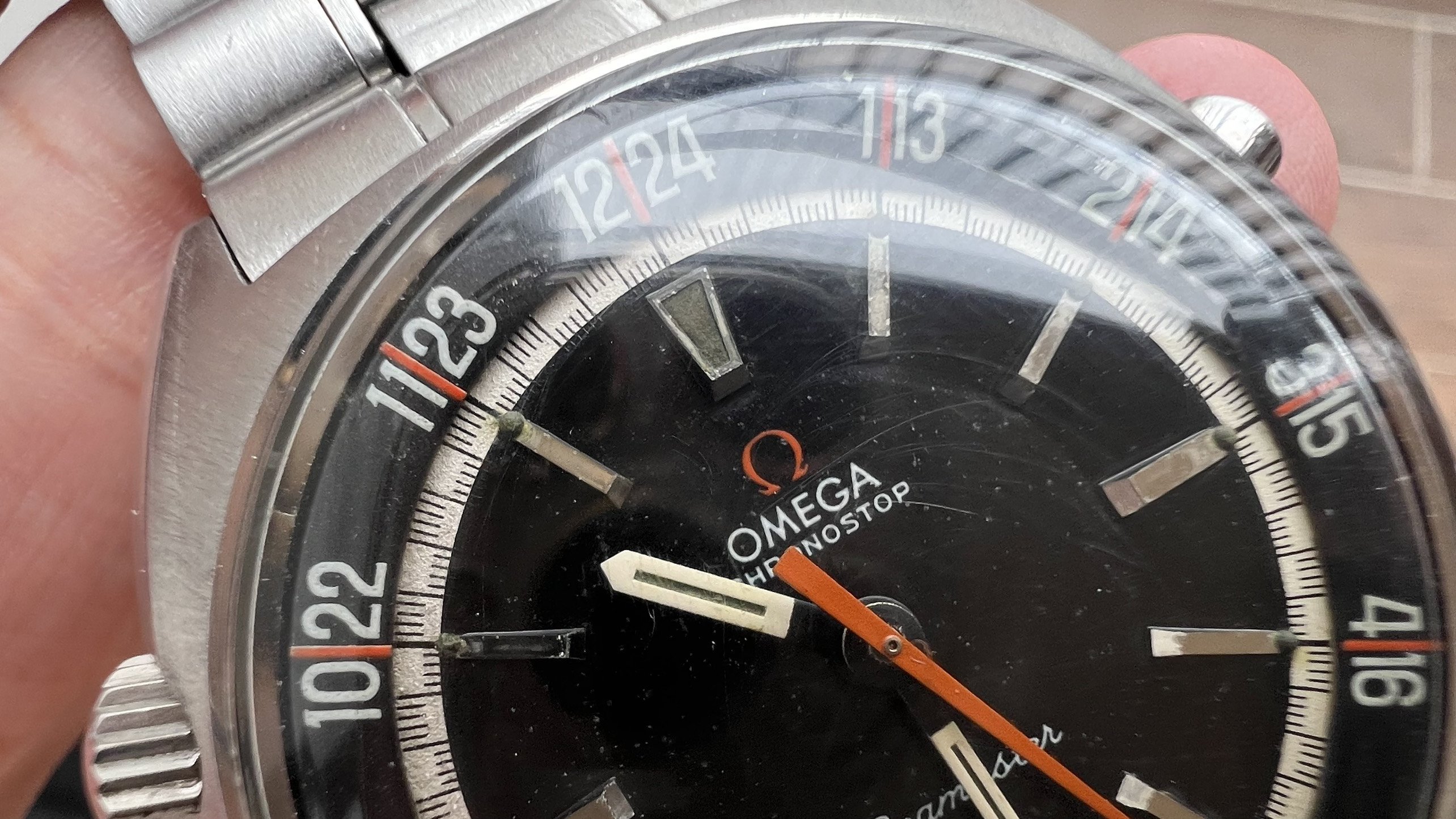 - Dial: The original black dial is in average condition with signs of aging. All lumes are still attached; however, they are discolored and have turned dark. The combination of the orange Omega logo, orange second hand, and revert pie pan makes the dial look really cool. The inner bezel rotates when turning the crown at 10 o'clock.