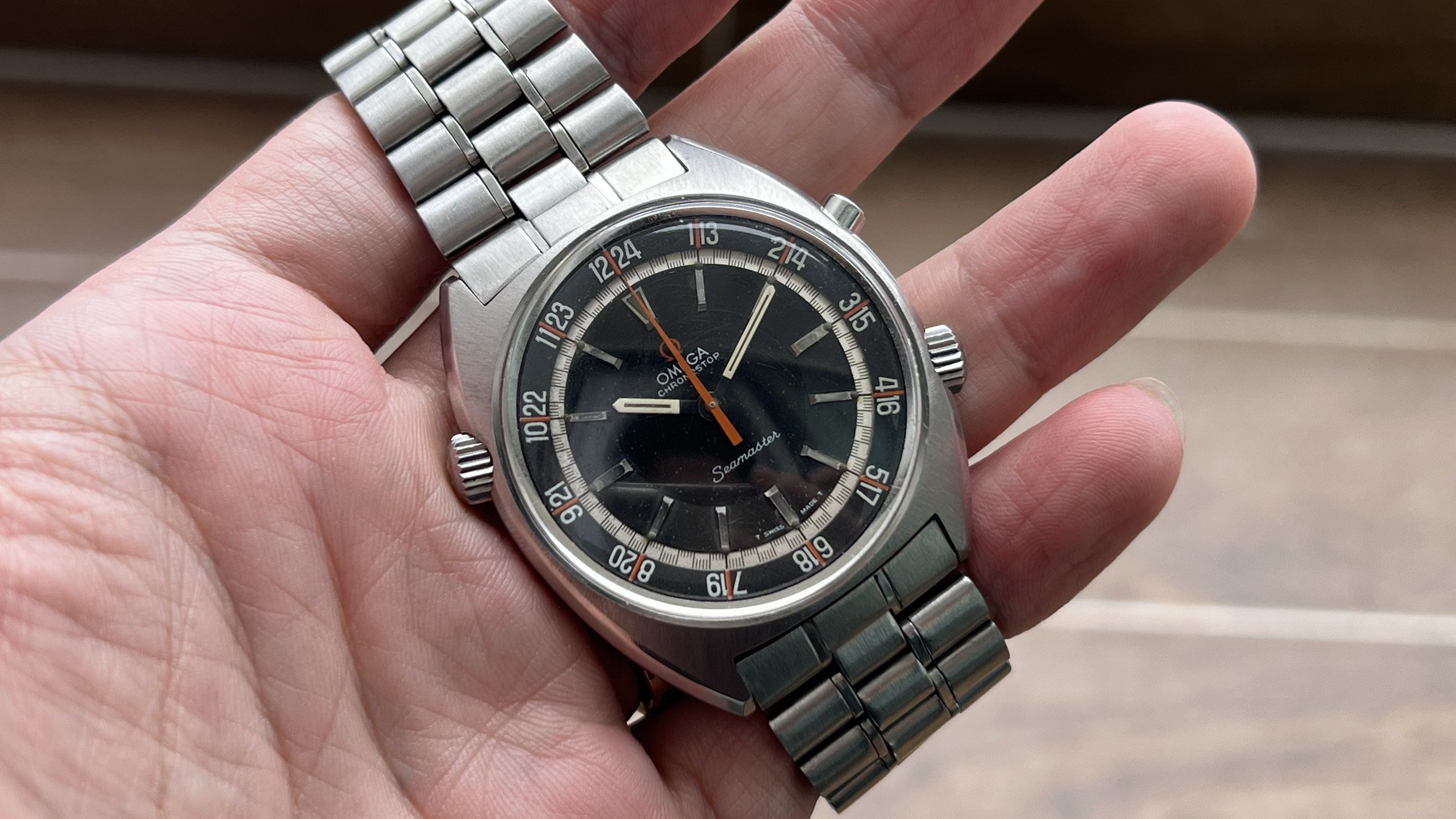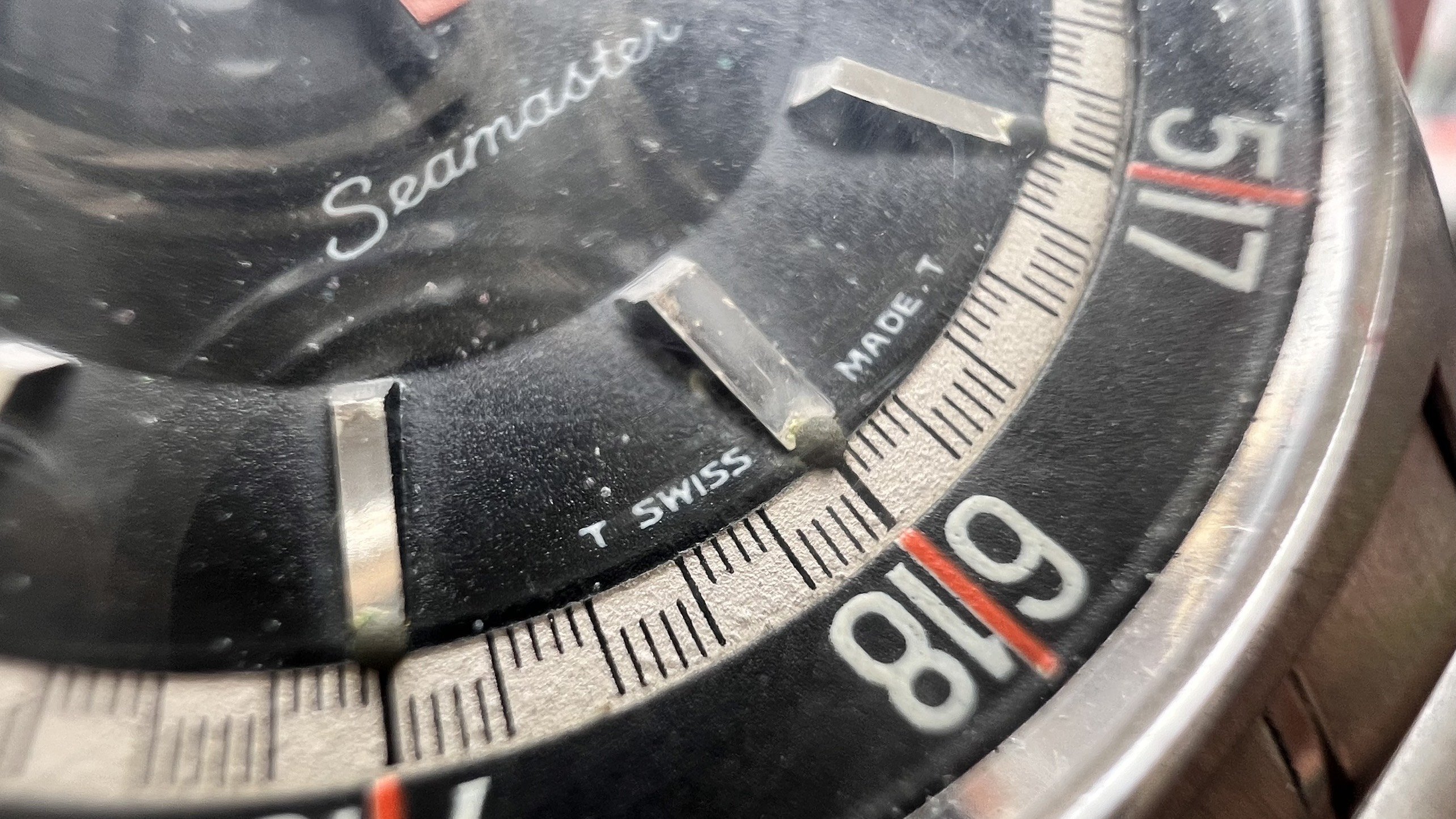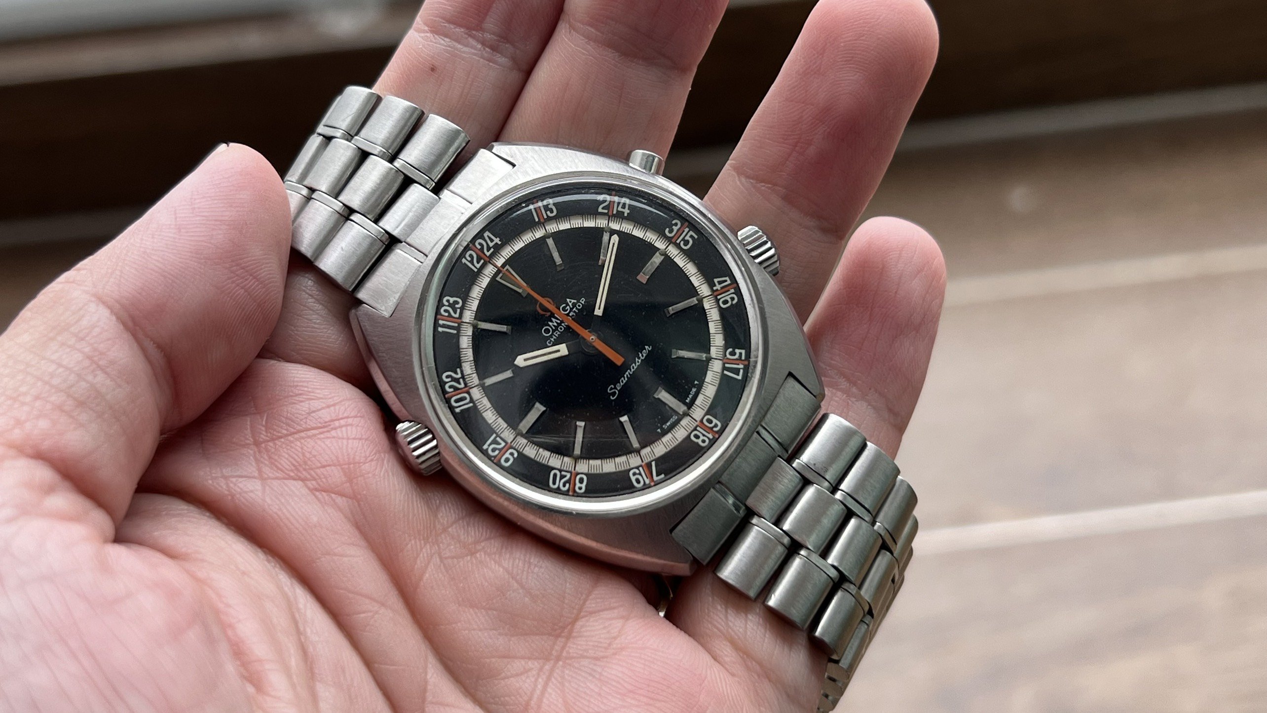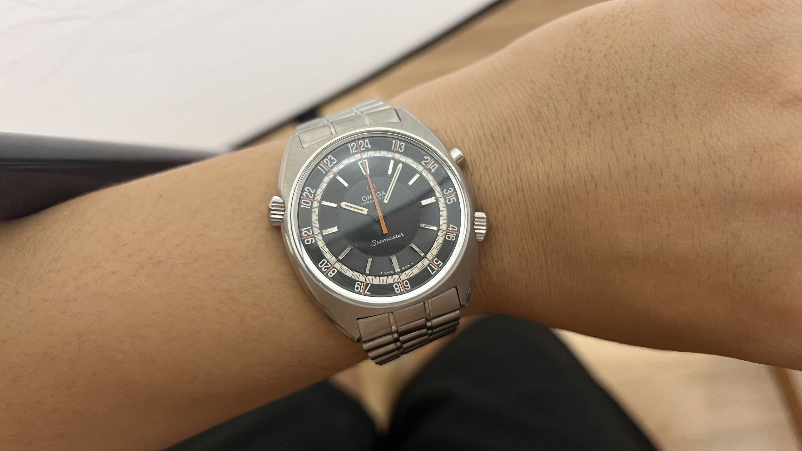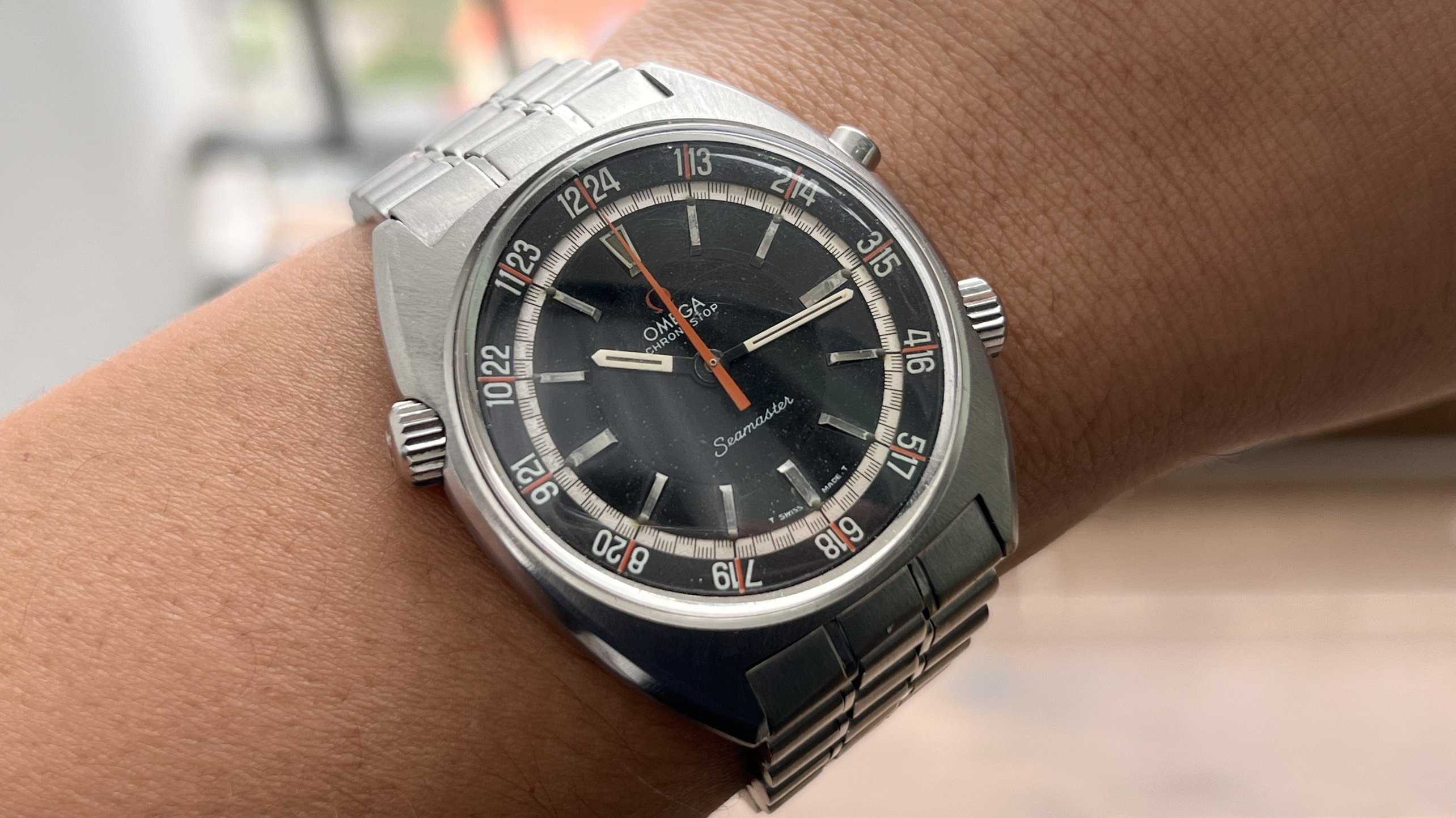 - Dial: The original black dial is in average condition with signs of aging. All lumes are still attached; however, they are discolored and have turned dark. The combination of the orange Omega logo, orange second hand, and revert pie pan makes the dial look really cool. The inner bezel rotates when turning the crown at 10 o'clock.