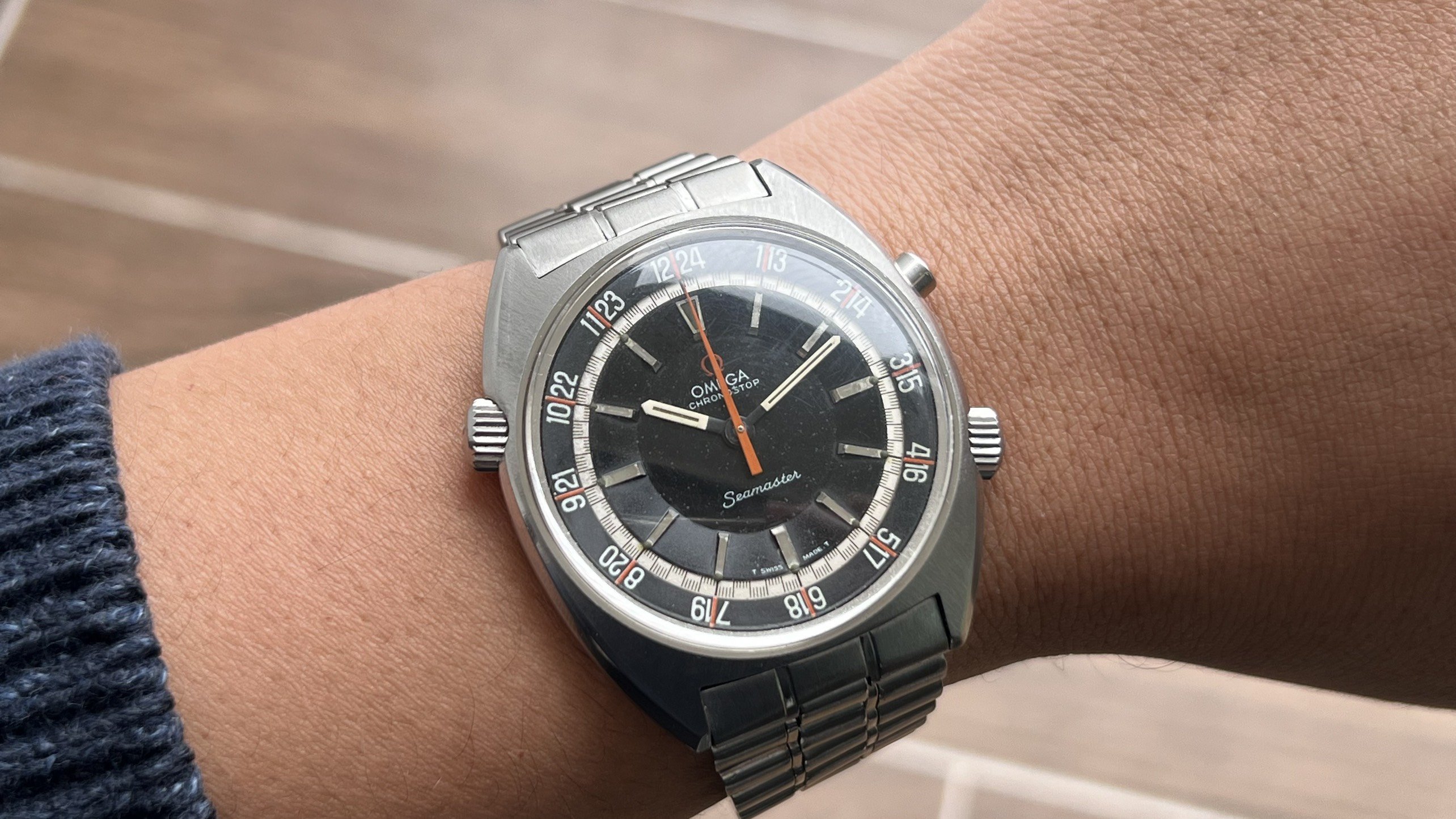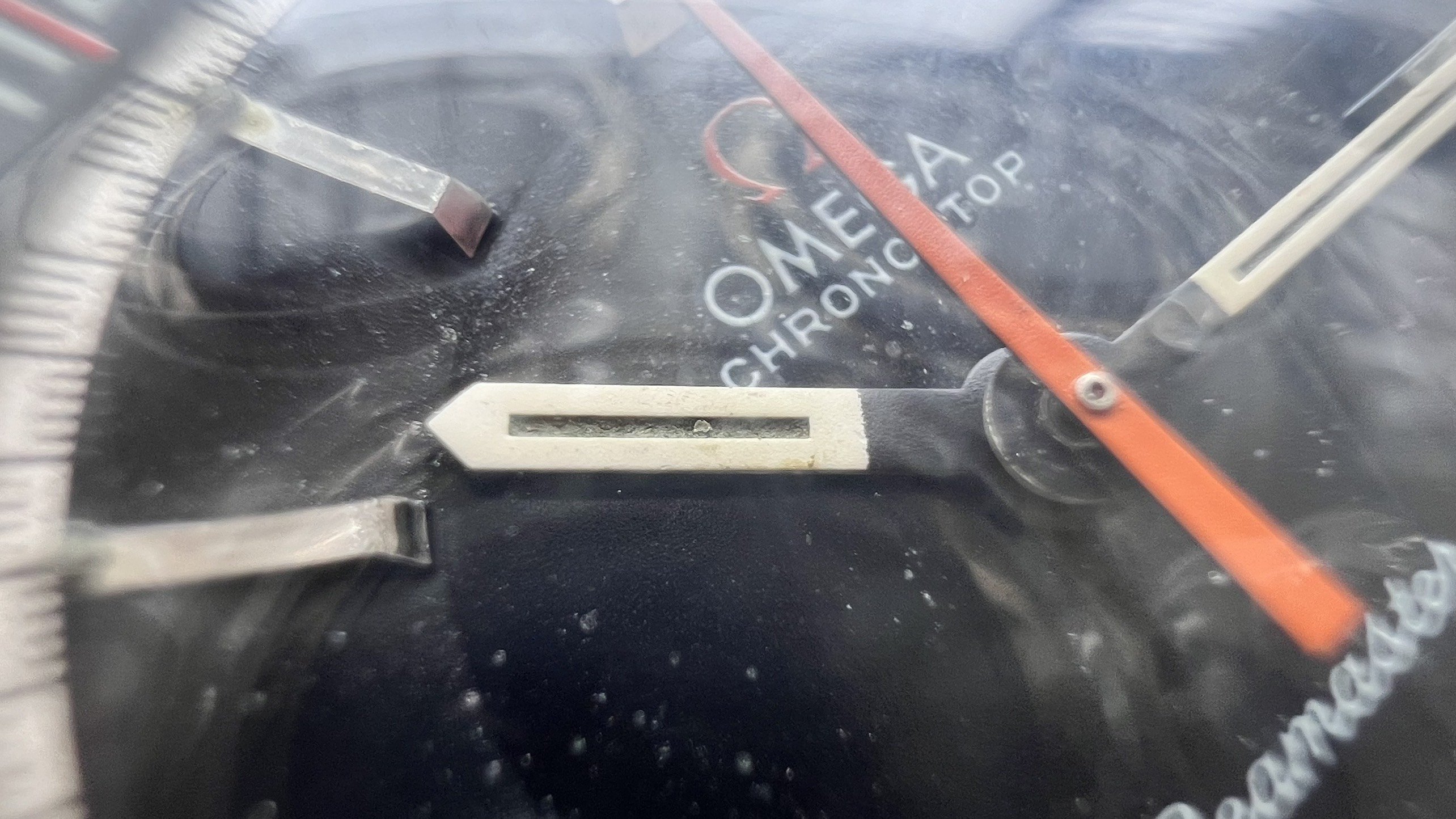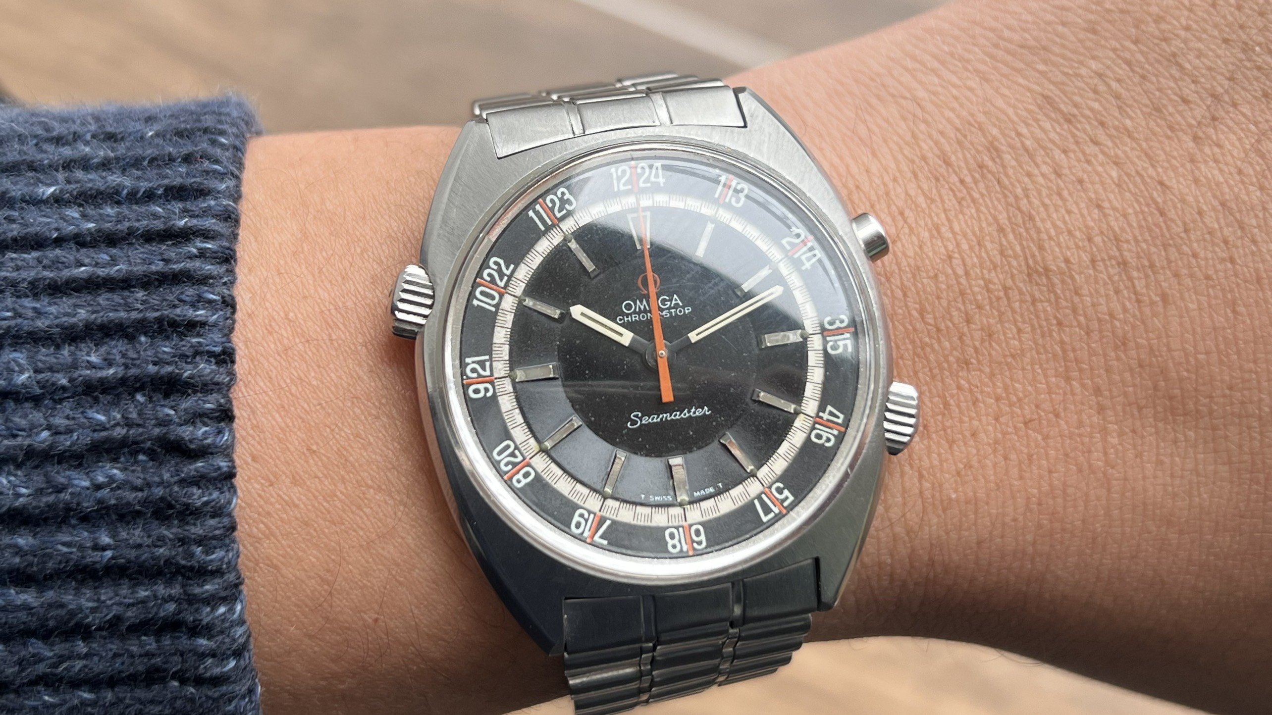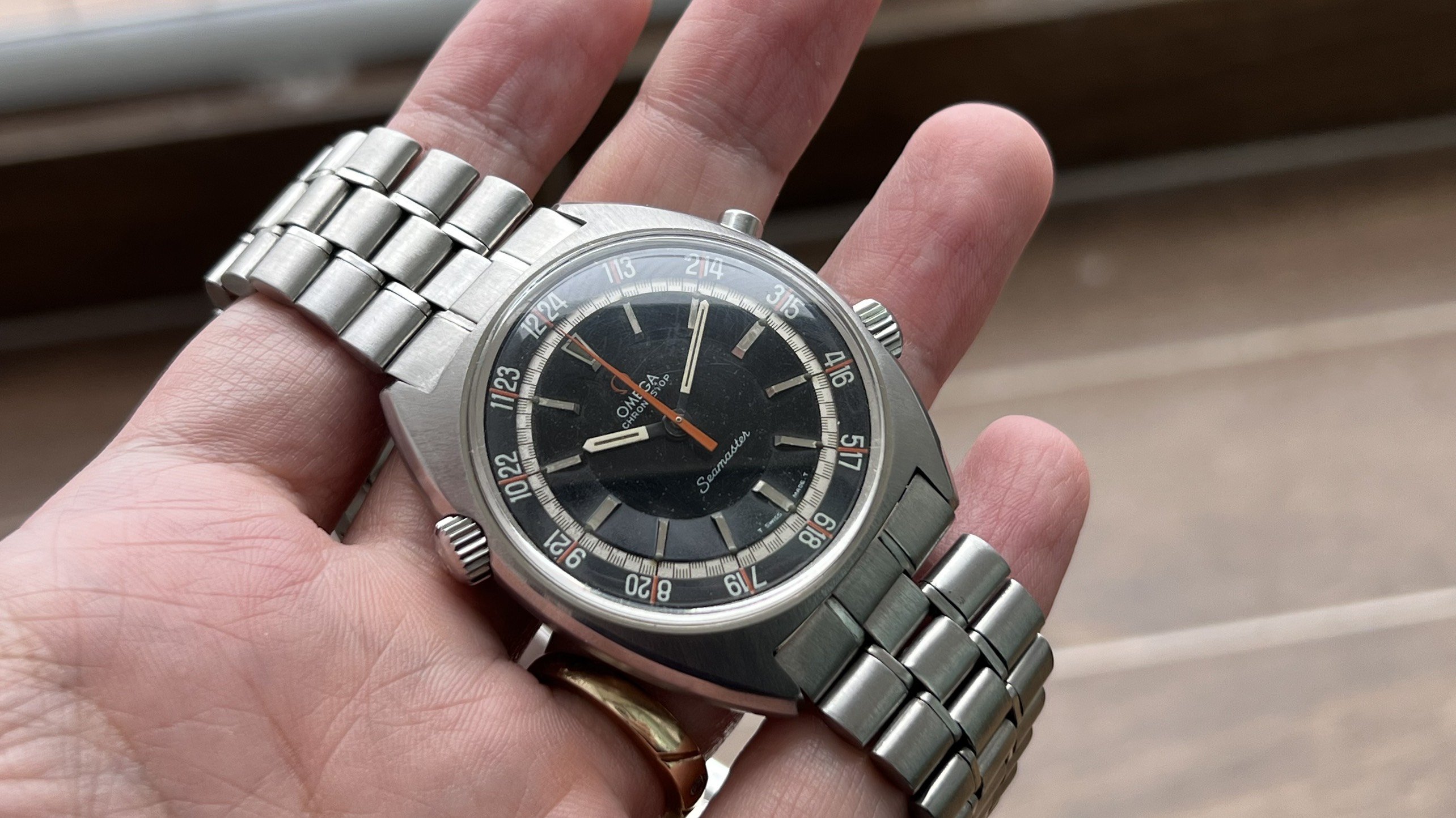 - Dial: The original black dial is in average condition with signs of aging. All lumes are still attached; however, they are discolored and have turned dark. The combination of the orange Omega logo, orange second hand, and revert pie pan makes the dial look really cool. The inner bezel rotates when turning the crown at 10 o'clock.