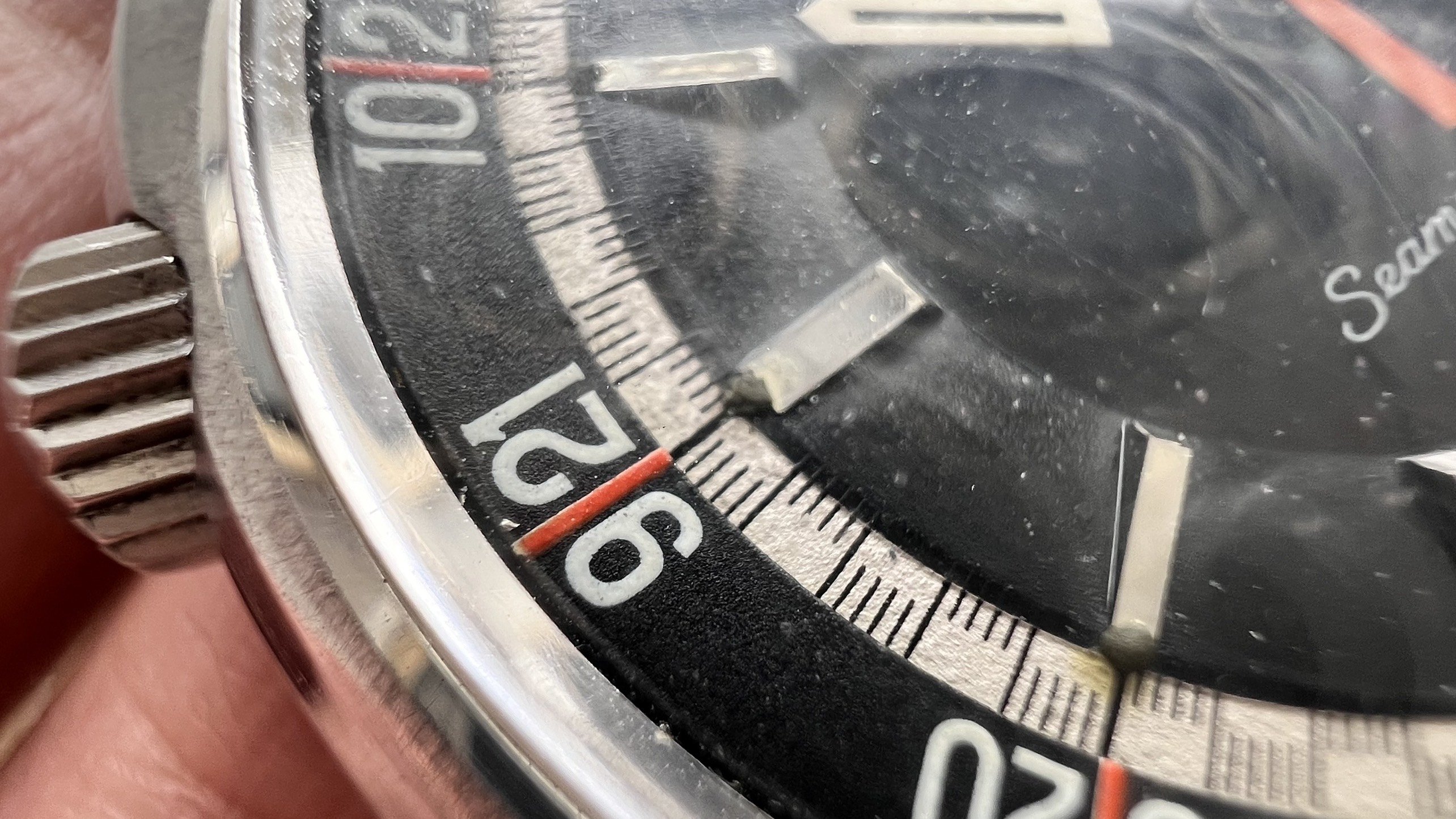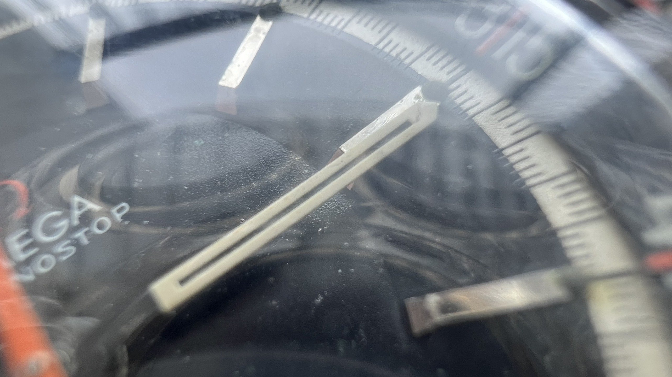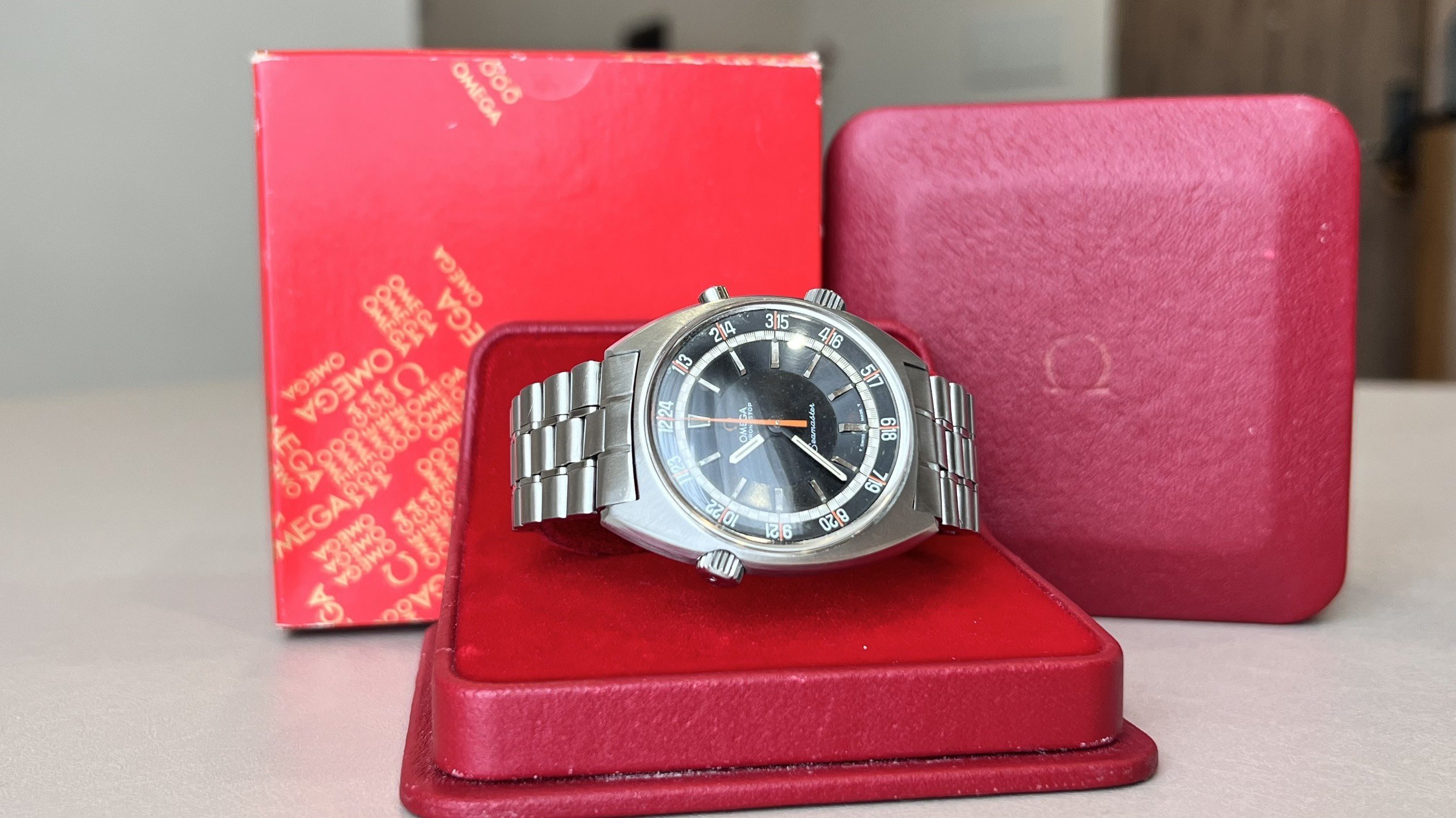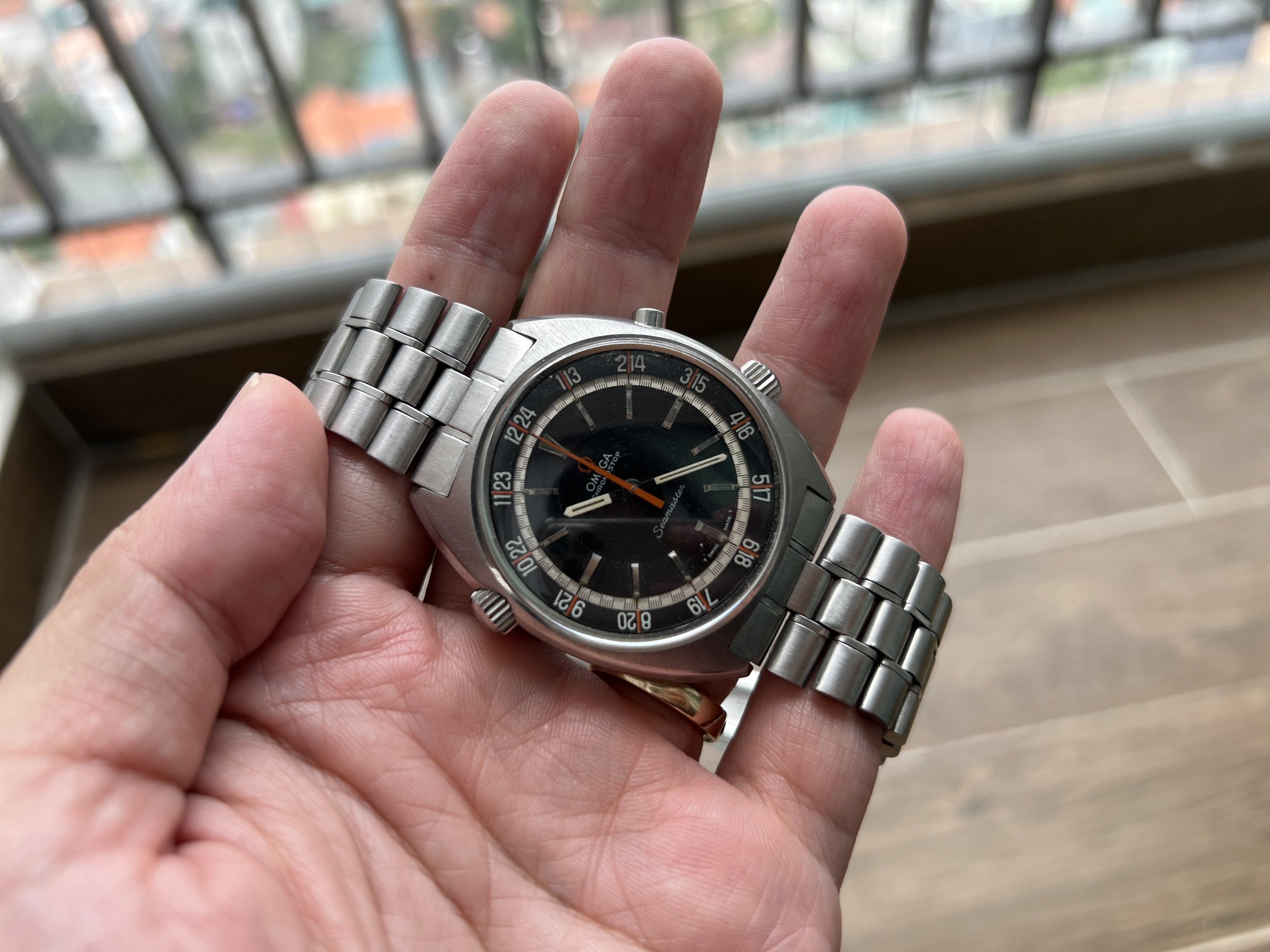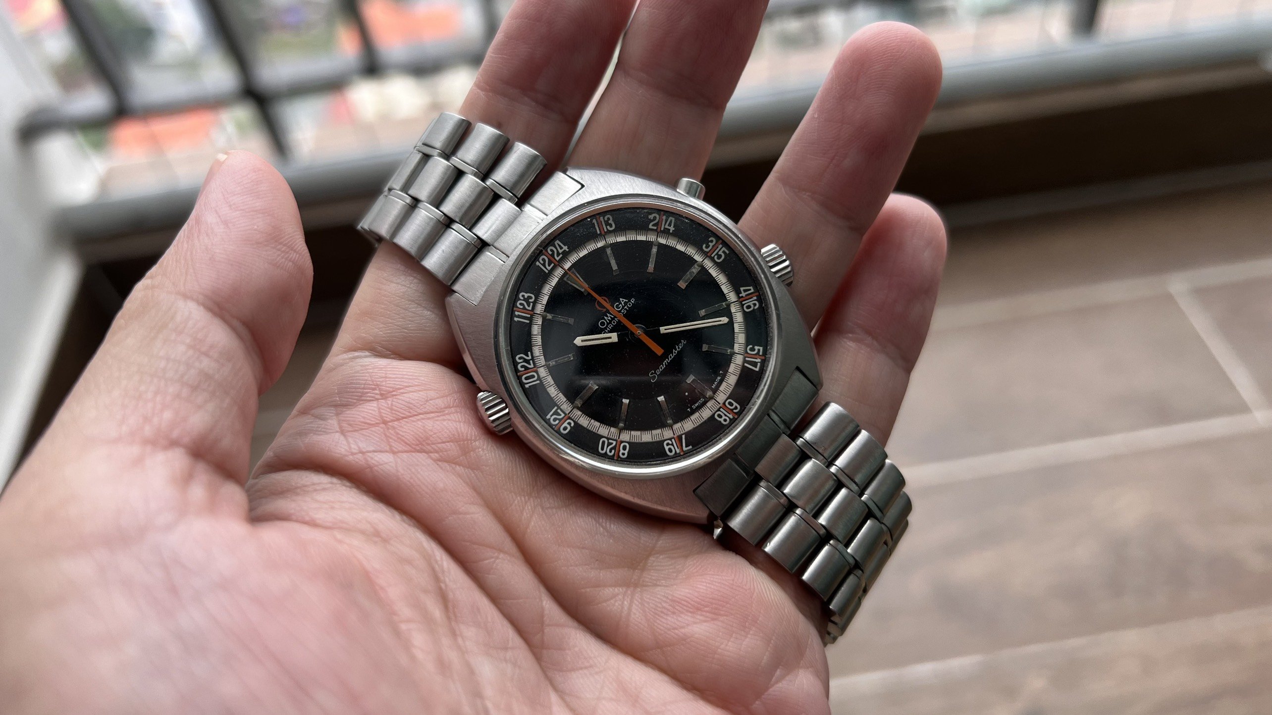 - Dial: The original black dial is in average condition with signs of aging. All lumes are still attached; however, they are discolored and have turned dark. The combination of the orange Omega logo, orange second hand, and revert pie pan makes the dial look really cool. The inner bezel rotates when turning the crown at 10 o'clock.