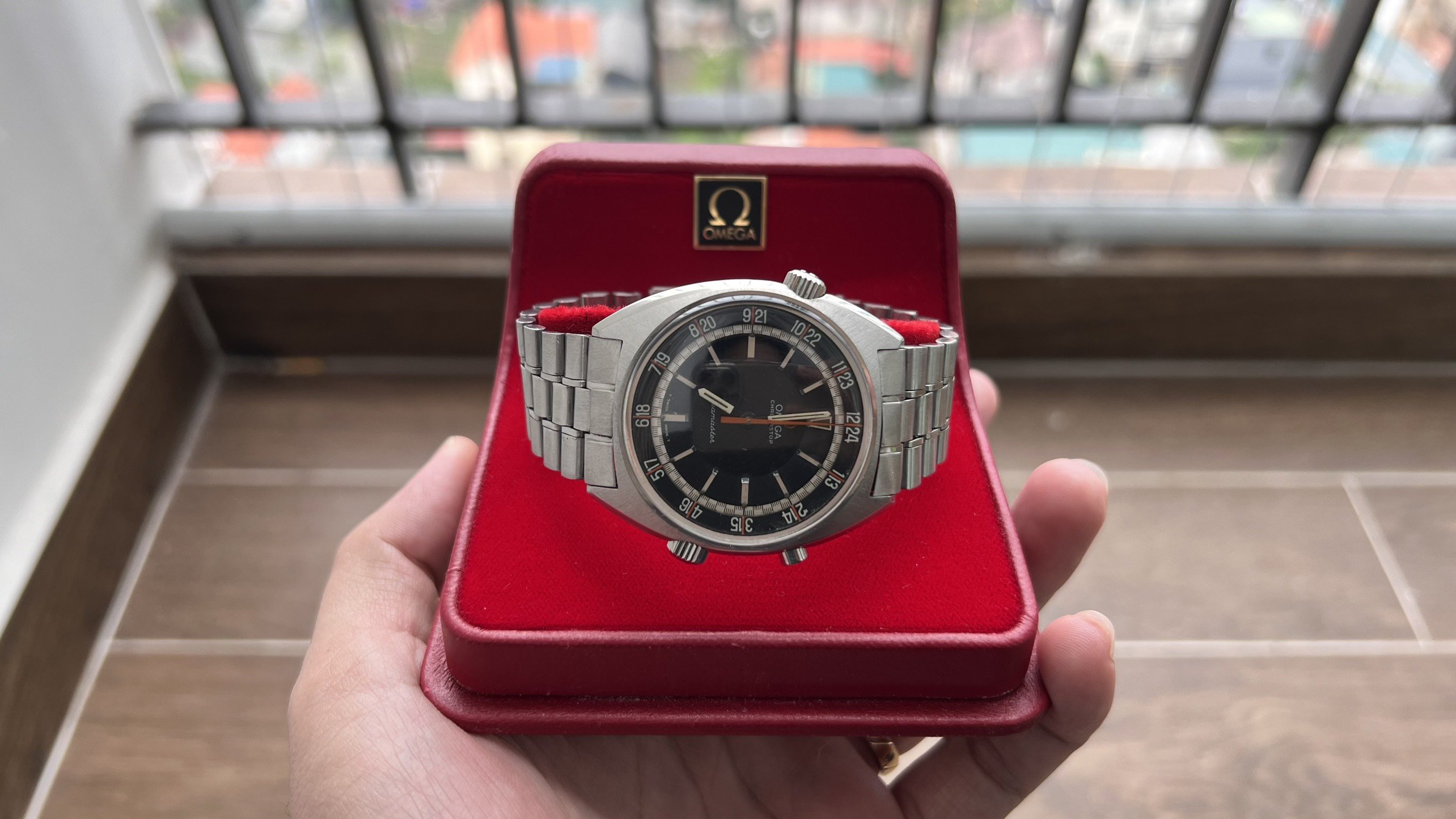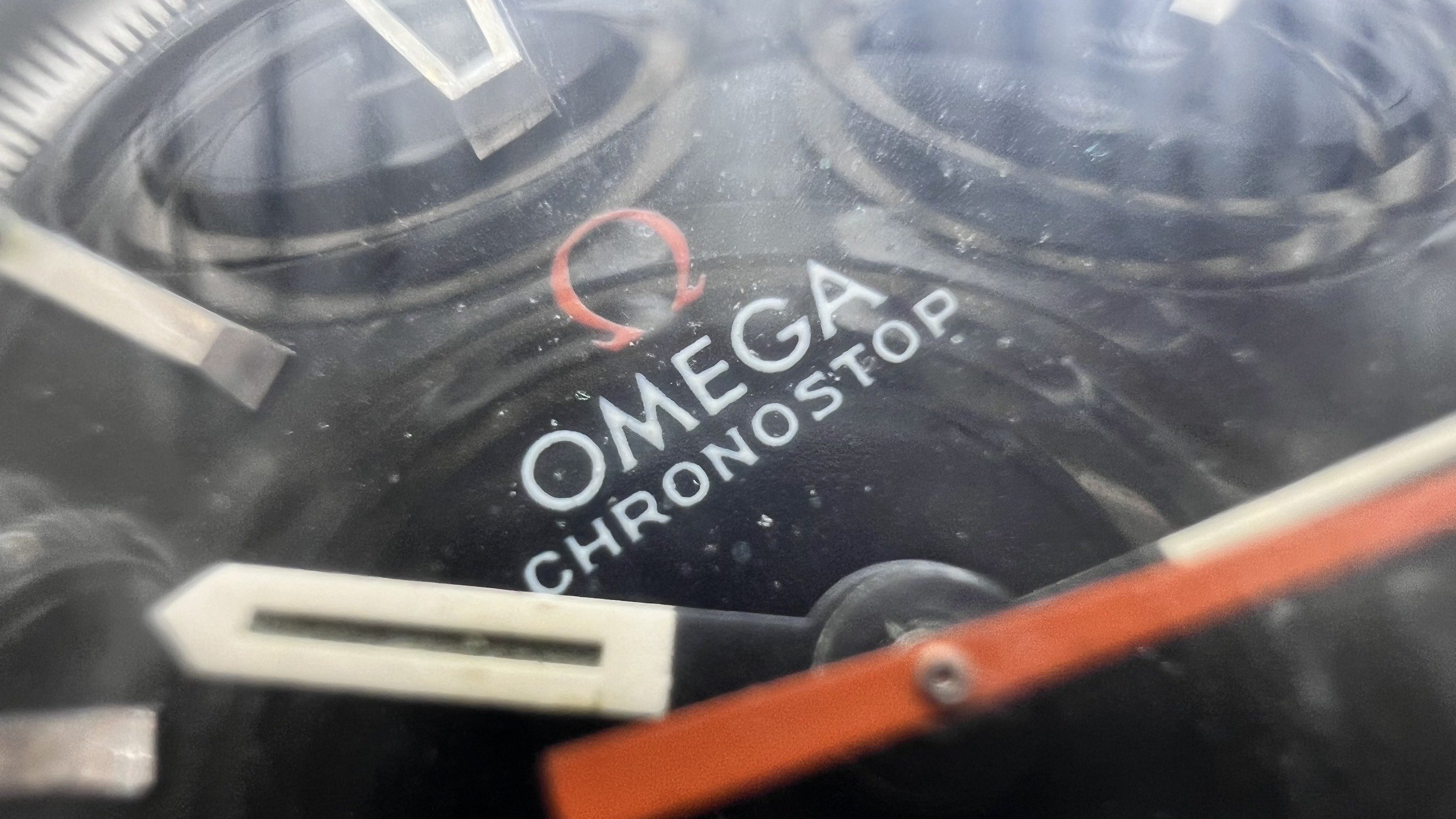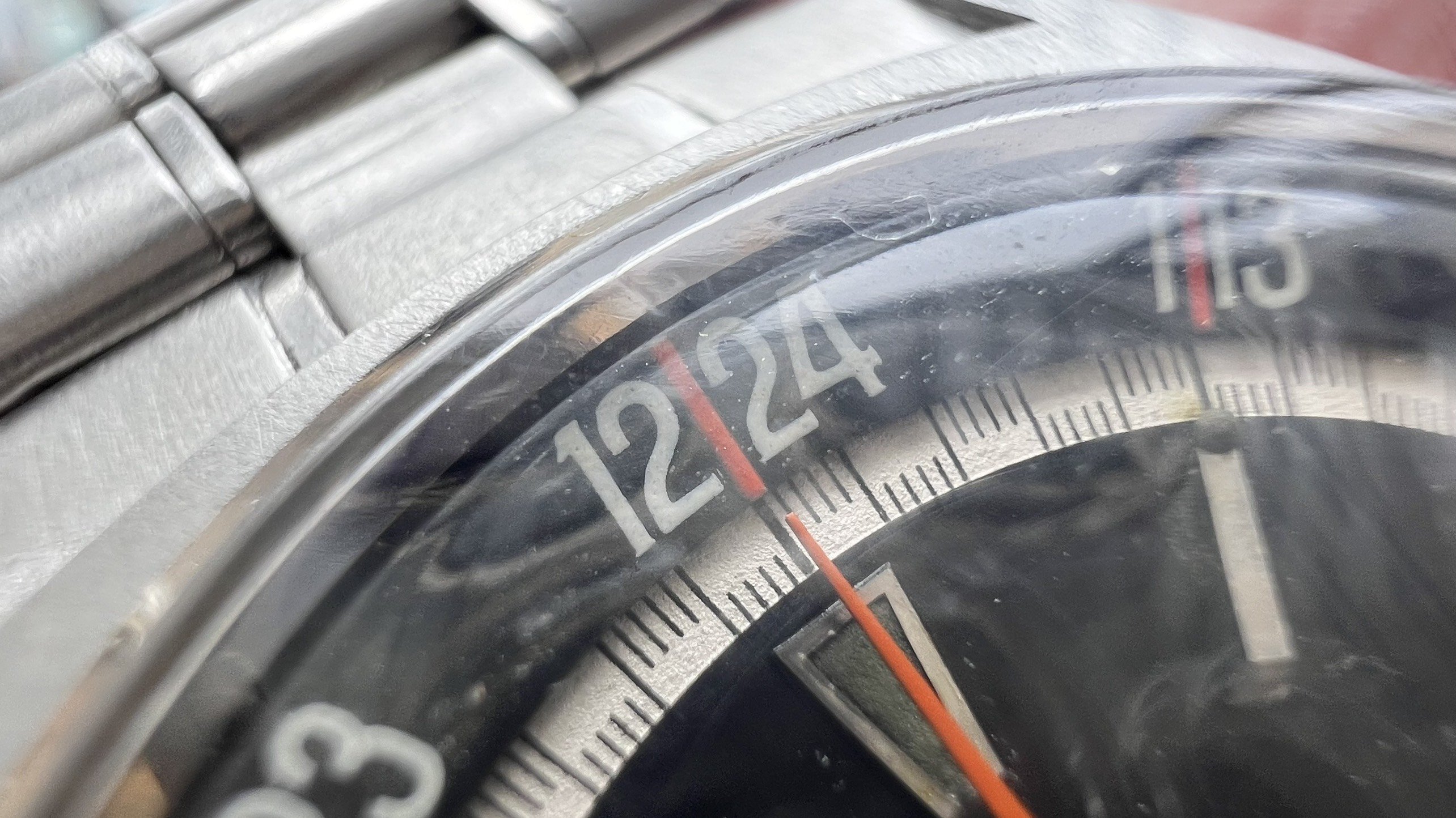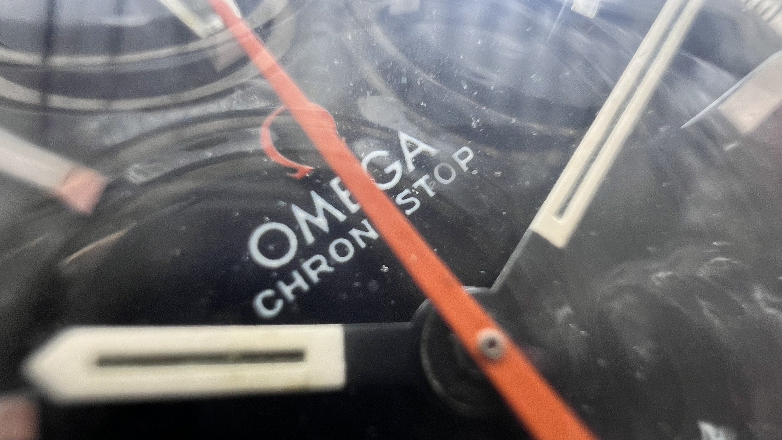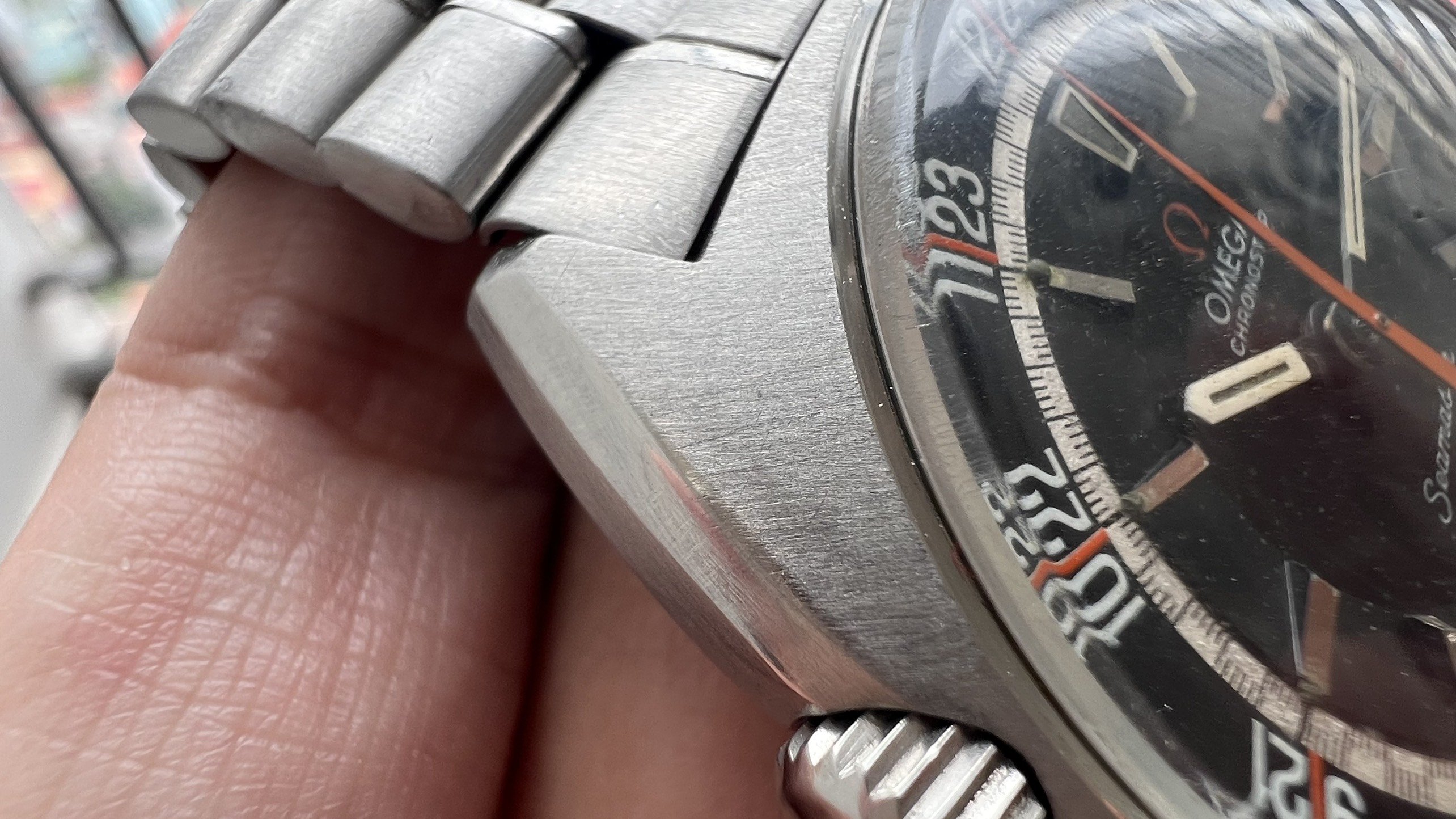 - Dial: The original black dial is in average condition with signs of aging. All lumes are still attached; however, they are discolored and have turned dark. The combination of the orange Omega logo, orange second hand, and revert pie pan makes the dial look really cool. The inner bezel rotates when turning the crown at 10 o'clock.