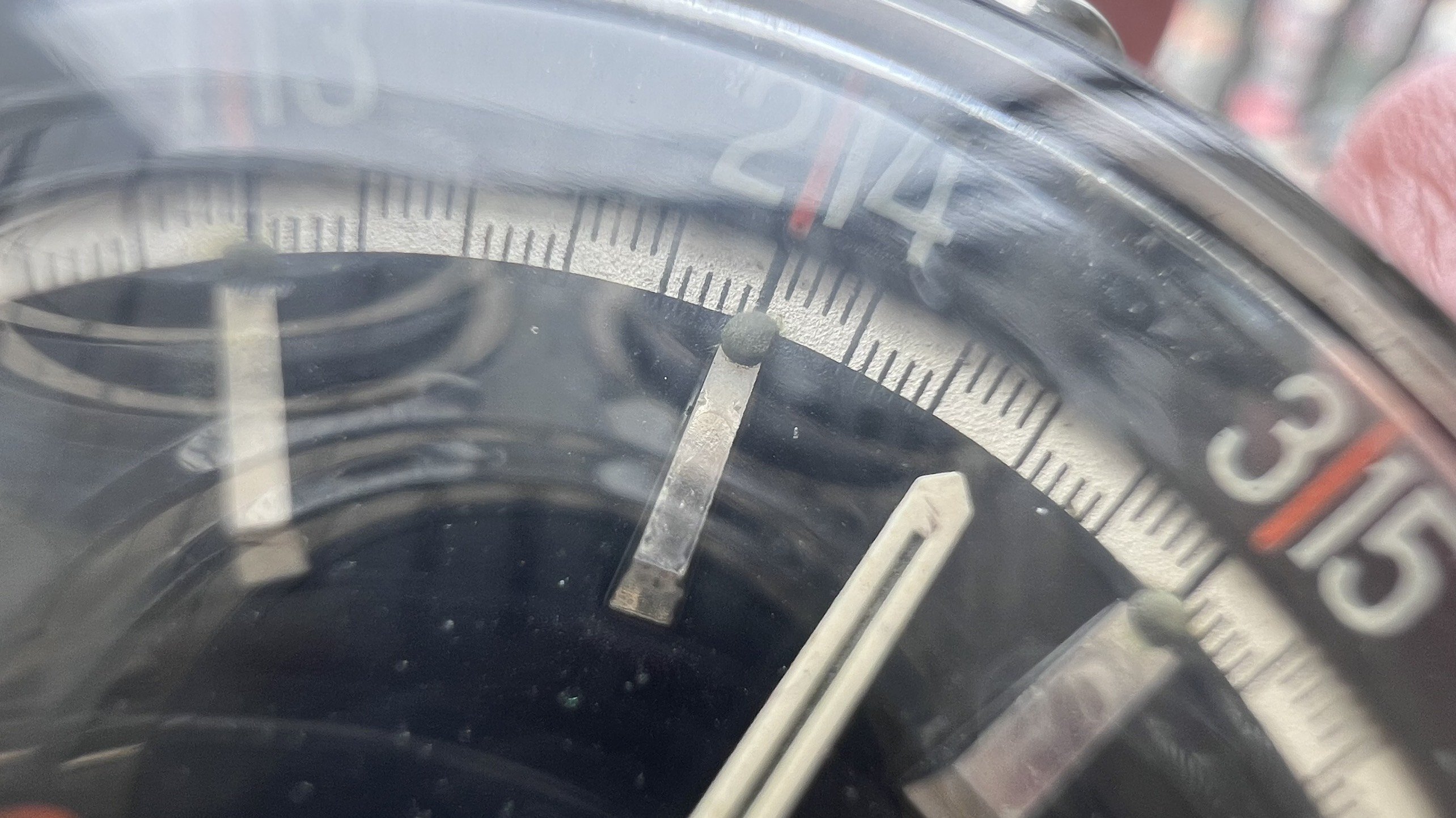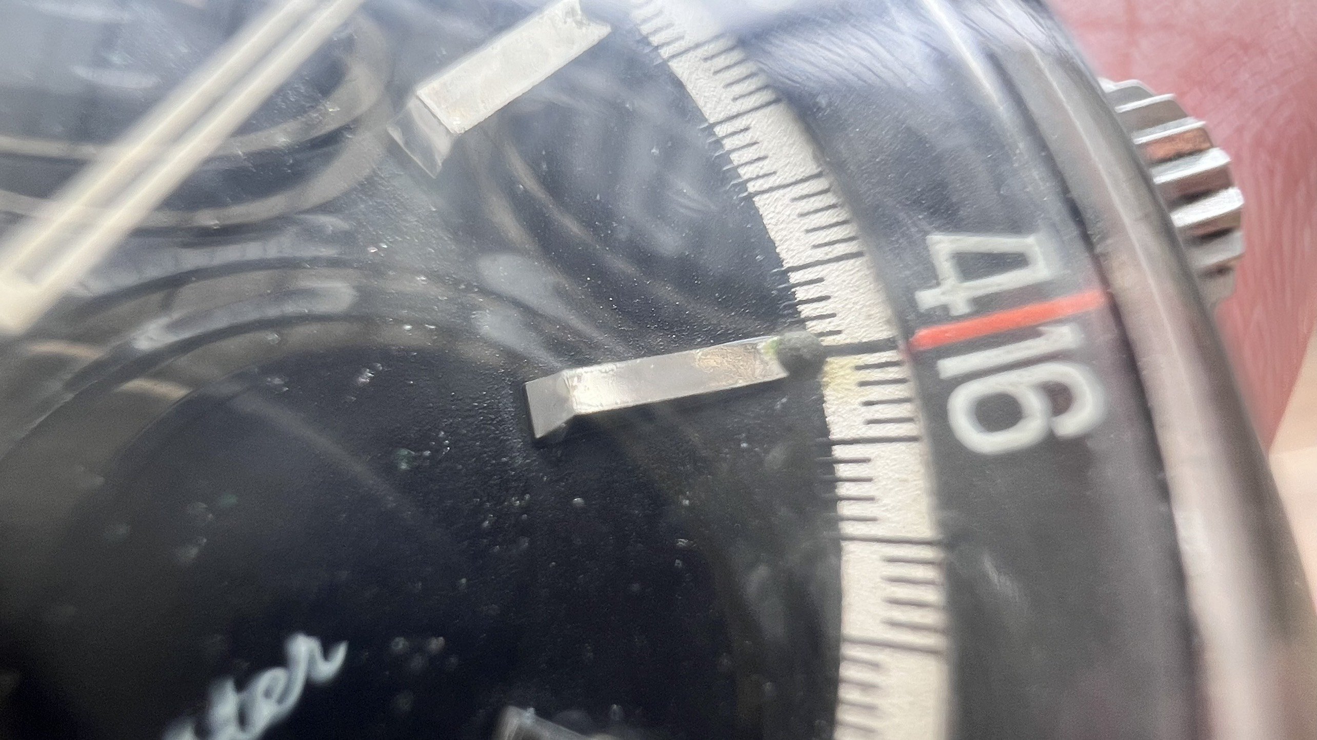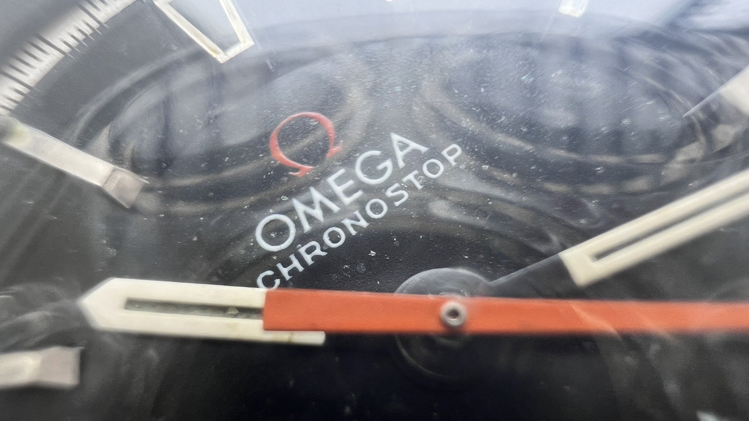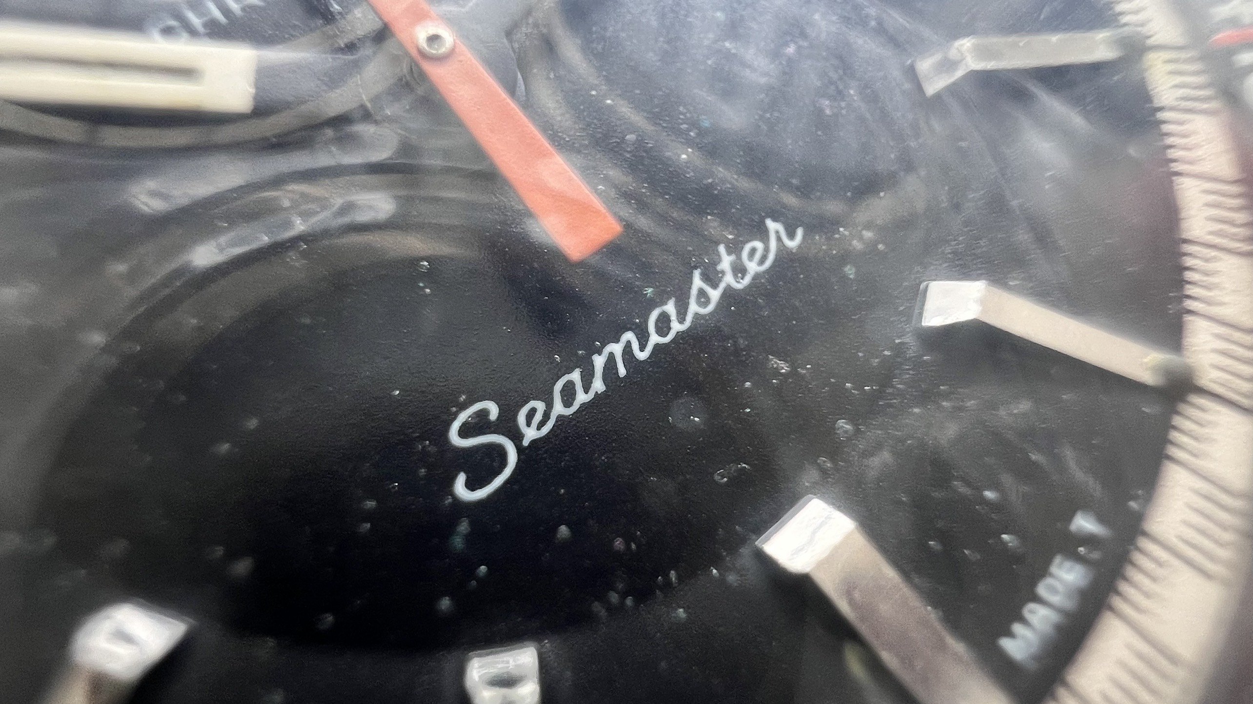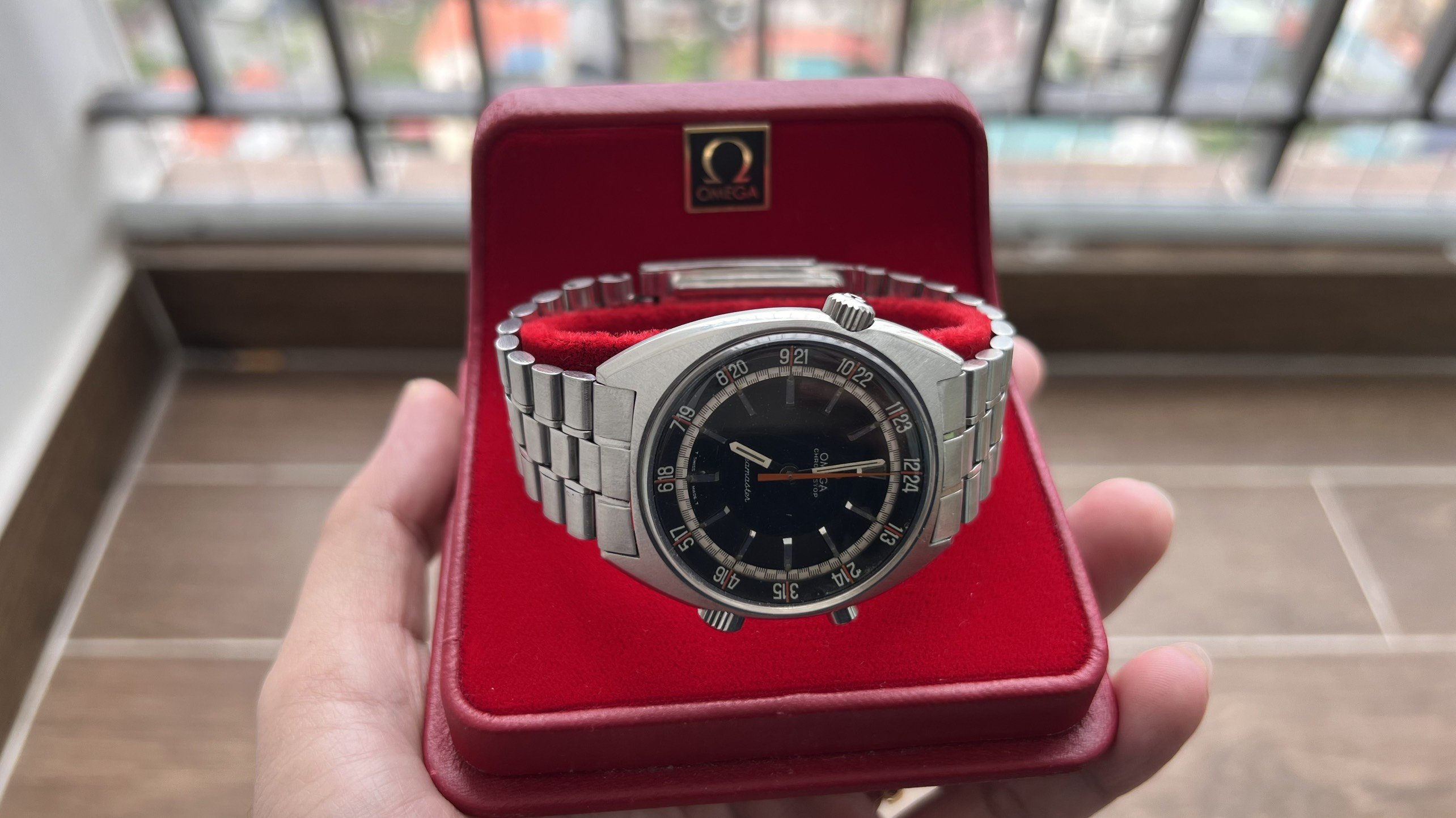 - Dial: The original black dial is in average condition with signs of aging. All lumes are still attached; however, they are discolored and have turned dark. The combination of the orange Omega logo, orange second hand, and revert pie pan makes the dial look really cool. The inner bezel rotates when turning the crown at 10 o'clock.