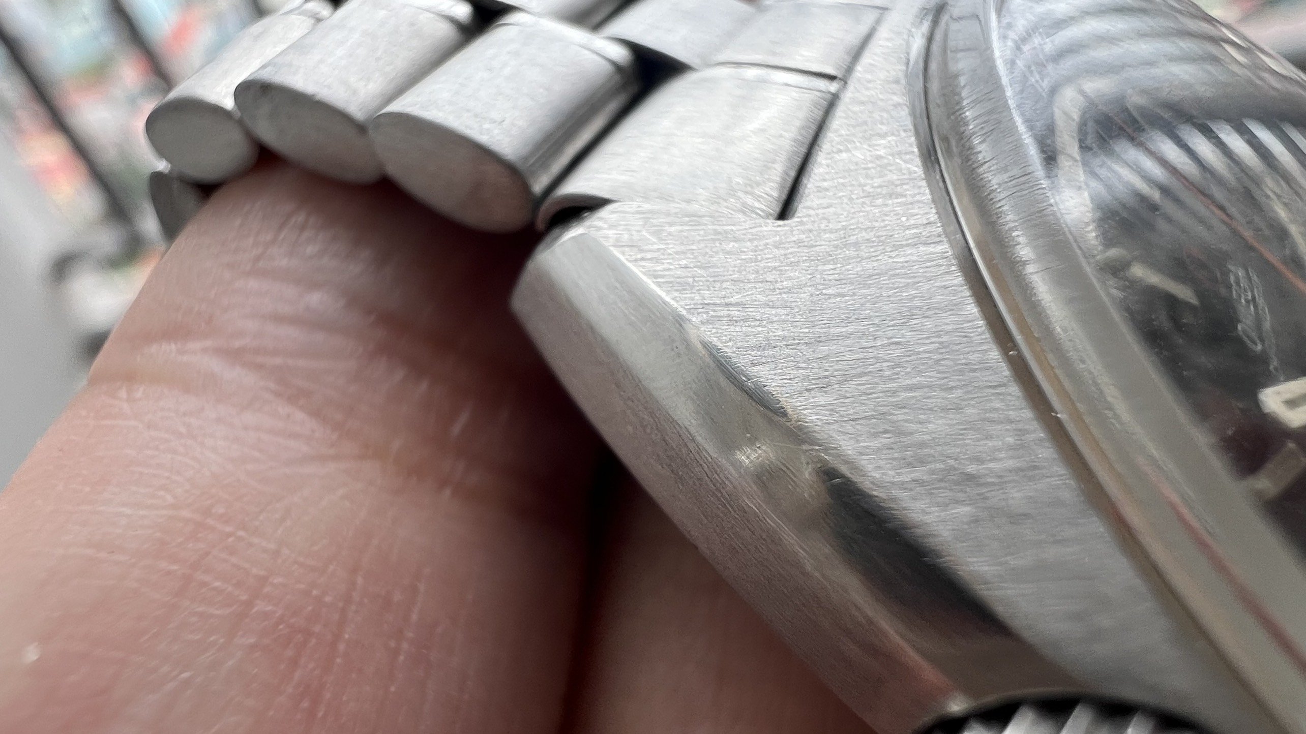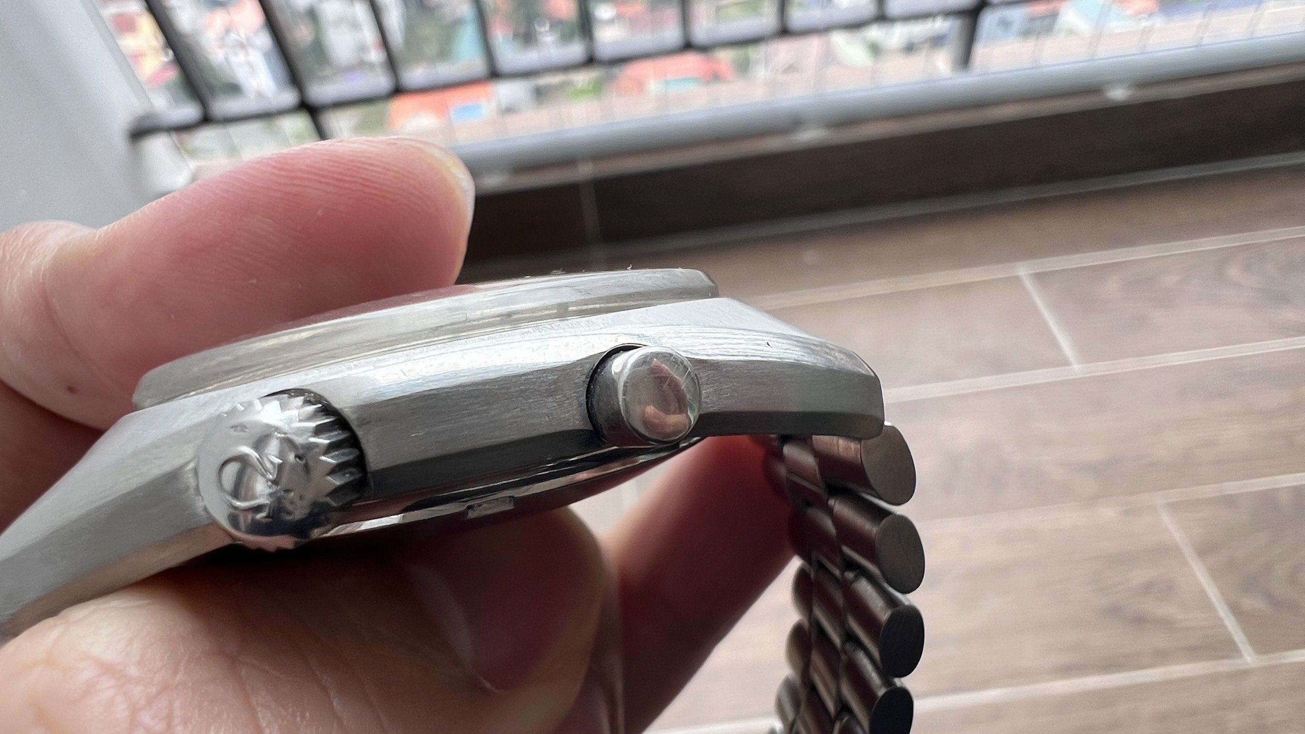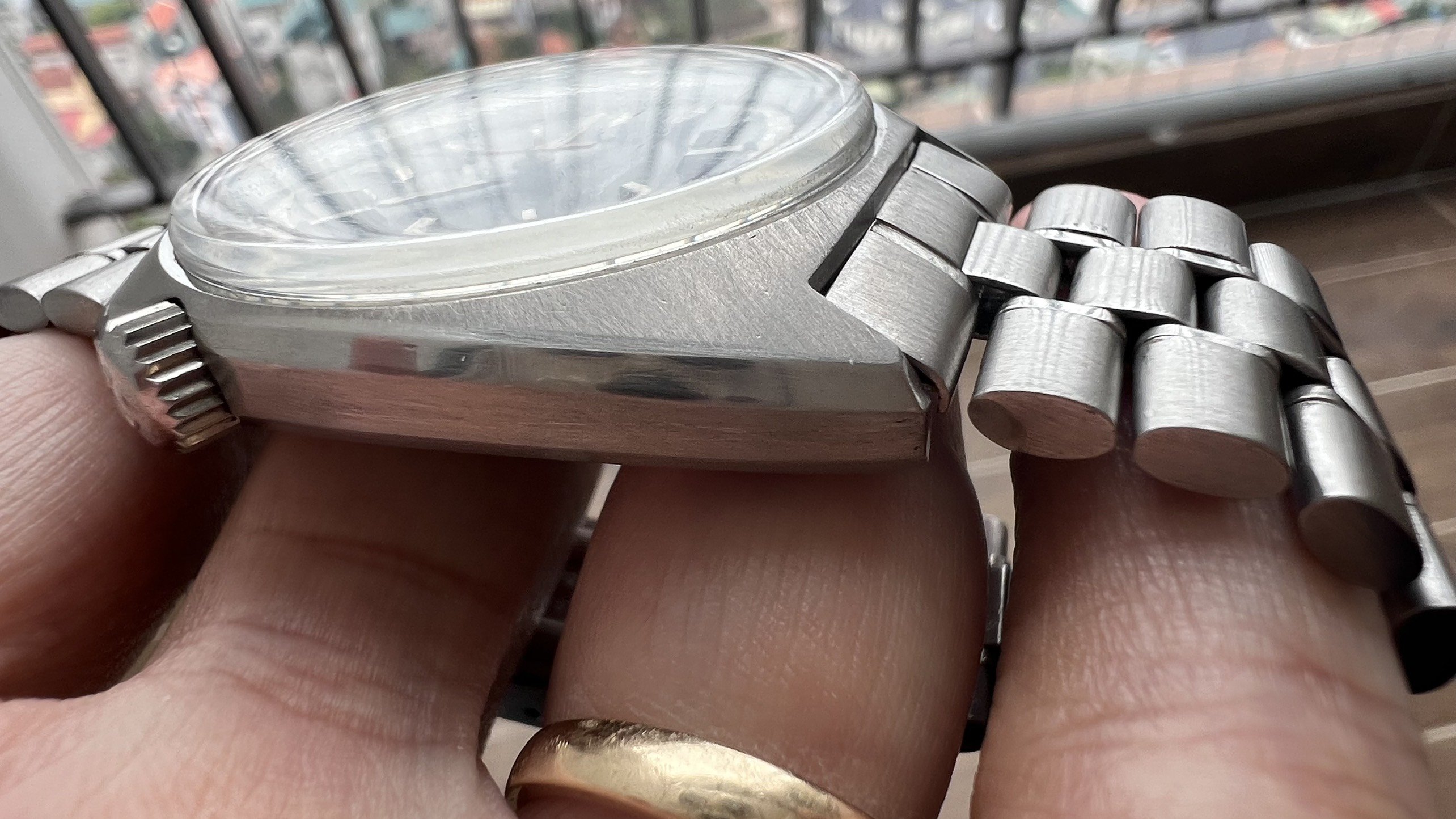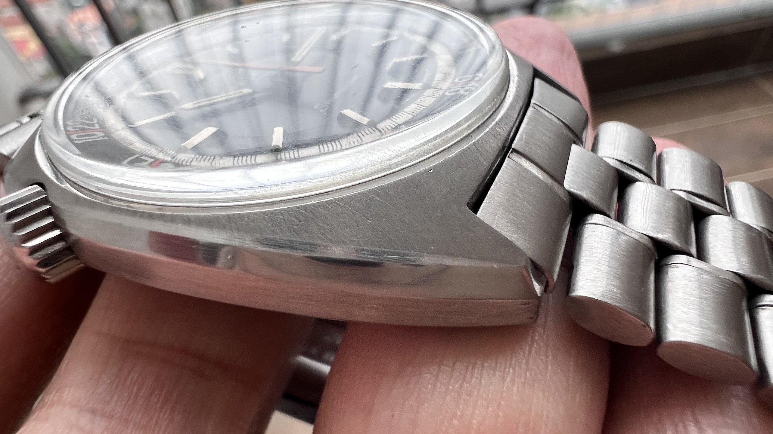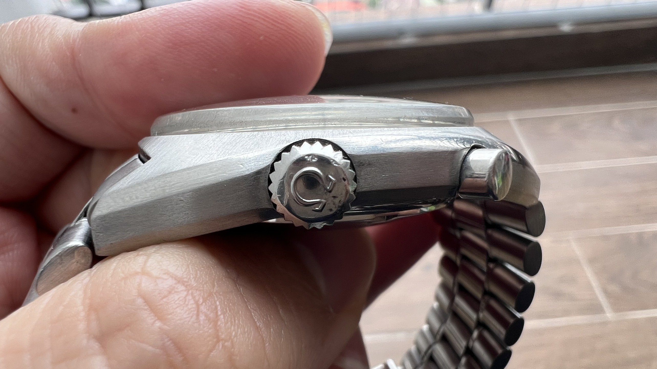 - Case: The sharp case has visible facets and a visible brushed finish on the case top and rear. It looks like the case was polished at some point in the past. The watch measures 41mm without the crown.