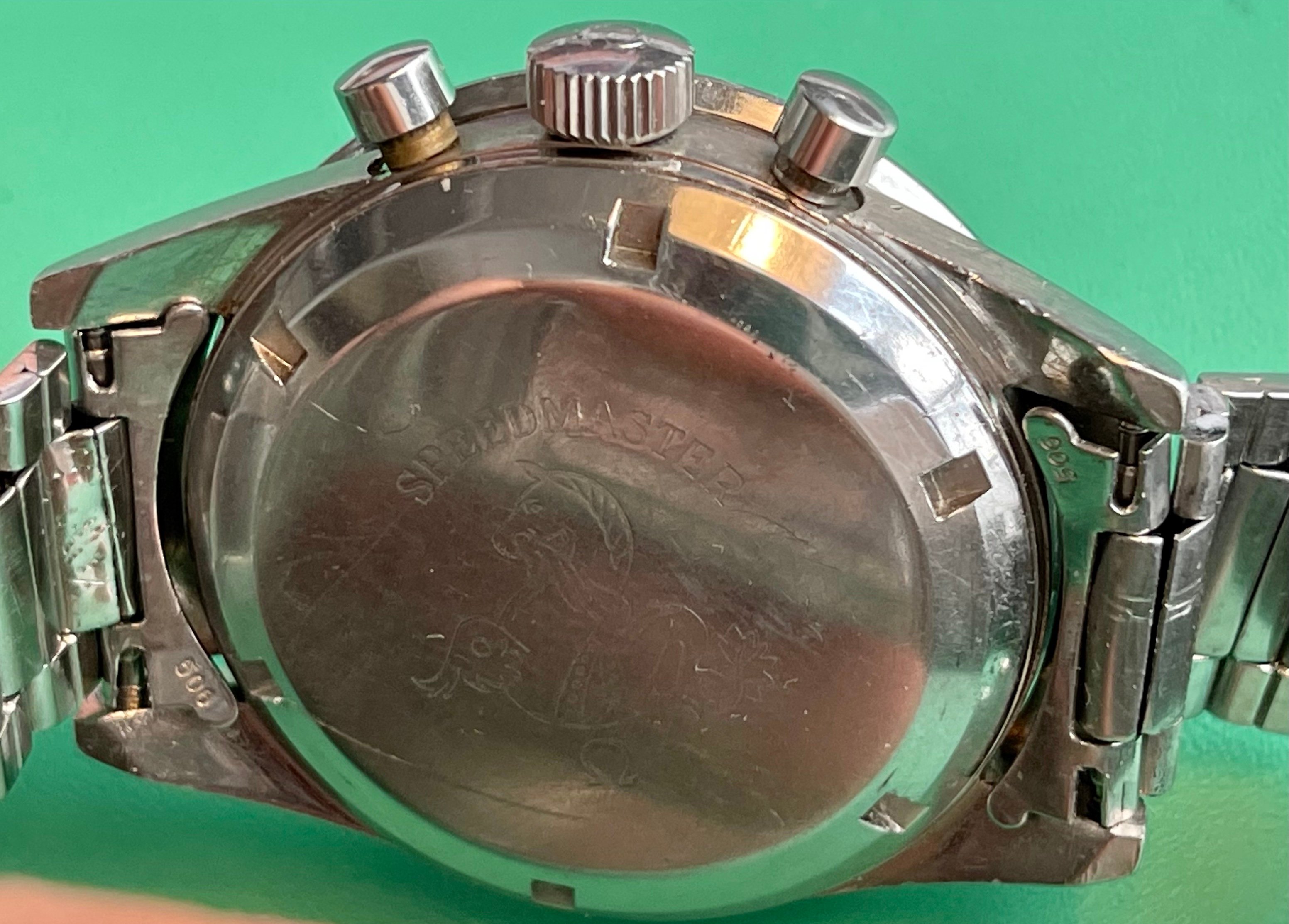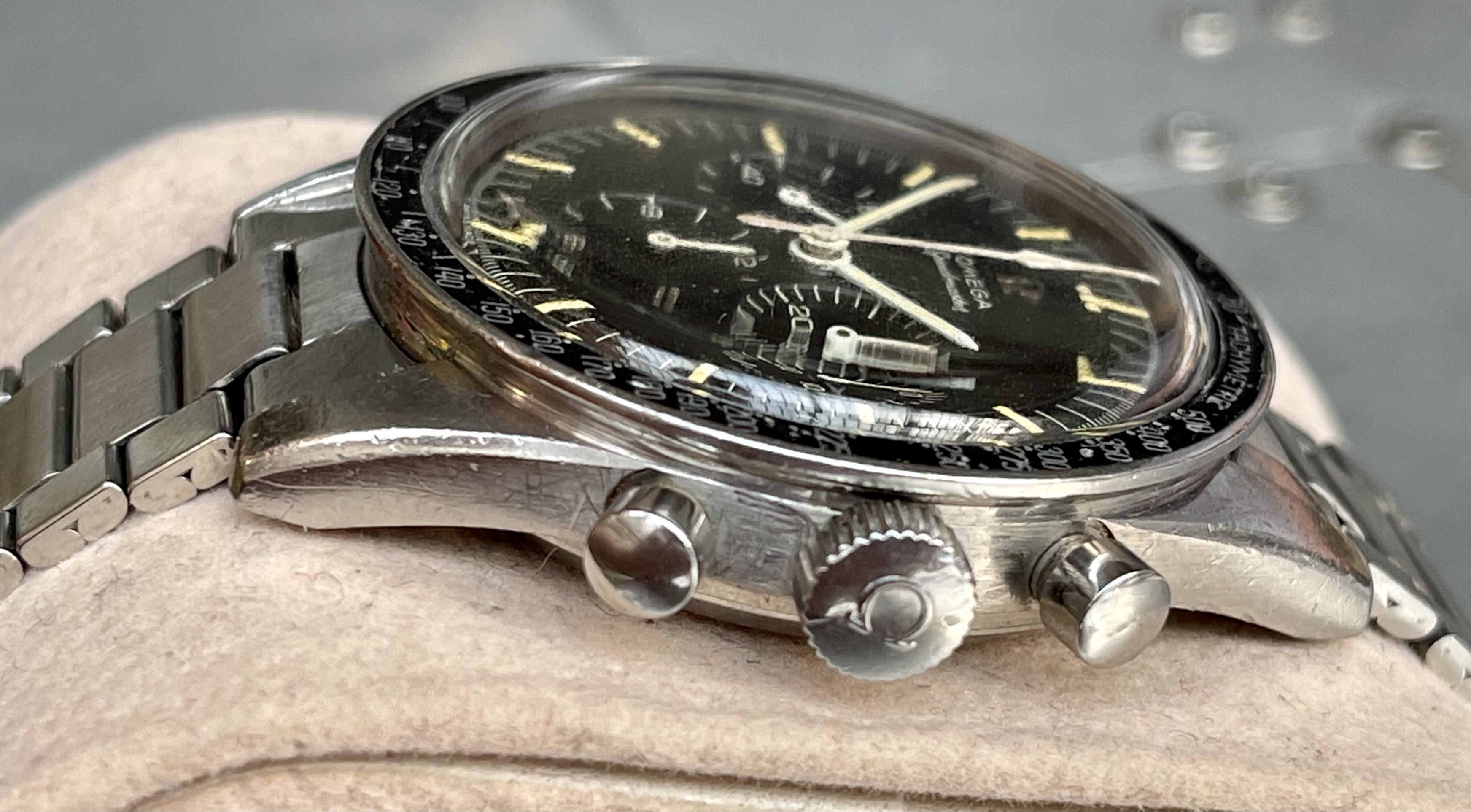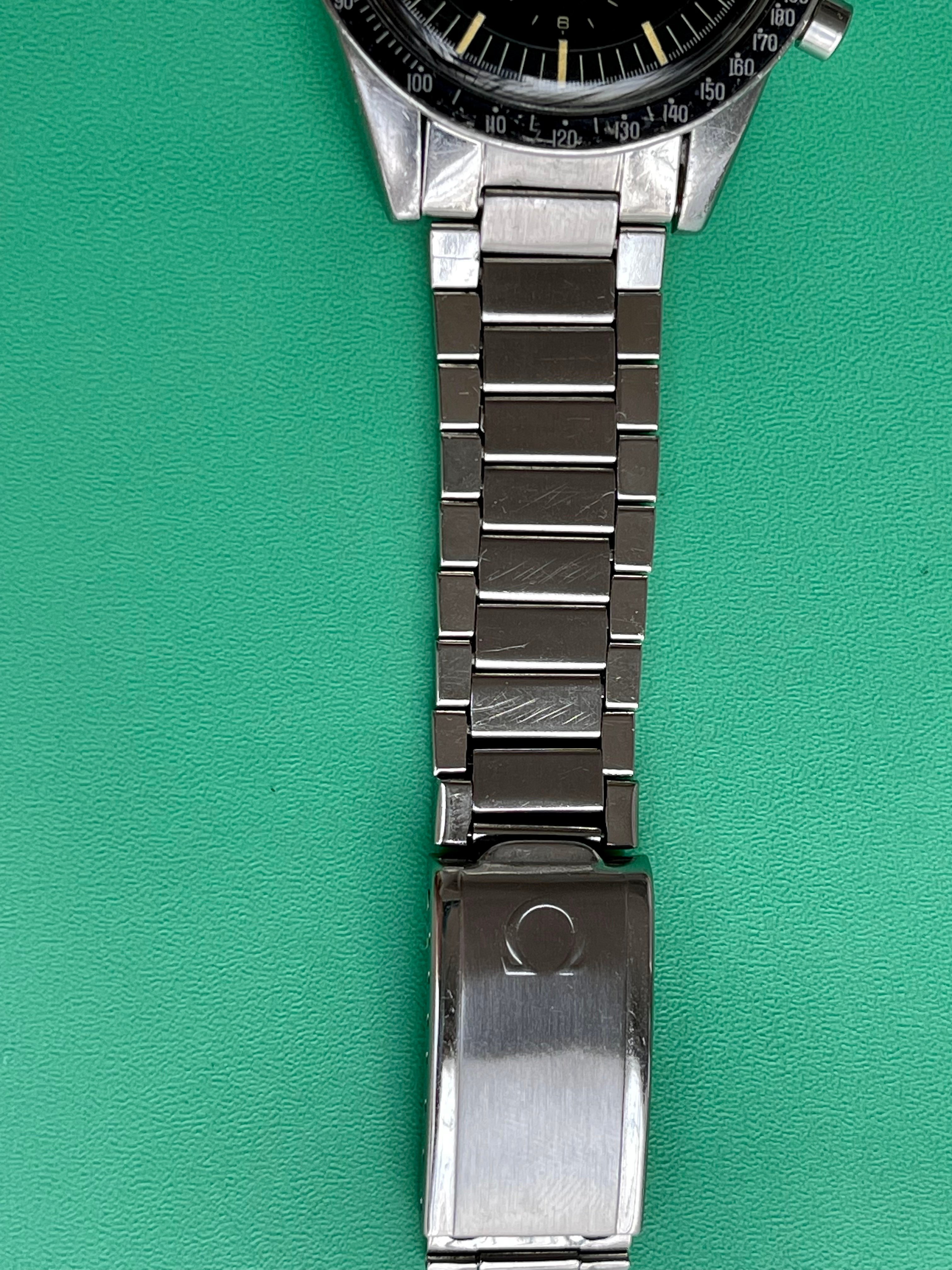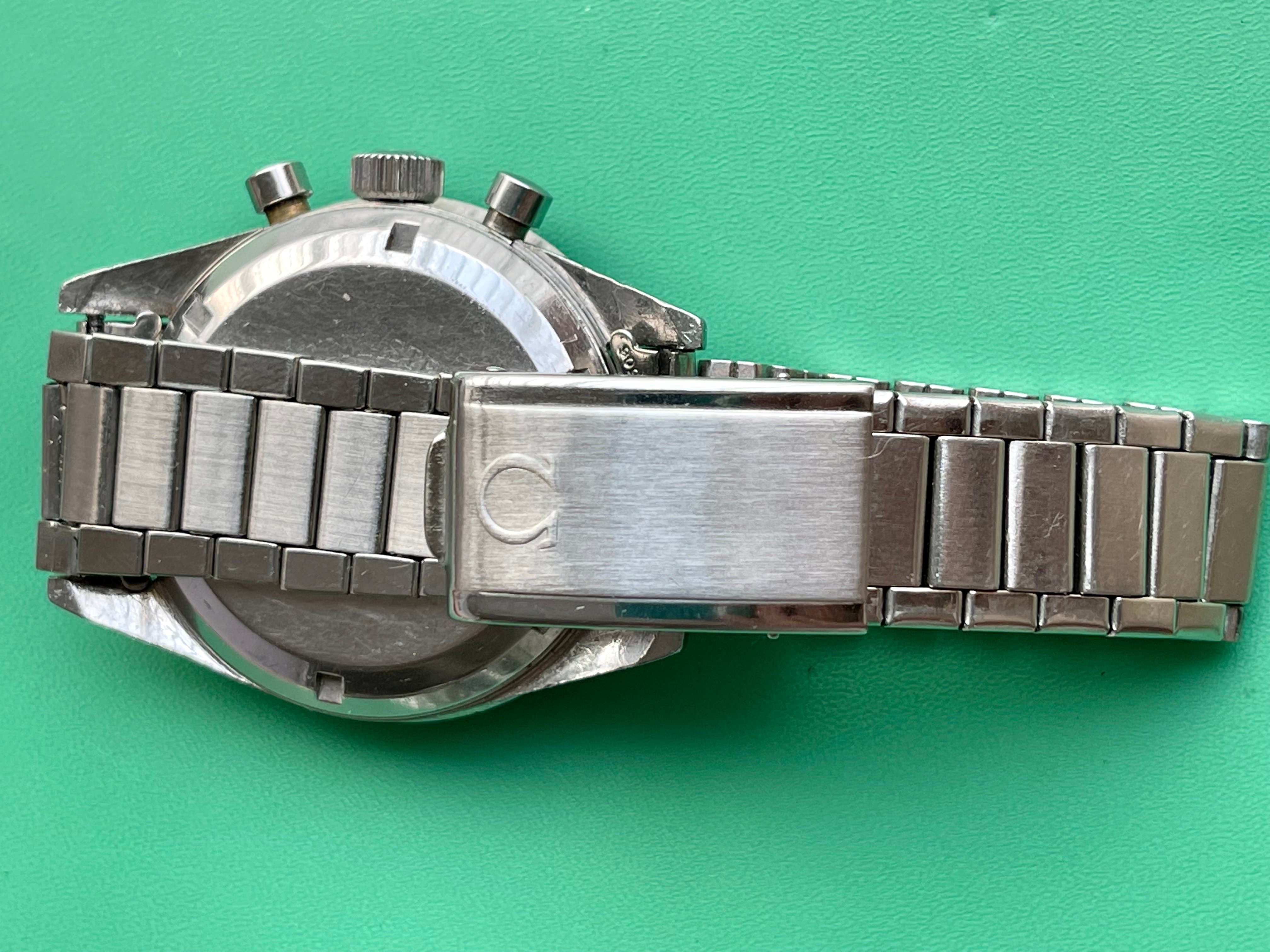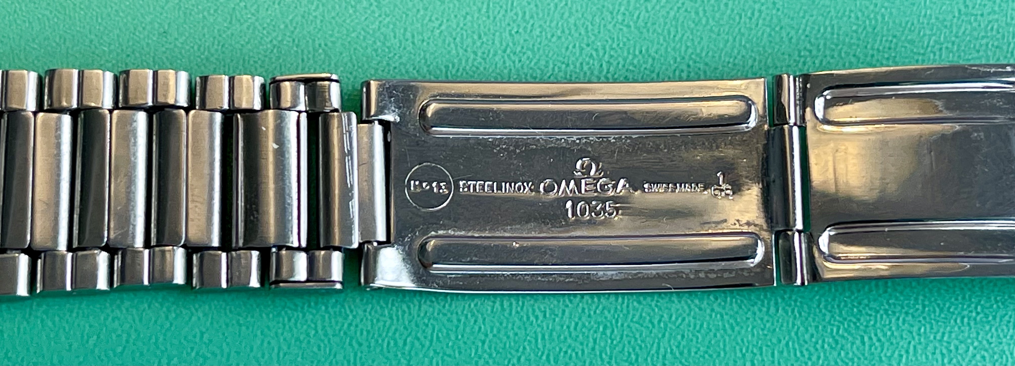 I believe everything else to be correct on the watch. The pushers and crown seem to be original. The crystal has been worn and polished and I cannot discern the centre Omega logo though it was the opinion of Mr. Freese that it is the original Omega crystal.