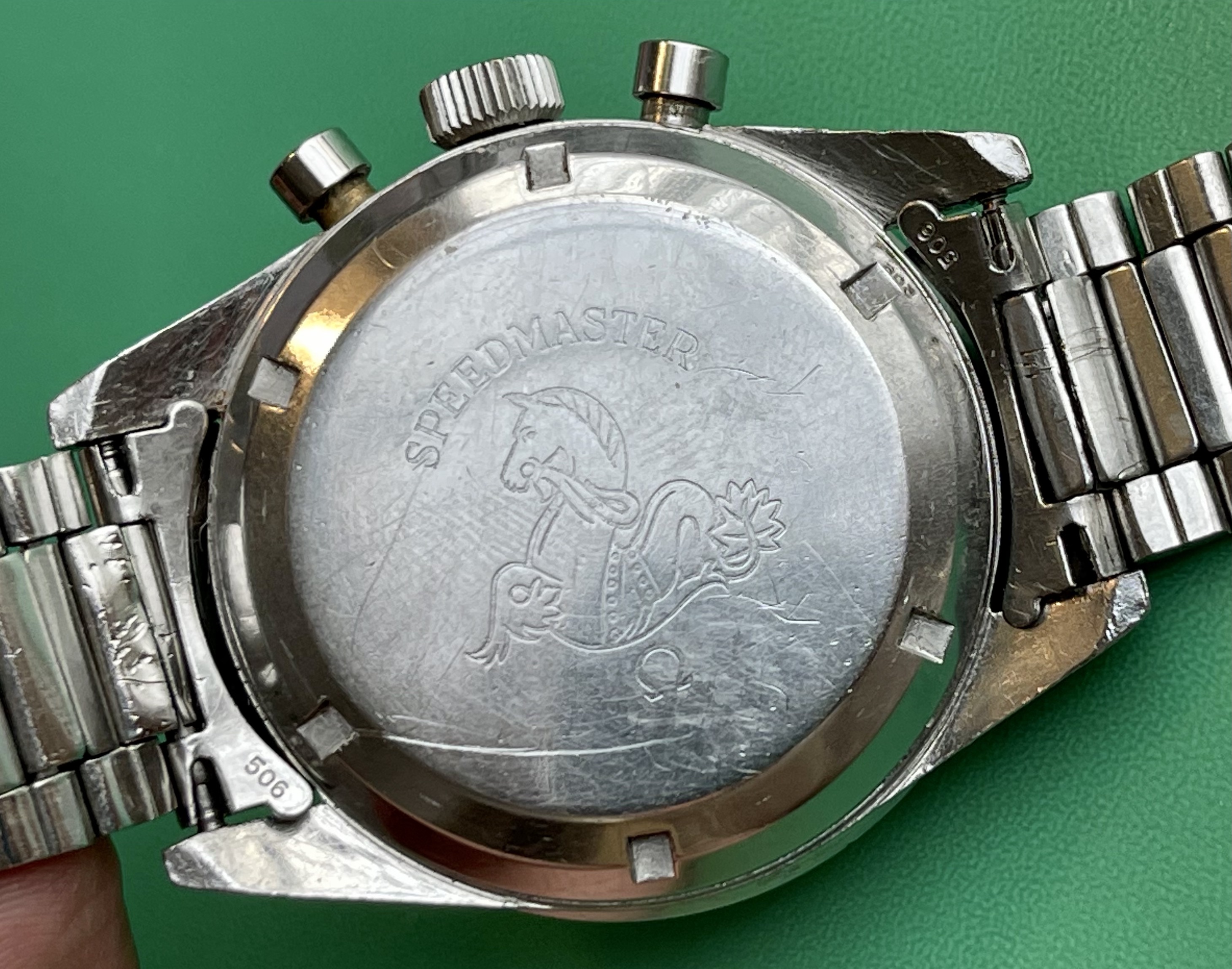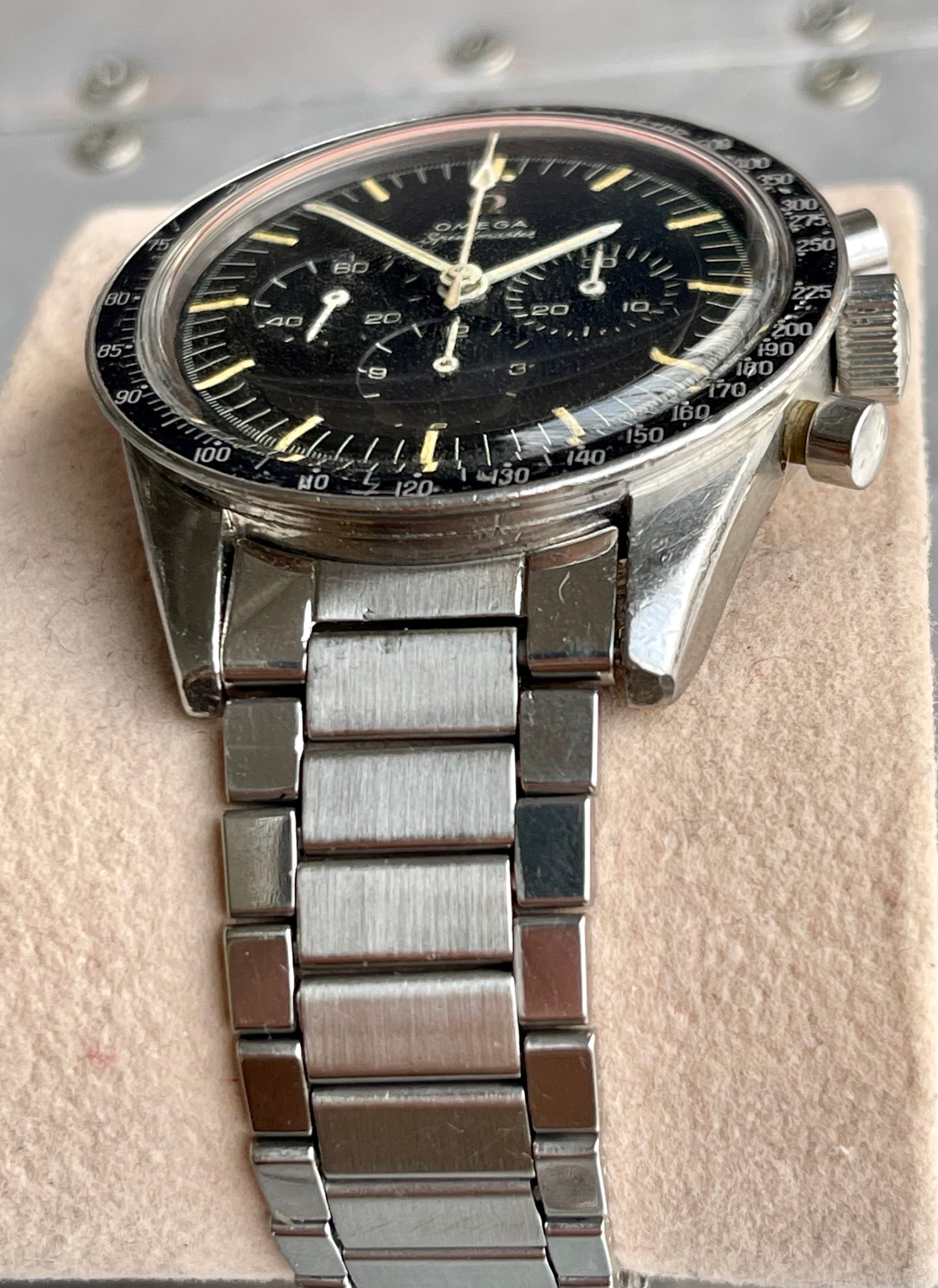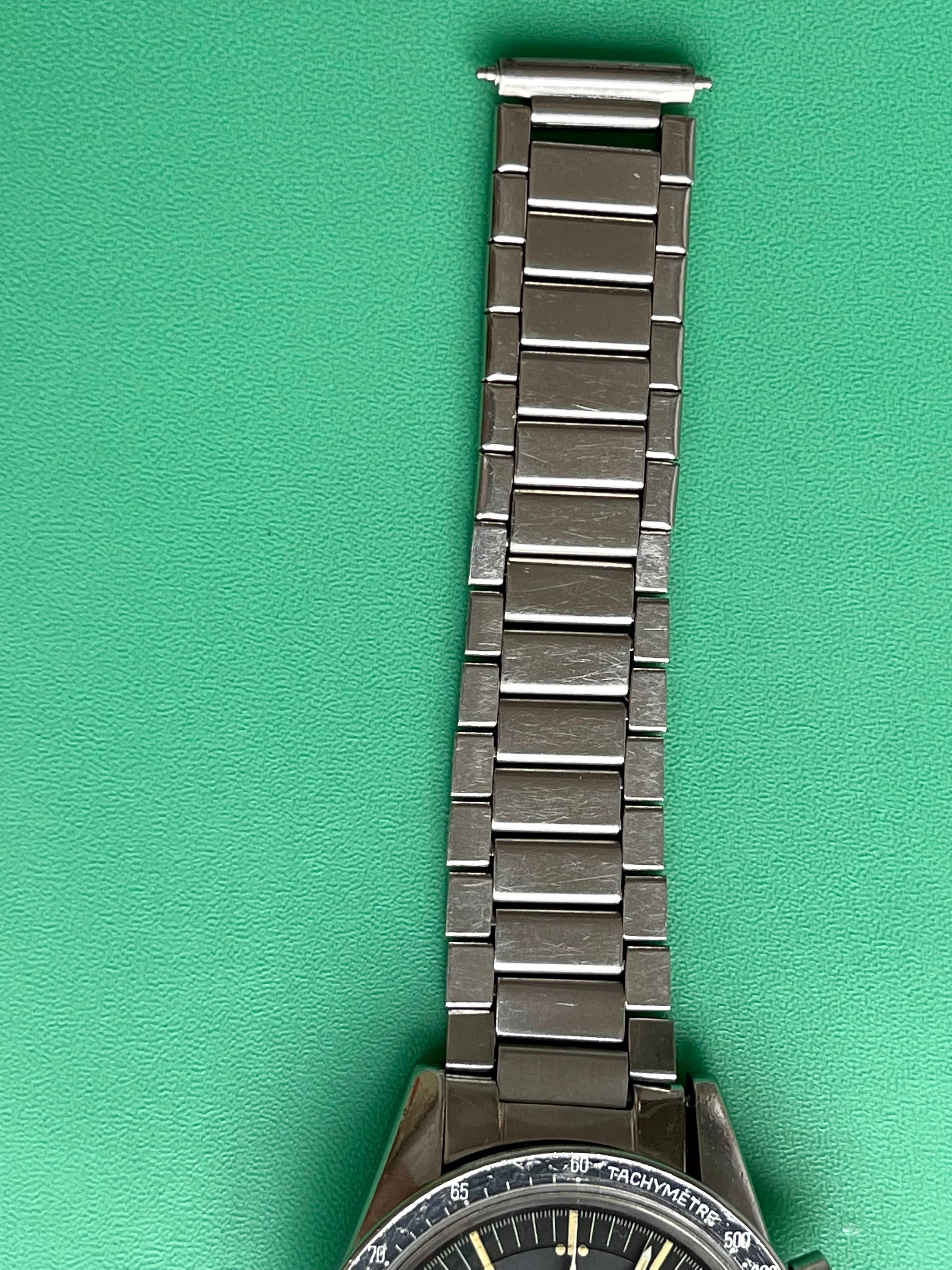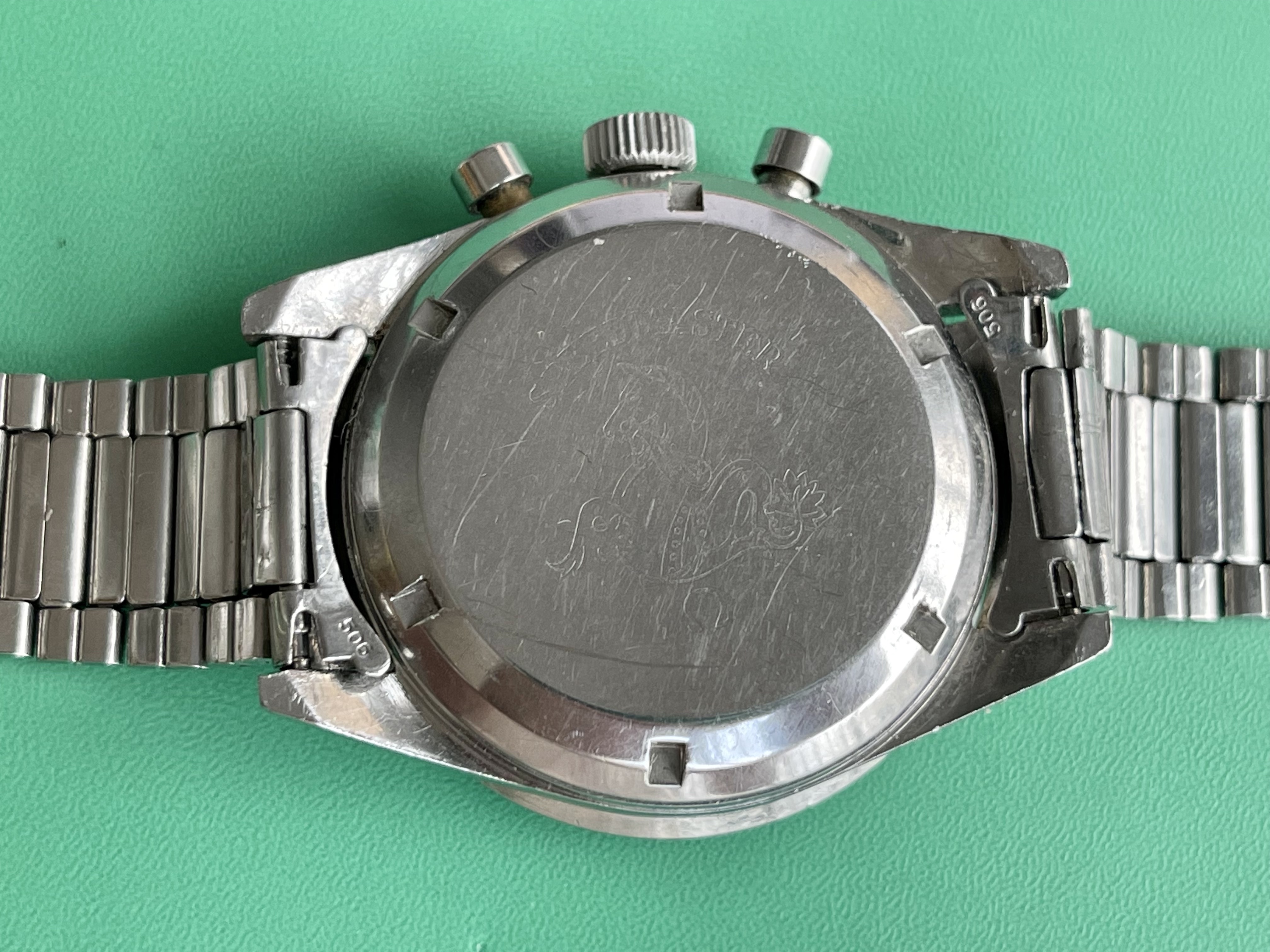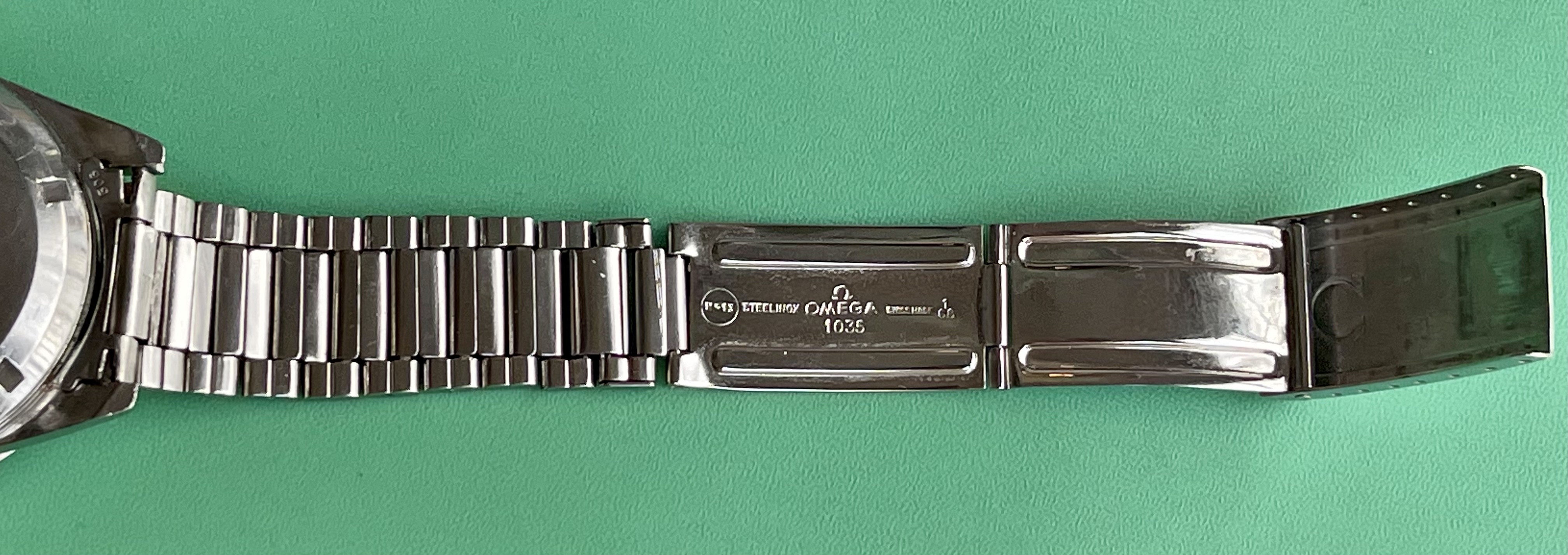 I believe everything else to be correct on the watch. The pushers and crown seem to be original. The crystal has been worn and polished and I cannot discern the centre Omega logo though it was the opinion of Mr. Freese that it is the original Omega crystal.