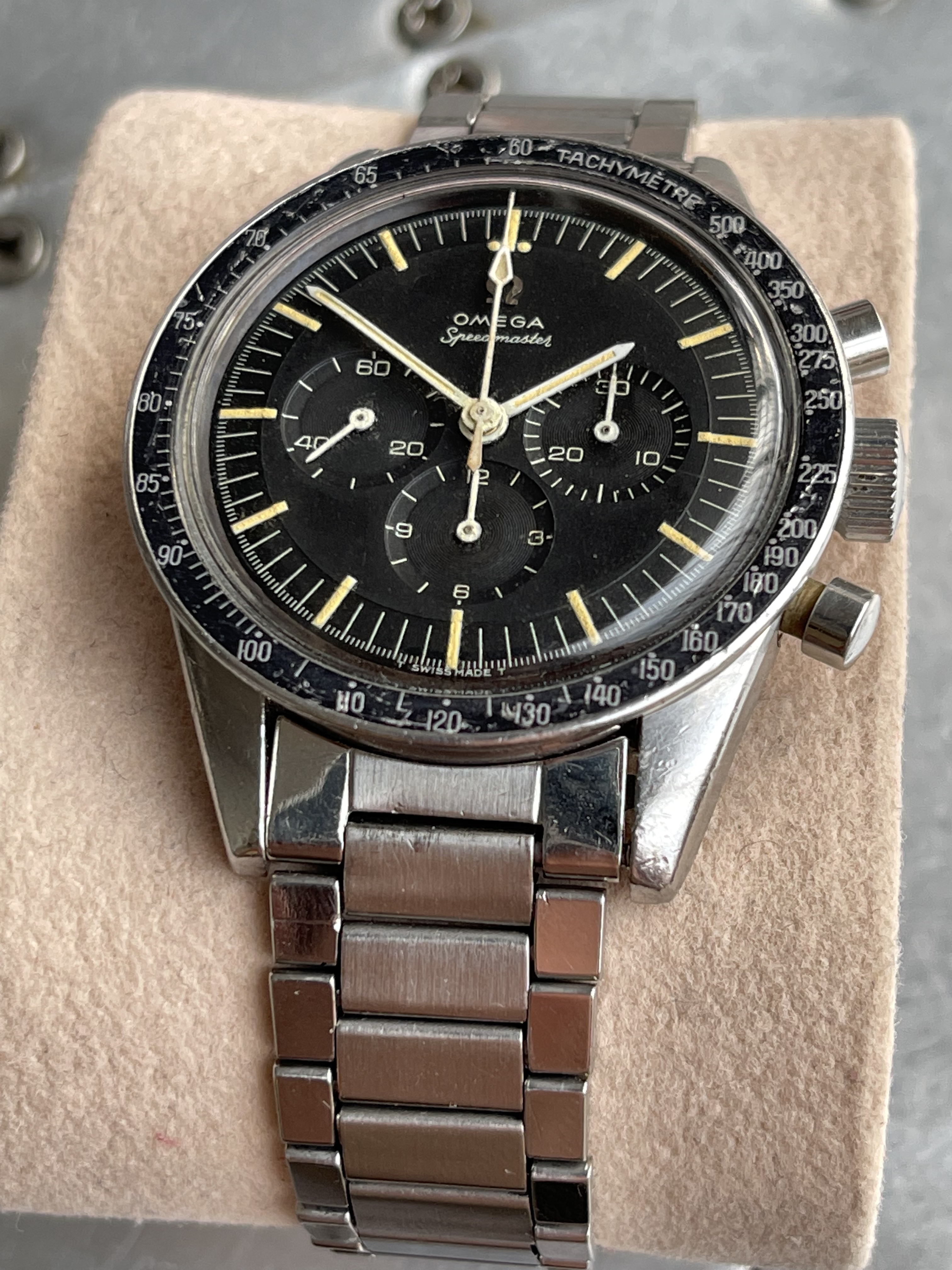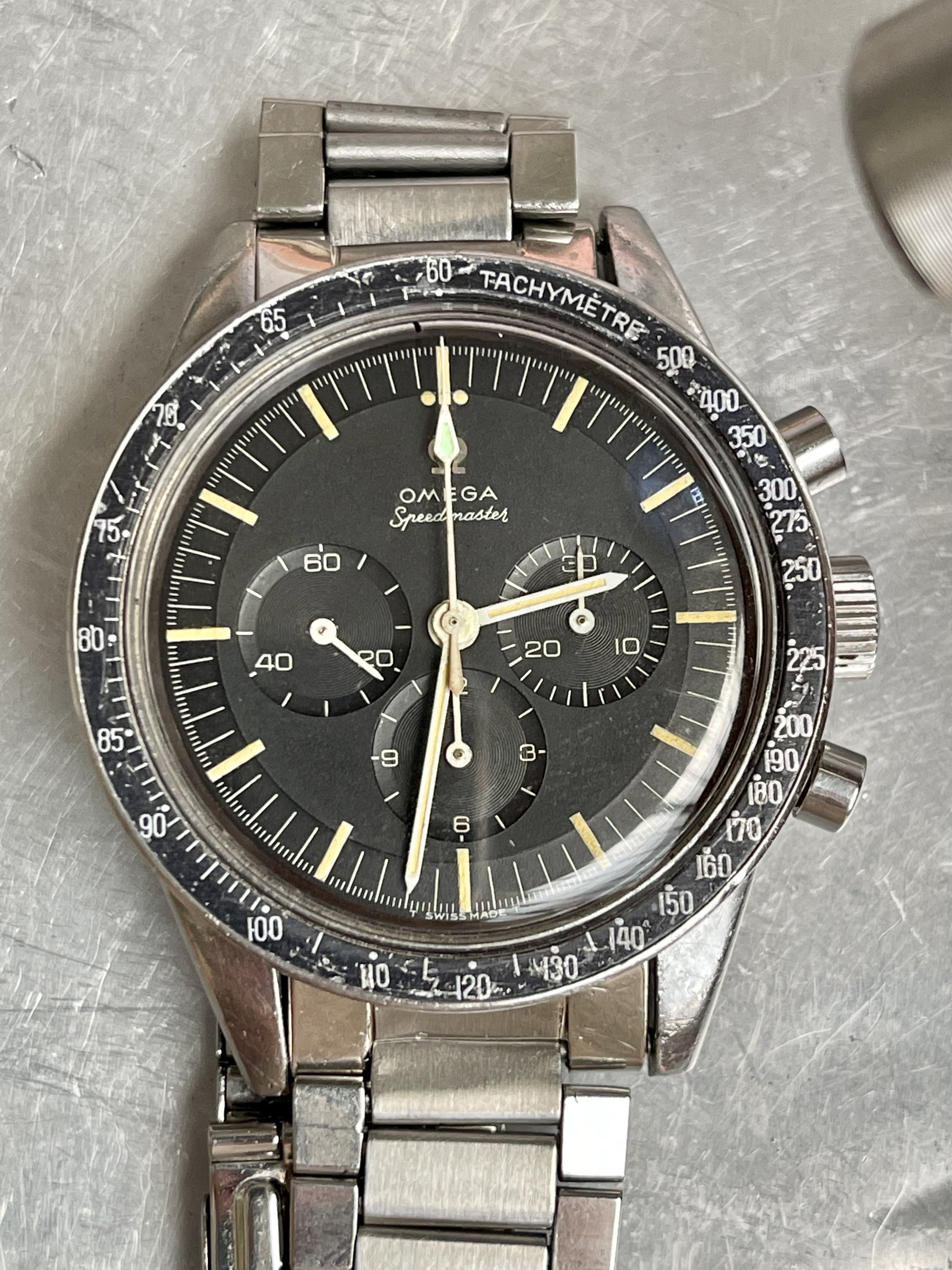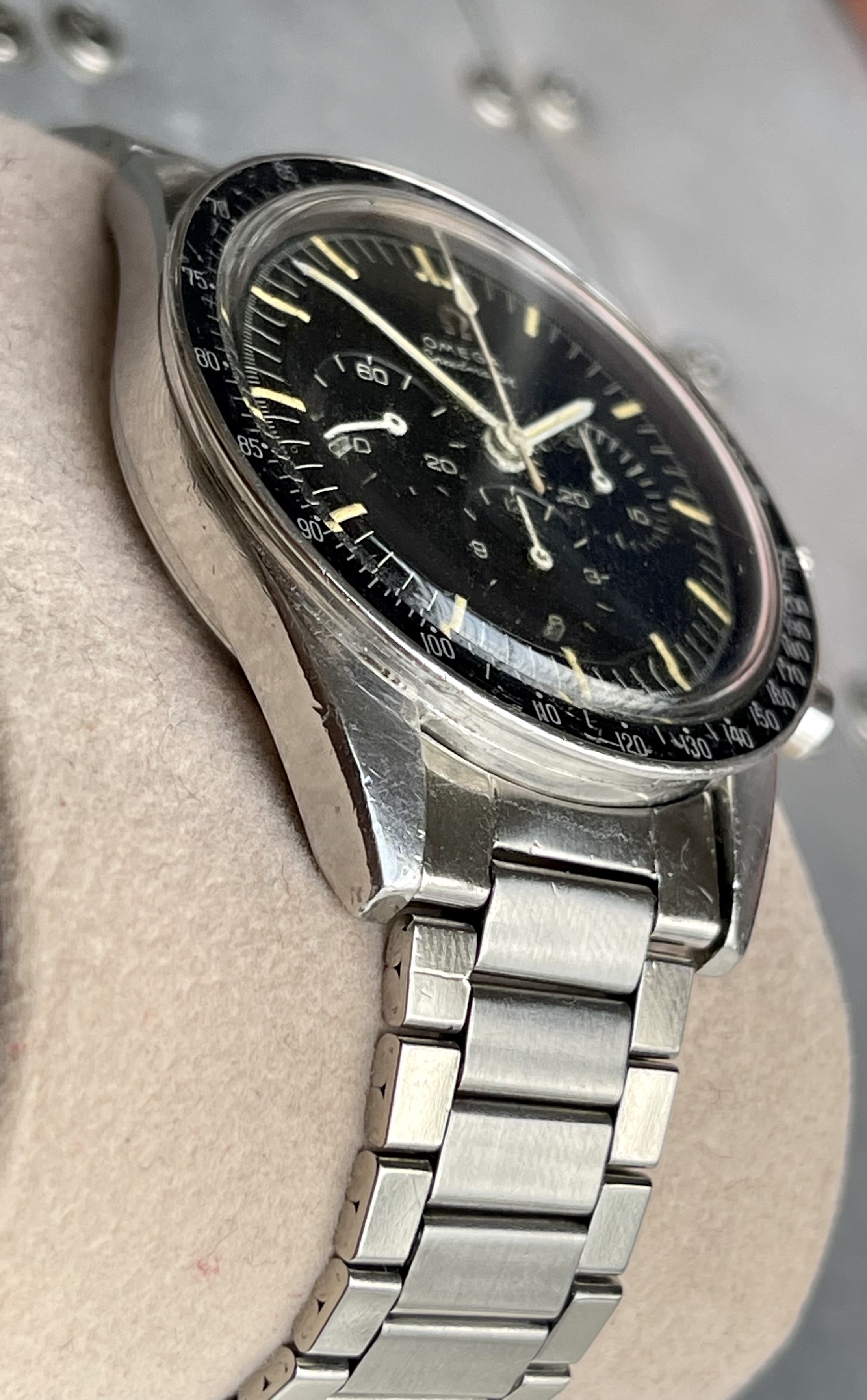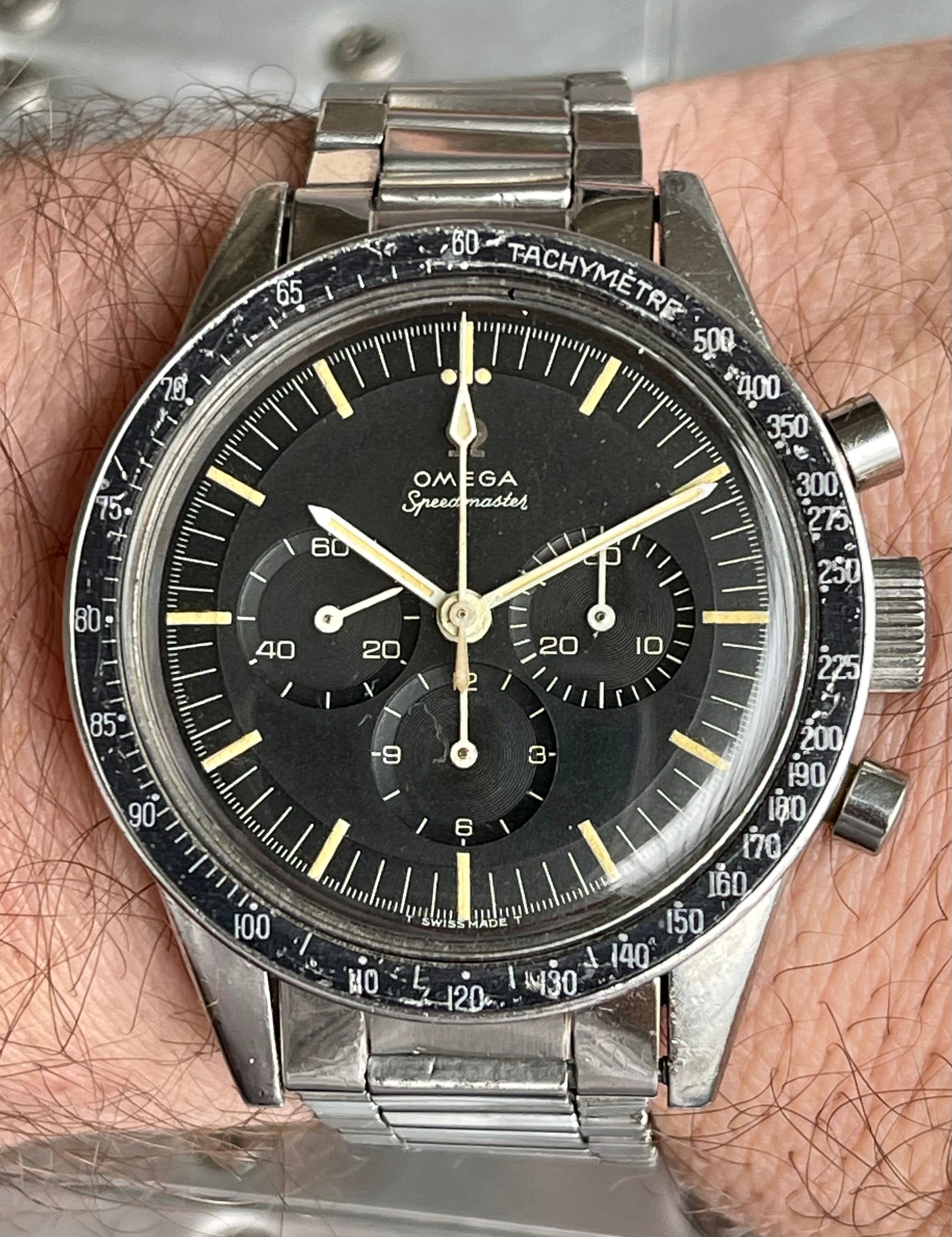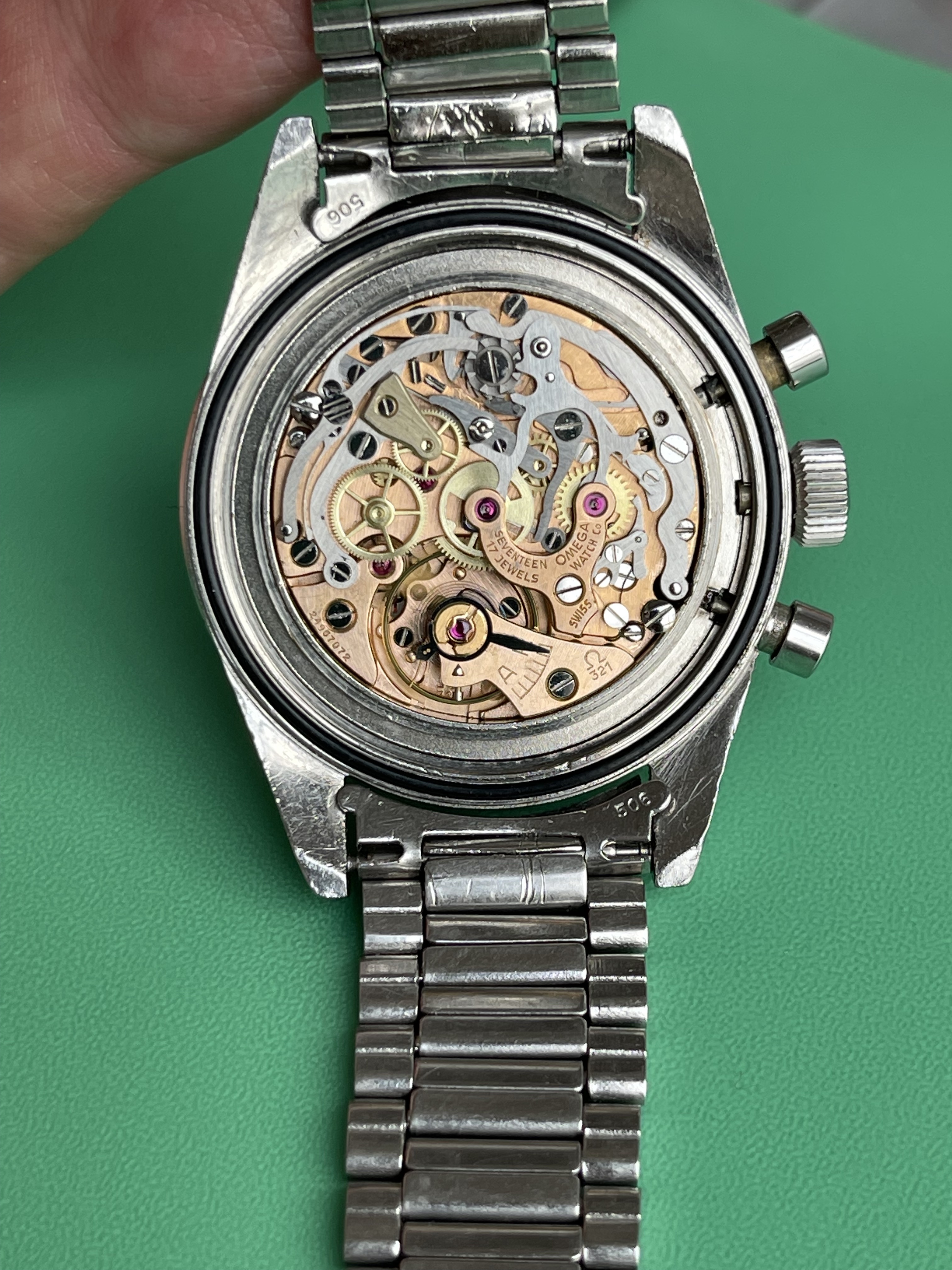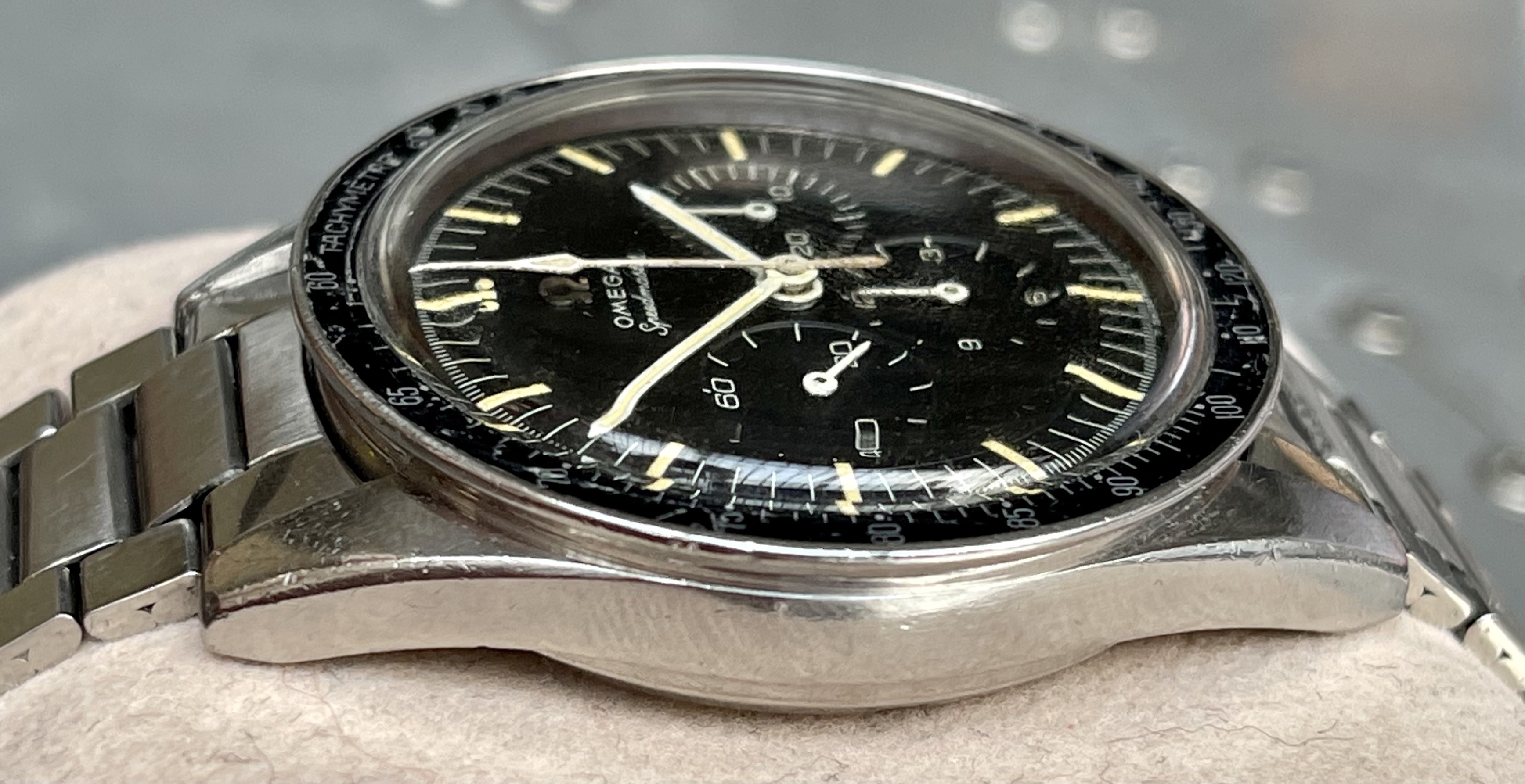 I believe everything else to be correct on the watch. The pushers and crown seem to be original. The crystal has been worn and polished and I cannot discern the centre Omega logo though it was the opinion of Mr. Freese that it is the original Omega crystal.
