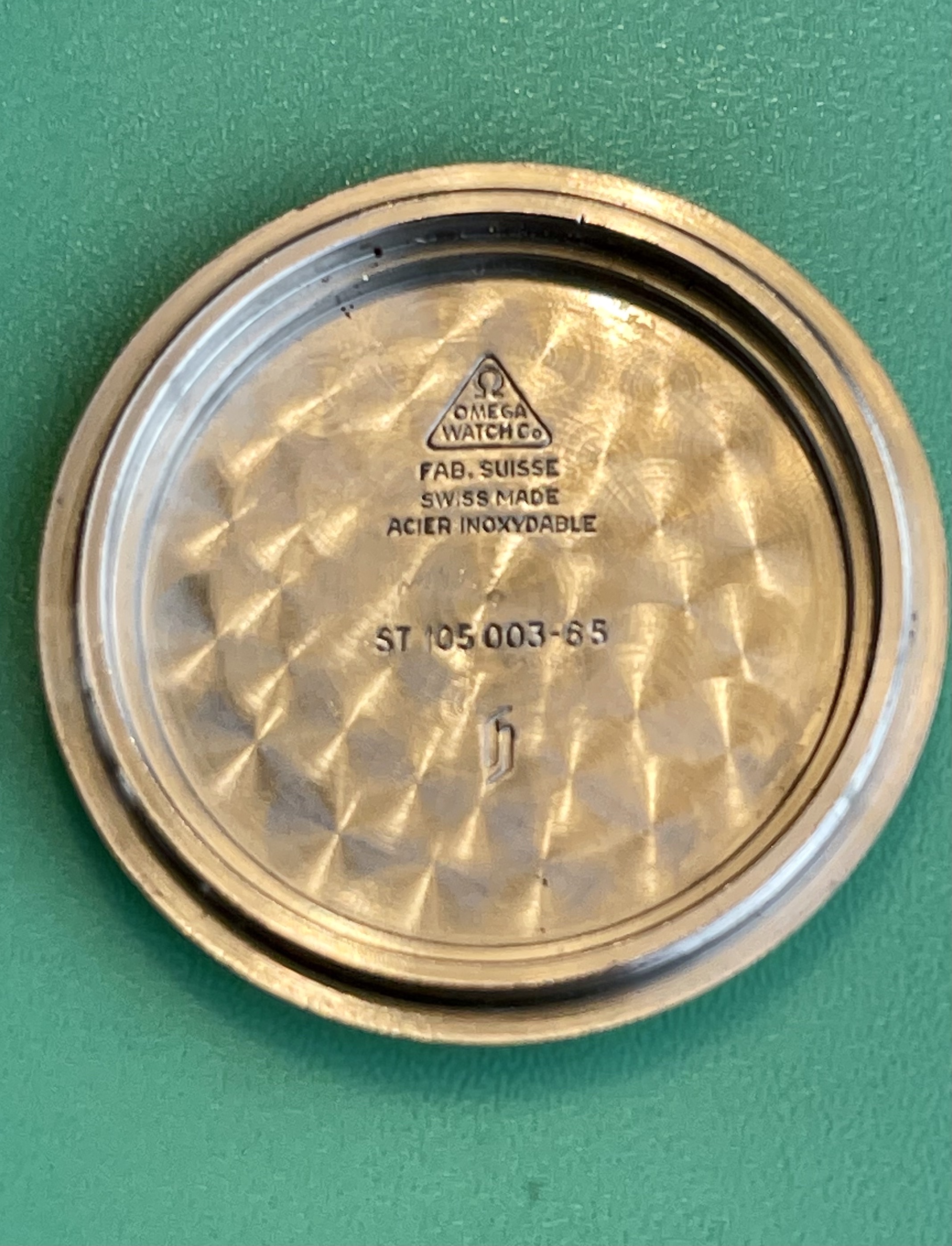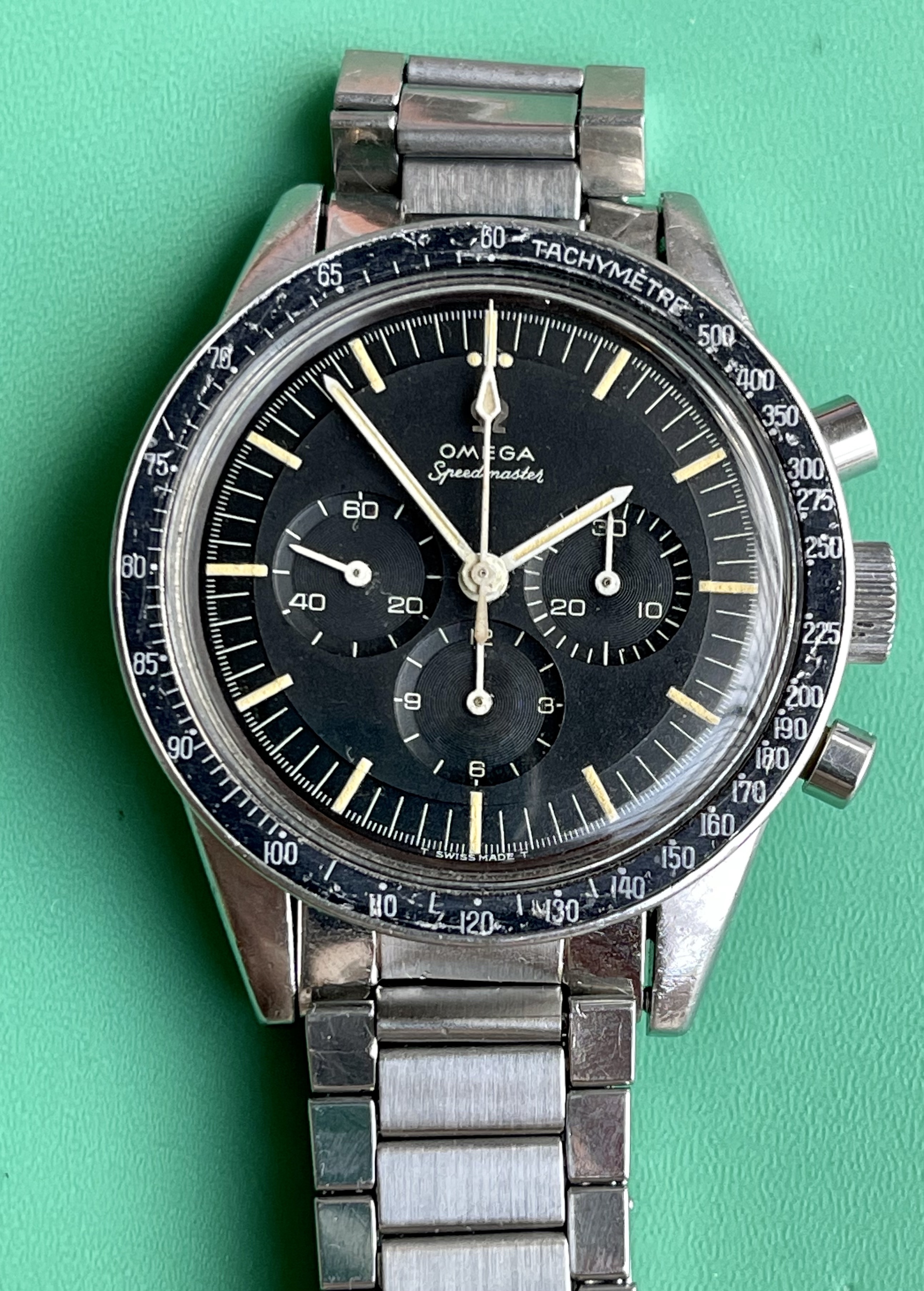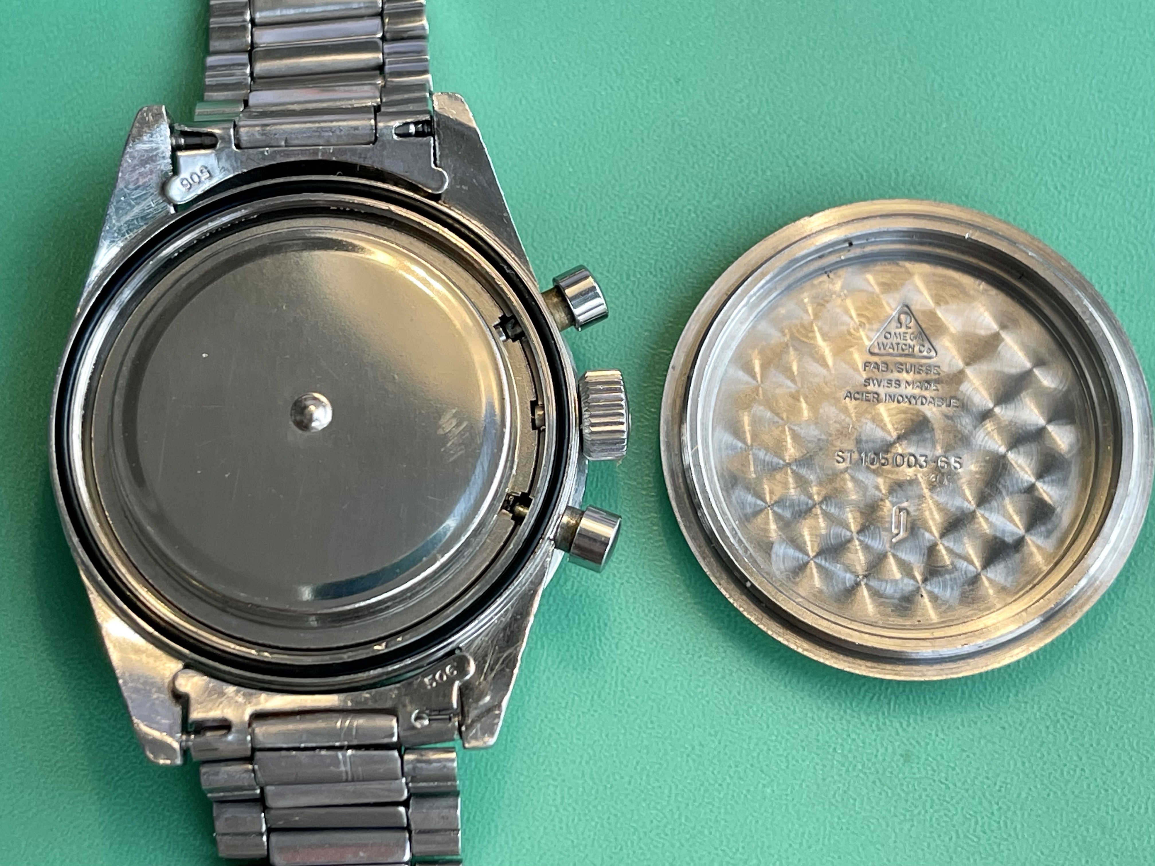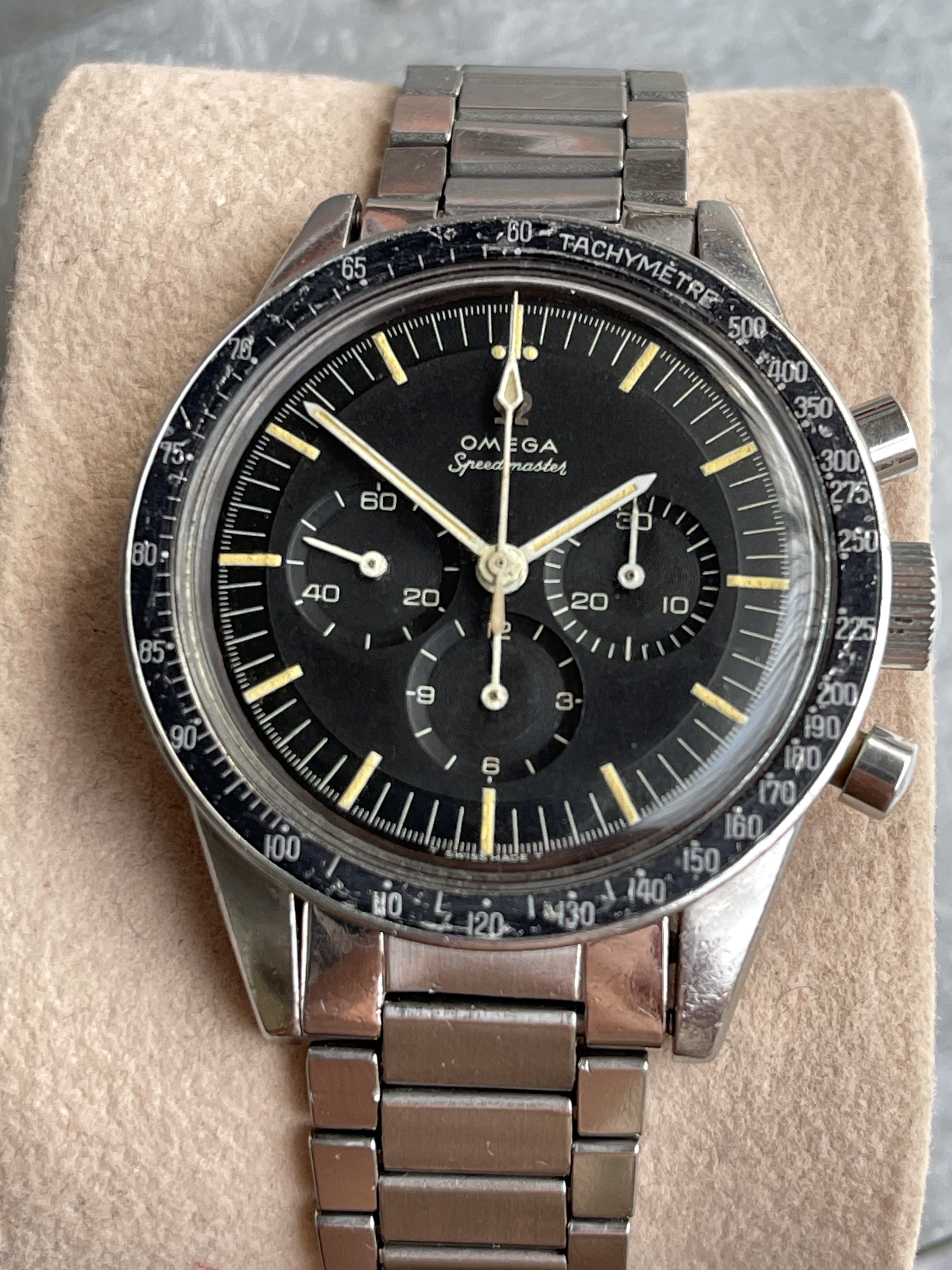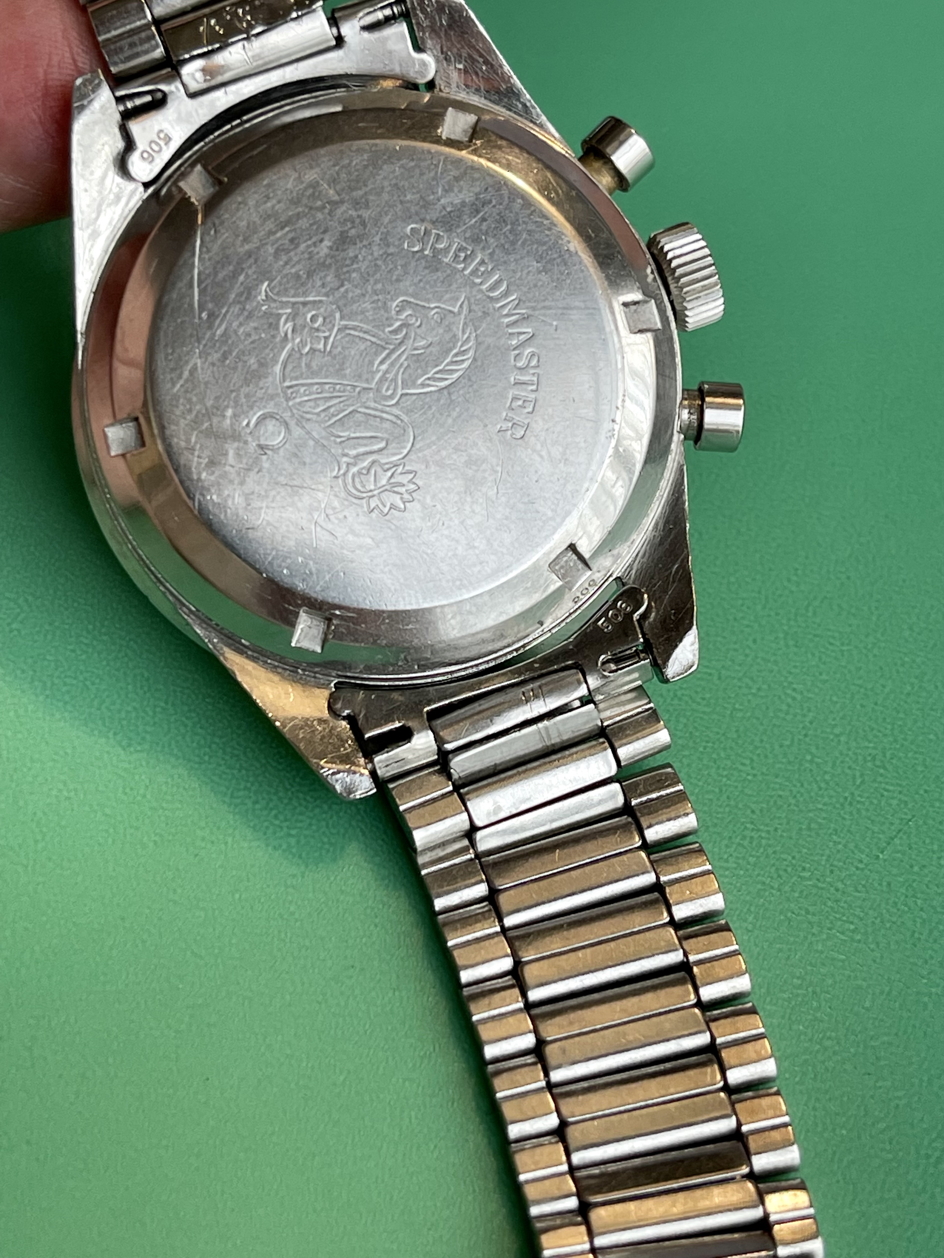 I believe everything else to be correct on the watch. The pushers and crown seem to be original. The crystal has been worn and polished and I cannot discern the centre Omega logo though it was the opinion of Mr. Freese that it is the original Omega crystal.