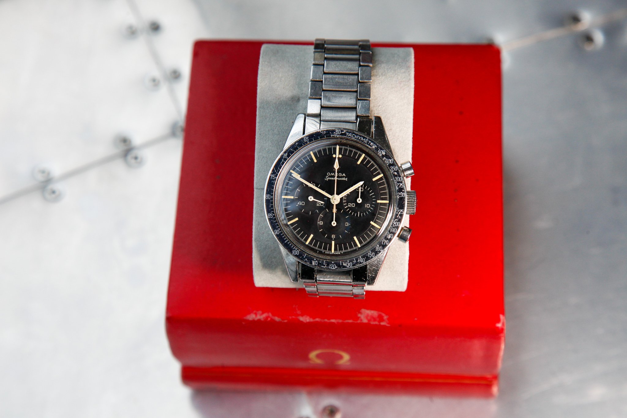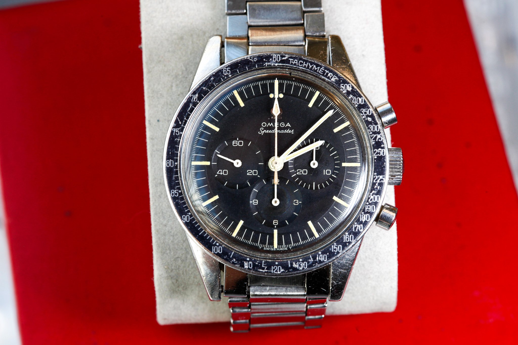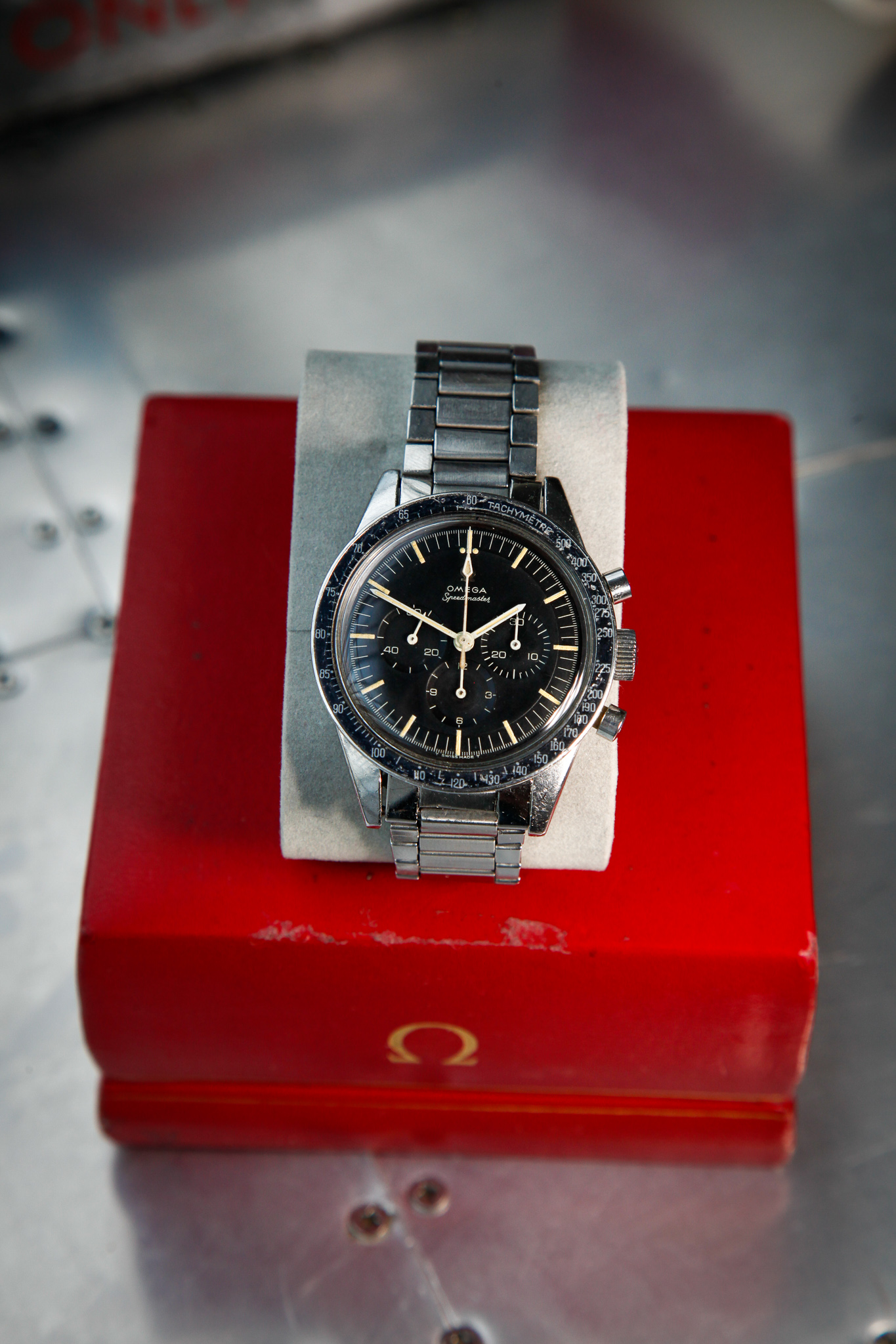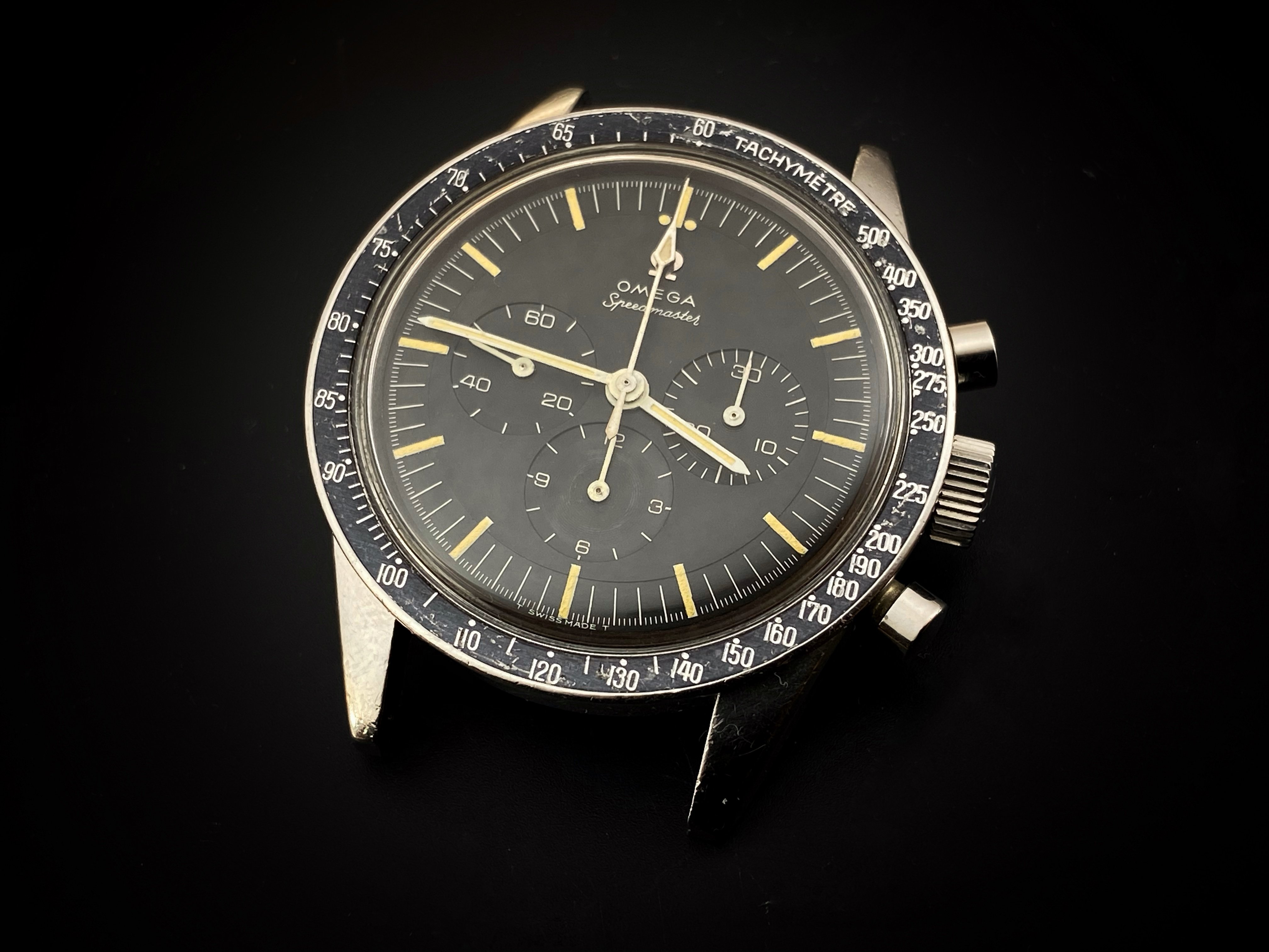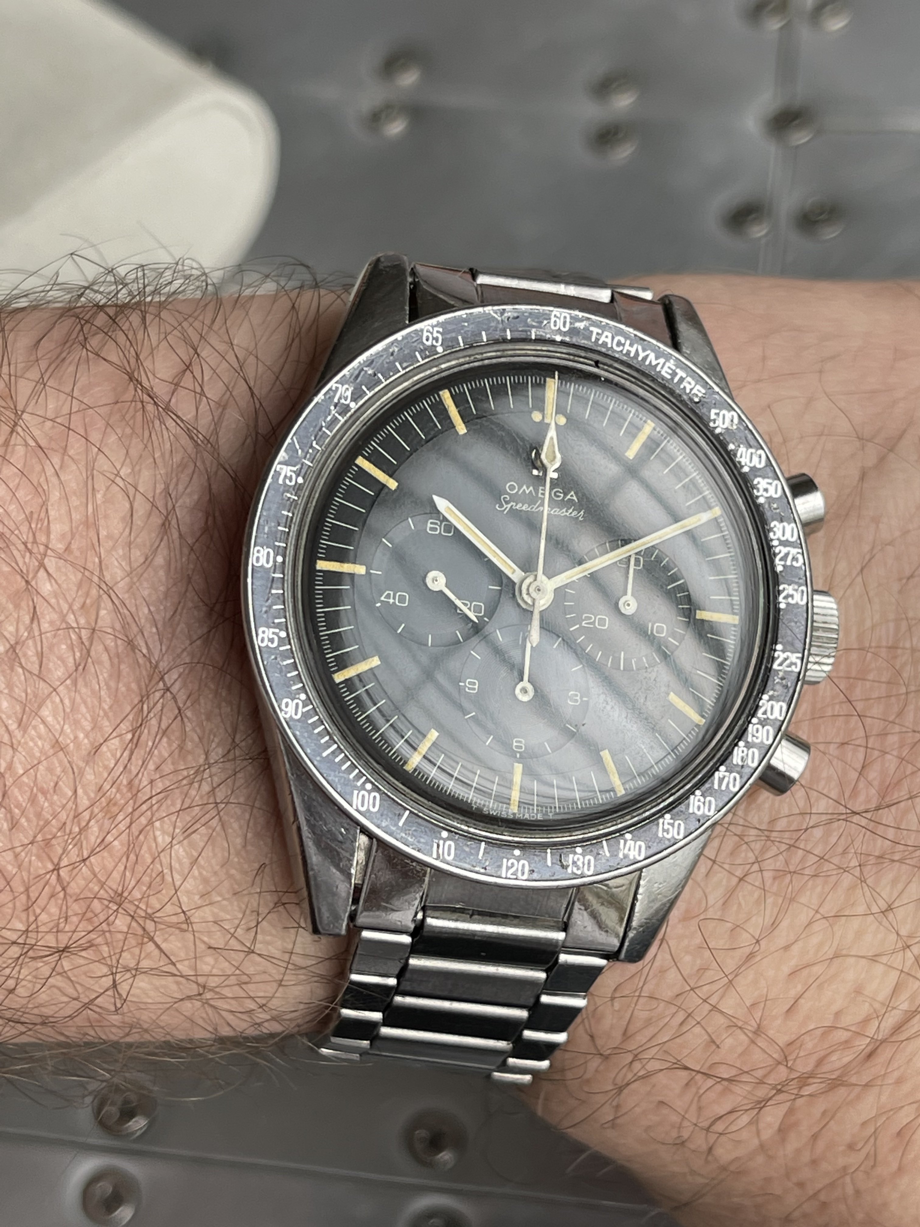 I believe everything else to be correct on the watch. The pushers and crown seem to be original. The crystal has been worn and polished and I cannot discern the centre Omega logo though it was the opinion of Mr. Freese that it is the original Omega crystal.