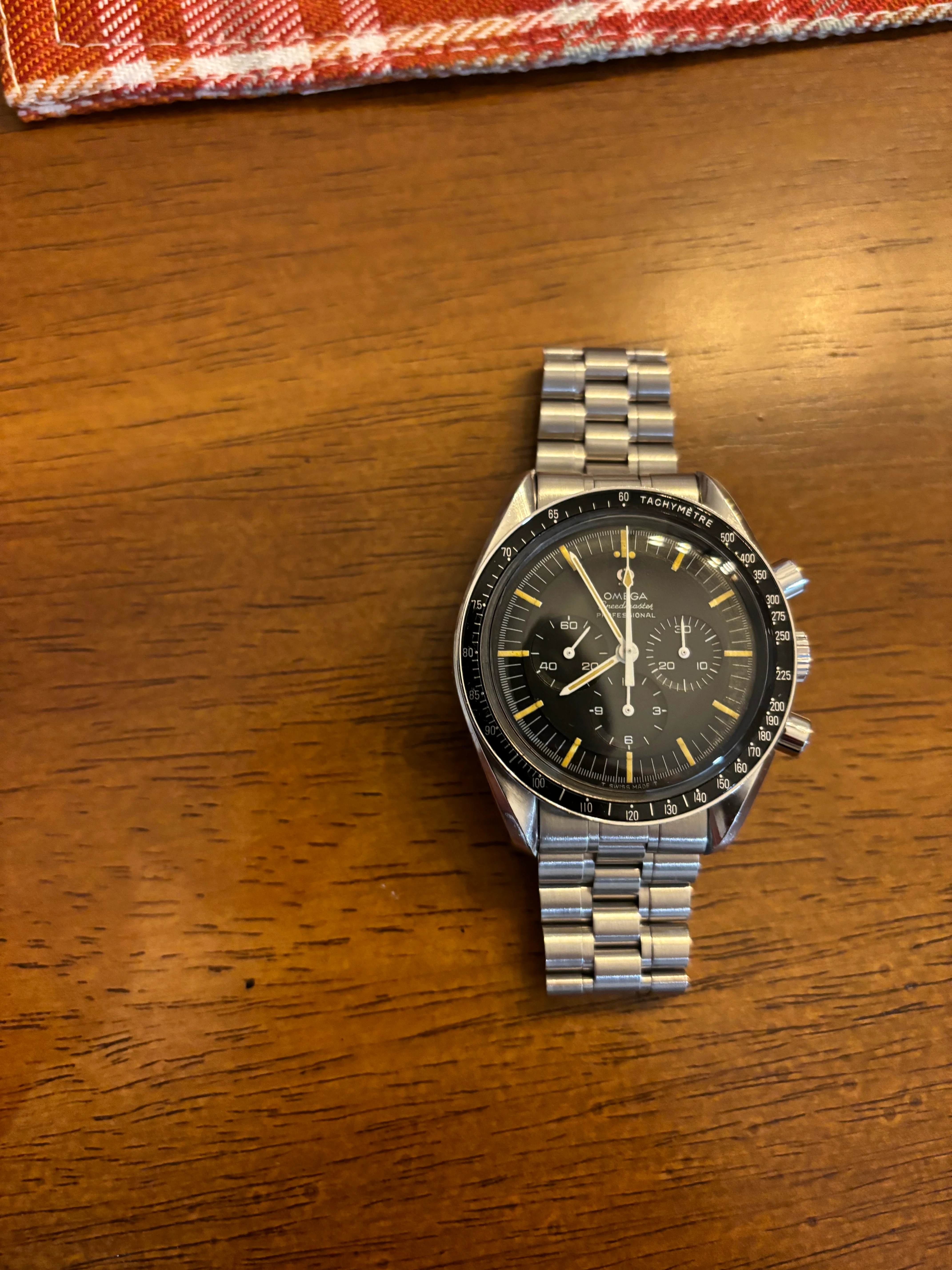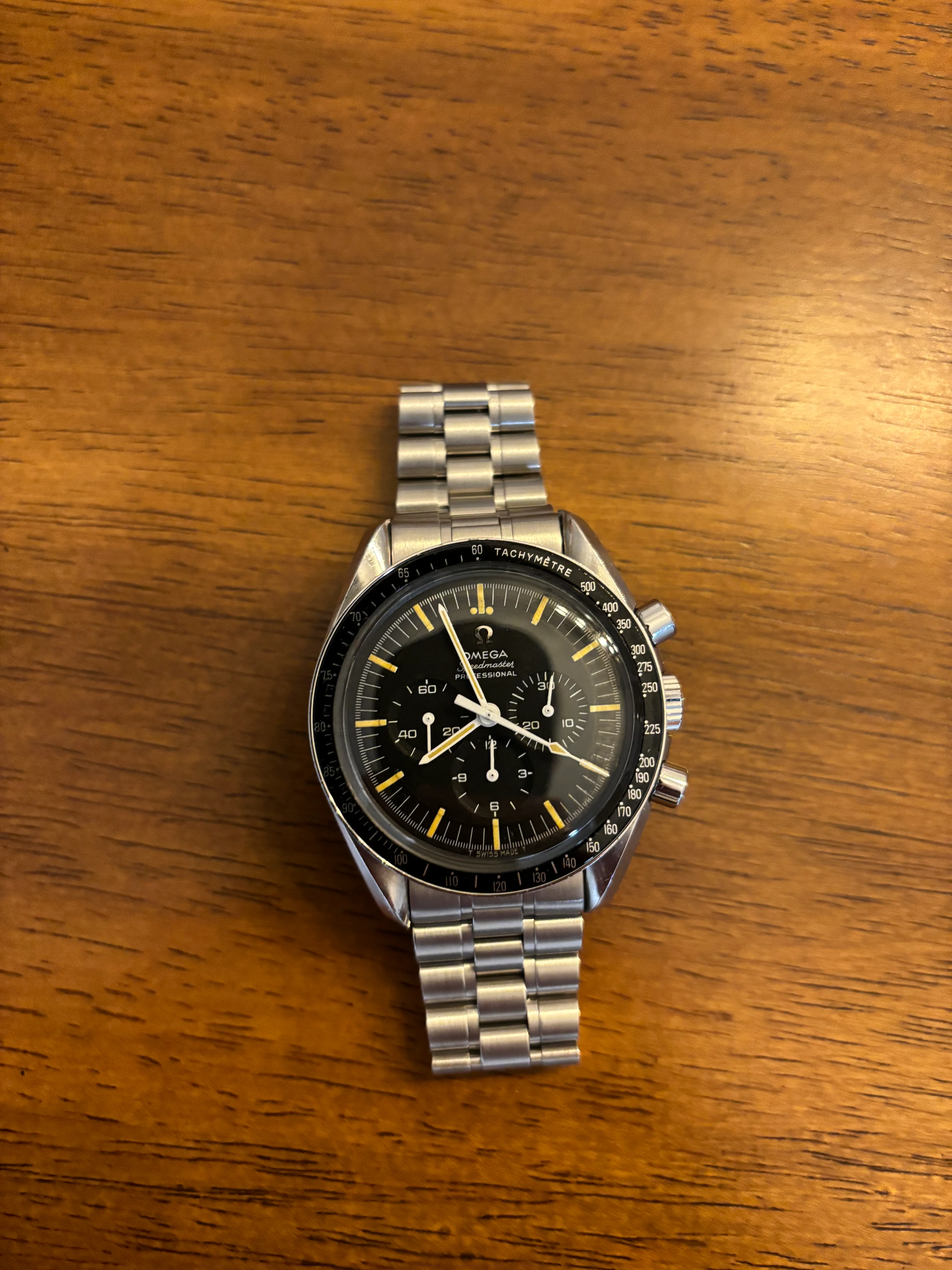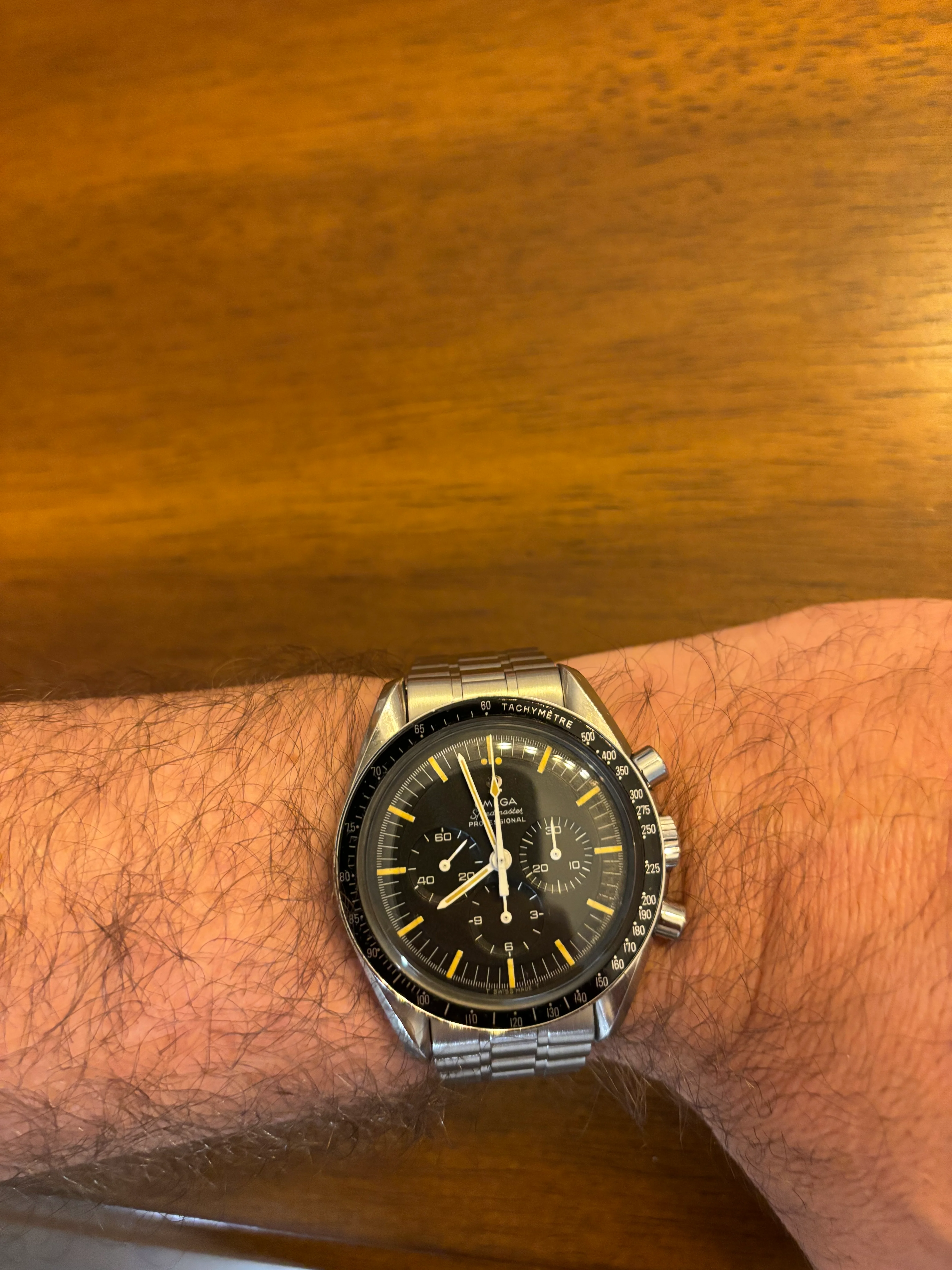 I wanted to share the story about my Omega Speedmaster Professional watch with the community. My uncle gave me this watch in 2018 a few months before I defended my Ph.D. dissertation. I wore this watch during my dissertation defense. My uncle told me my grandpa bought this watch brand new in 1969. My grandpa wore this watch daily until 1982 when he gave it to my uncle. My uncle had no sons so he gave me the watch. My Speedmaster Professional has the 861 movement and it has a 27xxx movement serial number so it's an early 861. I had it serviced back in 2018 and it ran great for a few years until it started losing time in 2023. I had it serviced again in March 2024. It now runs great. Last week I bought this Omega Speedmaster Professional modern bracelet with the adjustable clasp from an authorized dealer. This Omega Speedmaster Professional modern bracelet is very comfortable. I also have several NATOs, leather straps, and other Uncle Seiko metal straps that I swap since this is a strap queen. When my uncle gave me the watch the crystal was super beat up and the DON bezel was so banged up it was unpleasant to look at. So I swapped the bezel with a modern Omega bezel. I also had the watchmaker replace the pushers and crown as I wear this watch everyday. I also wore this watch when my son.