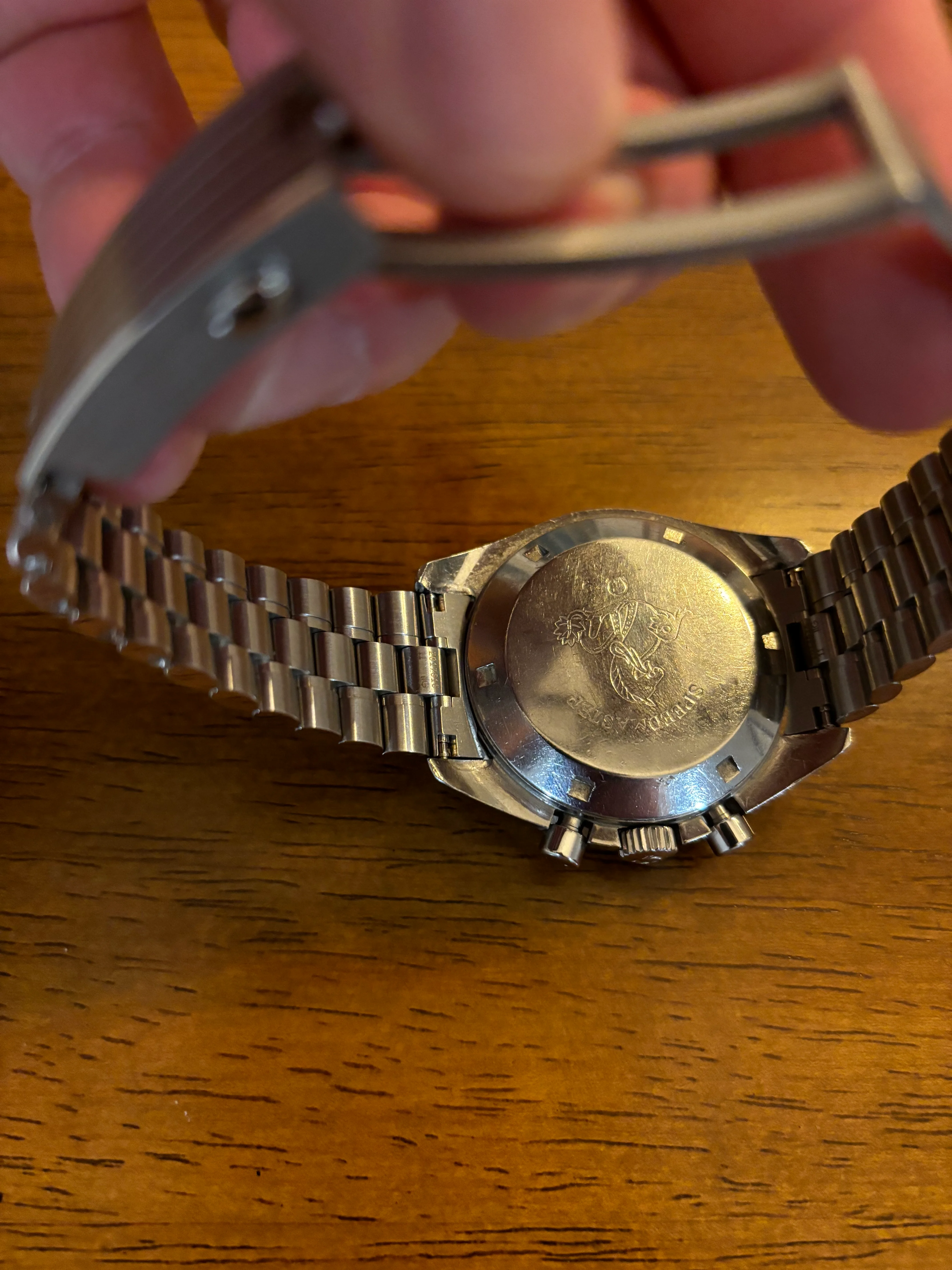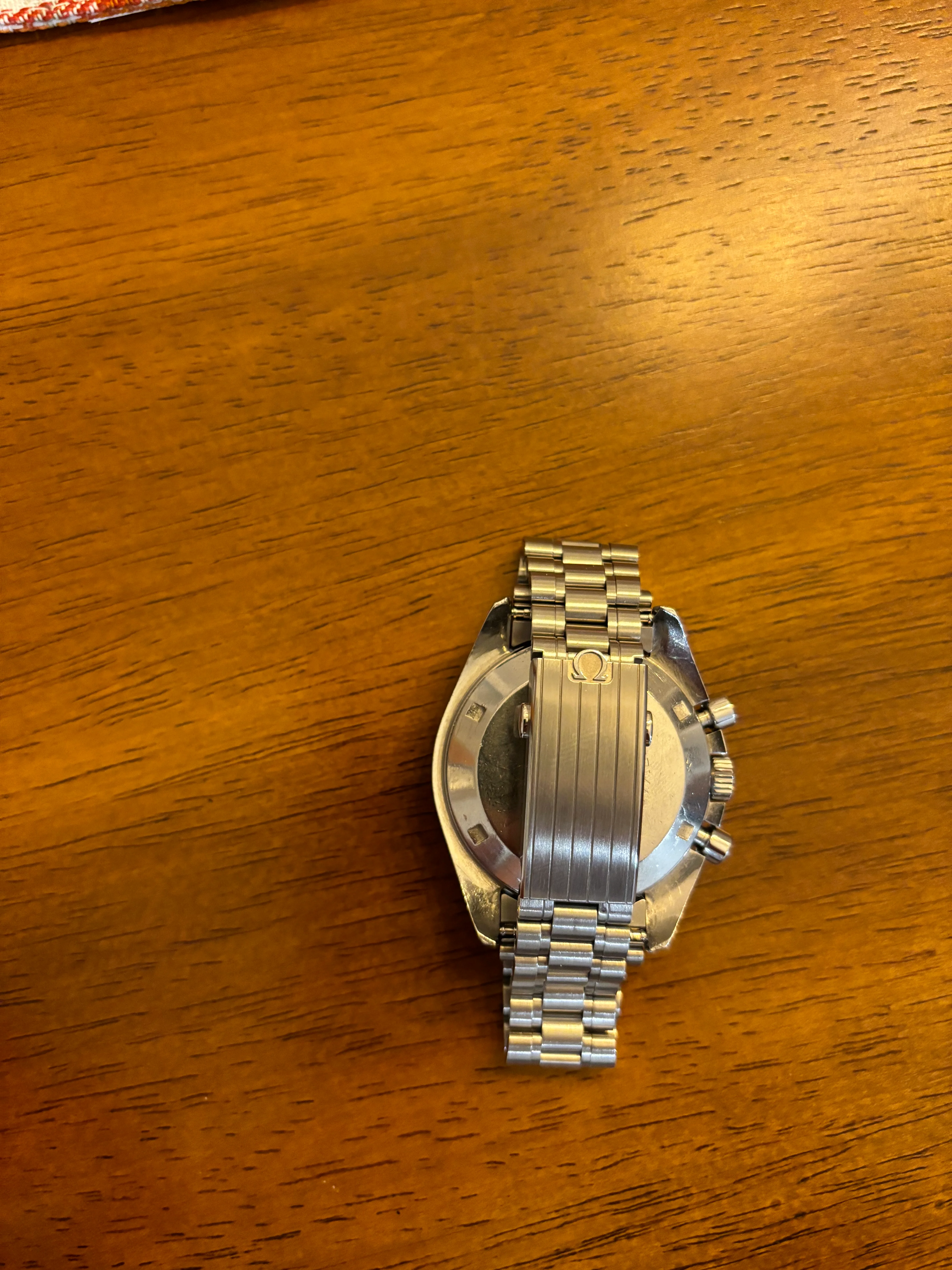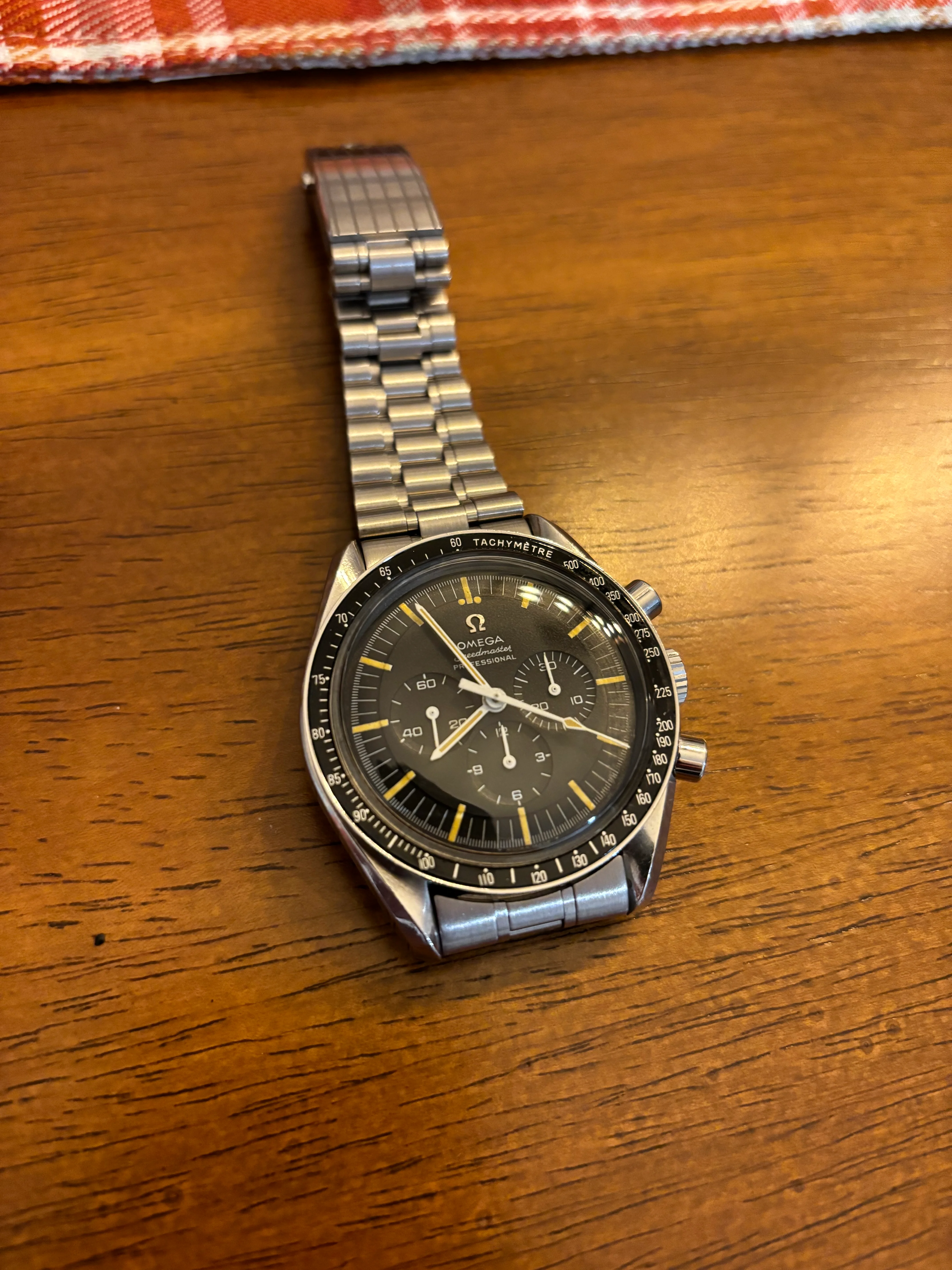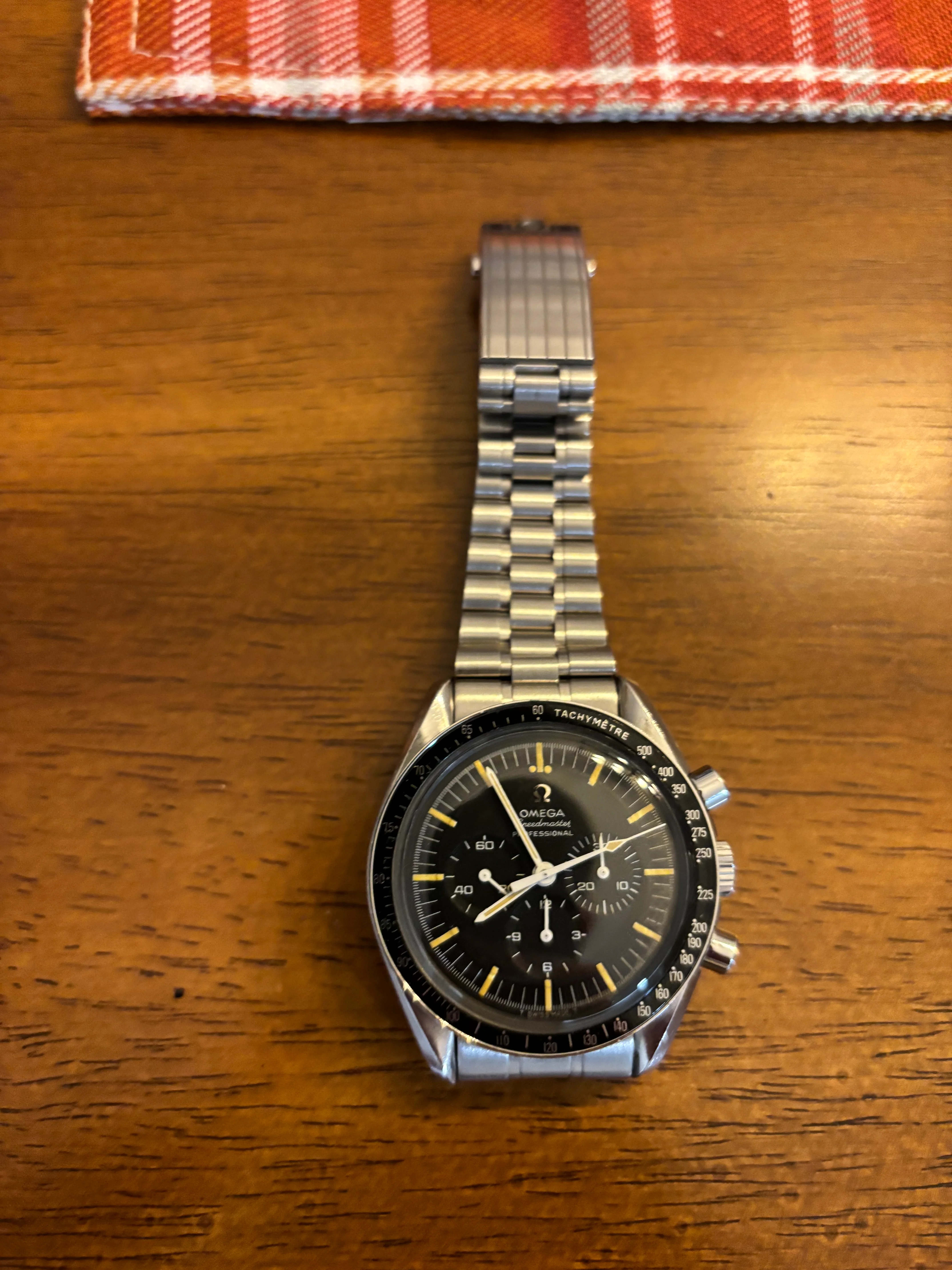 I wanted to share the story about my Omega Speedmaster Professional watch with the community. My uncle gave me this watch in 2018 a few months before I defended my Ph.D. dissertation. I wore this watch during my dissertation defense. My uncle told me my grandpa bought this watch brand new in 1969. My grandpa wore this watch daily until 1982 when he gave it to my uncle. My uncle had no sons so he gave me the watch. My Speedmaster Professional has the 861 movement and it has a 27xxx movement serial number so it's an early 861. I had it serviced back in 2018 and it ran great for a few years until it started losing time in 2023. I had it serviced again in March 2024. It now runs great. Last week I bought this Omega Speedmaster Professional modern bracelet with the adjustable clasp from an authorized dealer. This Omega Speedmaster Professional modern bracelet is very comfortable. I also have several NATOs, leather straps, and other Uncle Seiko metal straps that I swap since this is a strap queen. When my uncle gave me the watch the crystal was super beat up and the DON bezel was so banged up it was unpleasant to look at. So I swapped the bezel with a modern Omega bezel. I also had the watchmaker replace the pushers and crown as I wear this watch everyday. I also wore this watch when my son.