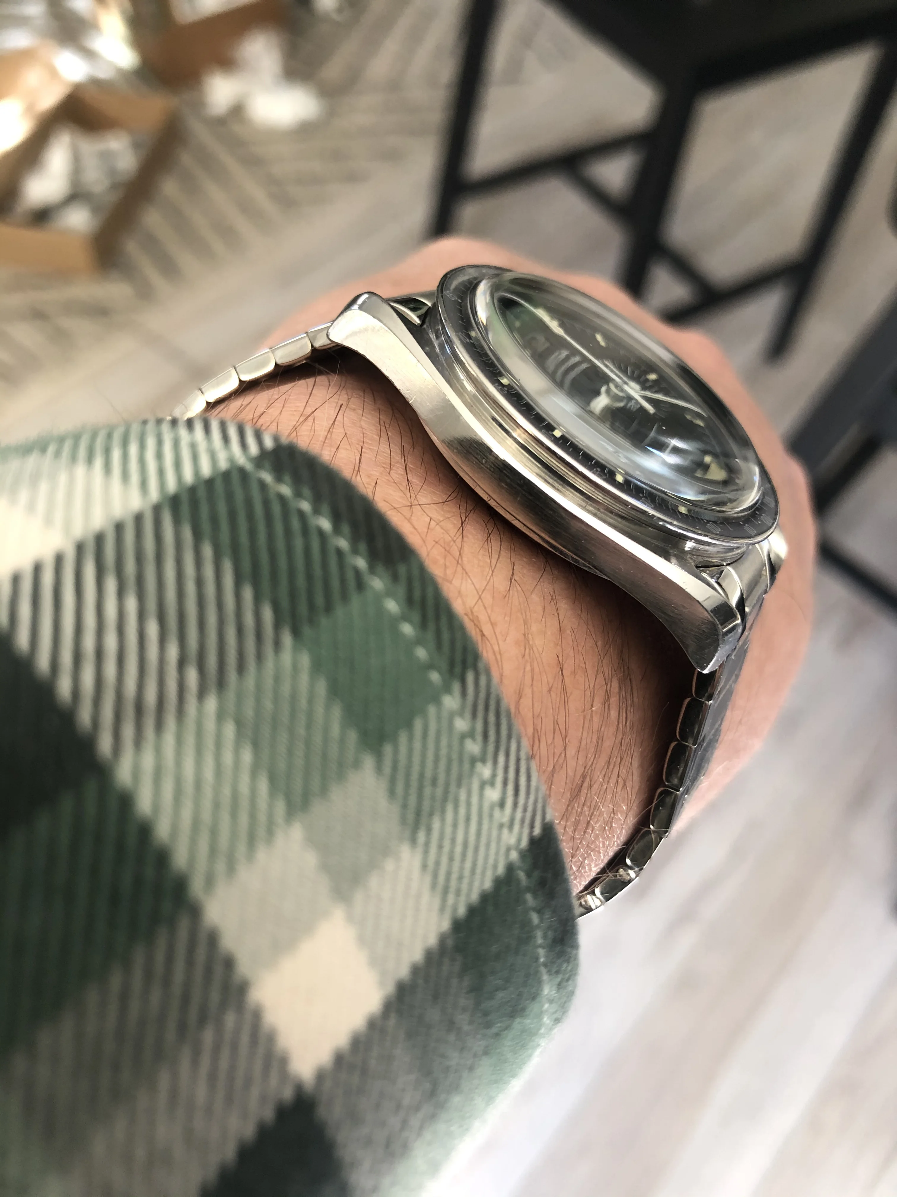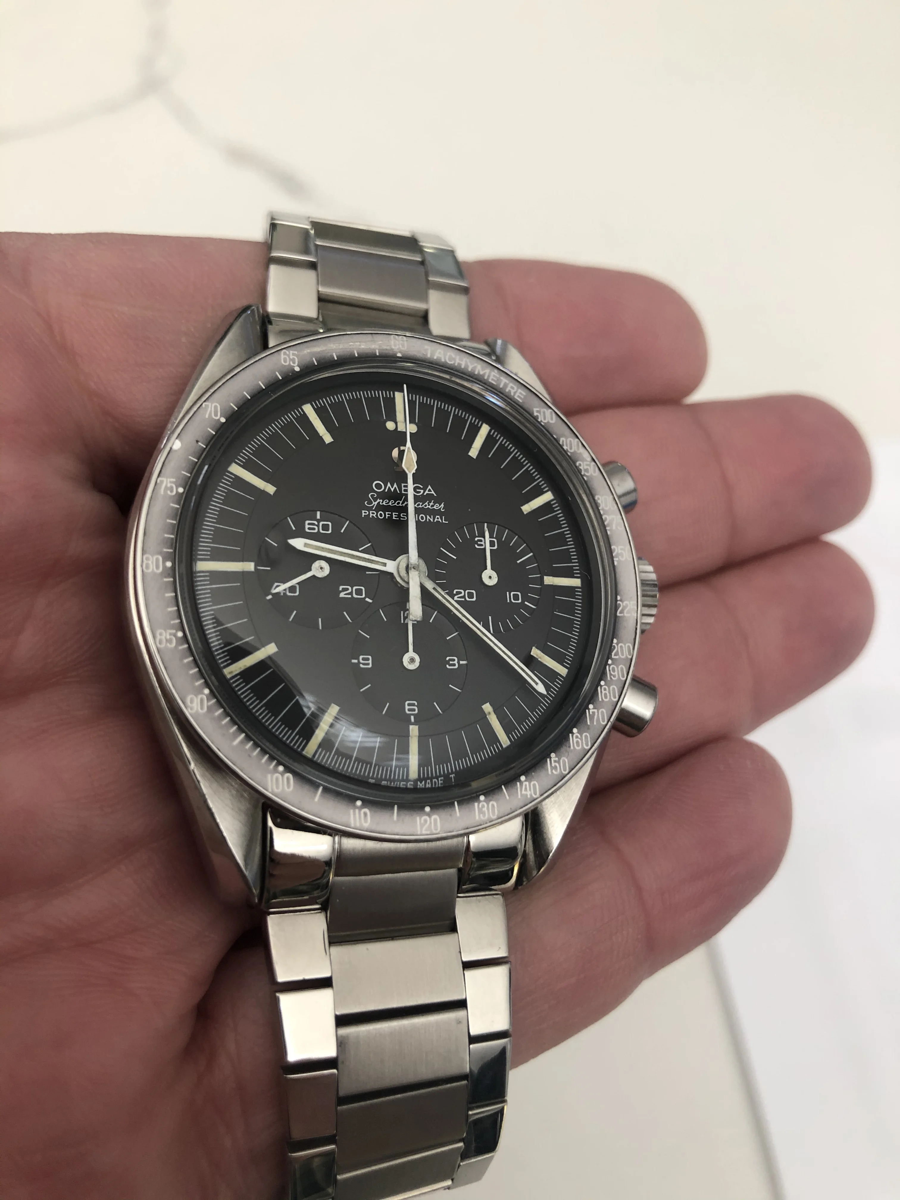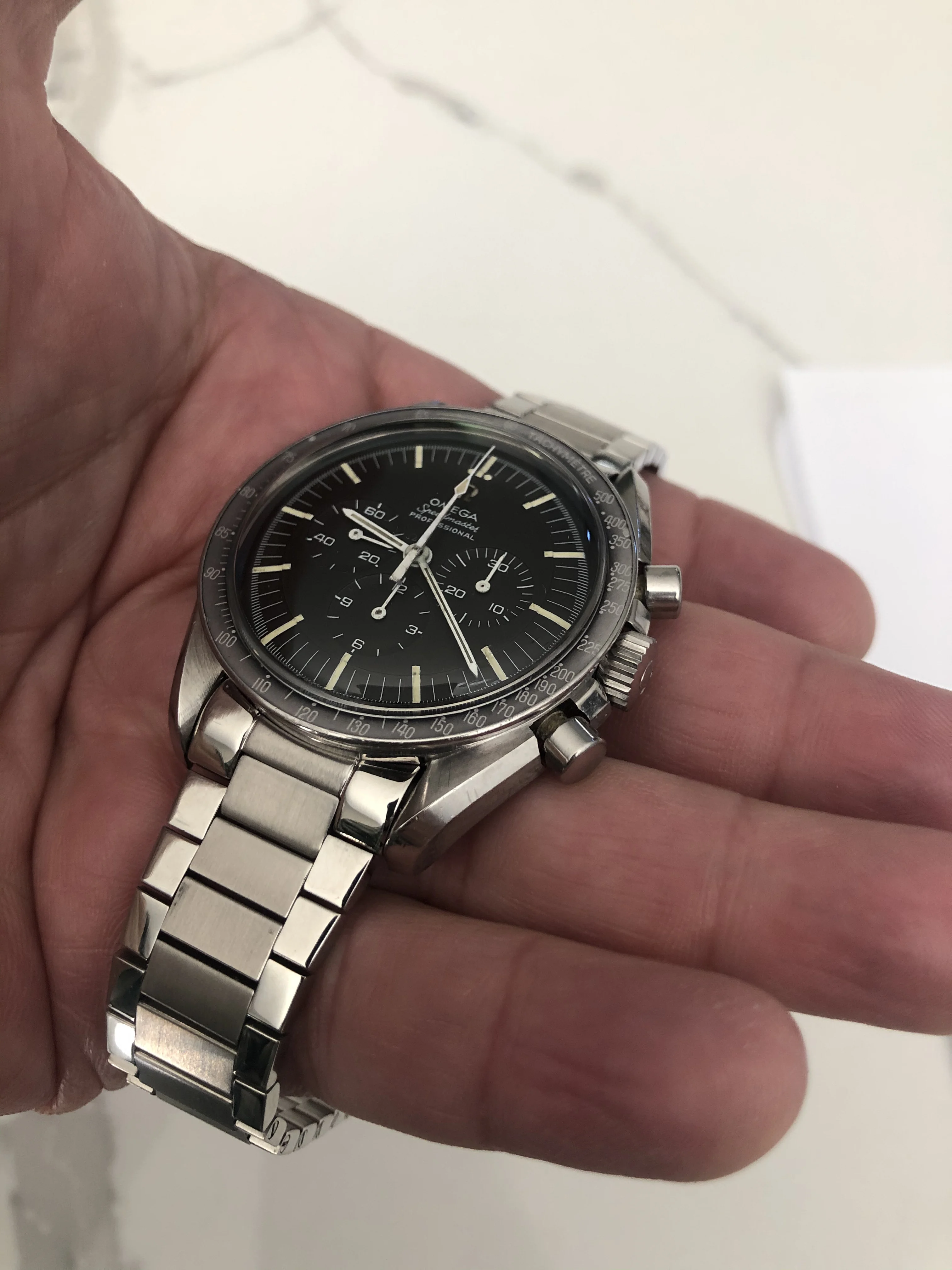 When I bought the watch, it came with a stretched 1039 bracelet with 516 endlinks in desperate need of a cleaning and restoration. After giving it several trips in the ultrasound, my plan was to restore the bracelet or send it off to Michael Young to have it done (I have a set of replacement 1039 springs), but, its just sat on my workbench ever since, one of dozens of TBD projects. I'd be willing to pass on this bracelet in its current condition, along with endlinks to the buyer for a very modest additional charge, which we can discuss privately. The watch is currently on a modern Forstner flat link, which I think looks, and wears, quite nice, and which will come with the watch of course.