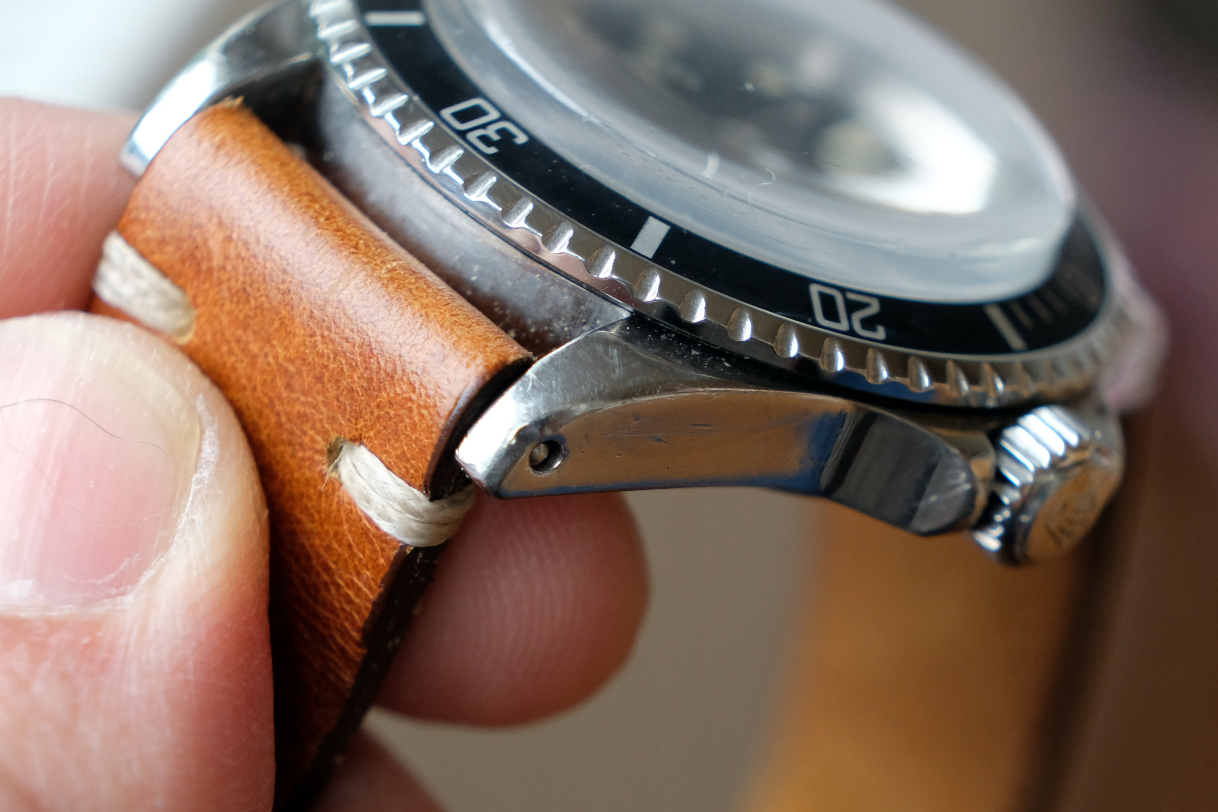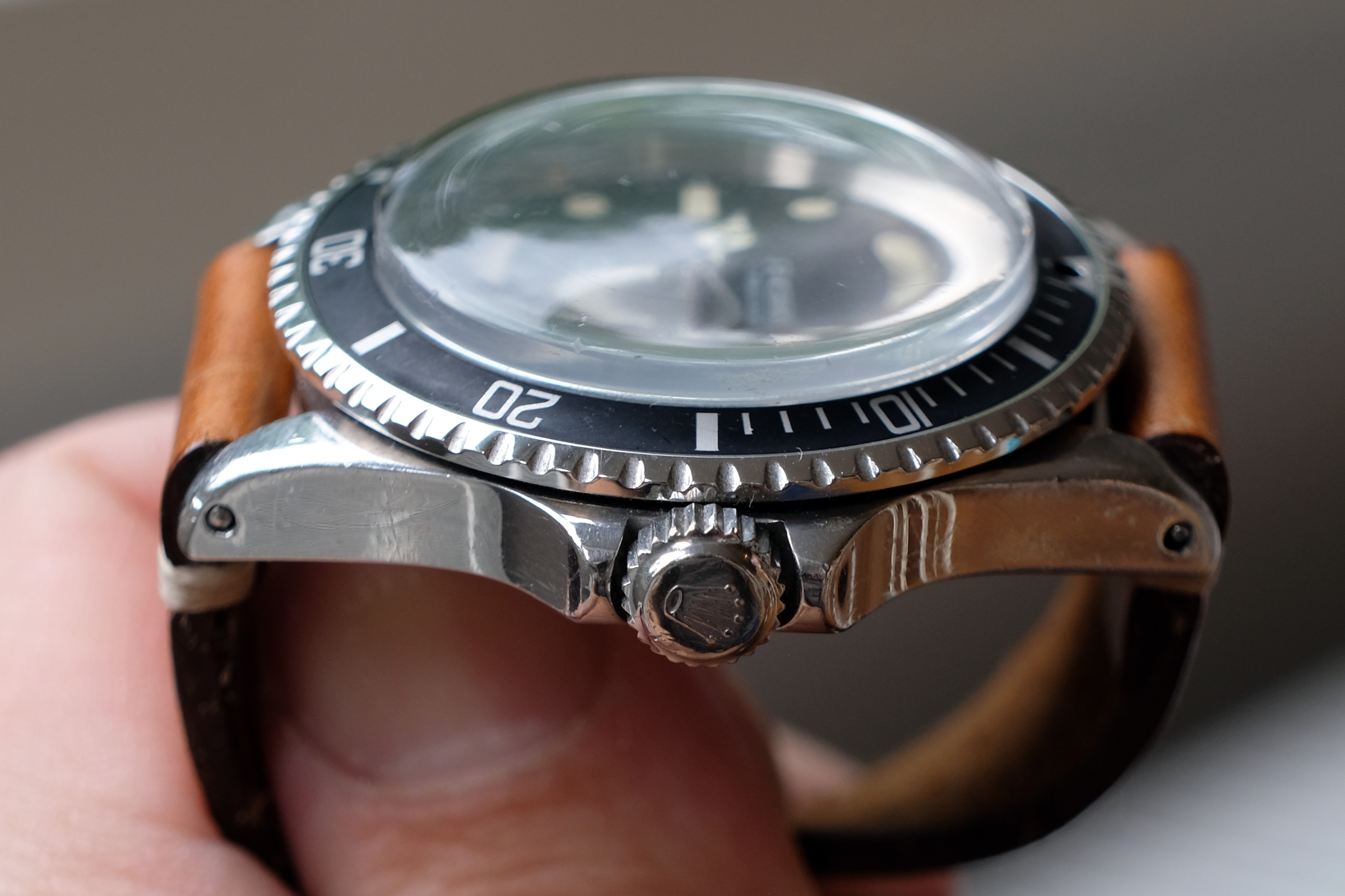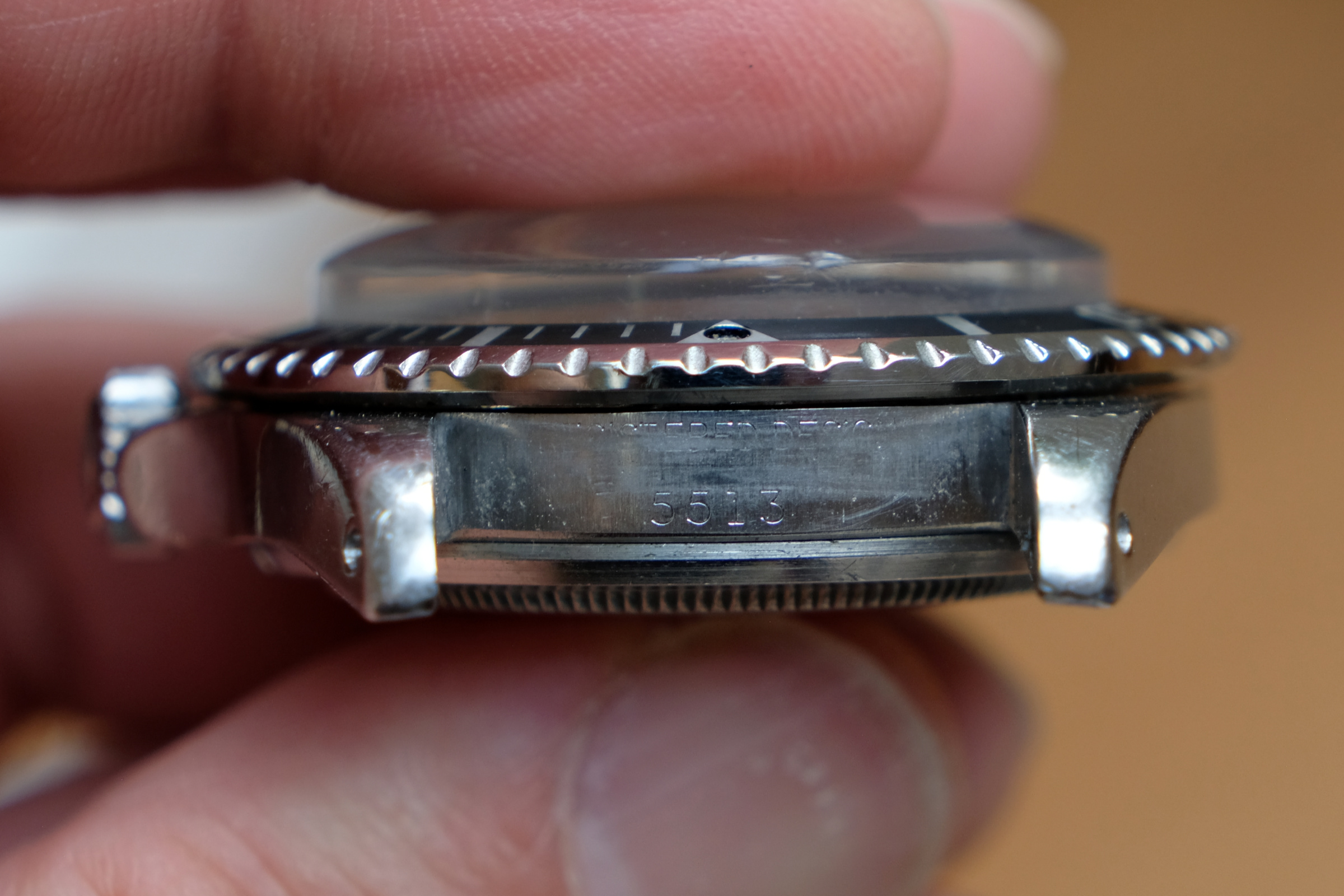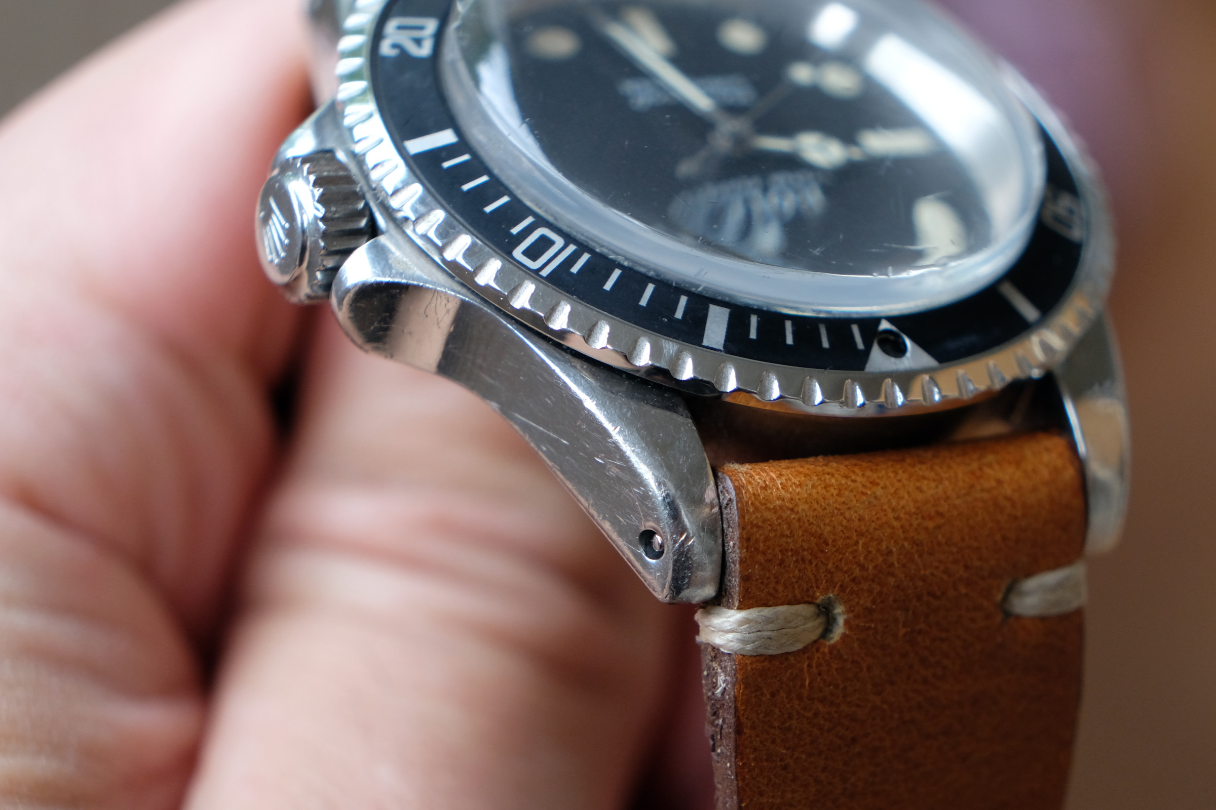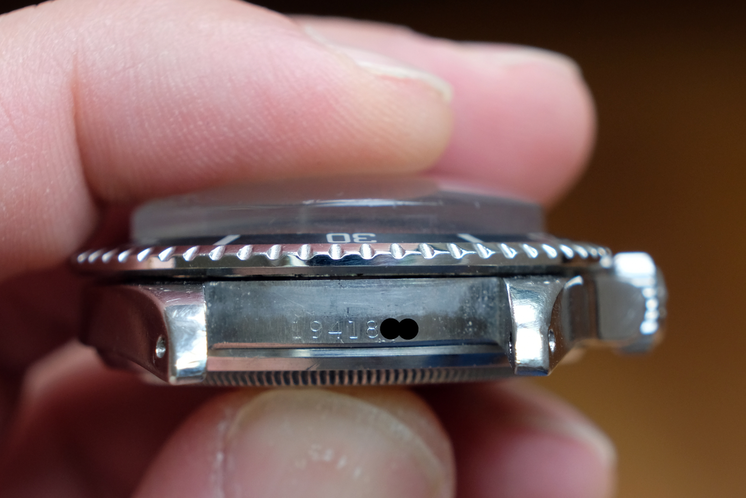 Case is worn but thick, with original bevels still faintly visible on the lugs and very light/faint engraving on caseback. Serial and ref numbers are clearly visible. Crown is original and functions as should. The bezel insert is a slightly later but original 1970’s mid-font insert.