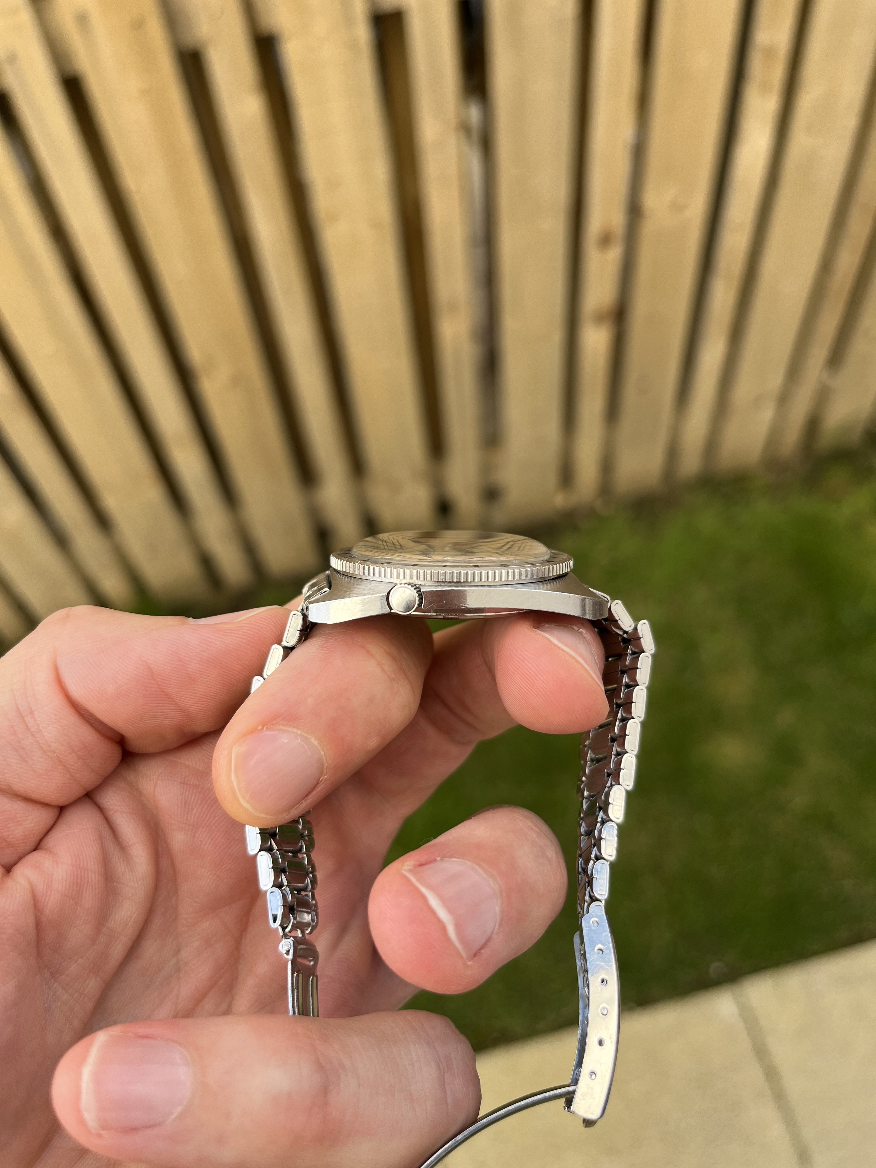 The watch comes with the original bracelet which is very rare. It definitely has some wear but is still perfectly wearable. The bracelet is sized for my 7in wrist and two additional links are included. The watch looks ace on a variety of straps.