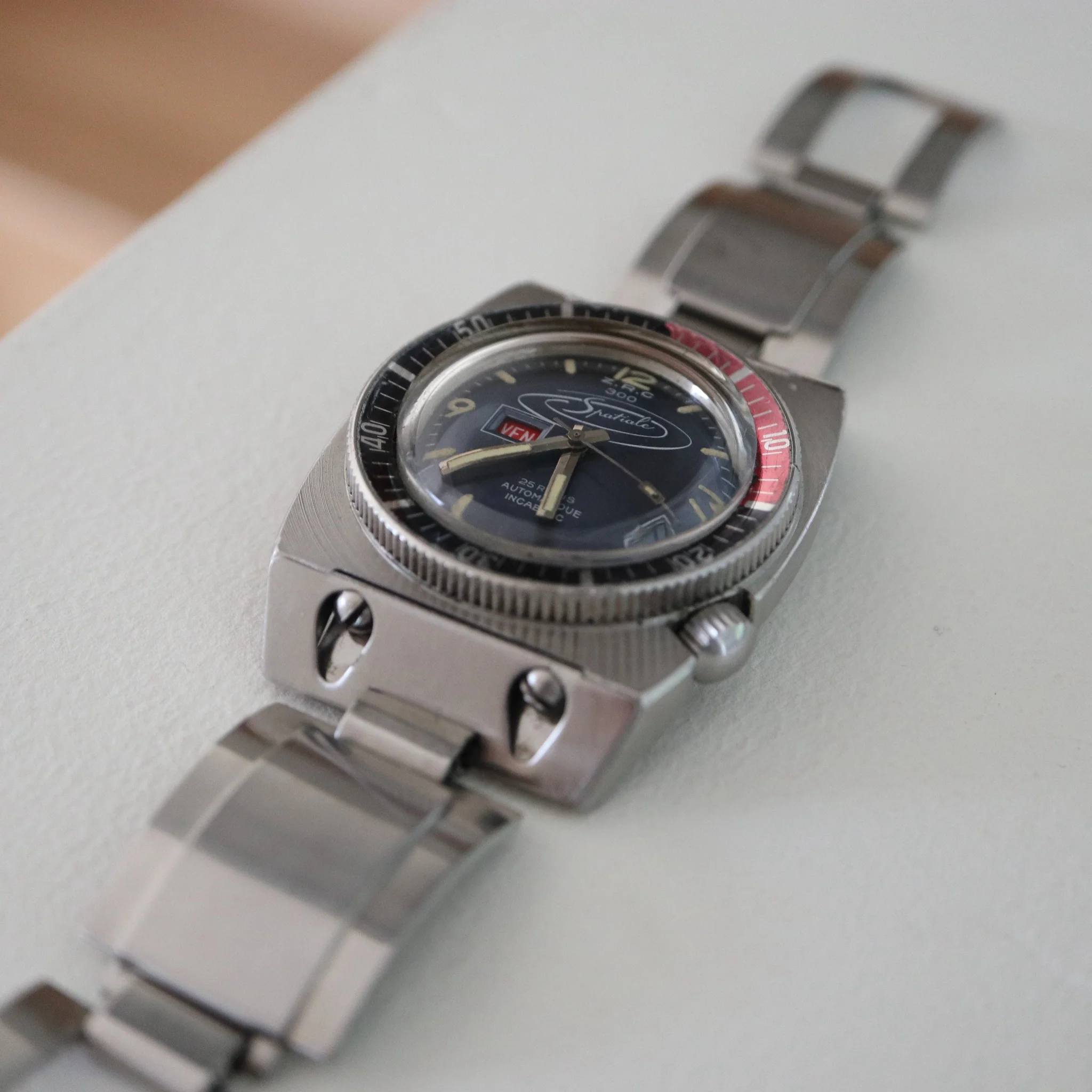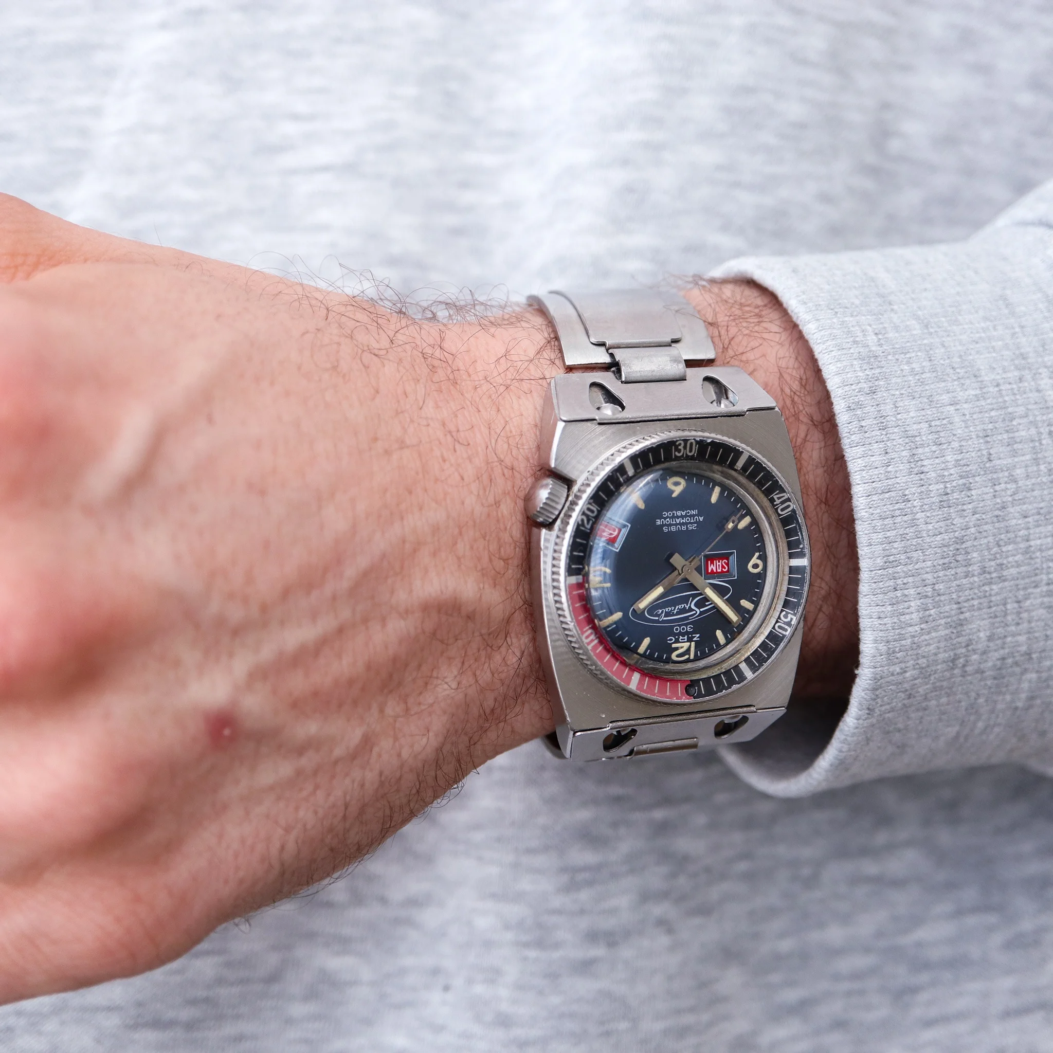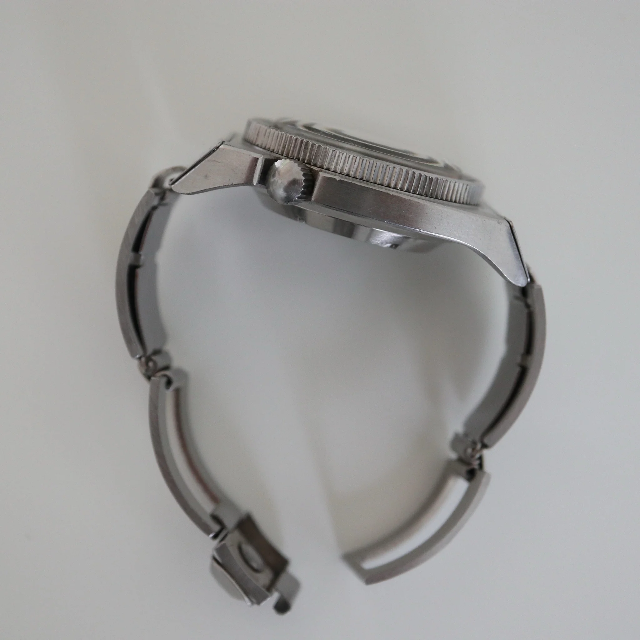 Excentric and rare Frenchie in excellent condition. Bracelet is now made to measure for 17,5 / 18cm wrist but I have removed 3 removable links so it can be prolongated 3,5 to 4cm approx. Bezel turns, crown works as should. Case is unpolished with sharp facets and on top the peculiar radial brushing. The movement runs well but the power reserve after putting it down is not super long - would benefit from a service in the longer run. Little bit of tritium gone from the seconds hand. Not many made and this is a survivor in very nice condition.