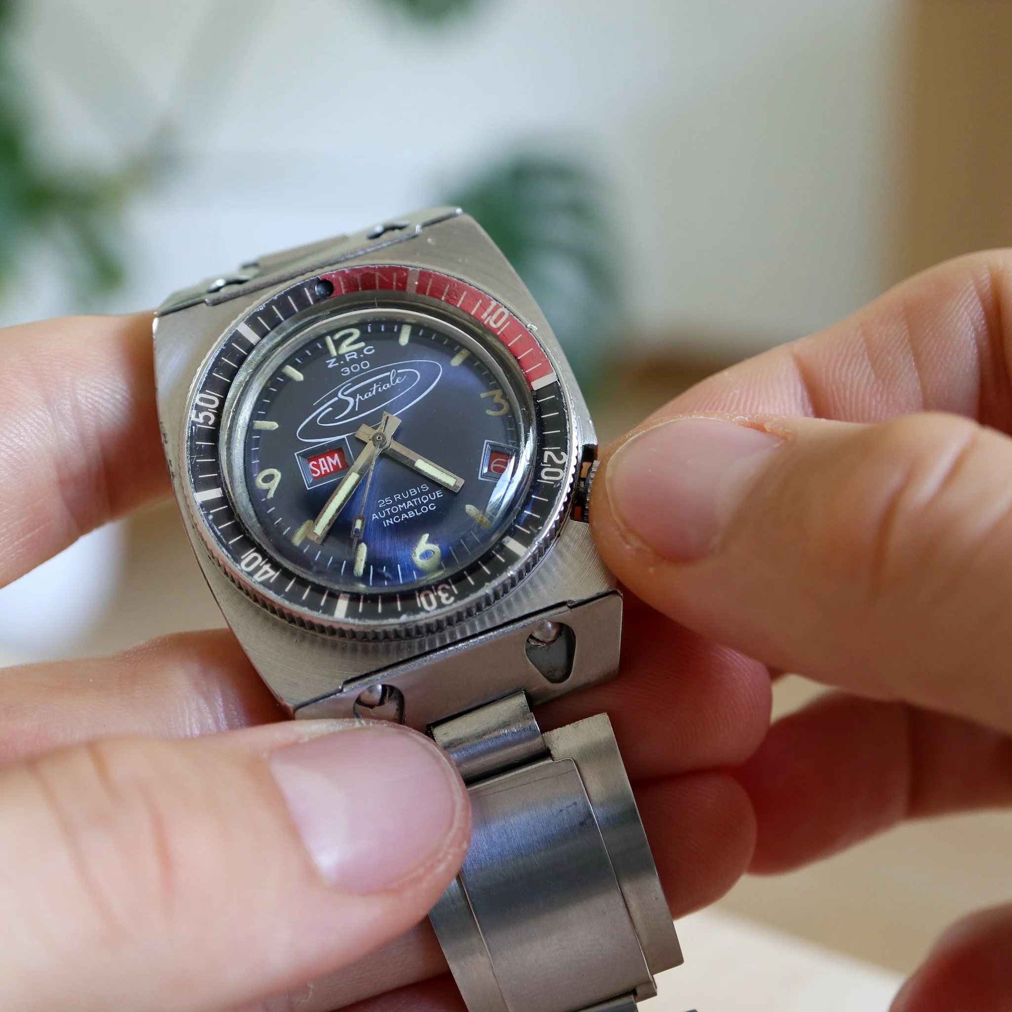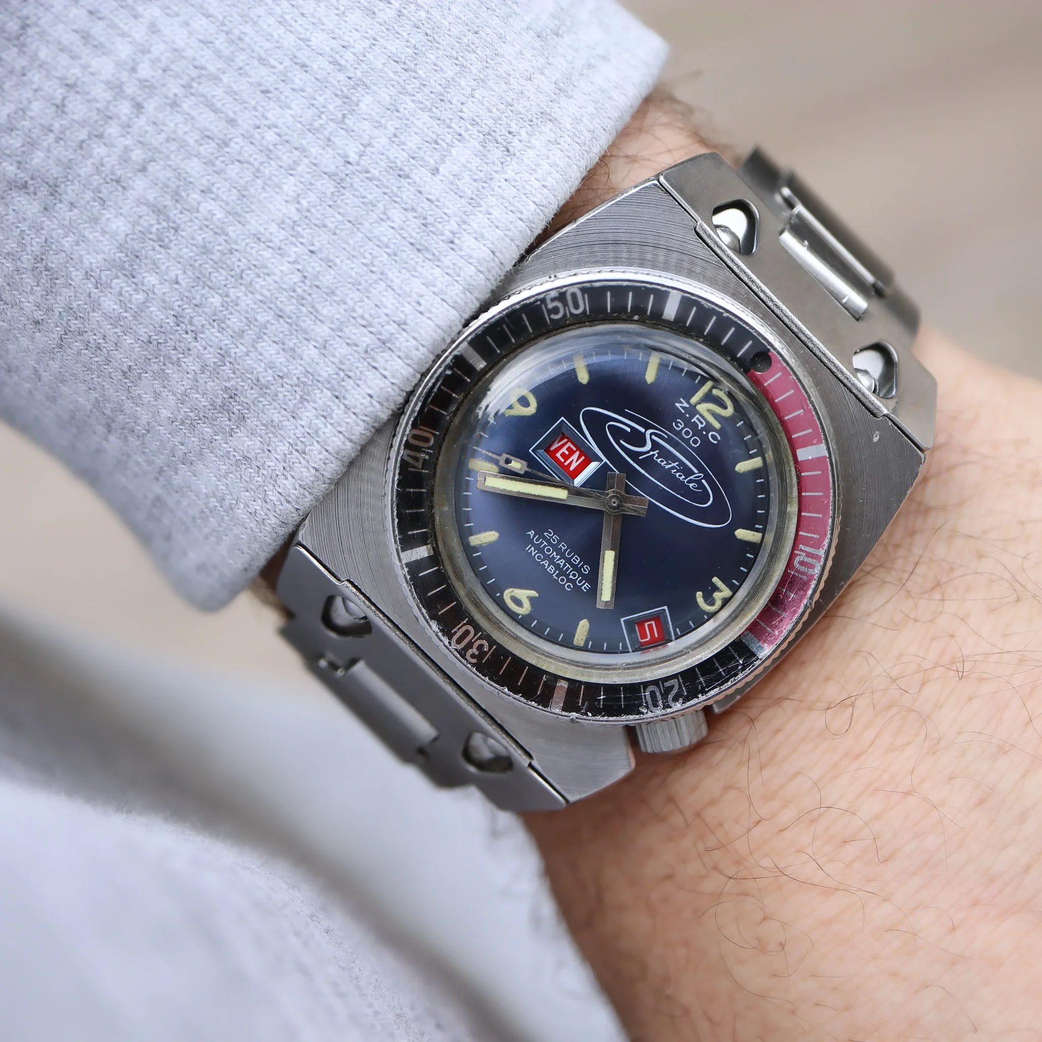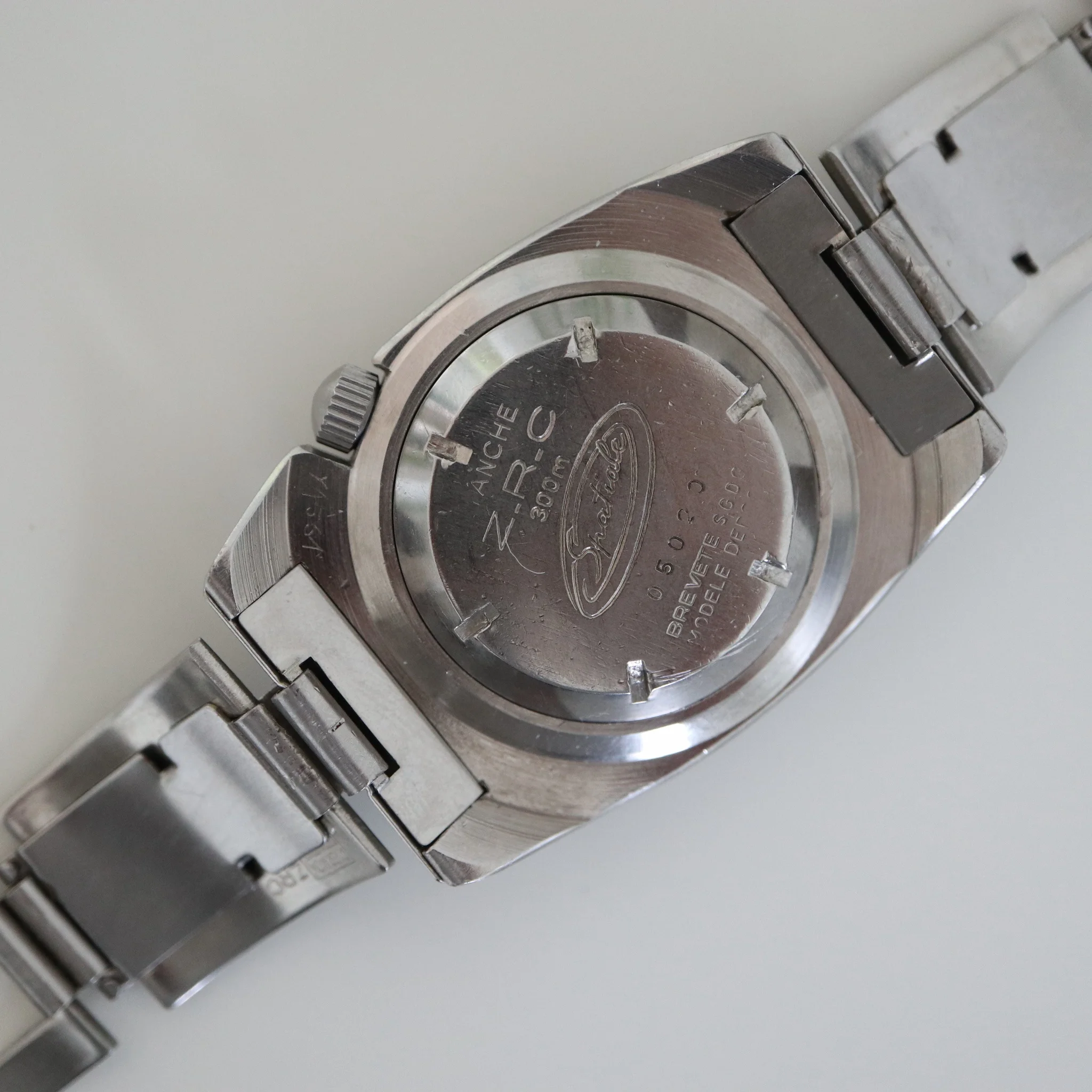 Excentric and rare Frenchie in excellent condition. Bracelet is now made to measure for 17,5 / 18cm wrist but I have removed 3 removable links so it can be prolongated 3,5 to 4cm approx. Bezel turns, crown works as should. Case is unpolished with sharp facets and on top the peculiar radial brushing. The movement runs well but the power reserve after putting it down is not super long - would benefit from a service in the longer run. Little bit of tritium gone from the seconds hand. Not many made and this is a survivor in very nice condition.