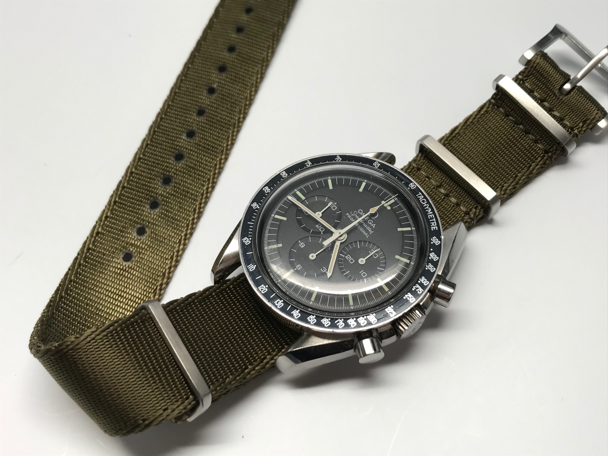 The sale includes the head only (no bracelet or straps), but if you need something I have plenty and we can figure something out. The B&S olive green NATO shown in the last photo looks pretty good.