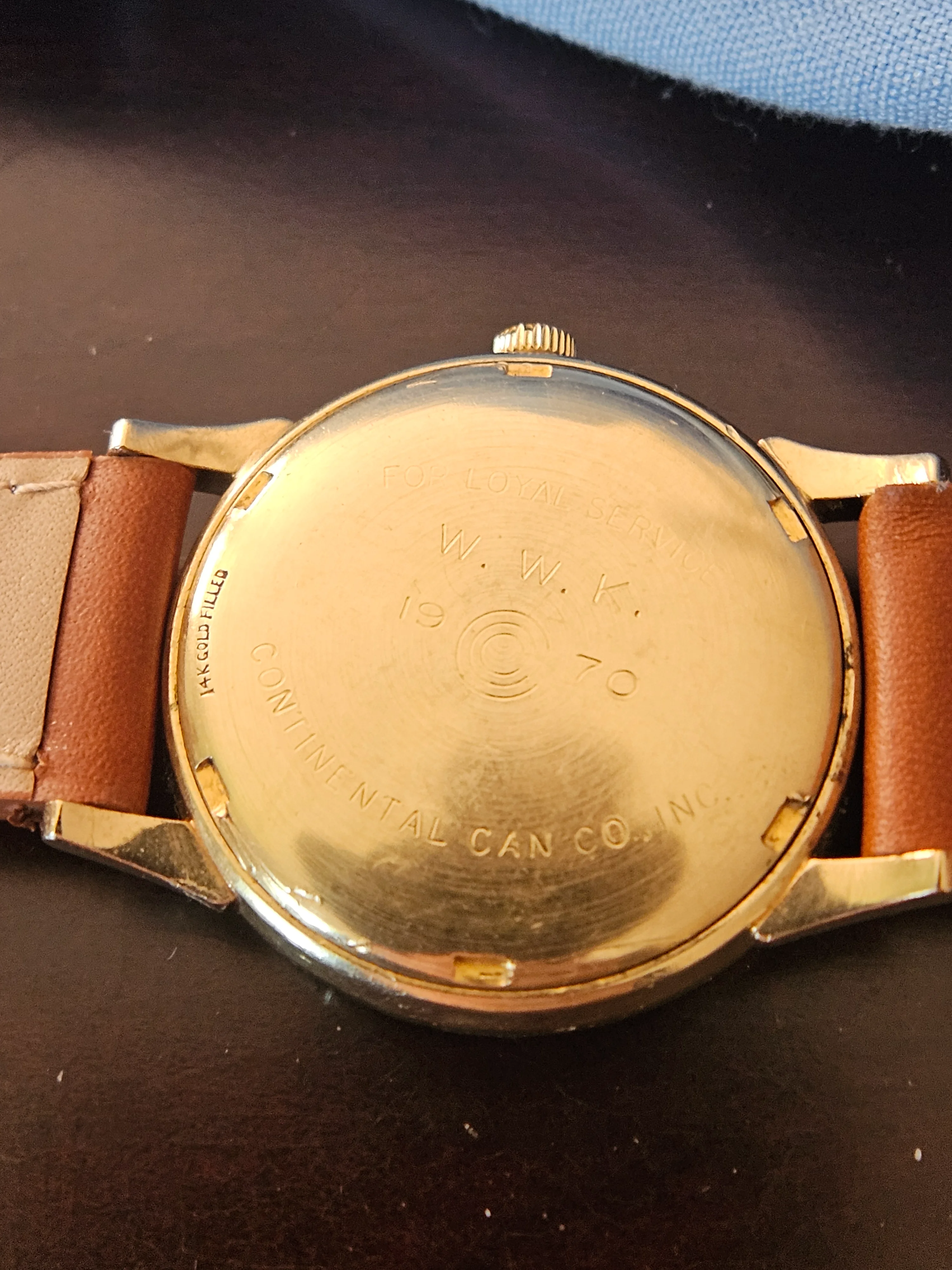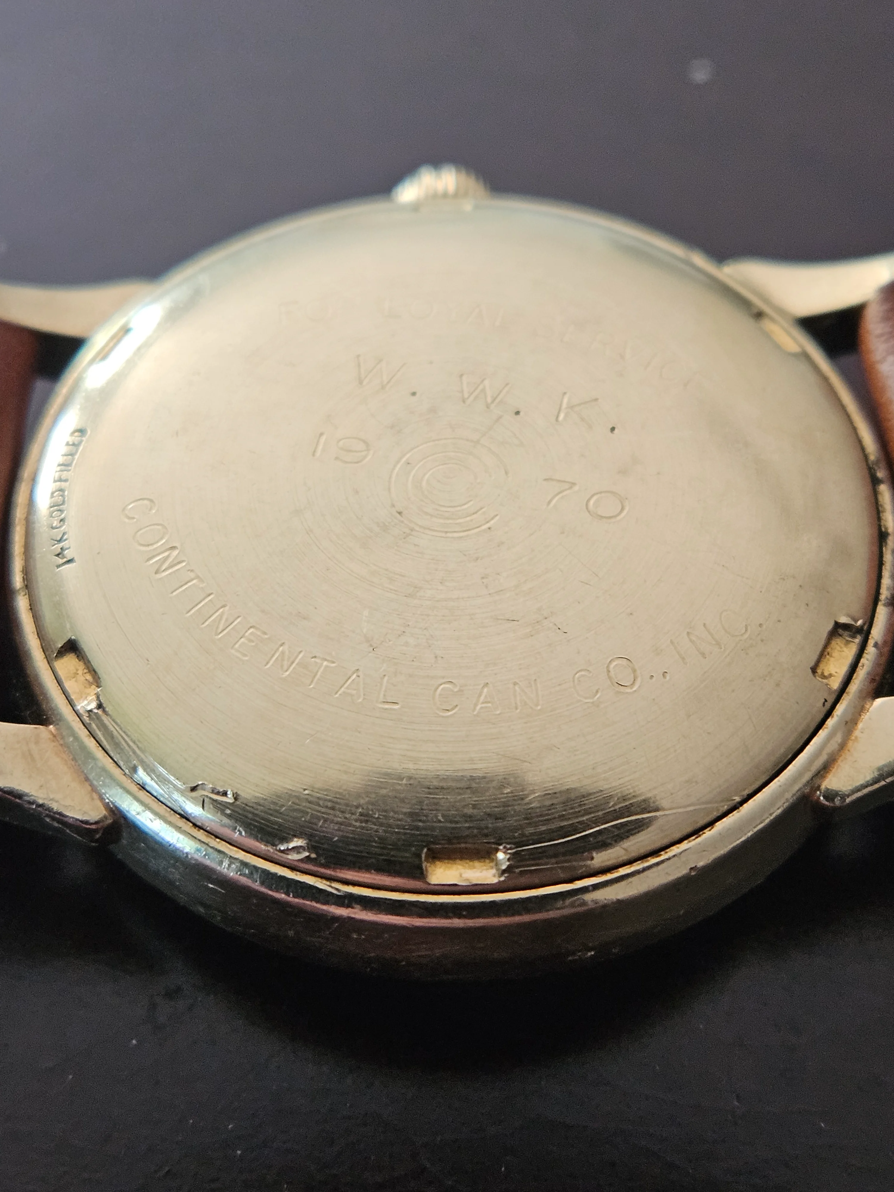 ·1969 CCC continental can company given to an employee. Looks very good to me.I'm always suspect of dials, but I believe it's an original but would certainly love any opinions. Also, the crown maybe aftermarket I m not completely sure. I bought it through Grailzee.com and it was authenticated by a watch company in west palm beach, called Bennisson which I really don't know very well. And I really don't know what they mean by authentication. I'll take a picture of the movement later post it. 🍻 Cheers