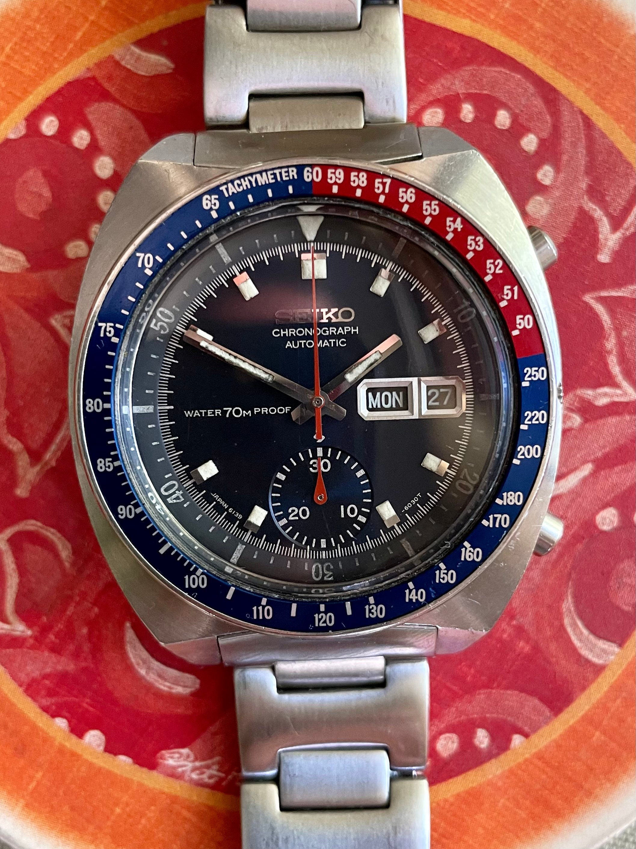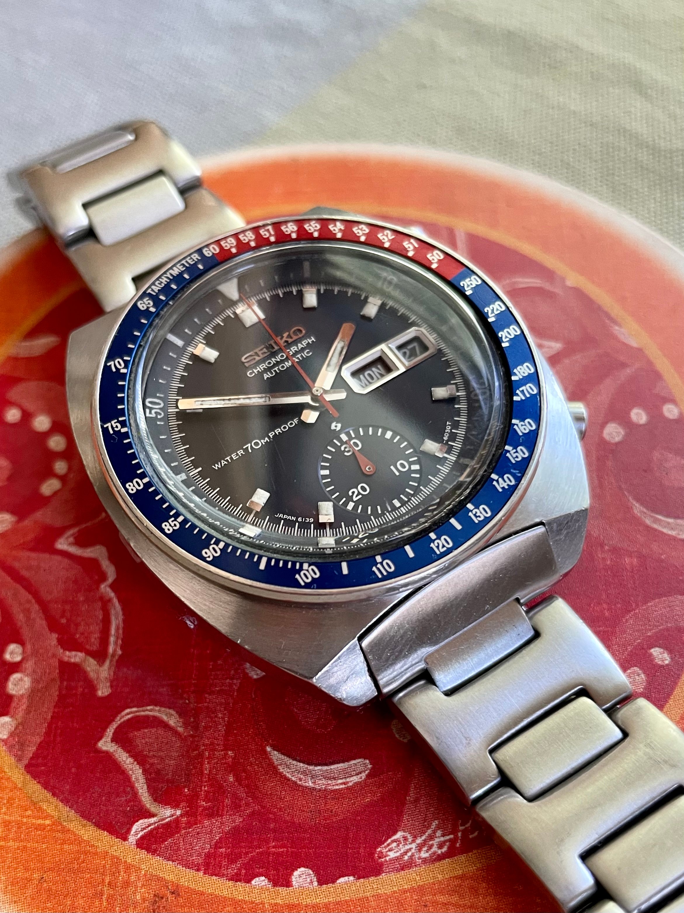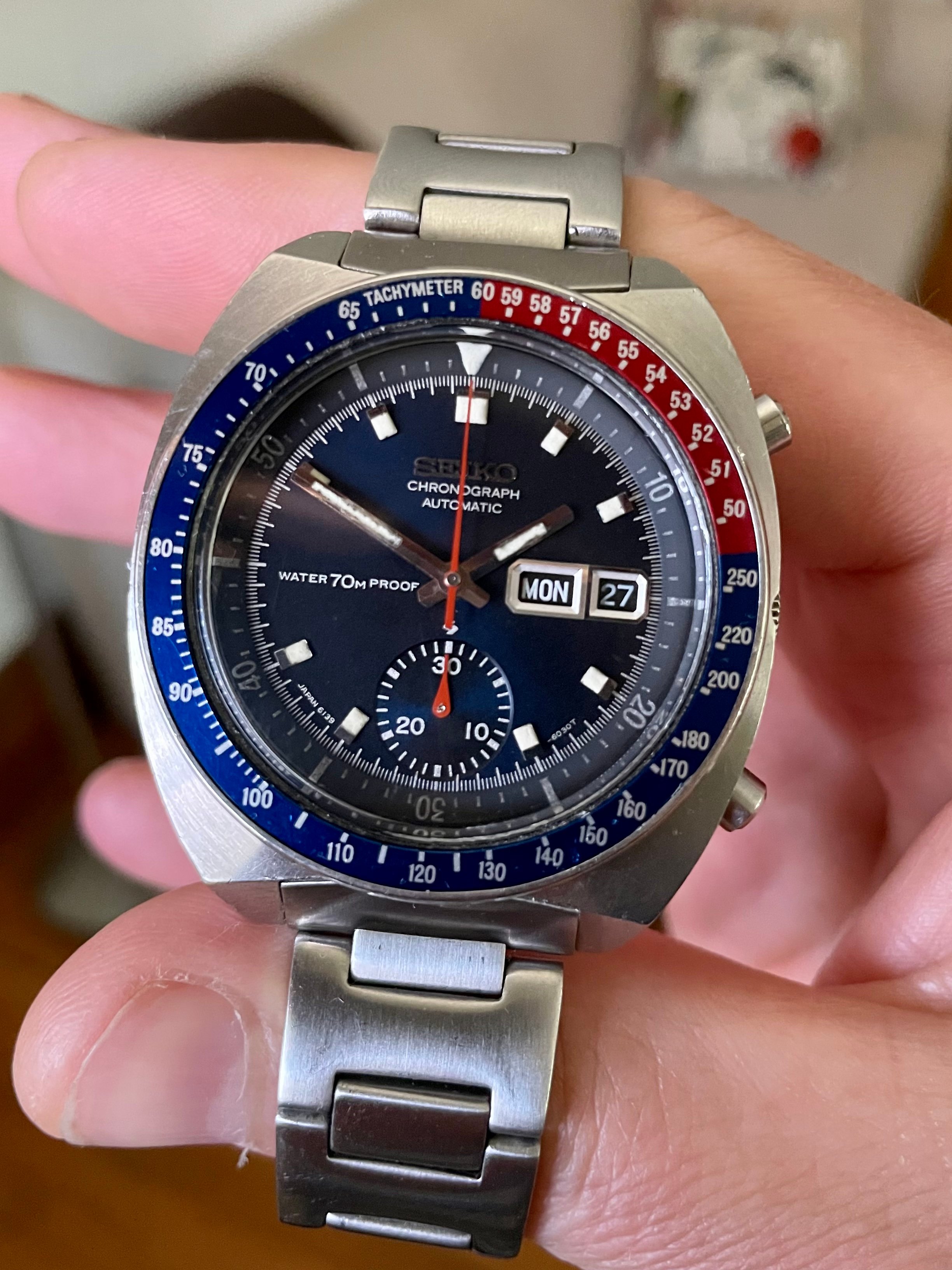 For sale today is my 1969 Seiko 6139-6000. It’s an early and rare example of what’s now referred to as a Blue “Pogue” (I use those quote marks liberally) 😀 These are often put together with fake/cobbled together parts, but this one is (with the exception of the crystal), and to the best of my knowledge, entirely original. I purchased this watch from Hub City Vintage and it was serviced by them. Here’s the link: https://www.hubcityvintage.com/arch...9-6000-automatic-chronograph-blue-pogue-proof