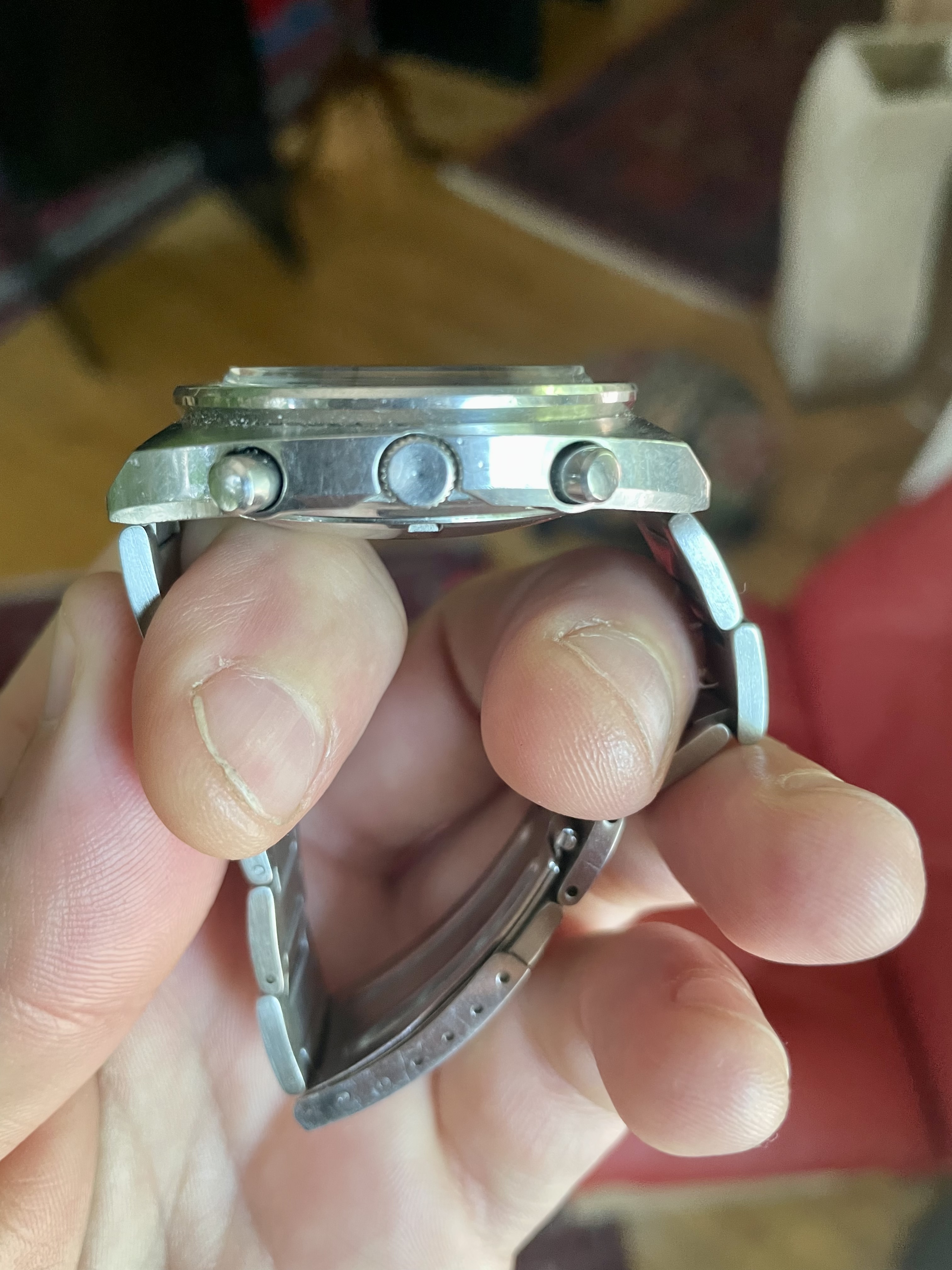 The movement was serviced by Hub City Vintage in May of 2021. It keeps good time and shows the signs of a recent service (the inner bezel turns with ease, the quick set date works as it should, the rotor spins with ease, the chronograph starts-stops-resets perfectly, etc.)
