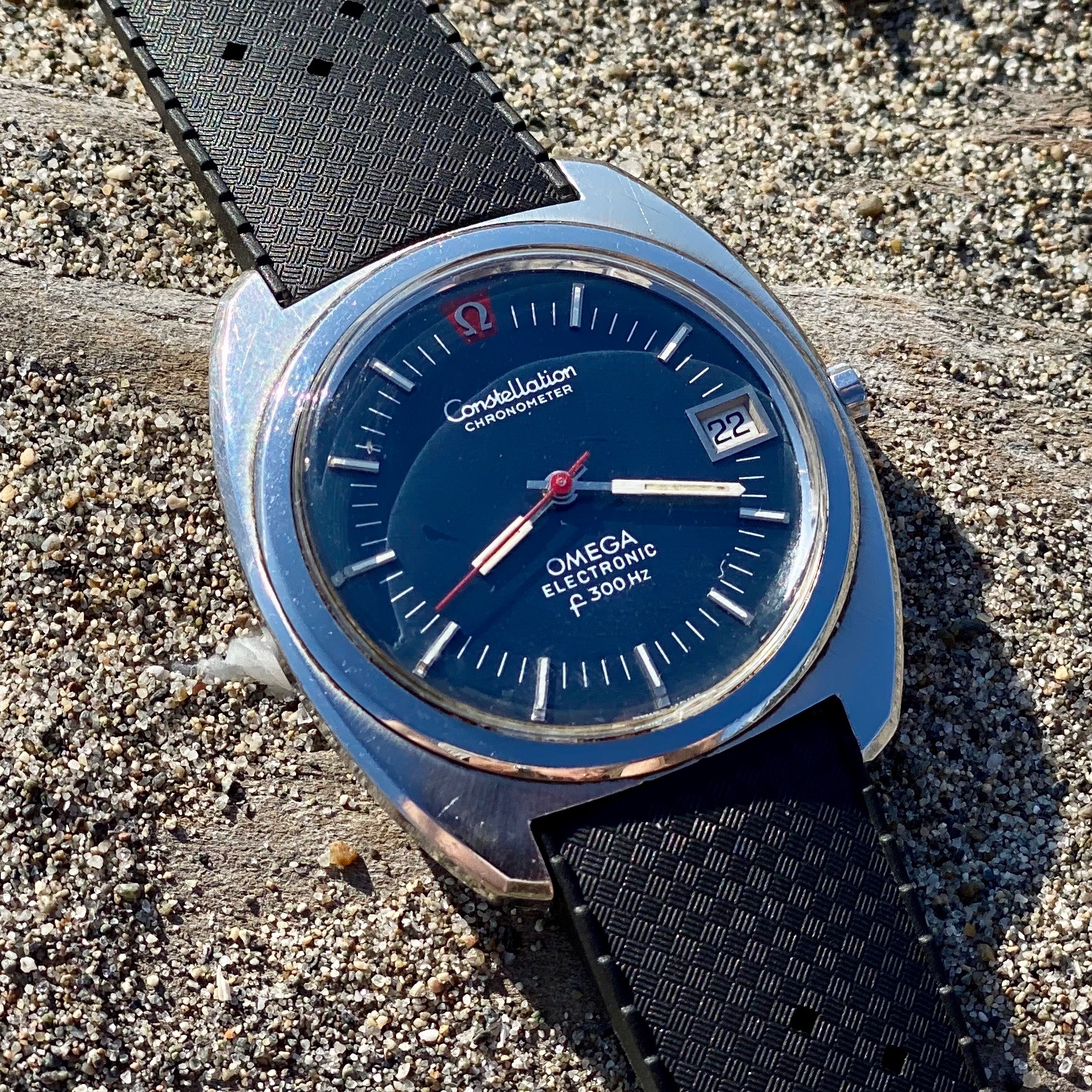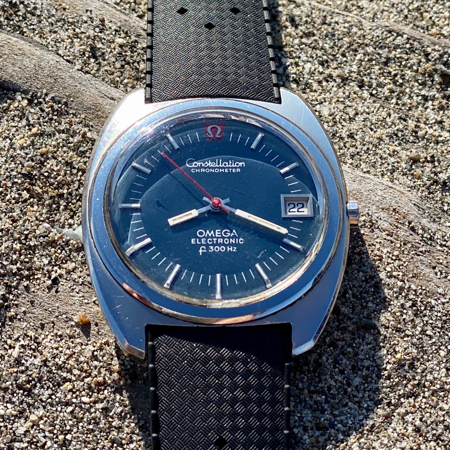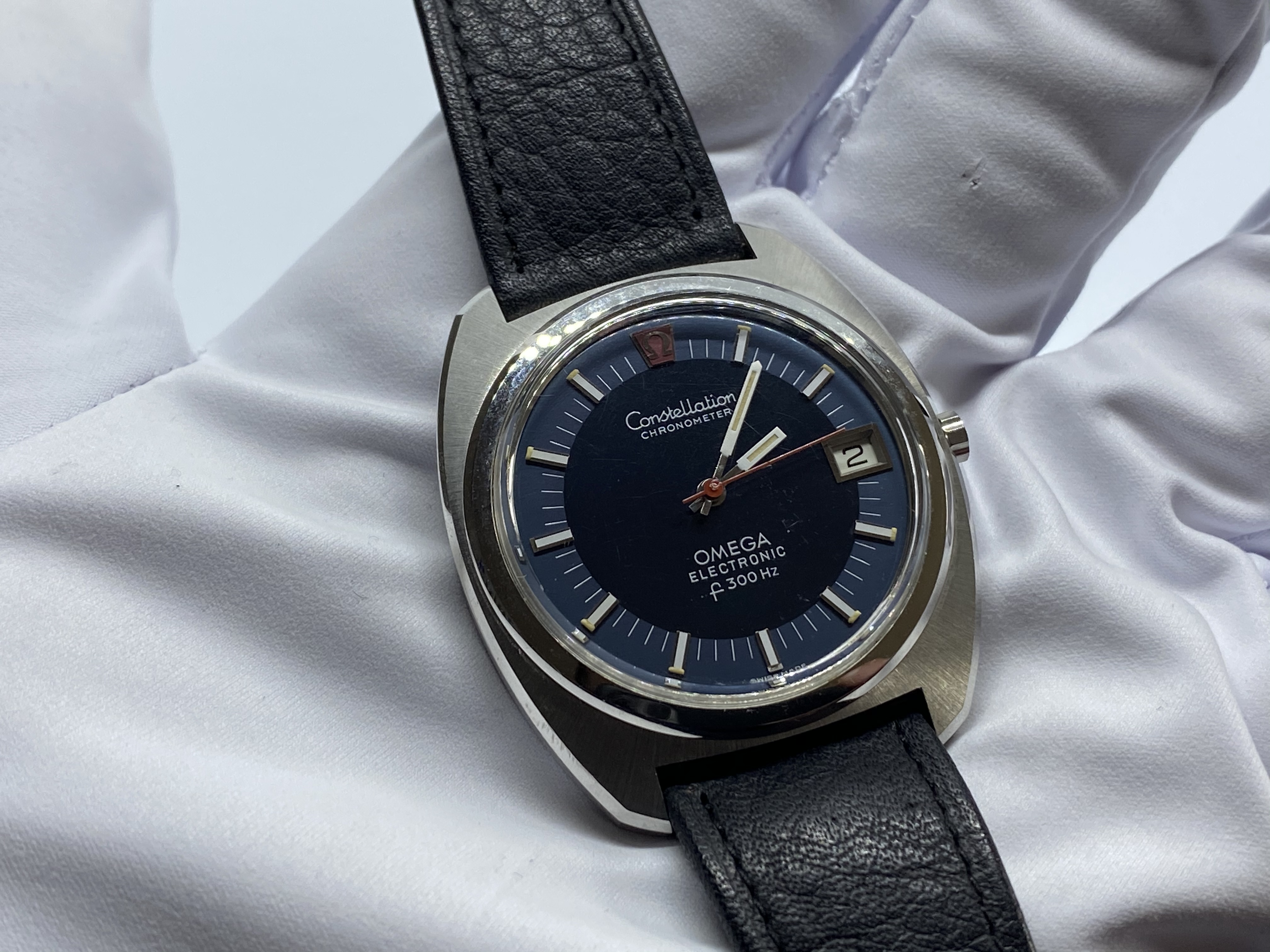·I've been super curious about these tuning fork watches for a bit now, in particular wanting to hear the sound and see the gliding sweep hand in action. Hard to pick which one but settled on the blue dial, stainless steel Constellation as my target. I quite like the splash of color with the red hand against the sector (is that the right terminology in this case?) blue dial. I've seen other variation with the Omega symbol pushed lower, like those as well but this one came up first. Picked it up via a quick, easy IG deal with CROADCO Watches. Watch was well represented with good communication, price was reasonable, and delivery from Columbia was very fast.
