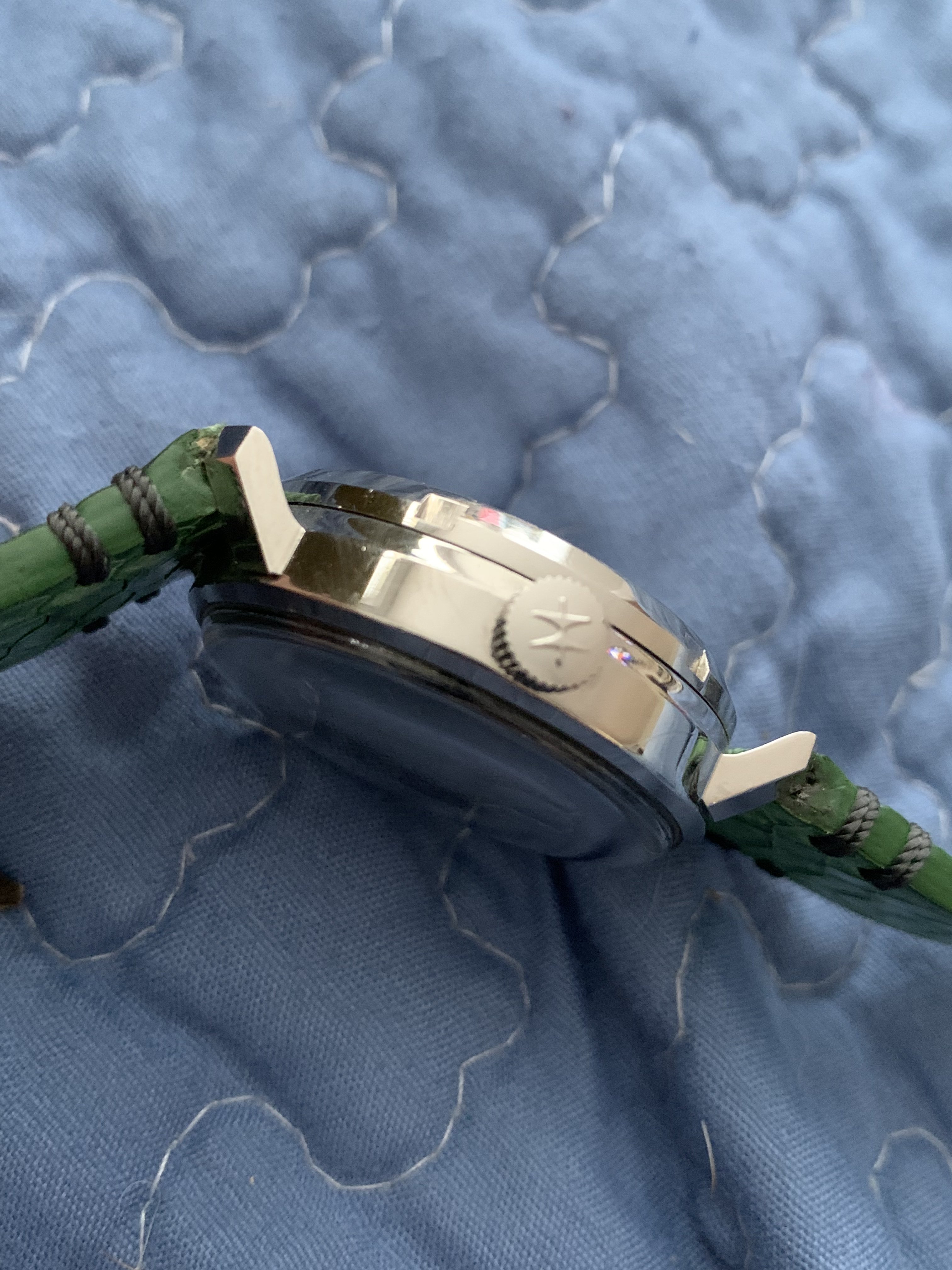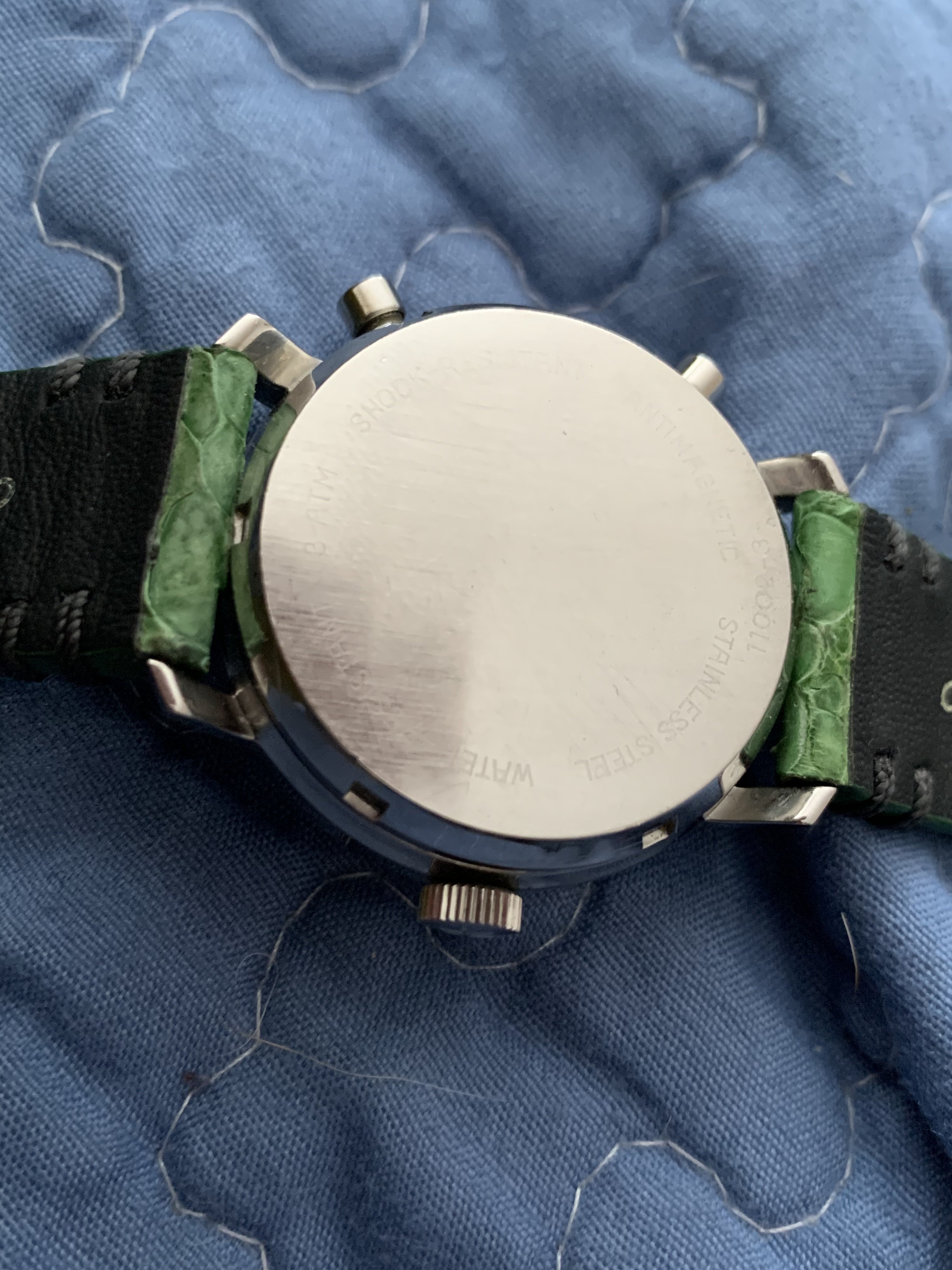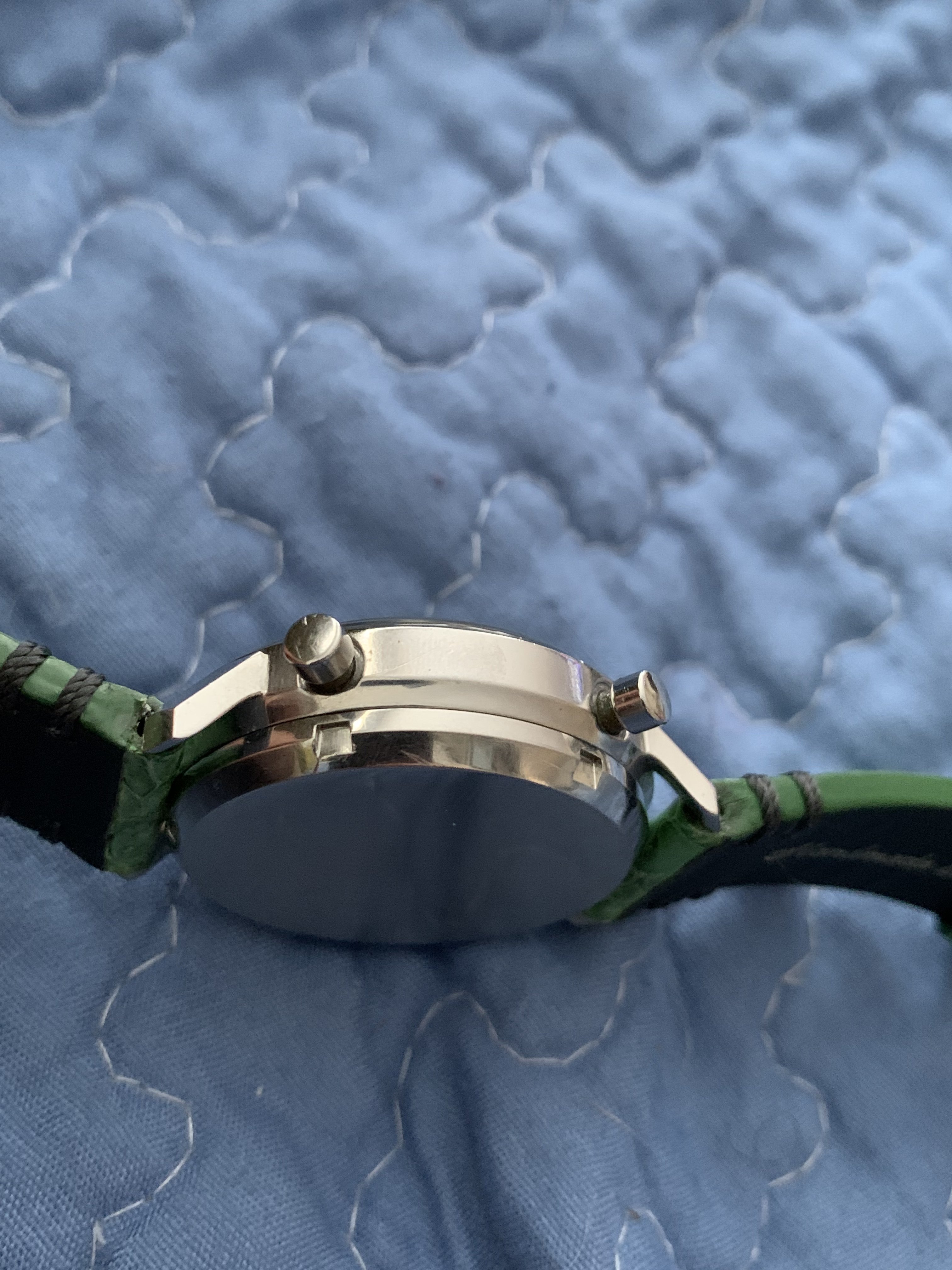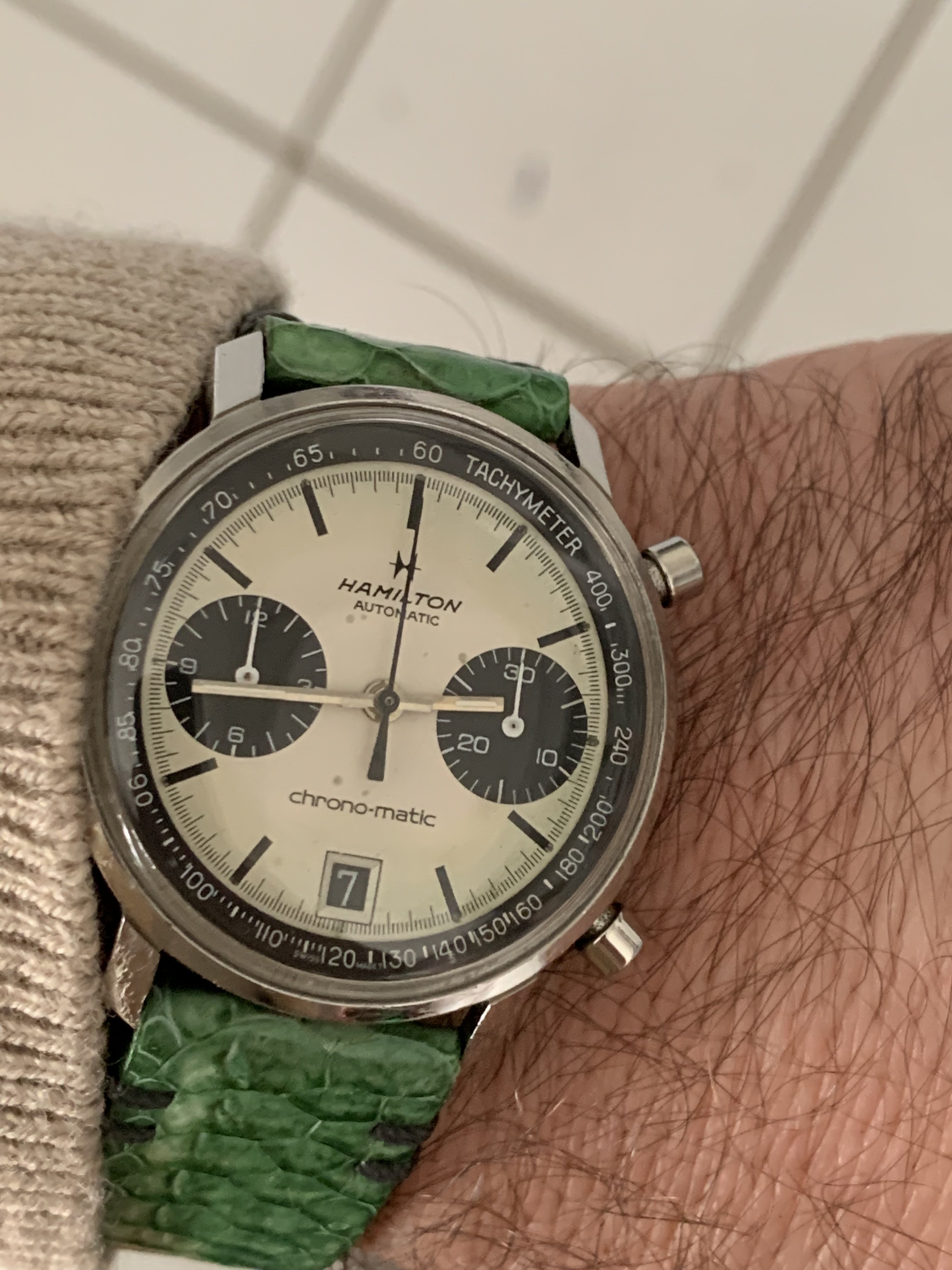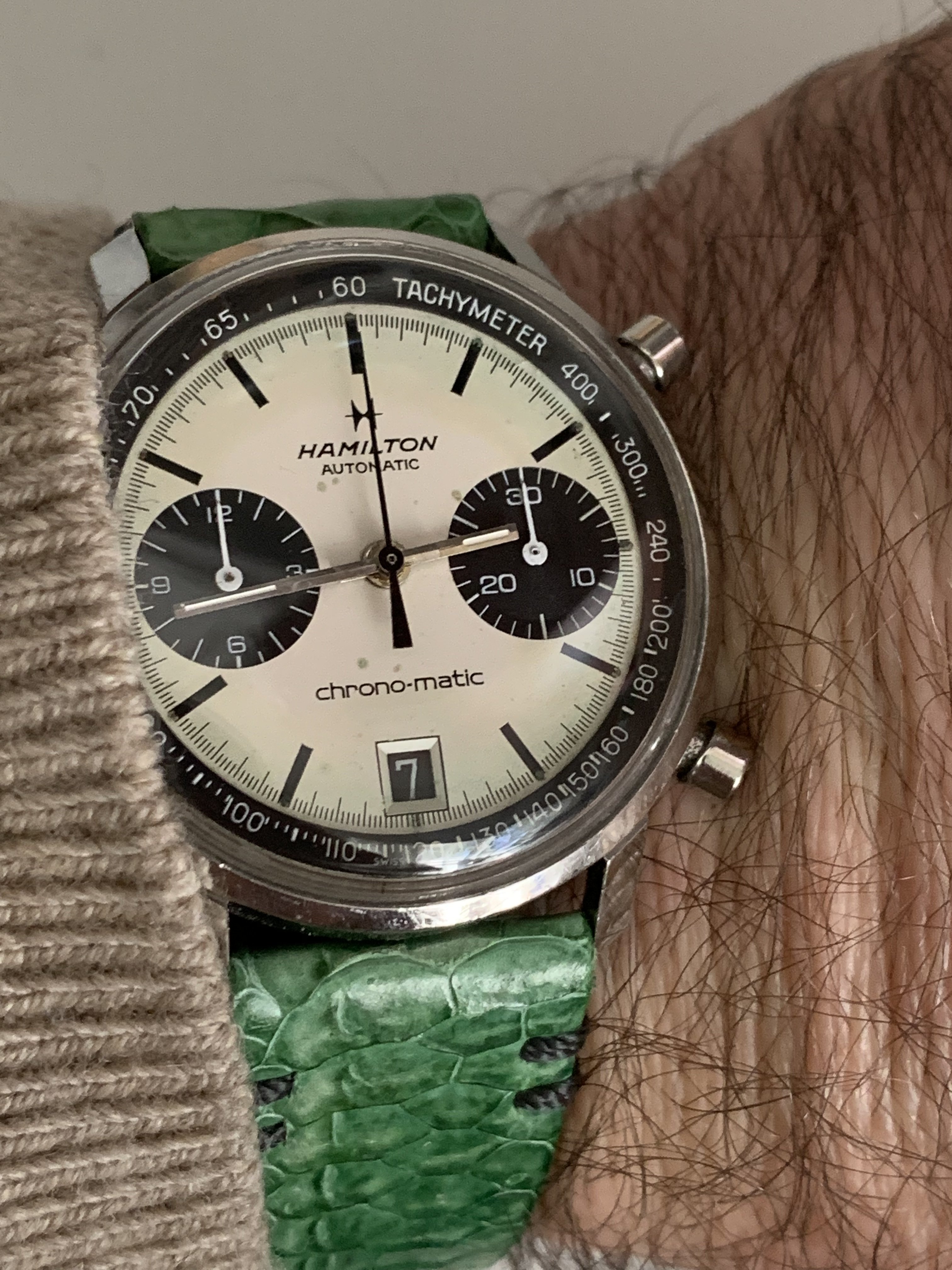 ·One of the first automatic chronographs created in 1969 from the Hamilton/Buren/Heuer group featuring the famous caliber 11. The watch is all original (not the strap obviously) except for the hour and minutes hands which were lost and replaced by my watchmaker (he said it was the first time in 40 years he’d lost a set of hands). The replacements are pretty good matches but needless to say I was quite annoyed at the loss.