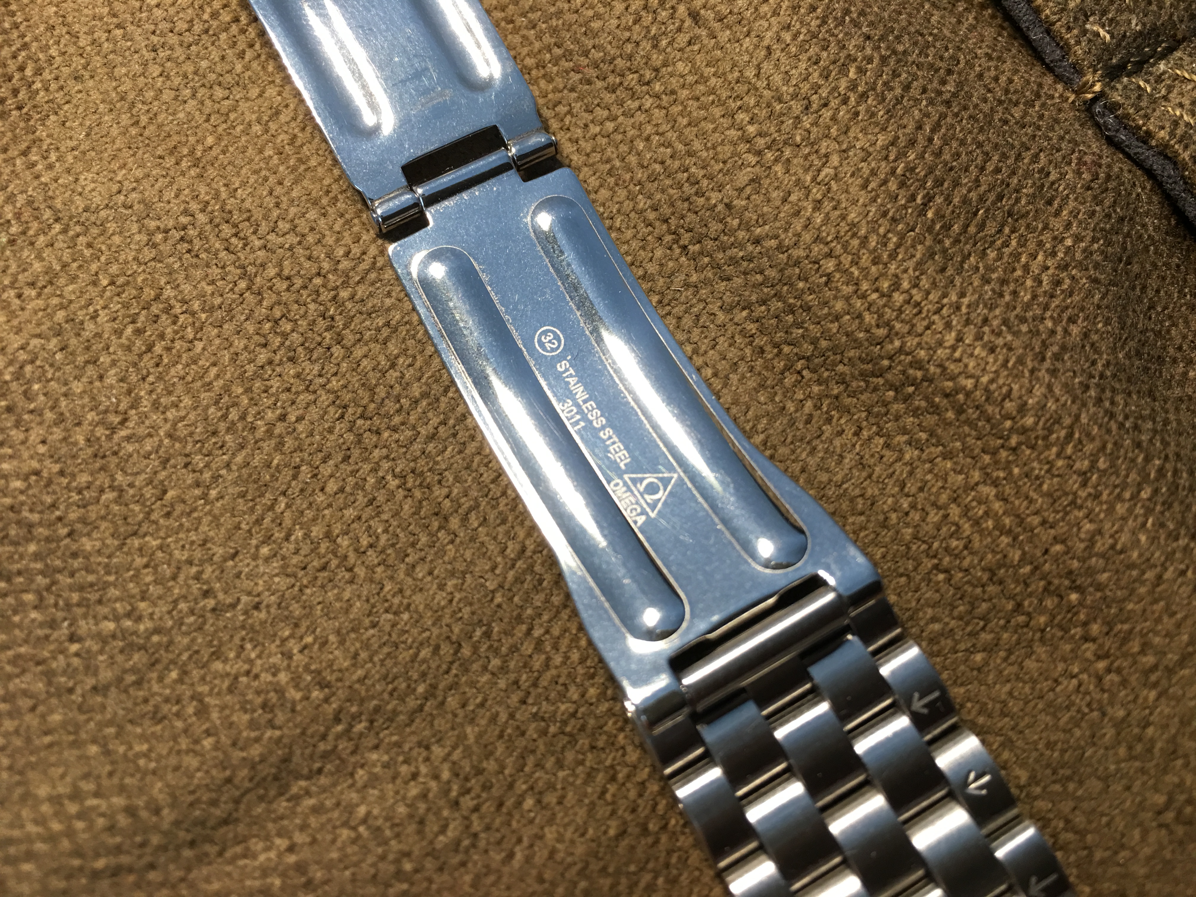 It is wearing a modern Omega 3011 service bracelet and end links, I bought 4 additional links from STS (£120) to return this to its full size, so it will fit up to an approximately 8 inch wrist.
