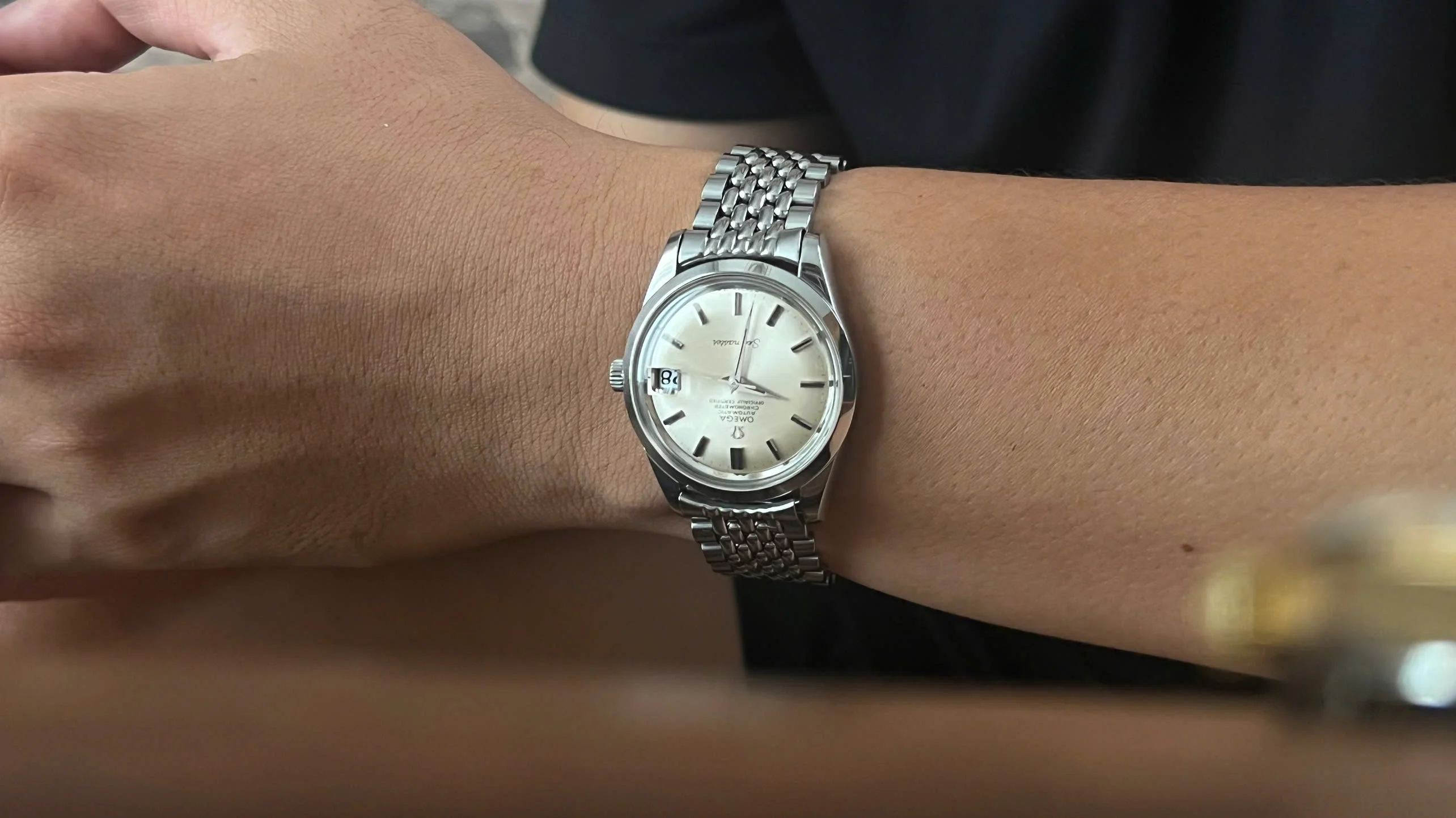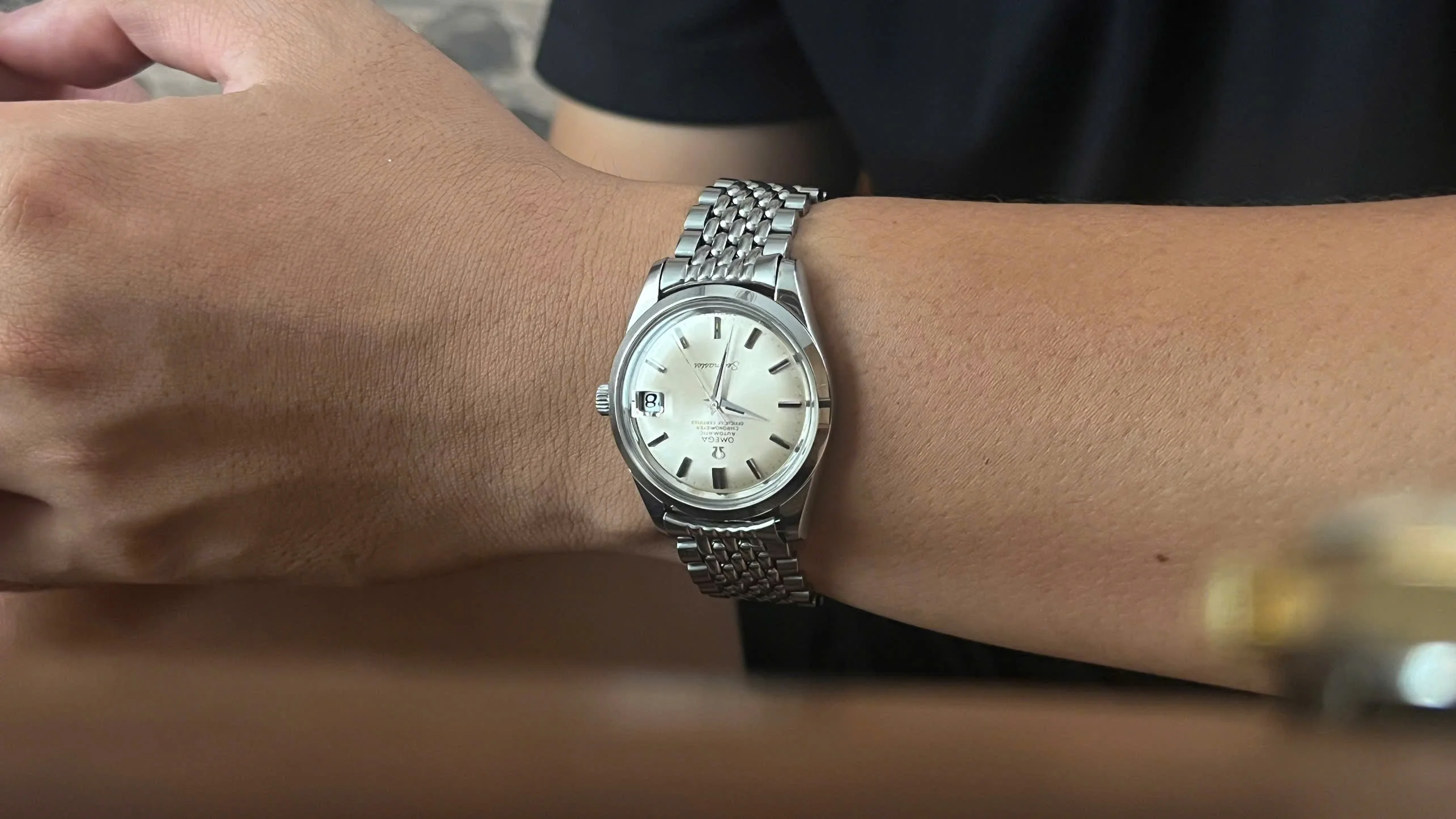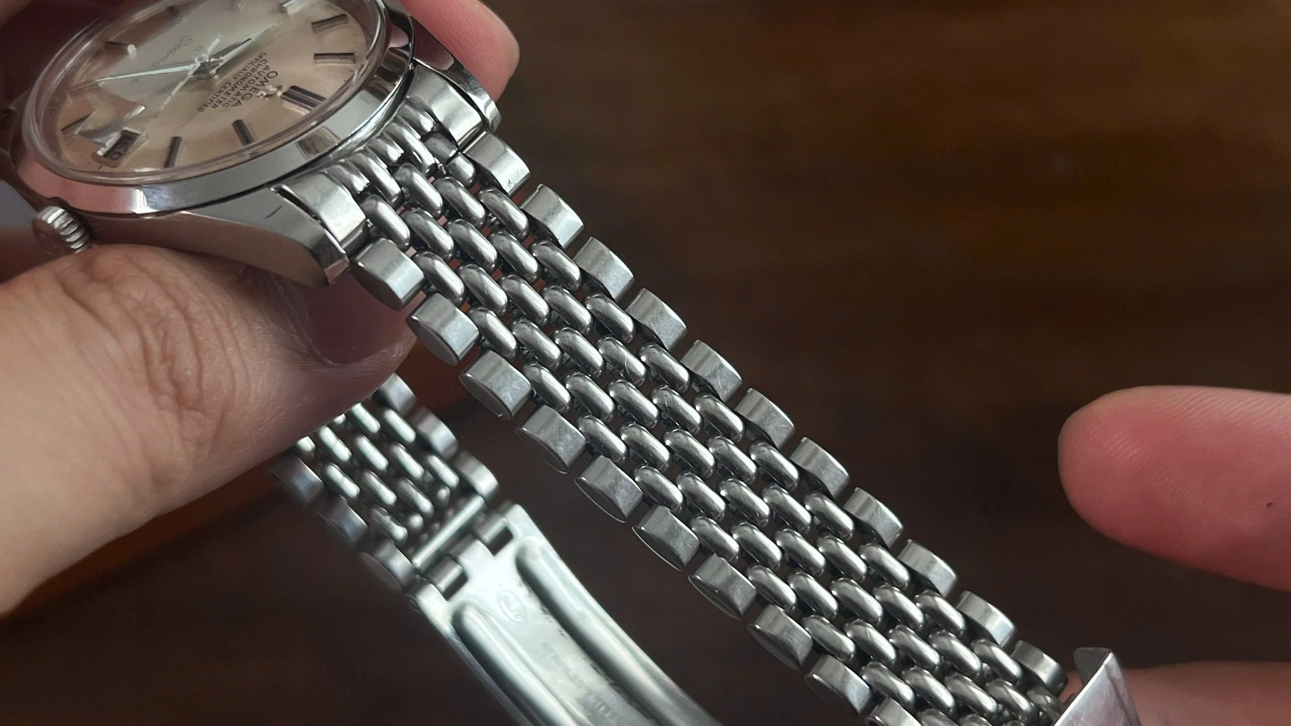 It comes fitted with its original Omega beads-of-rice bracelet (ref. 1502) with the correct No. 11 endlinks, which is long enough to fit wrists up to 8 inches.