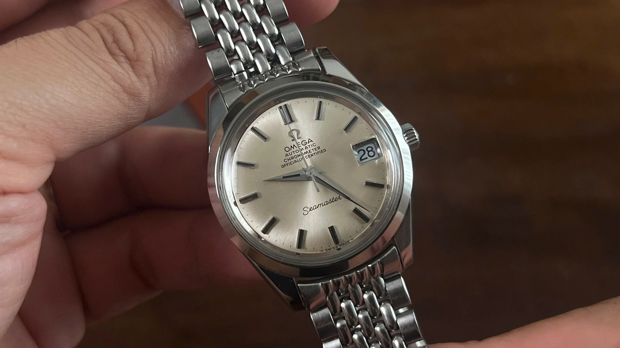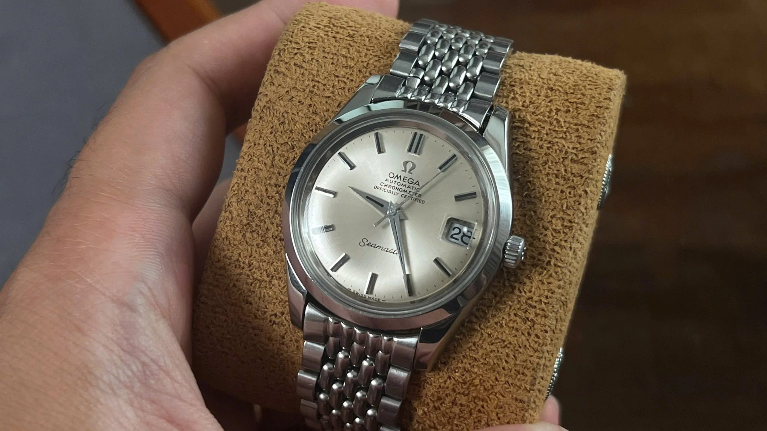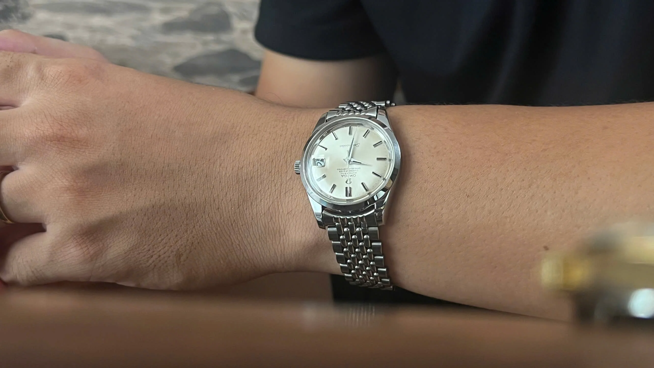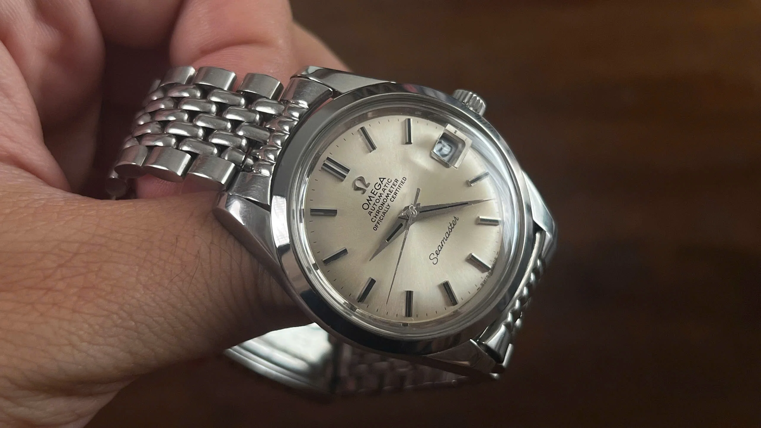 It comes fitted with its original Omega beads-of-rice bracelet (ref. 1502) with the correct No. 11 endlinks, which is long enough to fit wrists up to 8 inches.