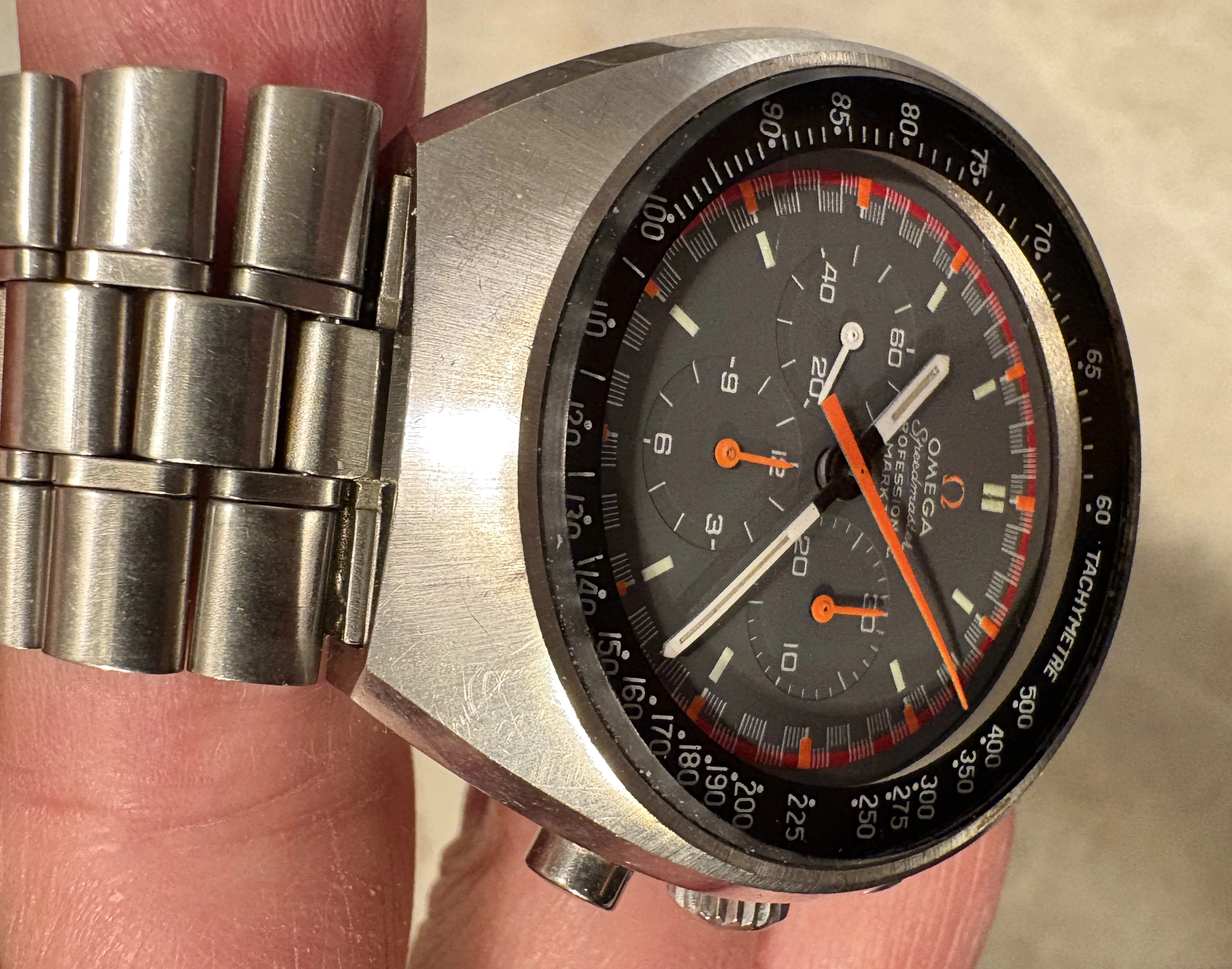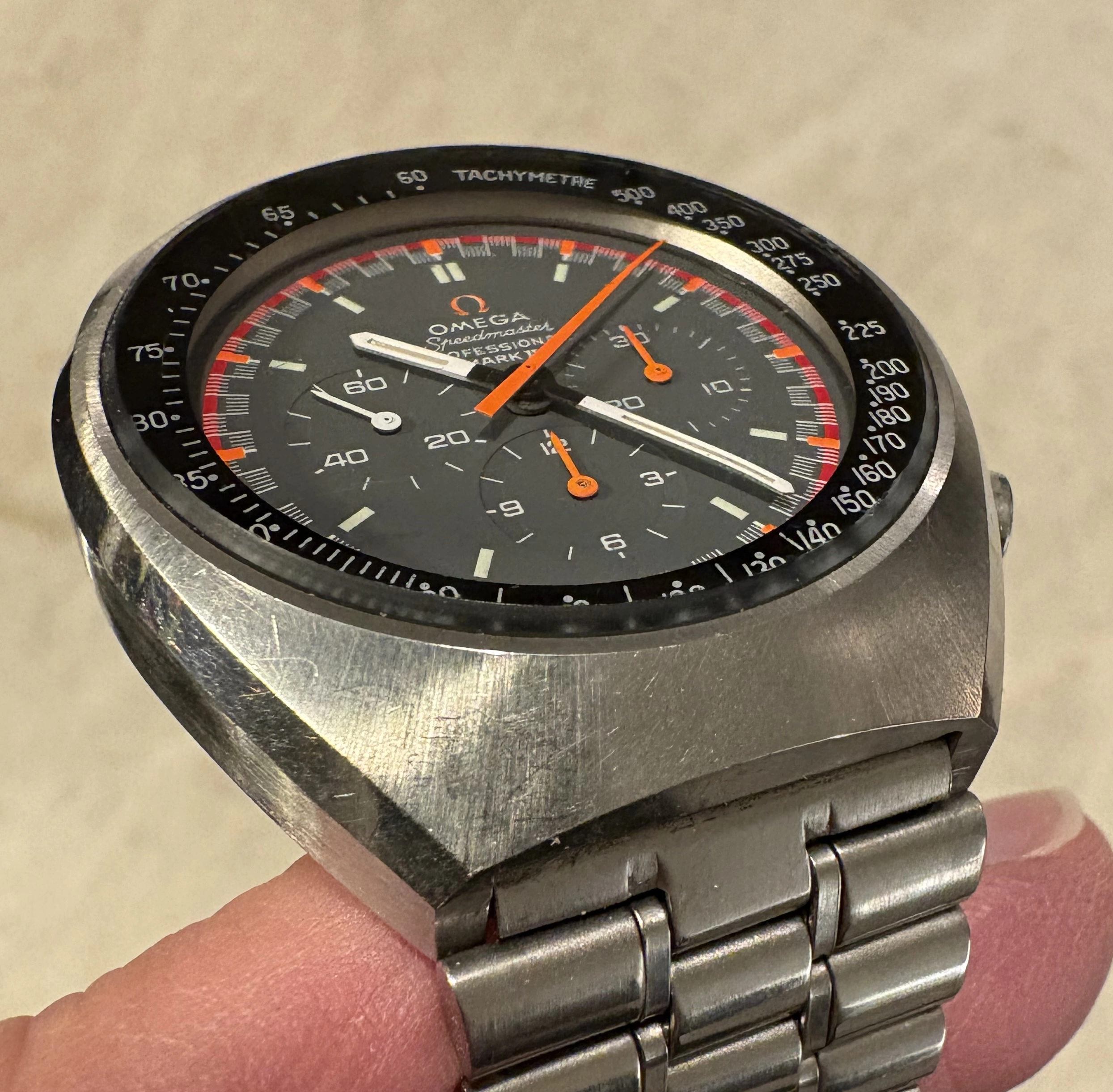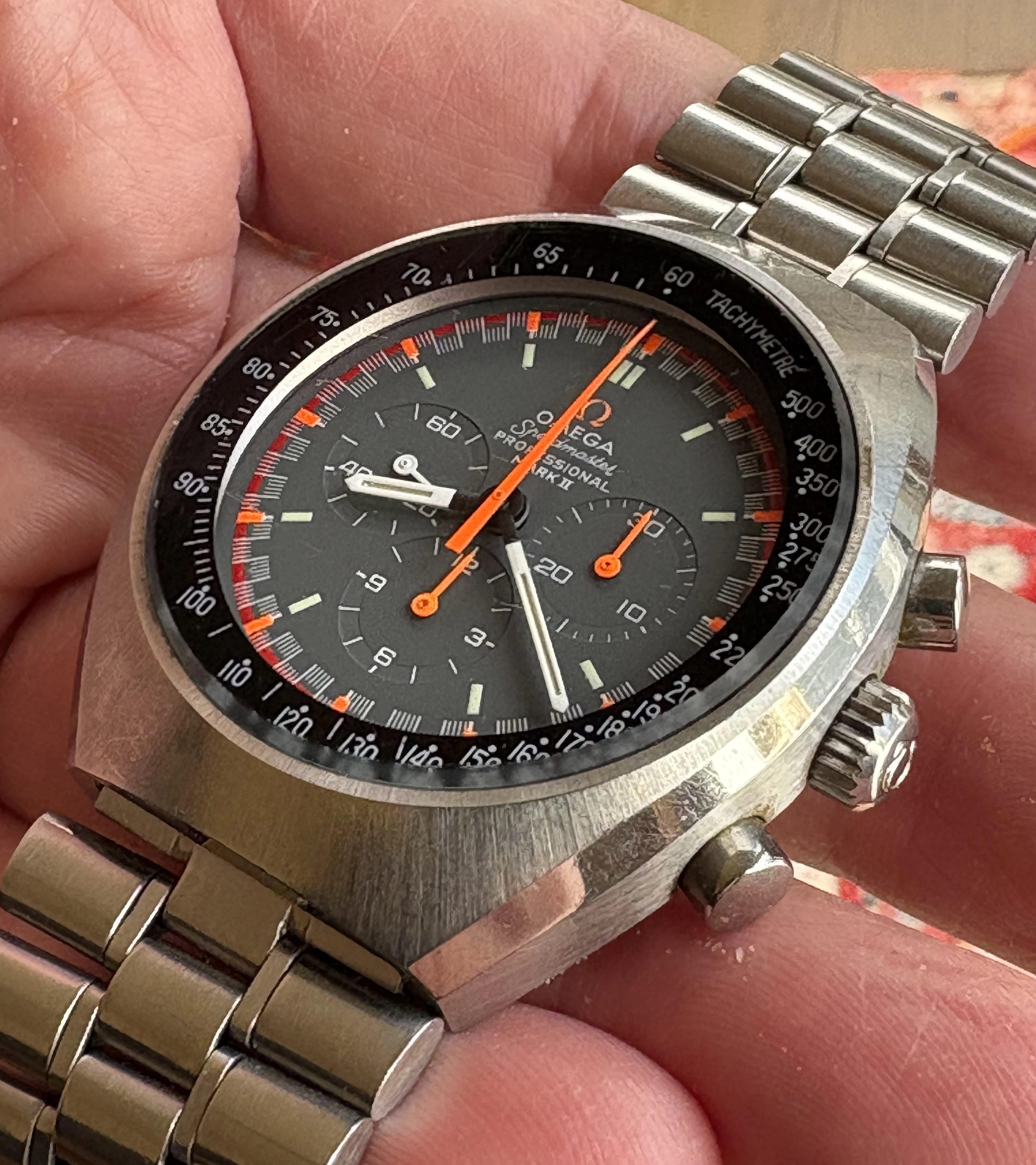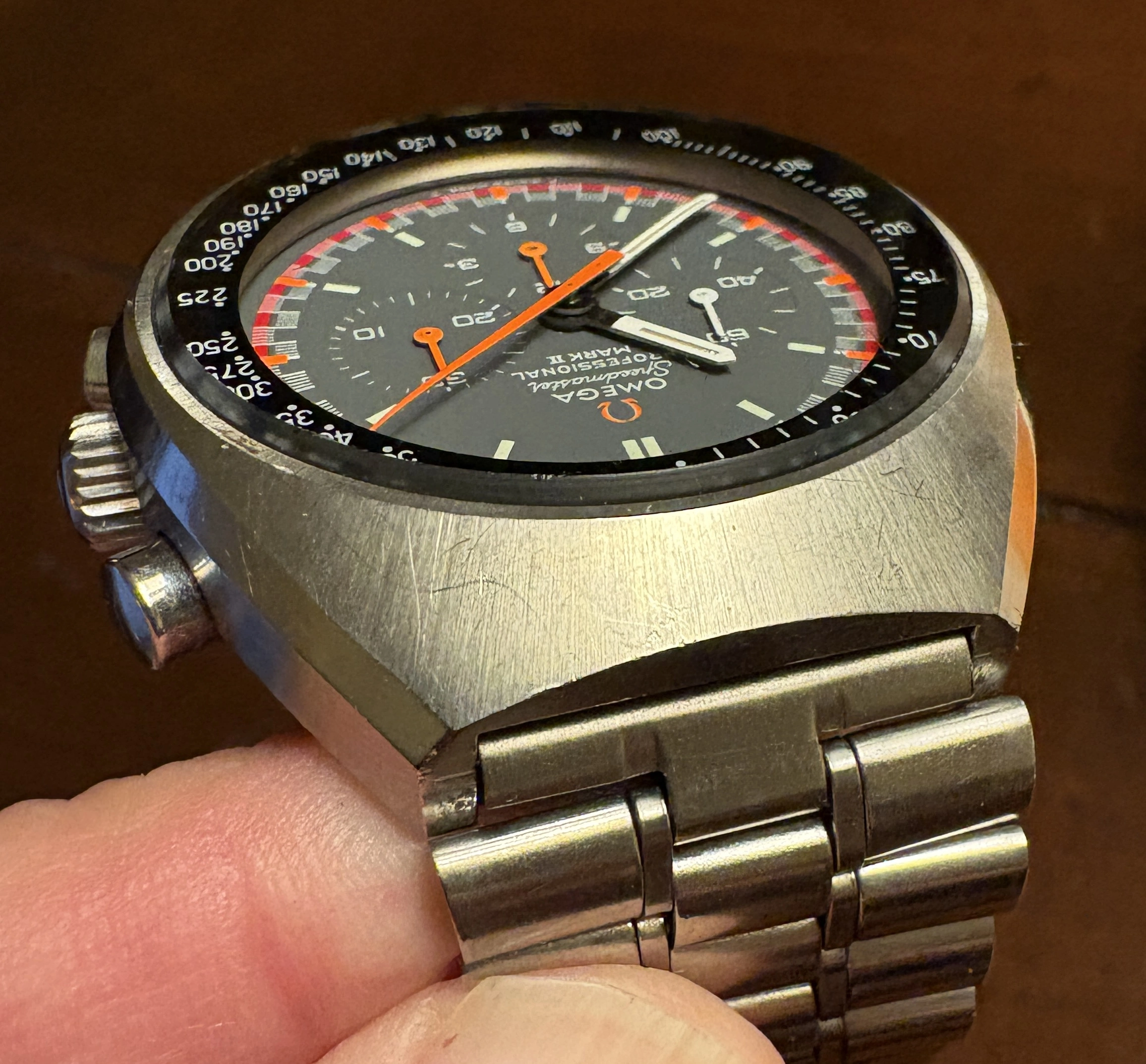 Nice honest Mk II Speedmaster 145.014 with racing dial. Notably, the dial and handset retain their vivid colors. The case shows some wear, but exhibits original finishes and sharp edges. Comes with original 21-link 1159 bracelet. This is a catch and release from a lot that I purchased locally from someone who had inherited a collection from a friend, and the condition of all the watches were similar - the owner clearly wore his watches, but maintained them and did not tamper with or polish them.