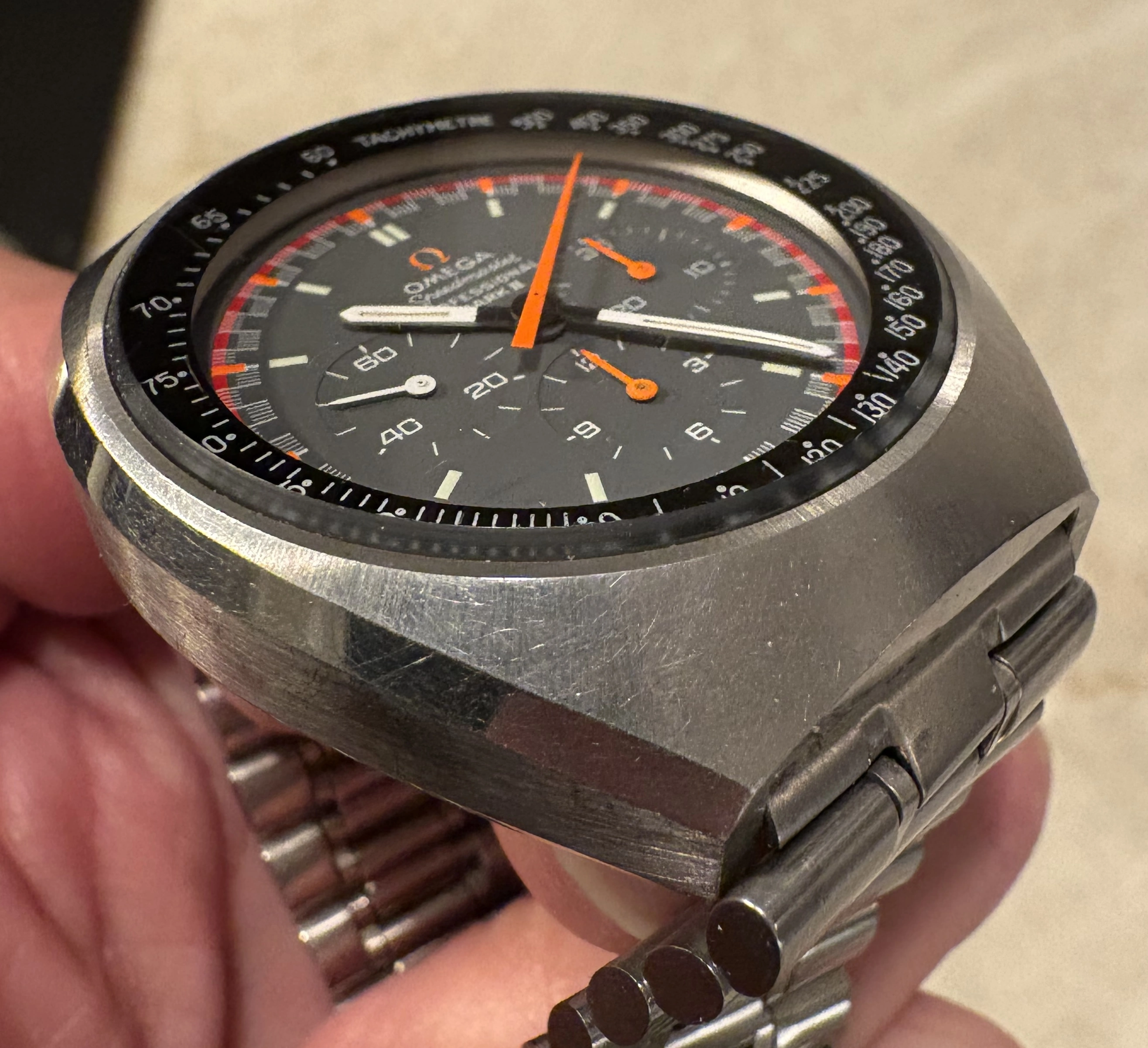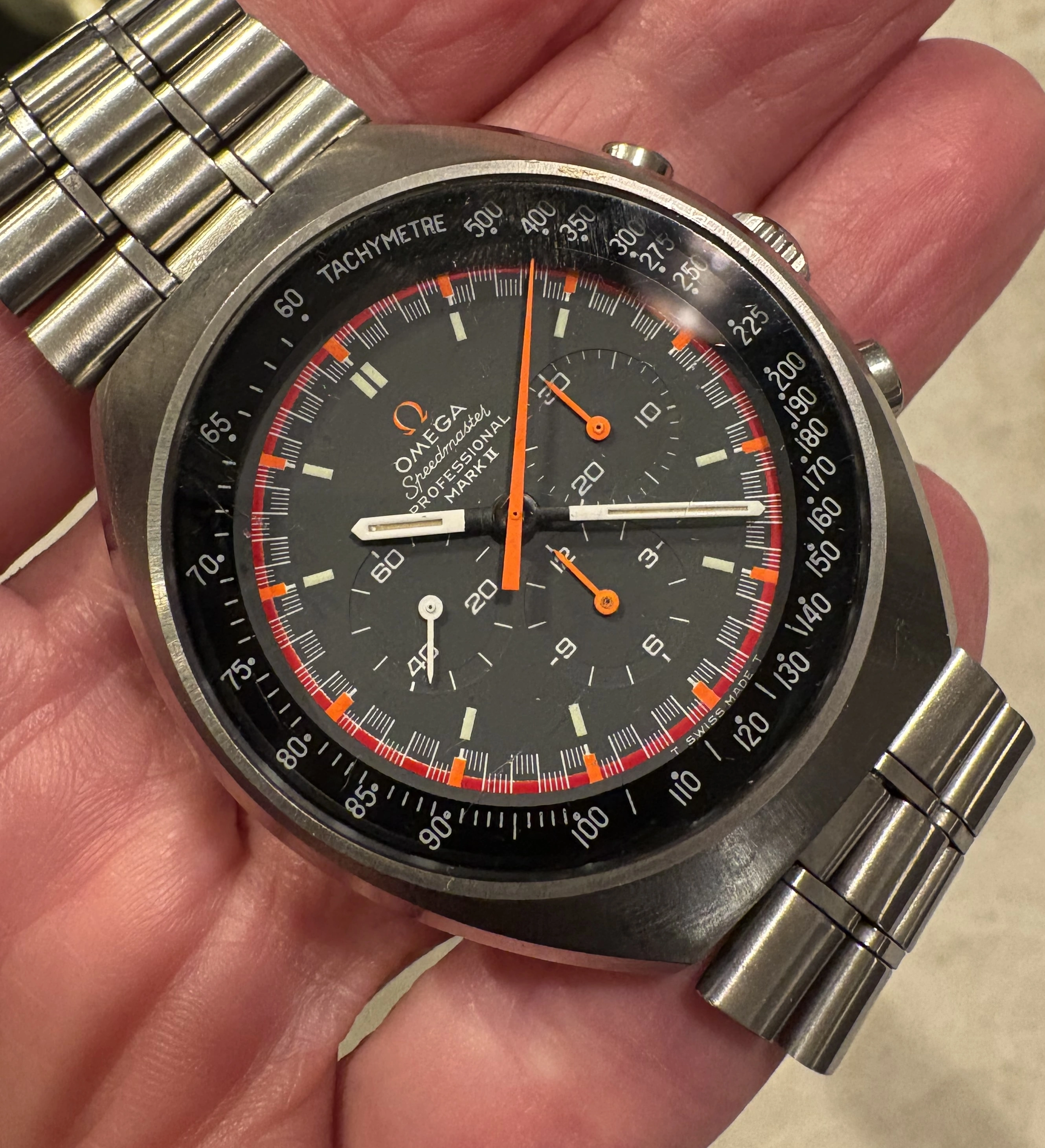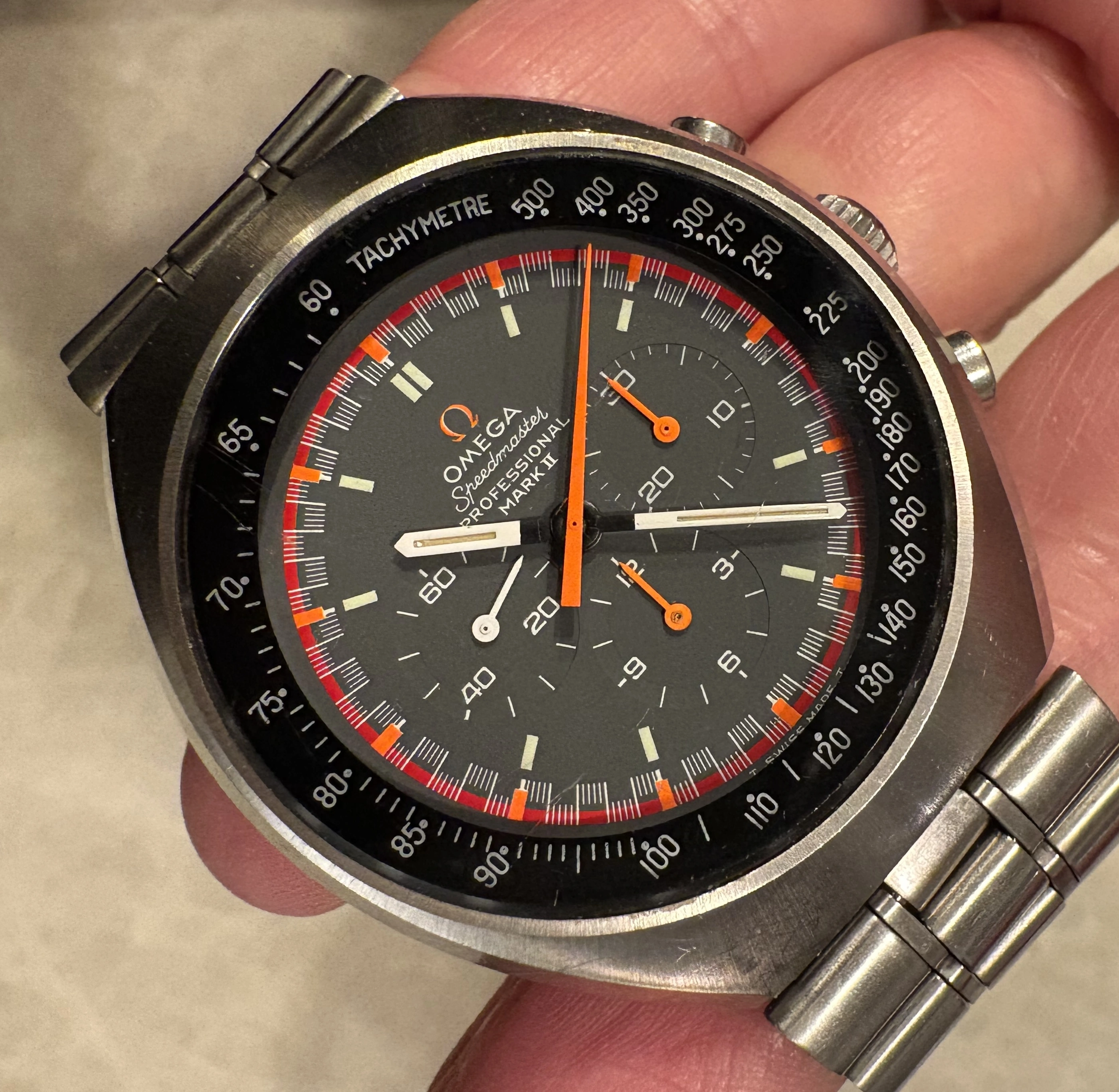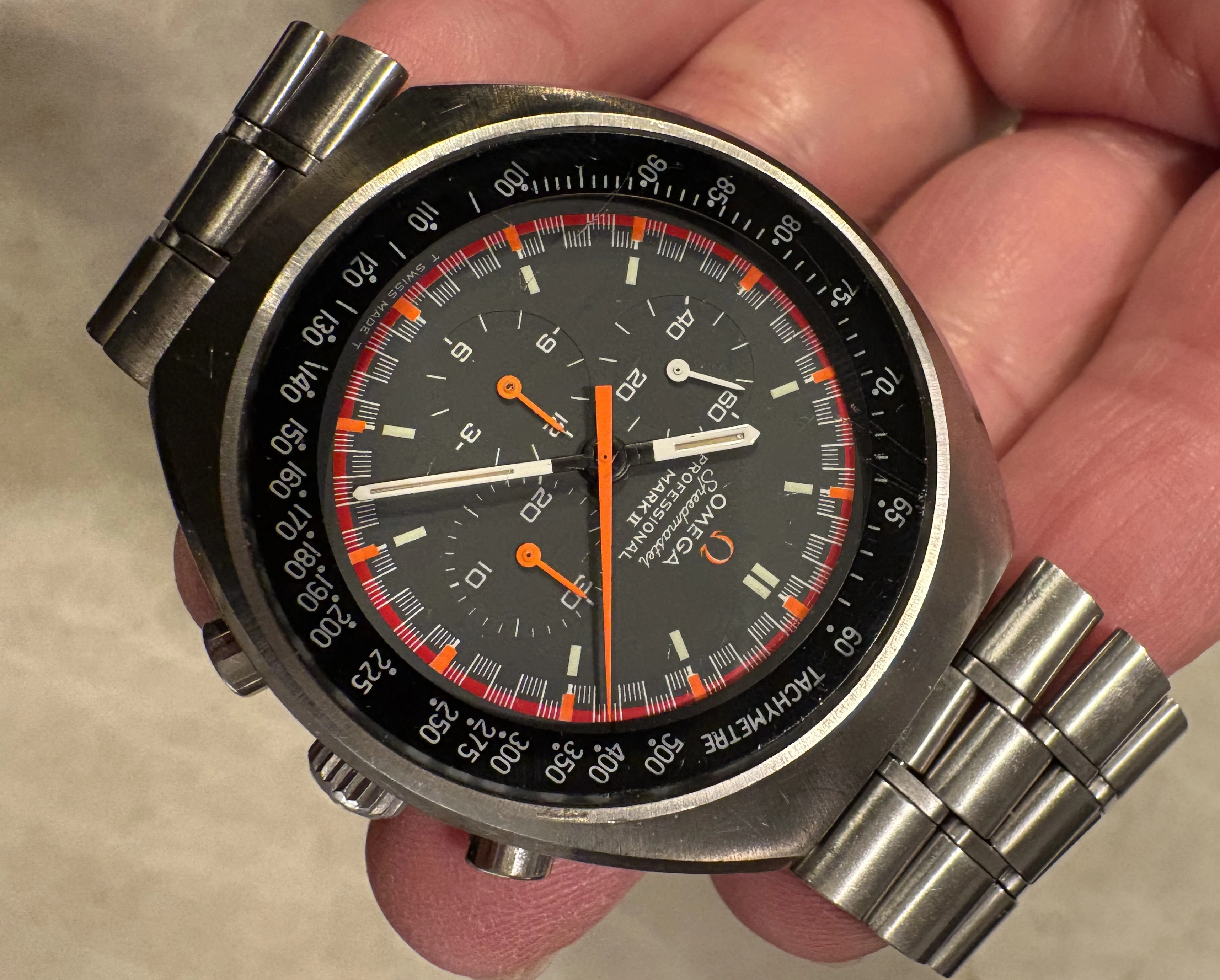 Nice honest Mk II Speedmaster 145.014 with racing dial. Notably, the dial and handset retain their vivid colors. The case shows some wear, but exhibits original finishes and sharp edges. Comes with original 21-link 1159 bracelet. This is a catch and release from a lot that I purchased locally from someone who had inherited a collection from a friend, and the condition of all the watches were similar - the owner clearly wore his watches, but maintained them and did not tamper with or polish them.